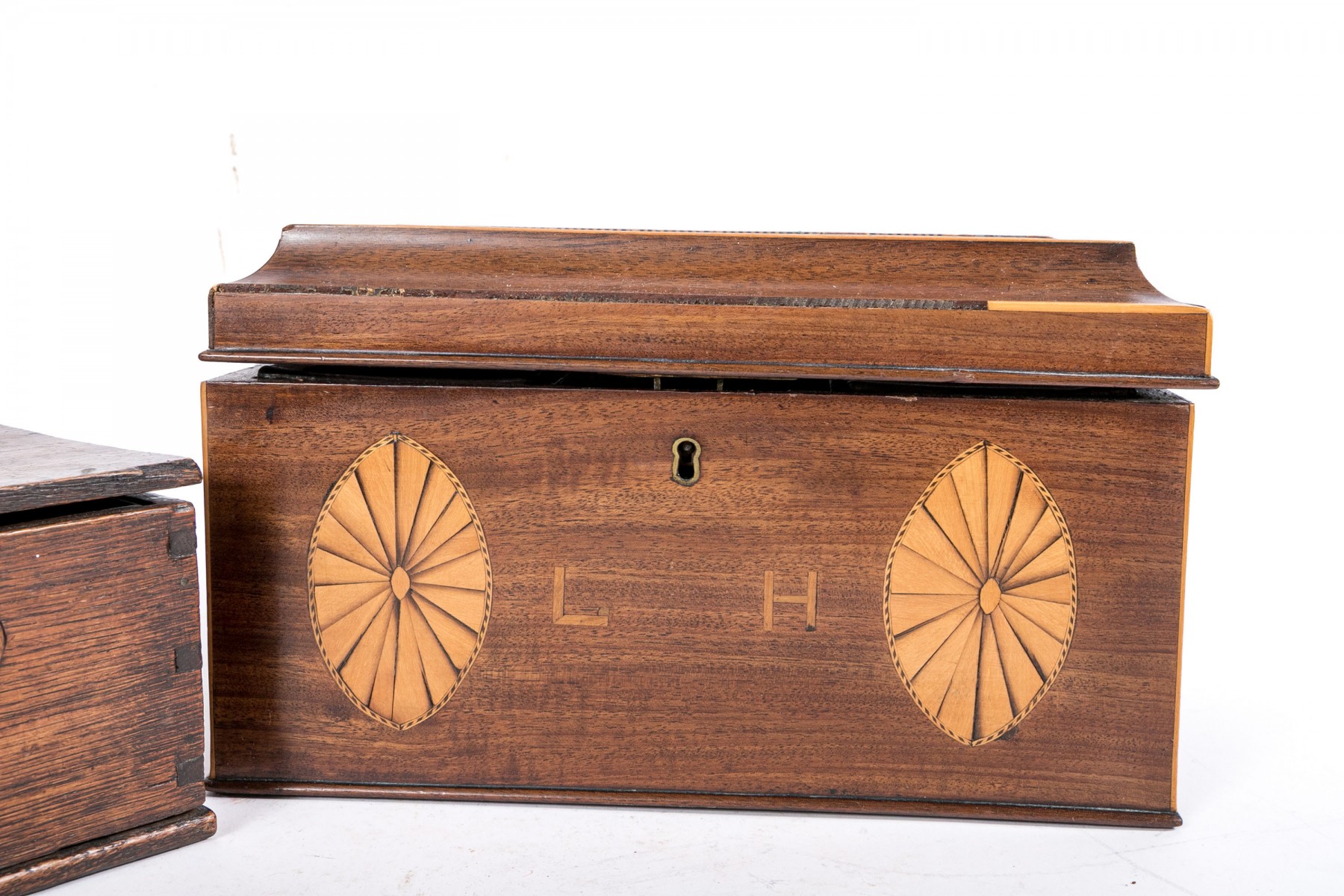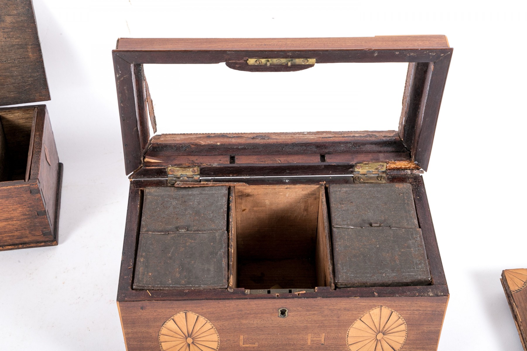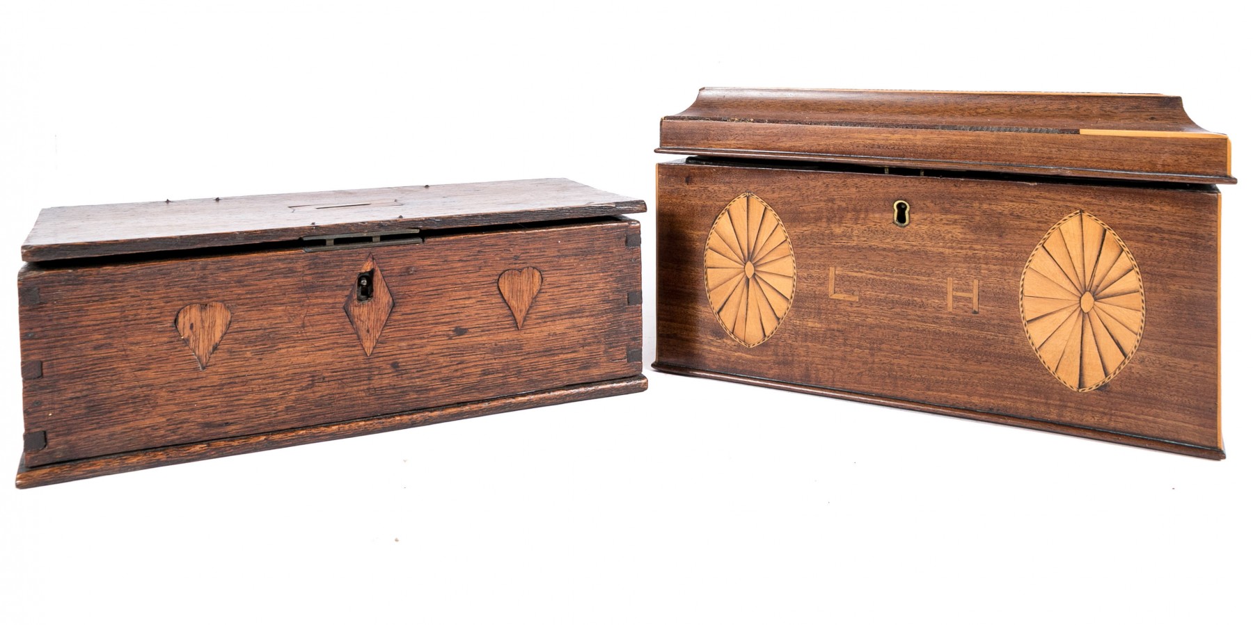 Two antique wood tea caddies with inlaid designs. The larger sports a bevel-domed lid over a rectangular body adorned with radiating marquise motifs, opening to a three-compartment interior with two metal canisters. The shorter caddy is simply detailed with a dovetail construction, accented with diamond-shaped inlays at the sides and heart-shaped motifs at the front.. It opens to a spacious compartment and a lidded compartment to the right side.