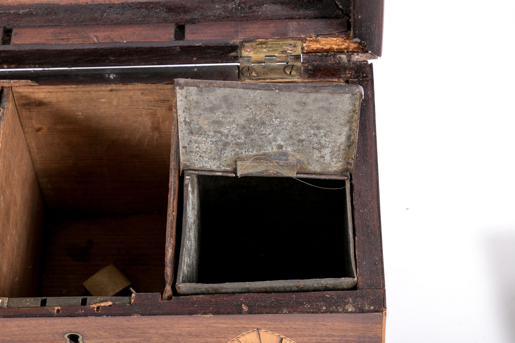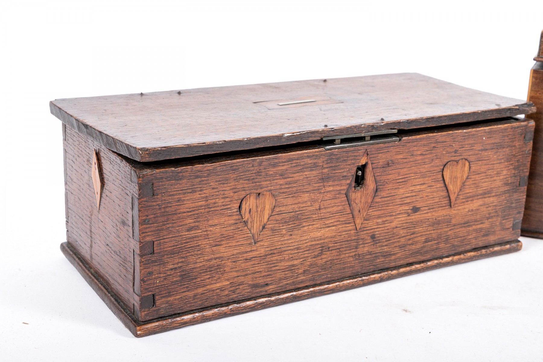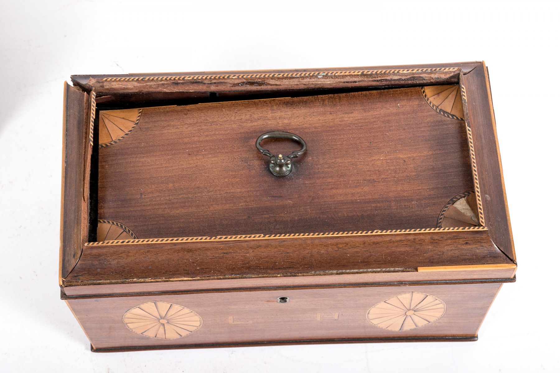Two antique wood tea caddies with inlaid designs. The larger sports a bevel-domed lid over a rectangular body adorned with radiating marquise motifs, opening to a three-compartment interior with two metal canisters. The shorter caddy is simply detailed with a dovetail construction, accented with diamond-shaped inlays at the sides and heart-shaped motifs at the front.. It opens to a spacious compartment and a lidded compartment to the right side.