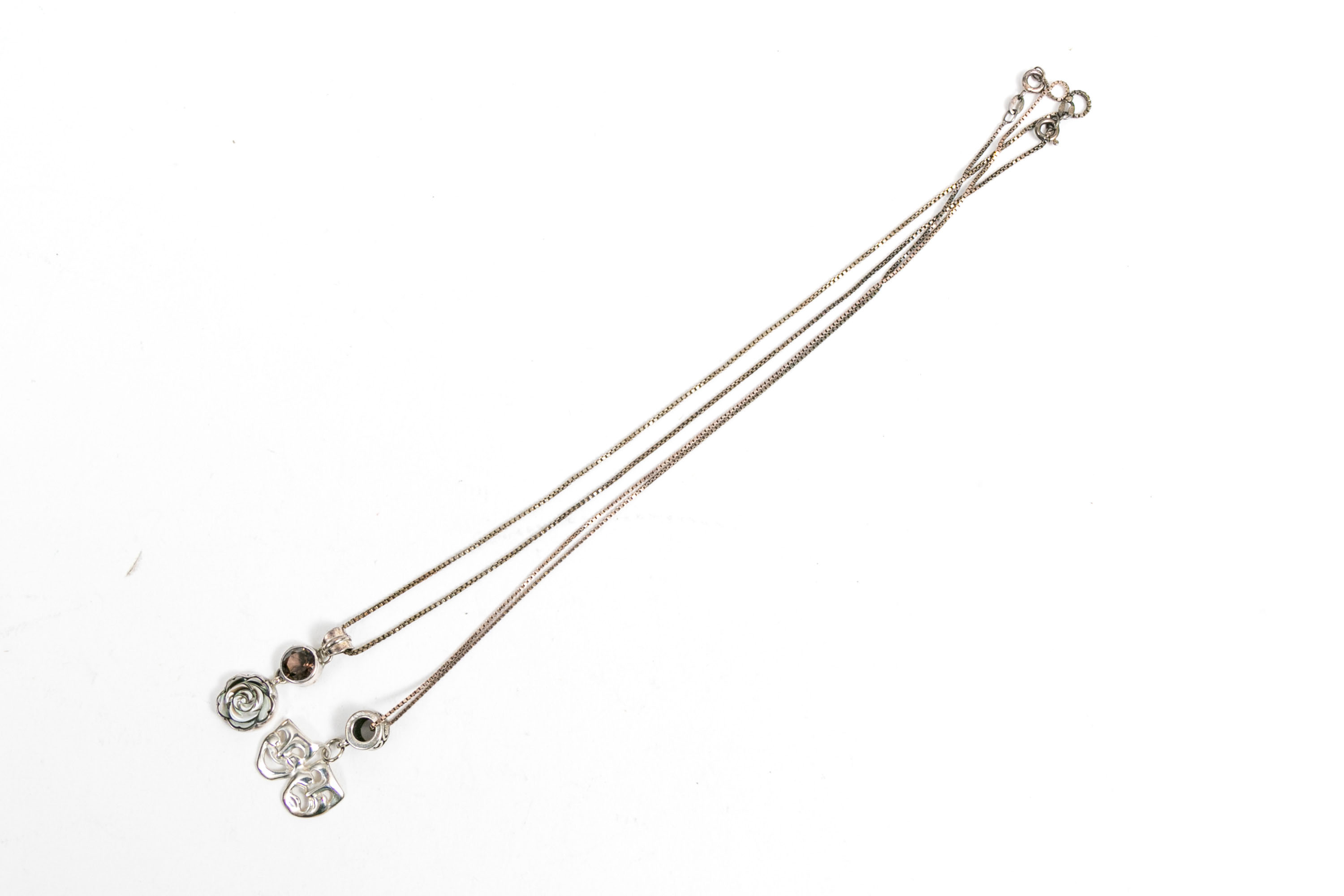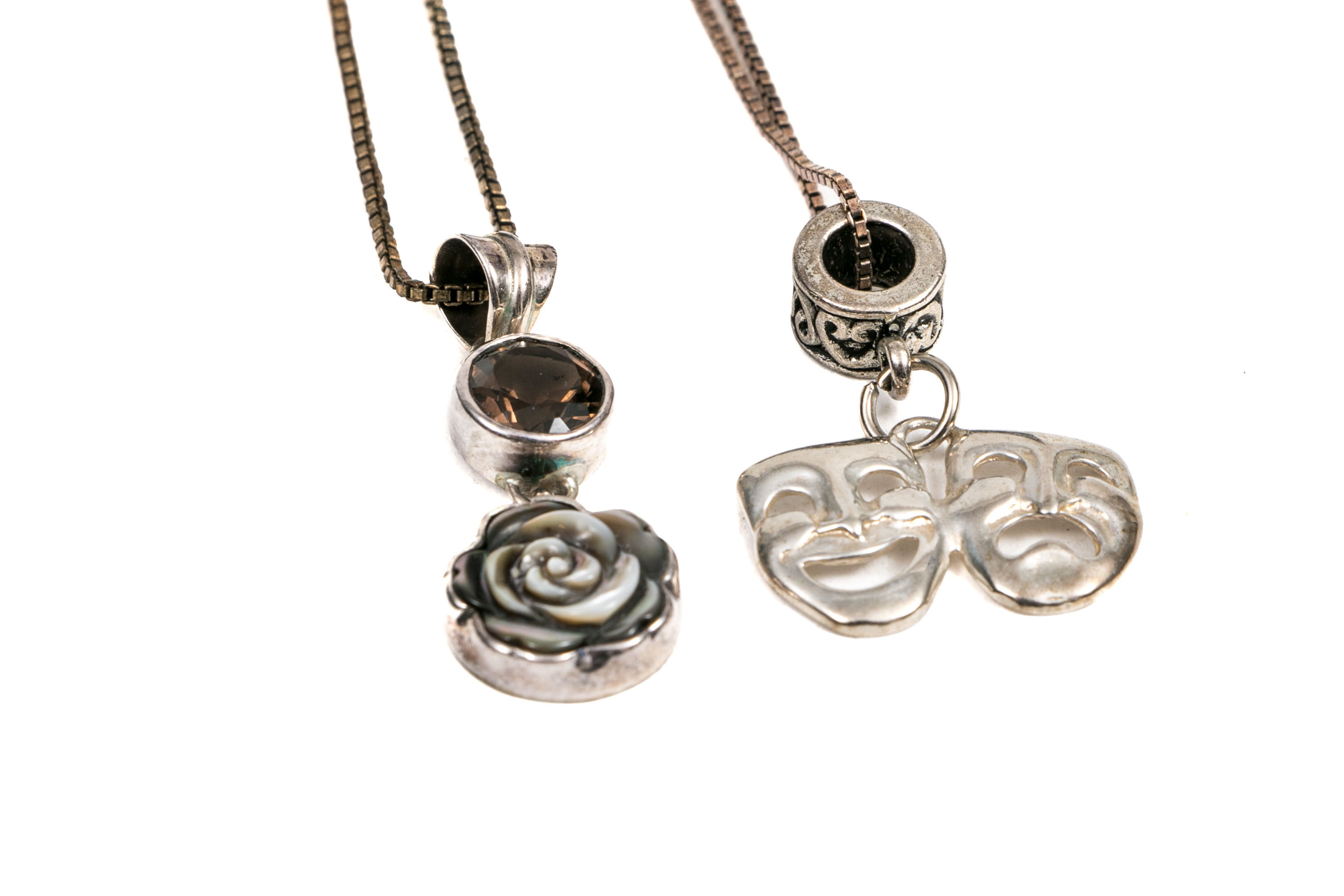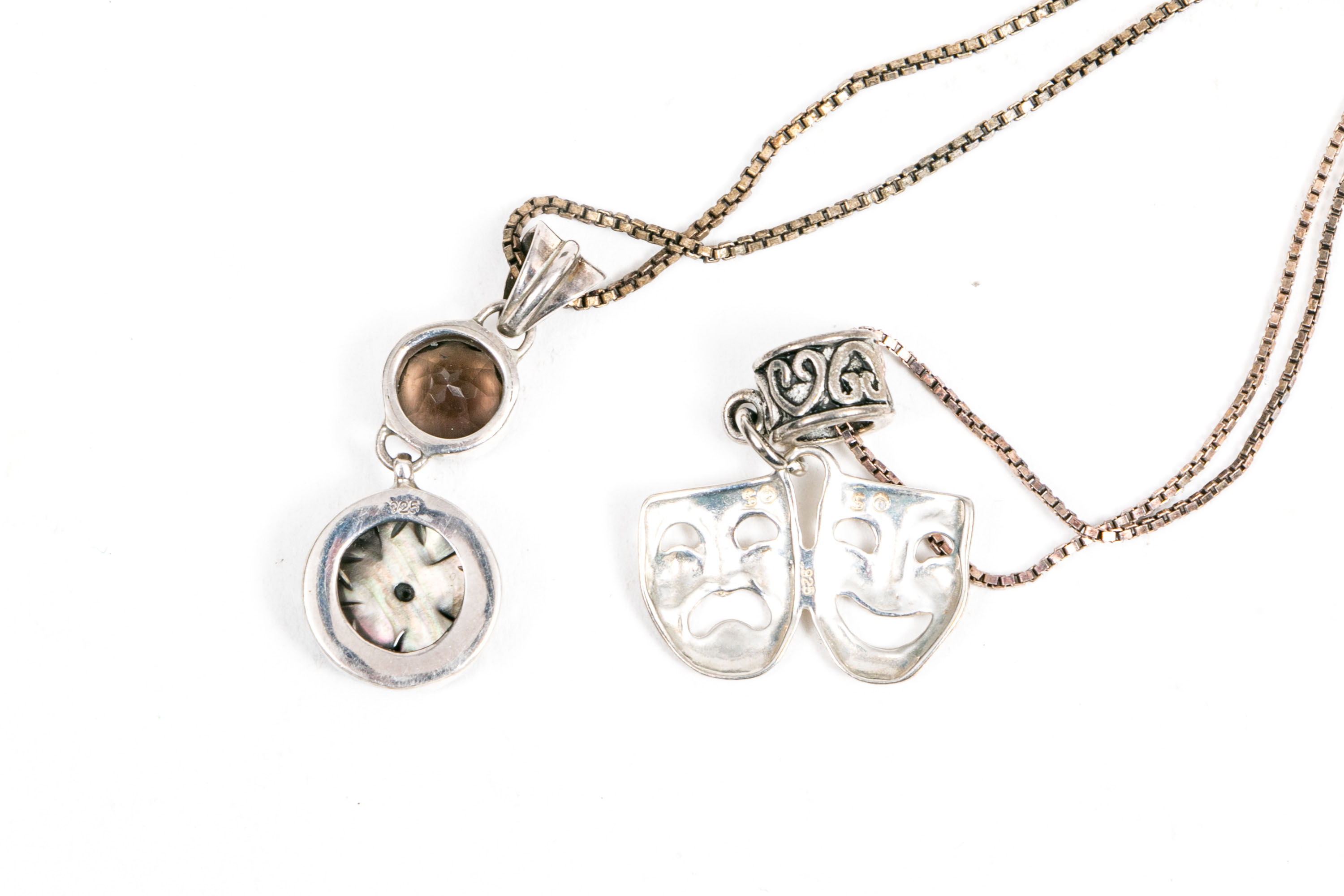 Two sterling silver box style chains with spring ring style clasps. Displayed on the chains are two pendants, one with masks and the second with a carved dark mother of pearl flower and smoky quartz stone.