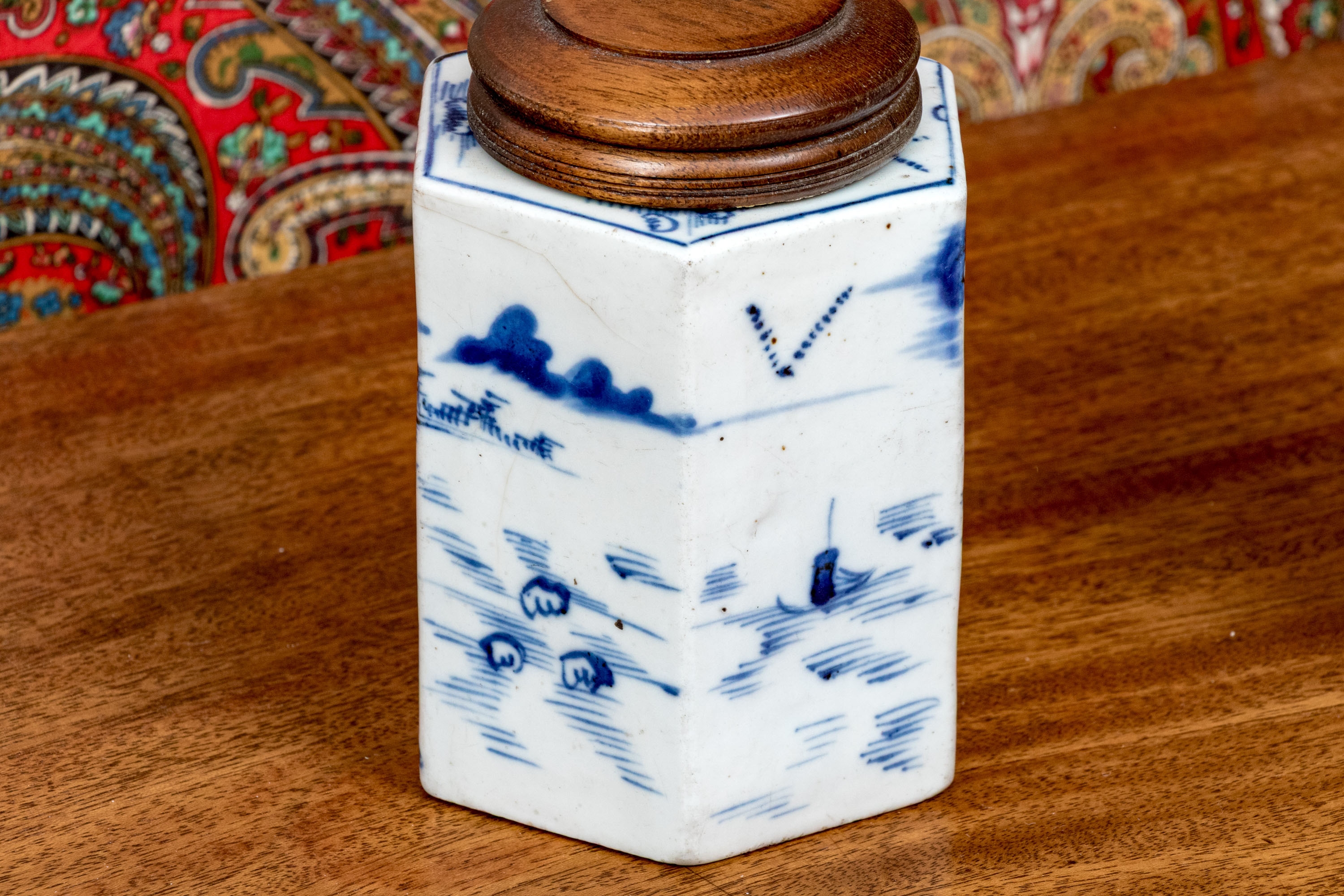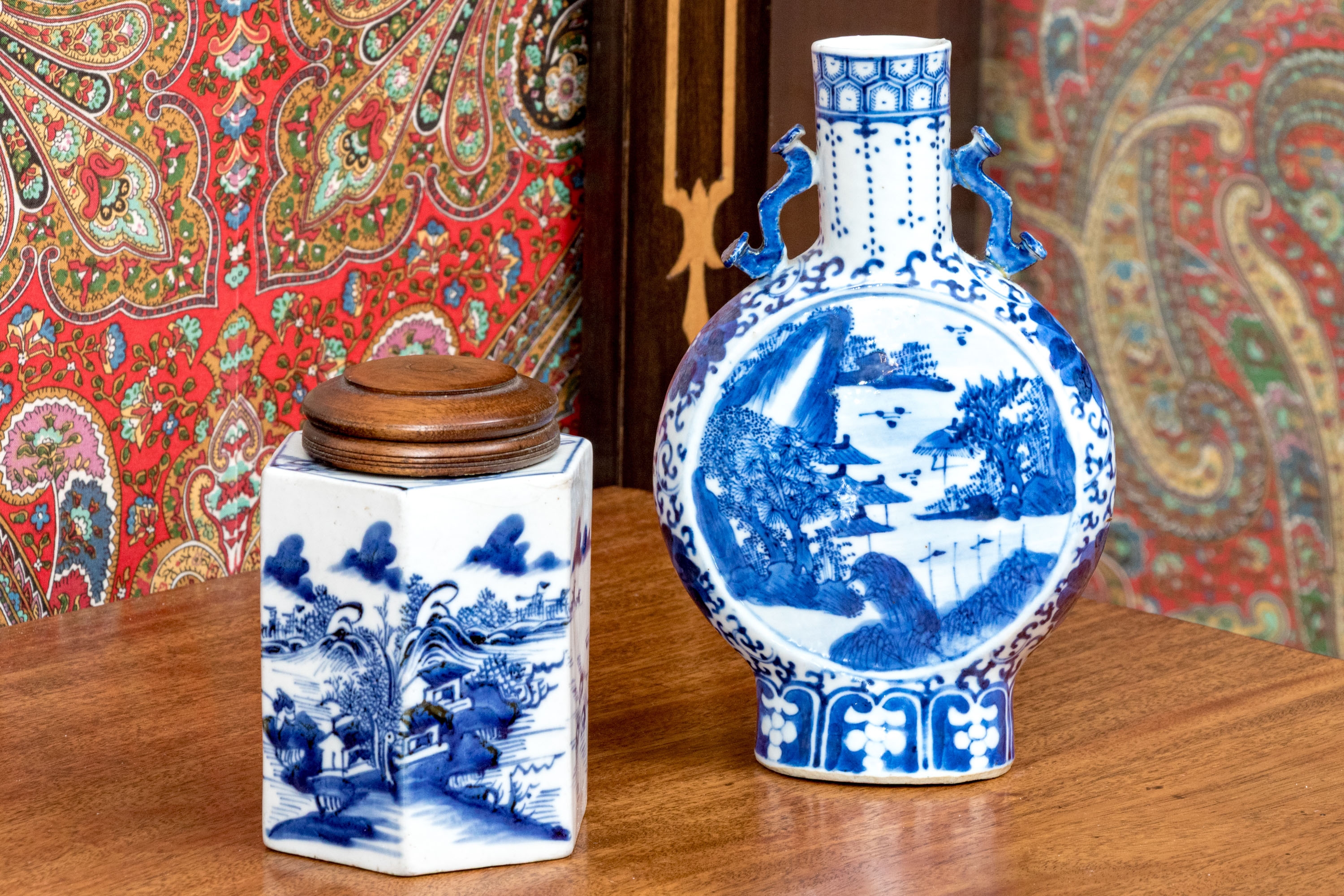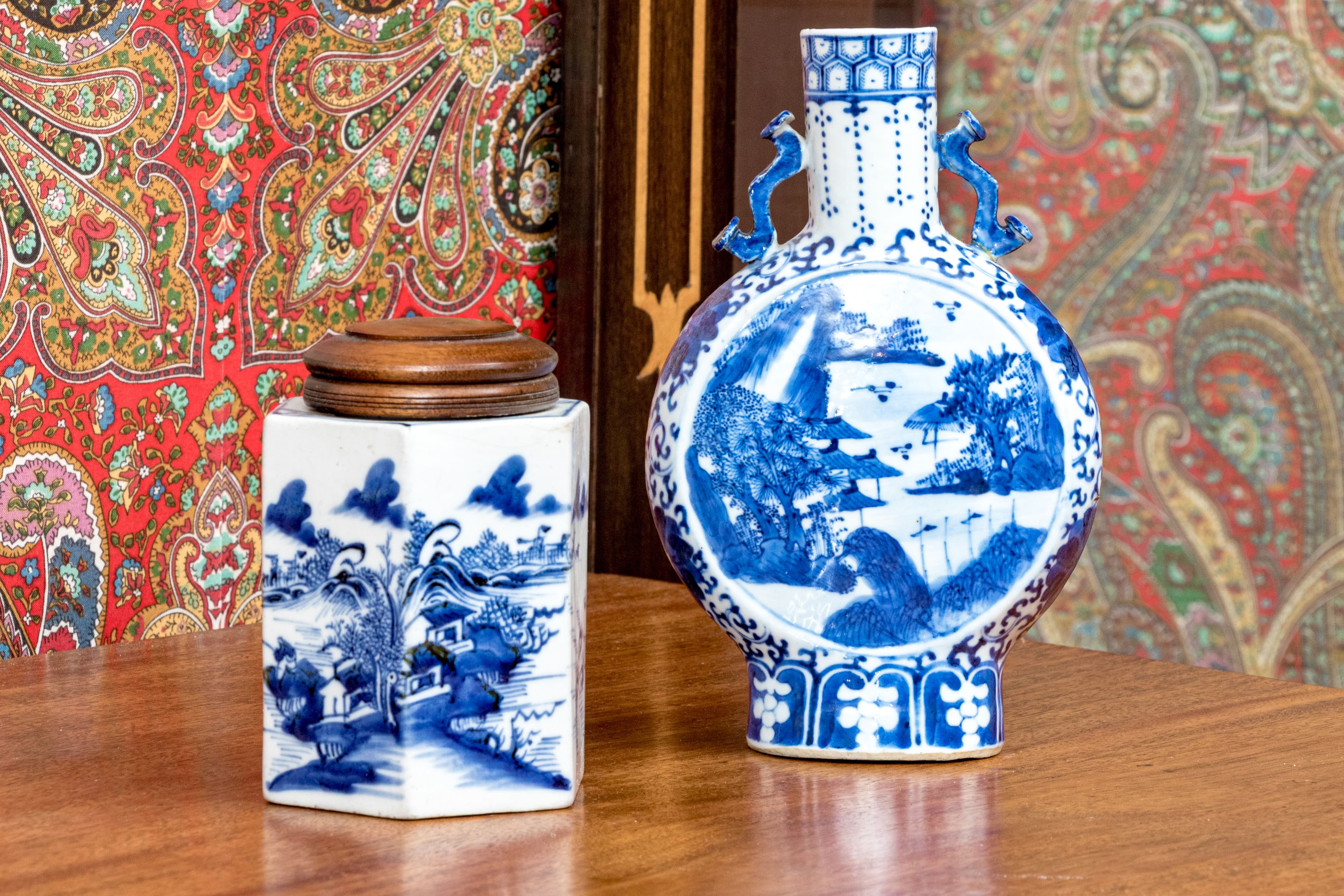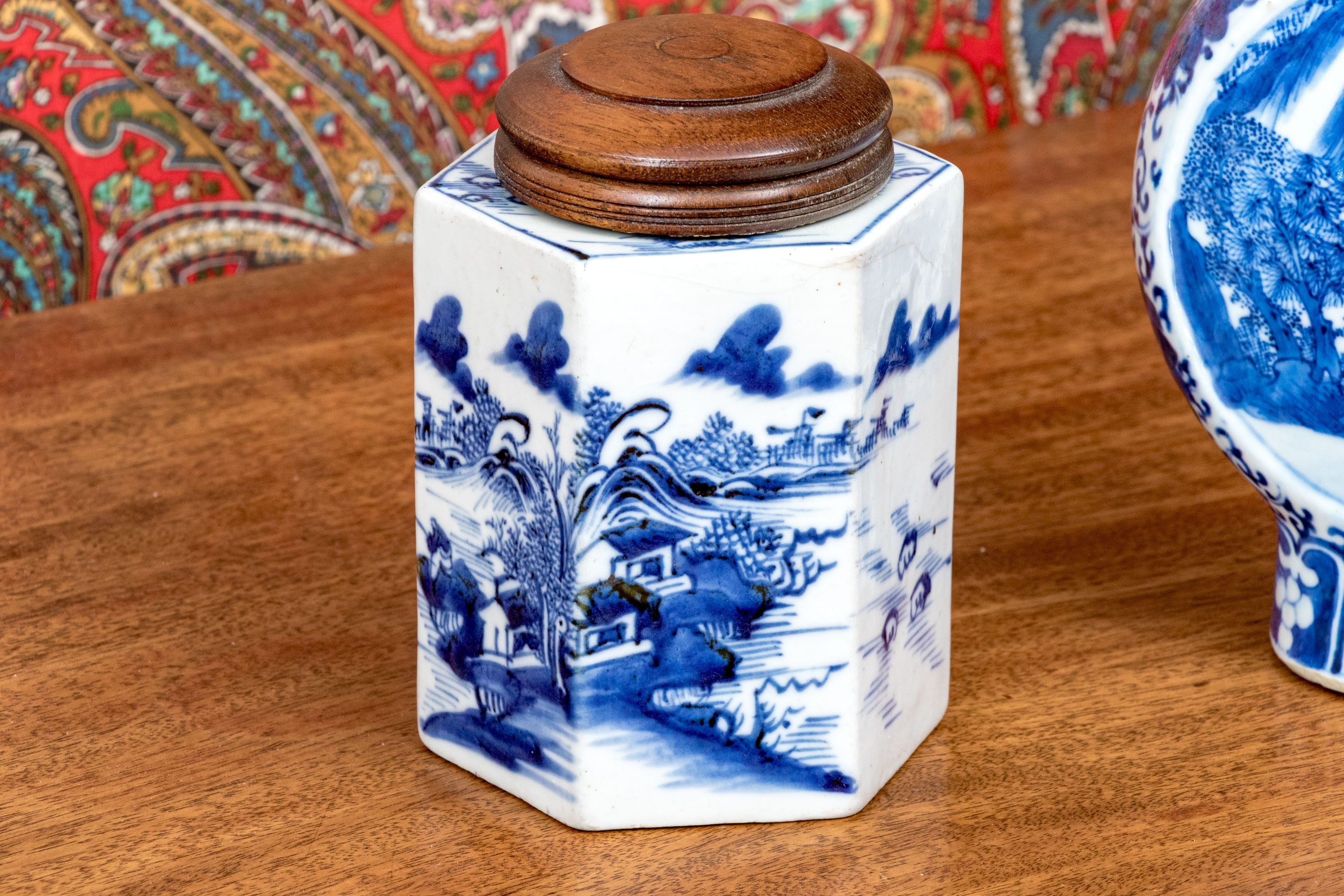 Comprised of a twin handled blue and white diminutive moon flask with ruyi scepter form handles. Oval foot with underglaze calligraphic marks together with a hexagonal tea caddy with wooden lid.