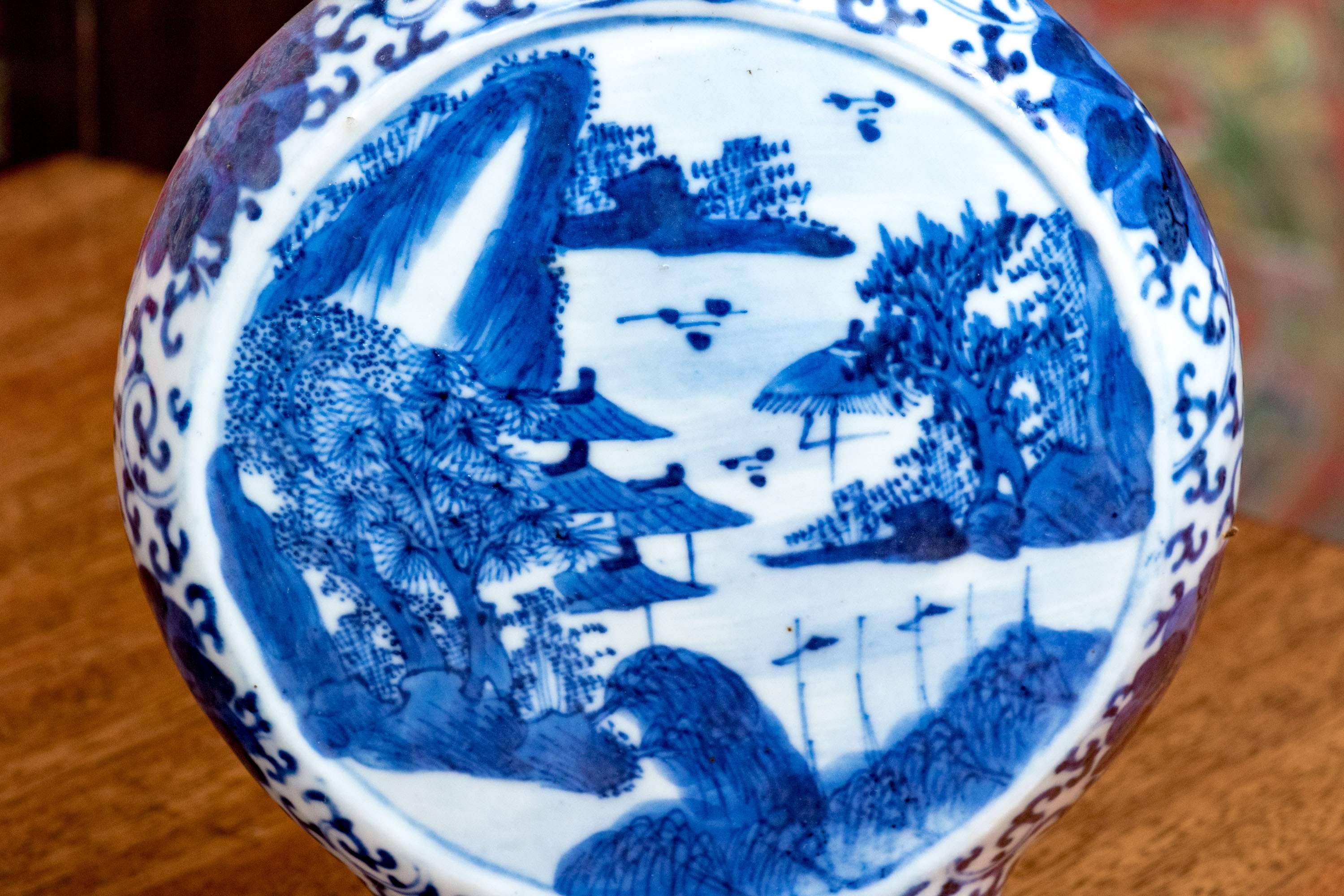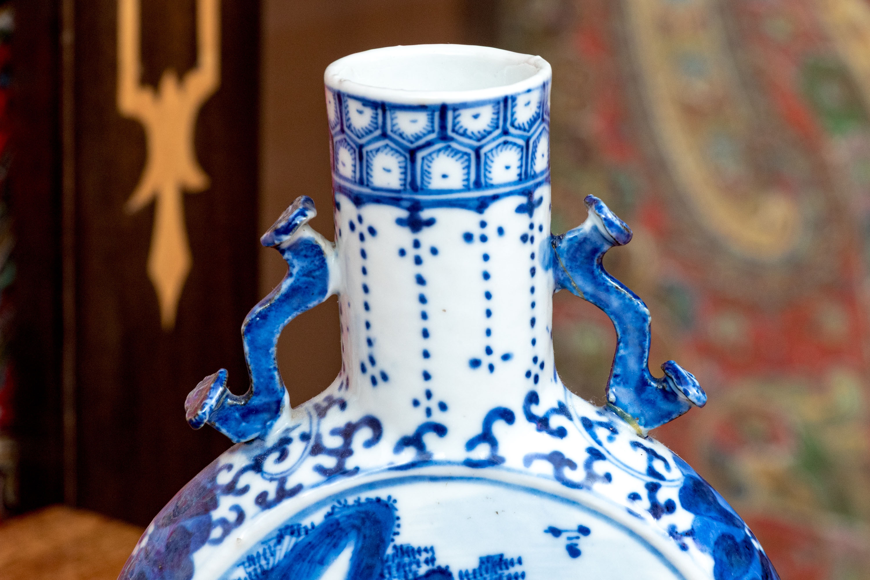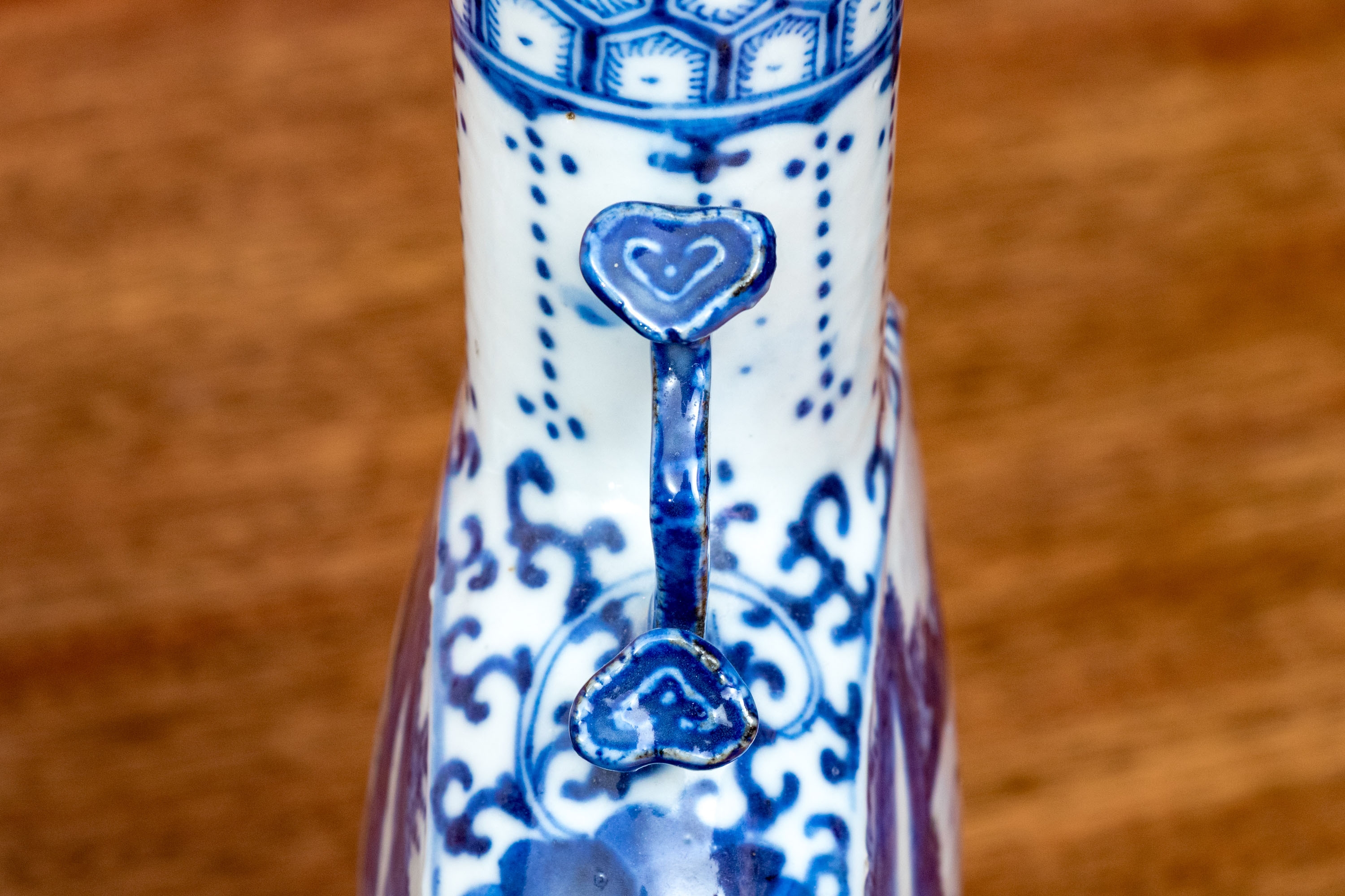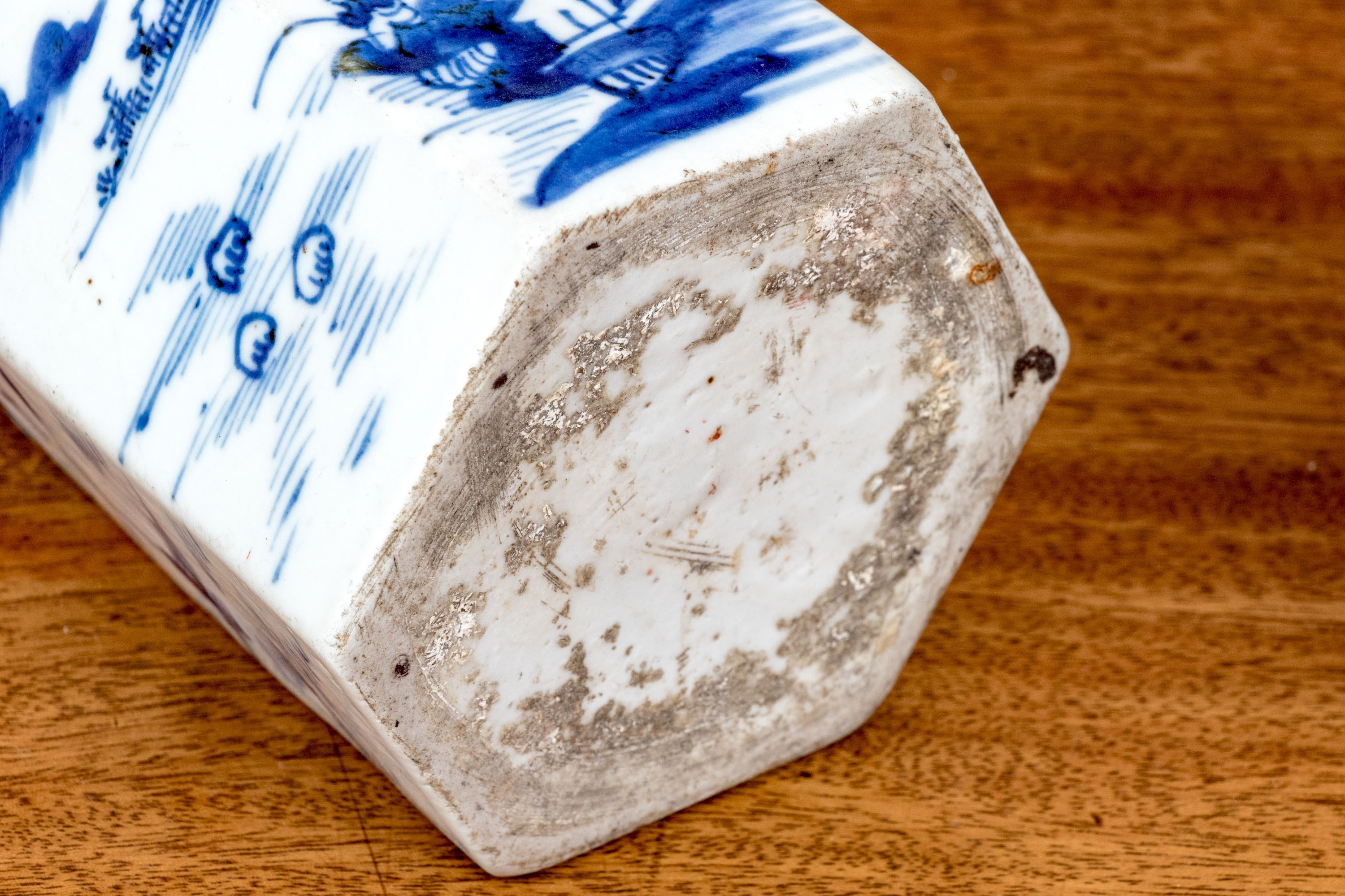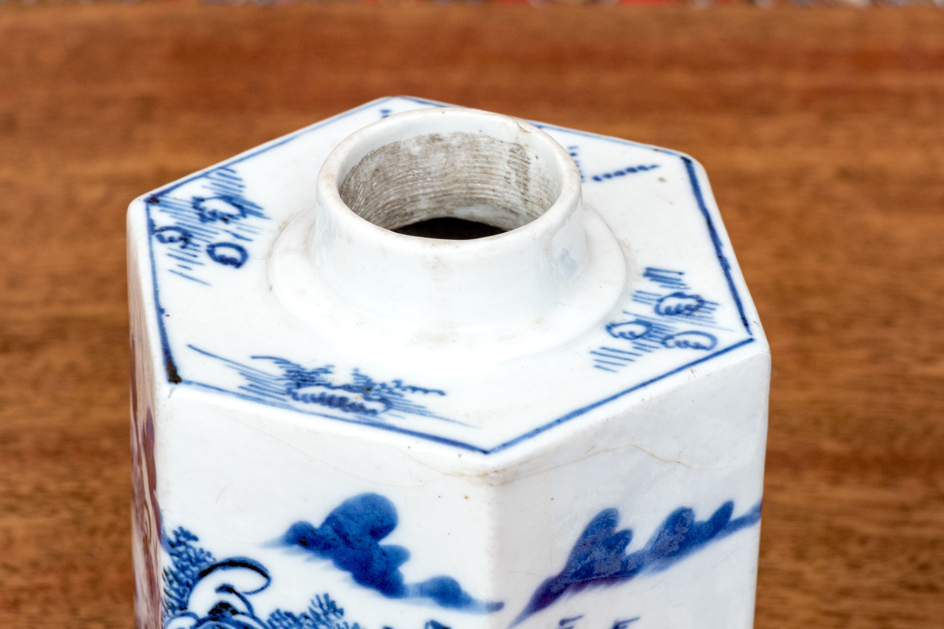Comprised of a twin handled blue and white diminutive moon flask with ruyi scepter form handles. Oval foot with underglaze calligraphic marks together with a hexagonal tea caddy with wooden lid.