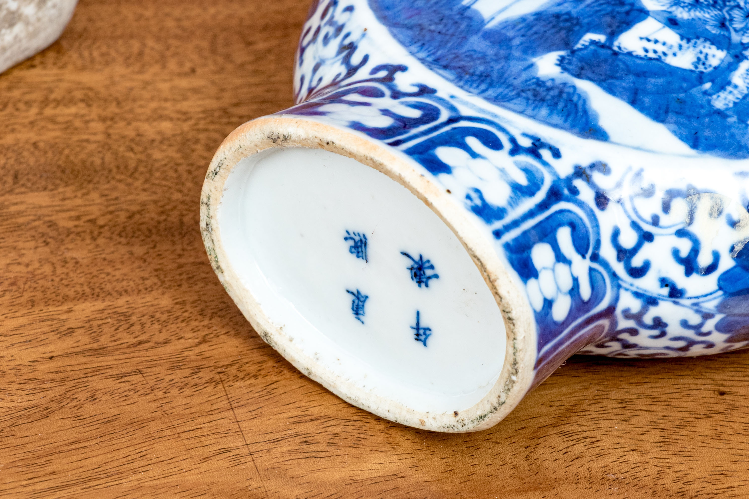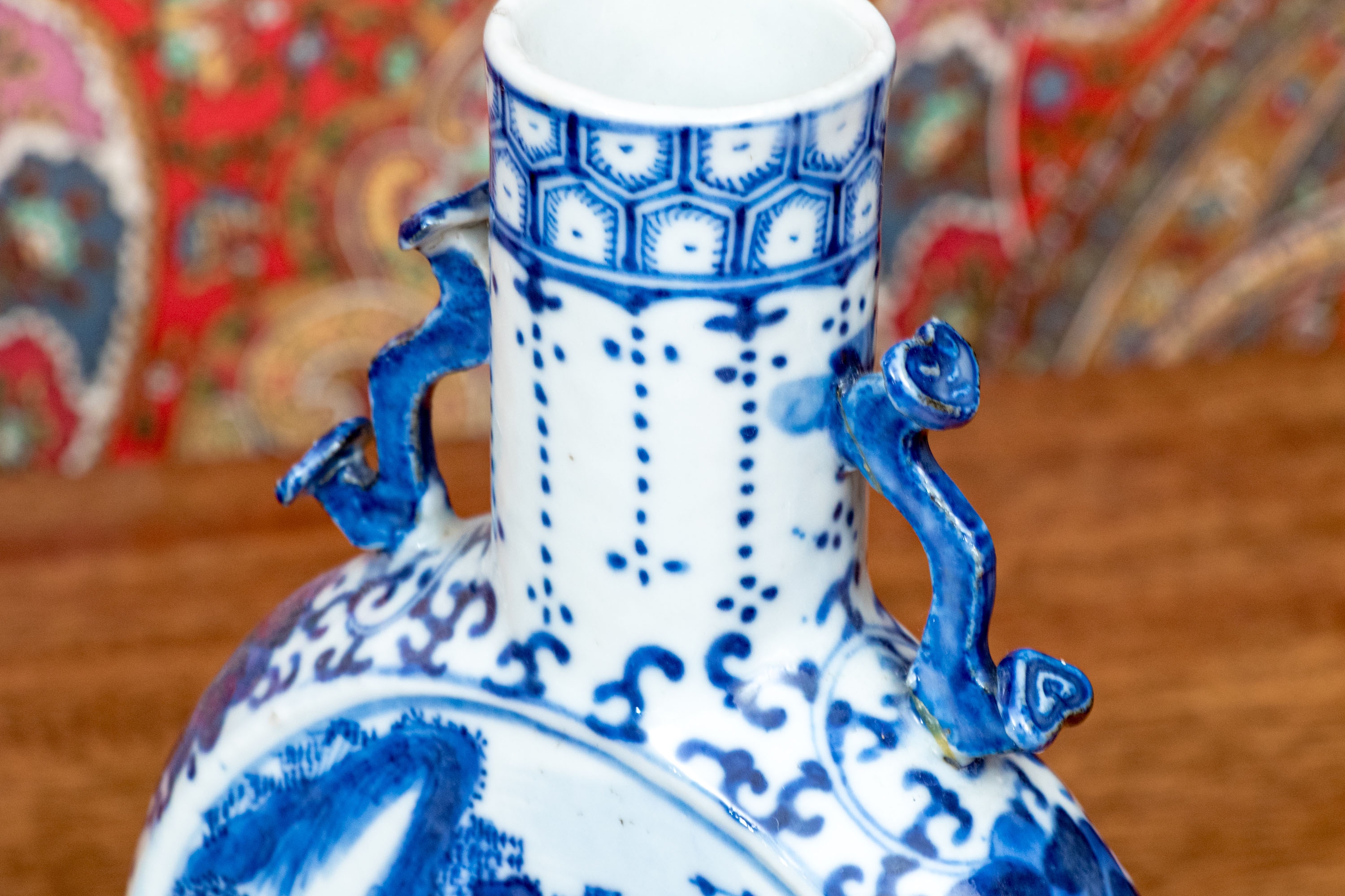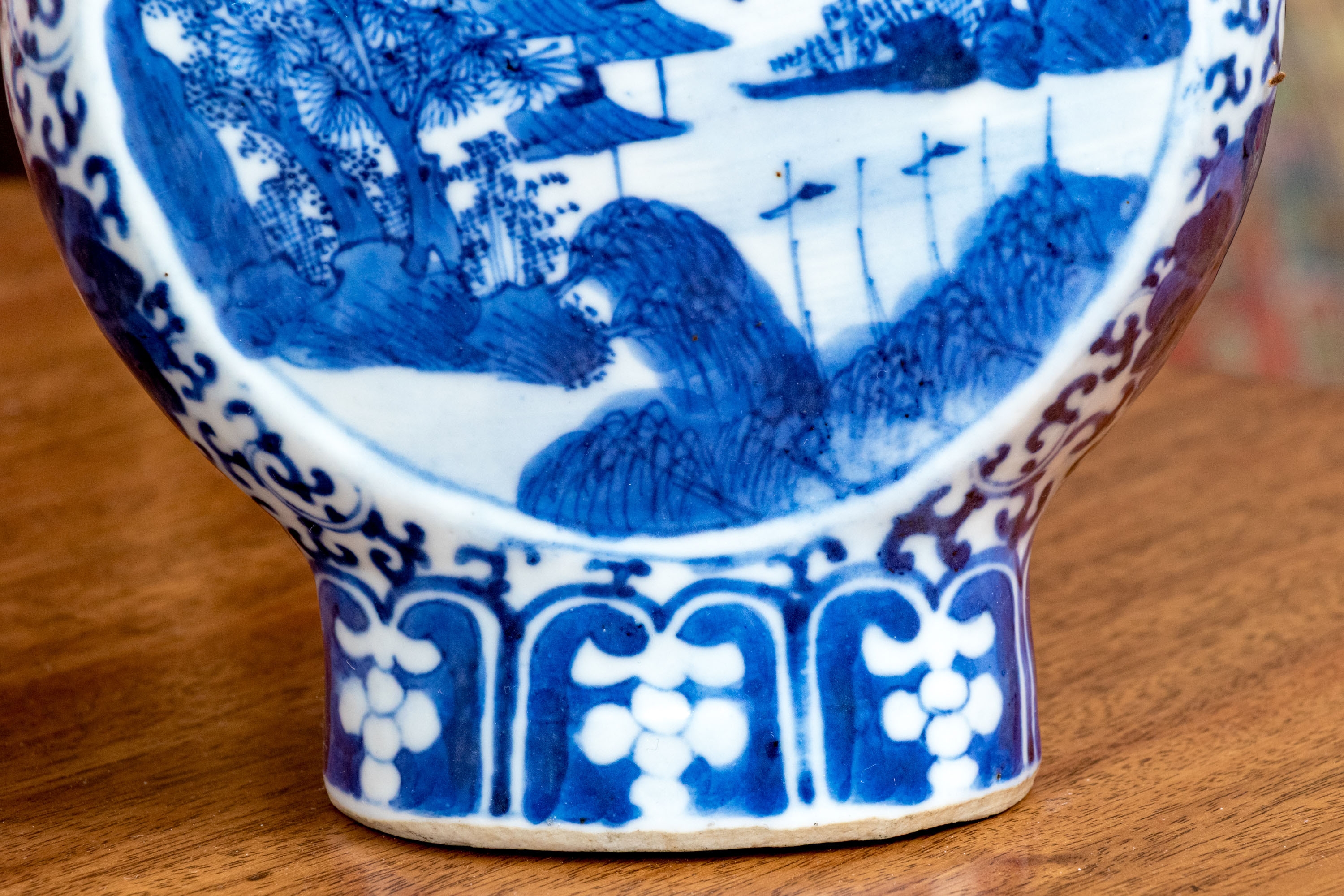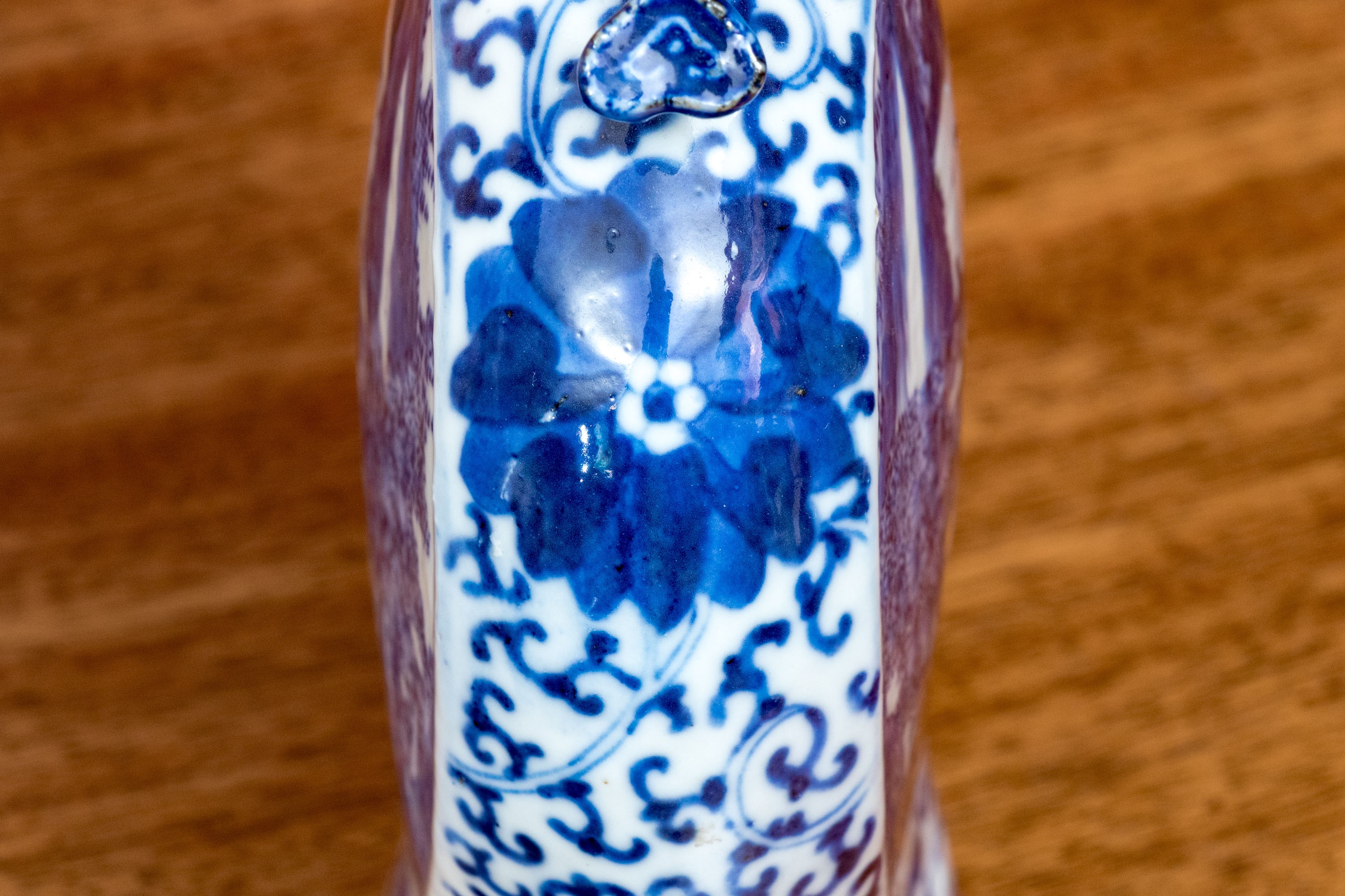 Comprised of a twin handled blue and white diminutive moon flask with ruyi scepter form handles. Oval foot with underglaze calligraphic marks together with a hexagonal tea caddy with wooden lid.