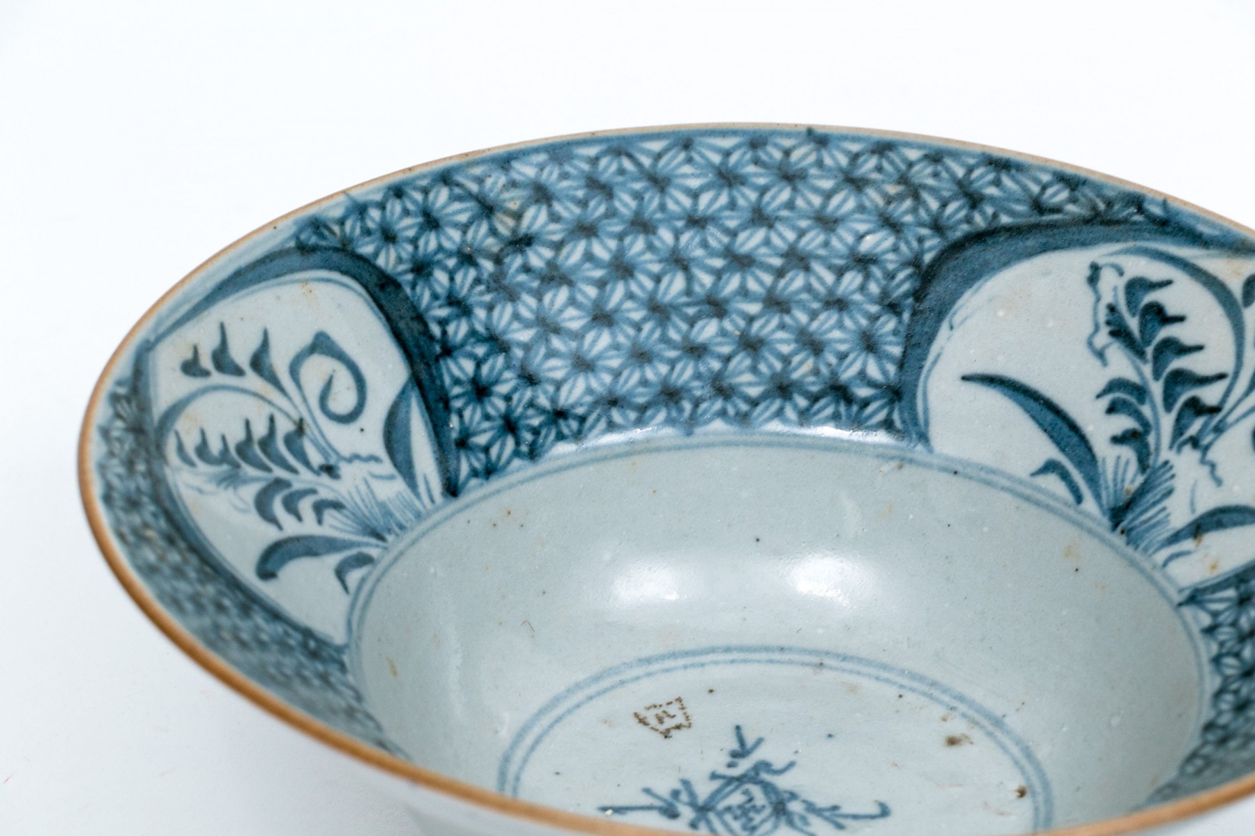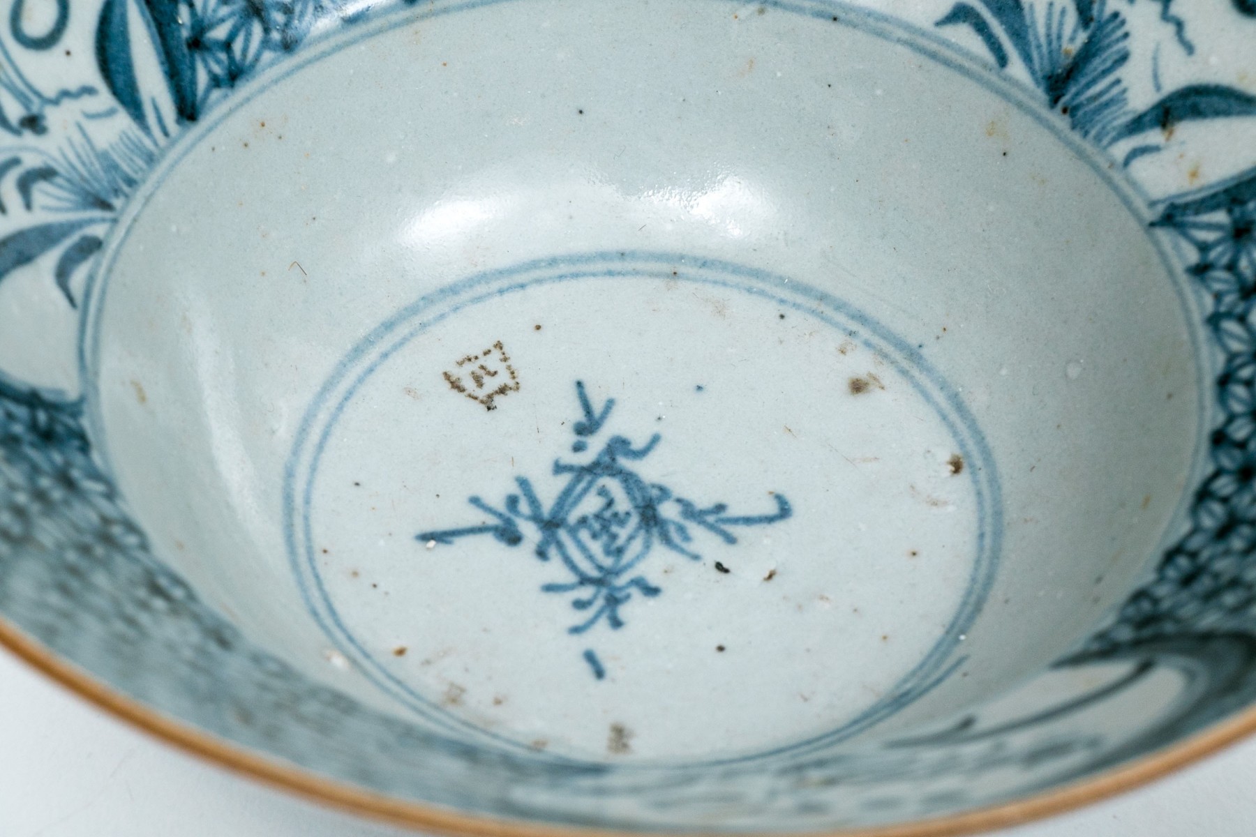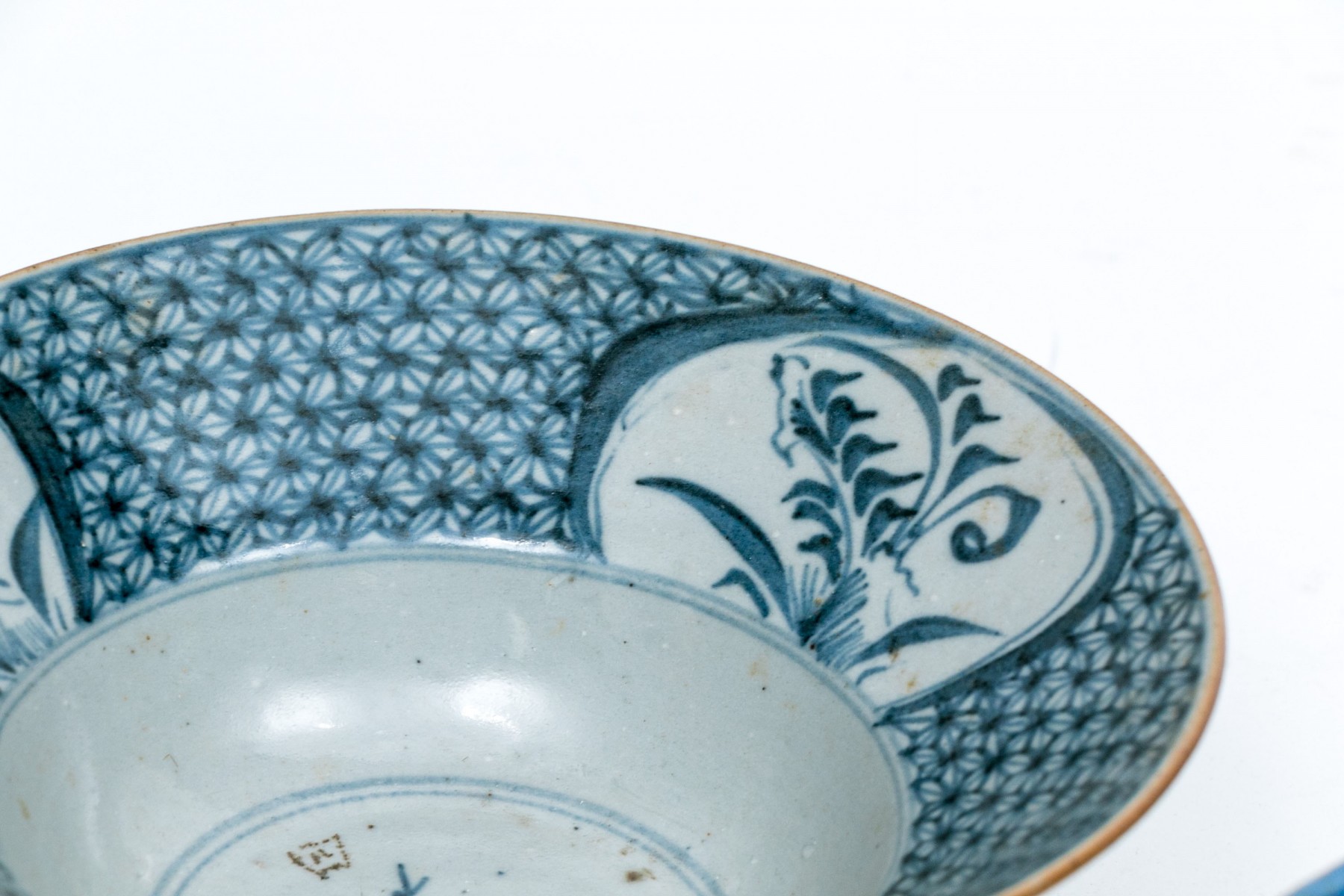 One with a vine pattern inside and larger floral vines on the outside. Mark on the base.