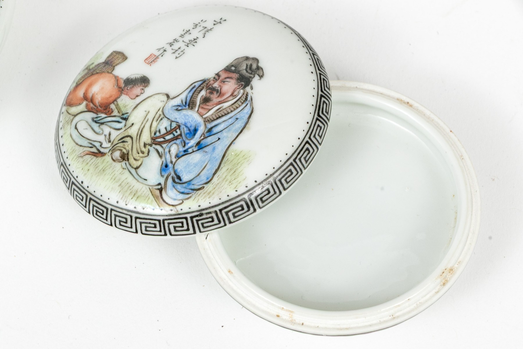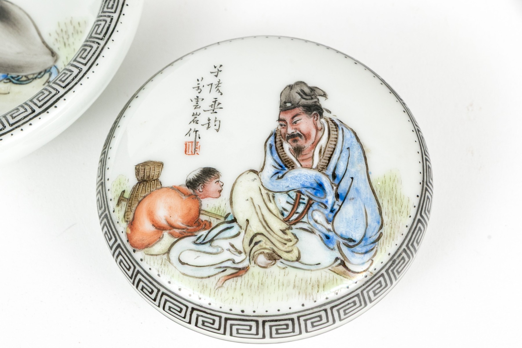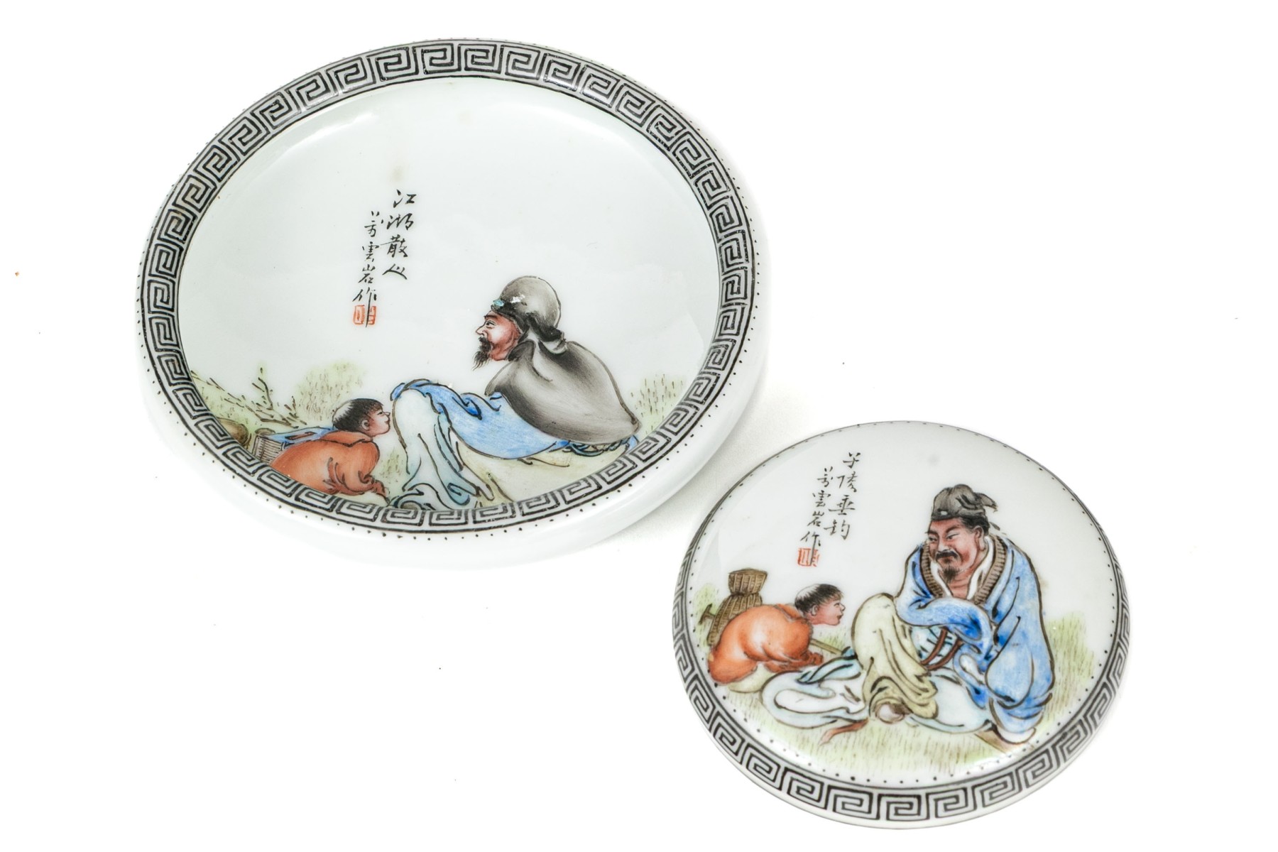 A charming duo of 20-21st century Chinese porcelain wares including a brush washer and lidded seal ink paste box. Both are similarly decorated with scenes of an elder with a child in orange seated in natural landscapes, finished with black fret borders. Marked underfoot.