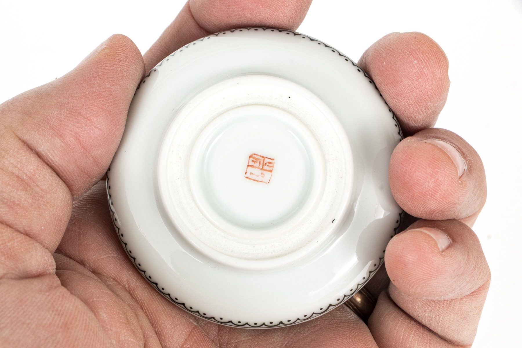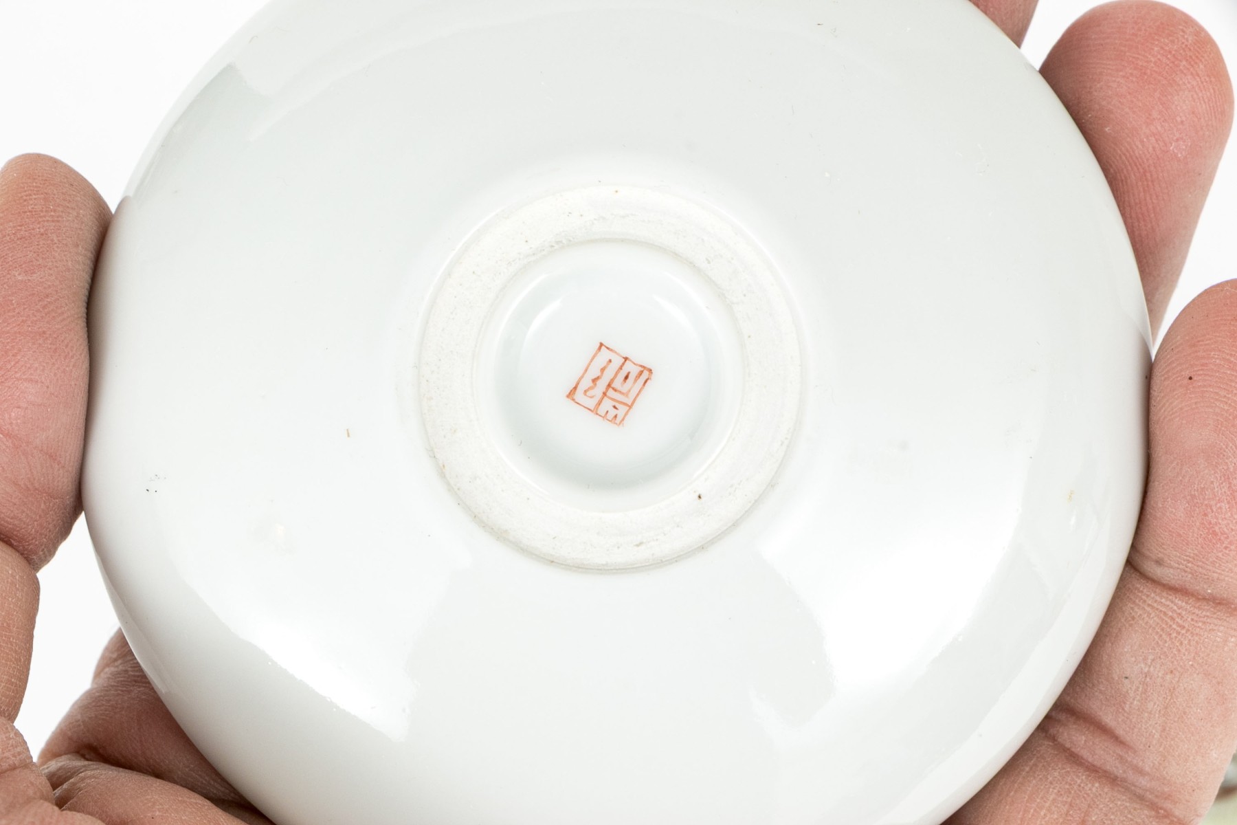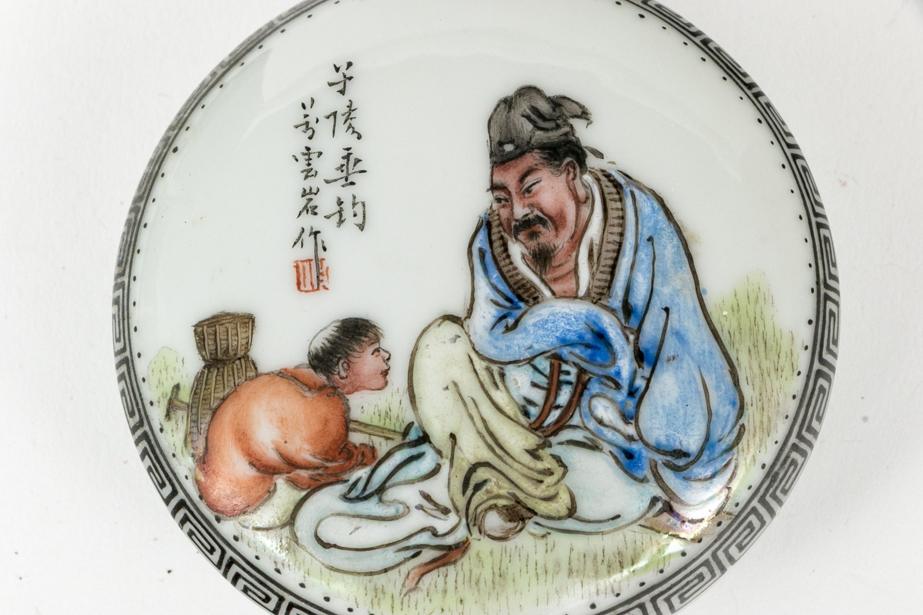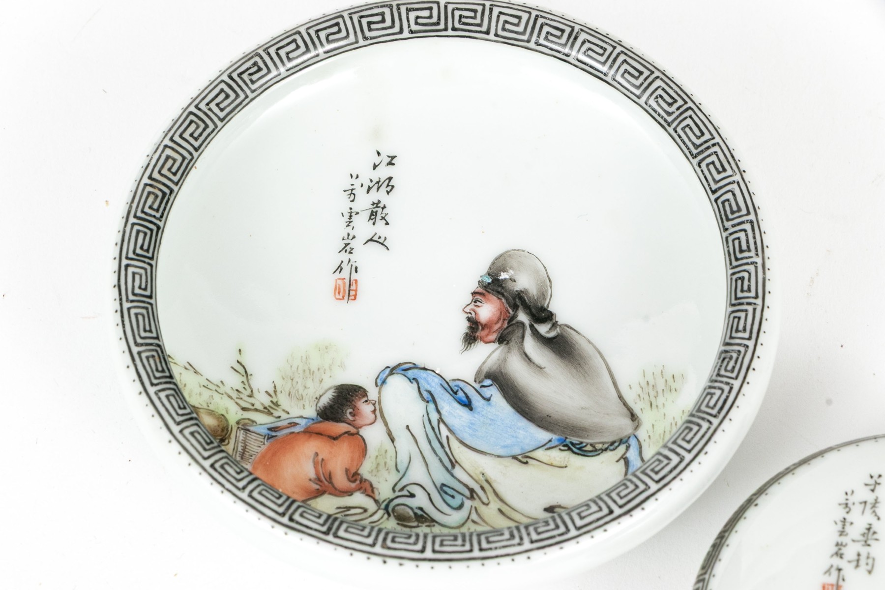 A charming duo of 20-21st century Chinese porcelain wares including a brush washer and lidded seal ink paste box. Both are similarly decorated with scenes of an elder with a child in orange seated in natural landscapes, finished with black fret borders. Marked underfoot.