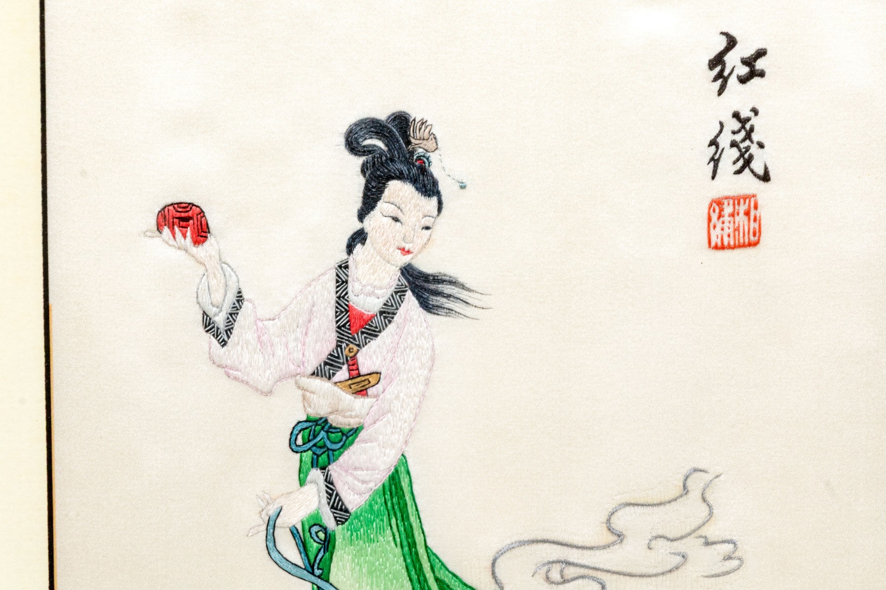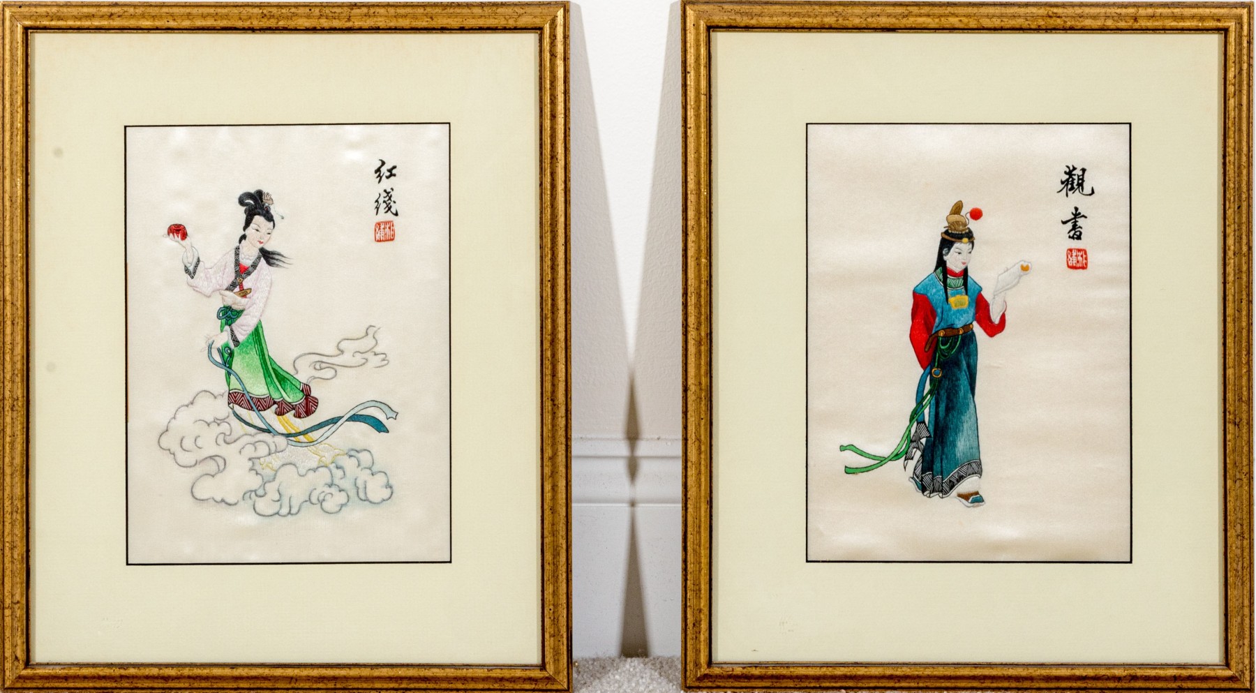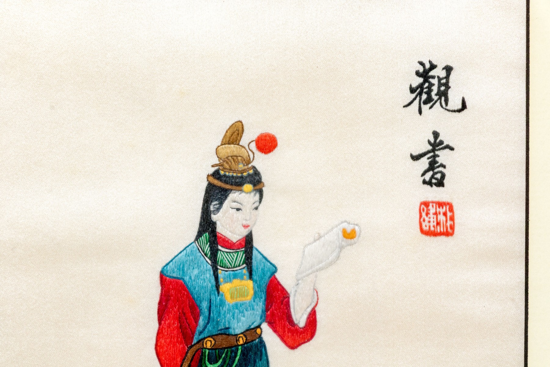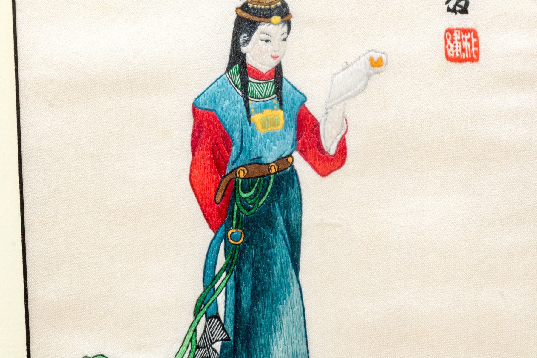 A fabulous duo of Chinese silk embroideries depicting figures in beautiful traditional attire against cream white backgrounds. Each with embroidered inscriptions and red seals upper right.