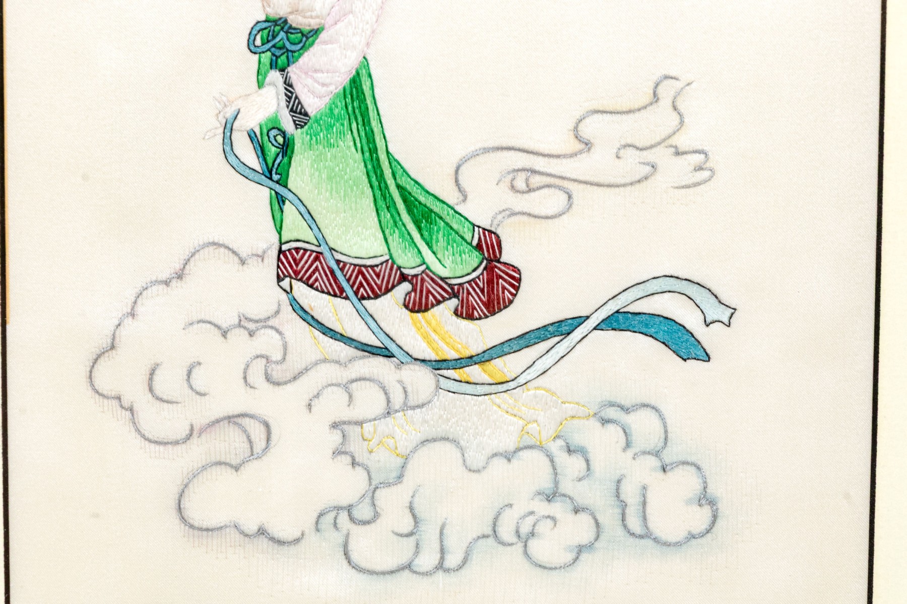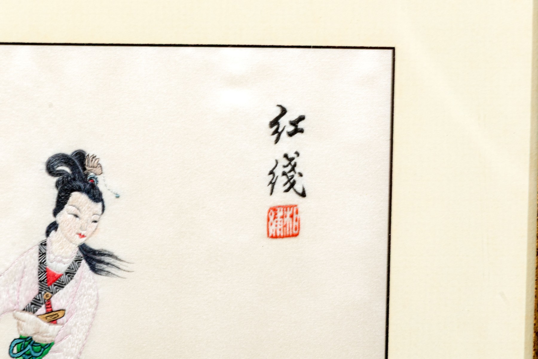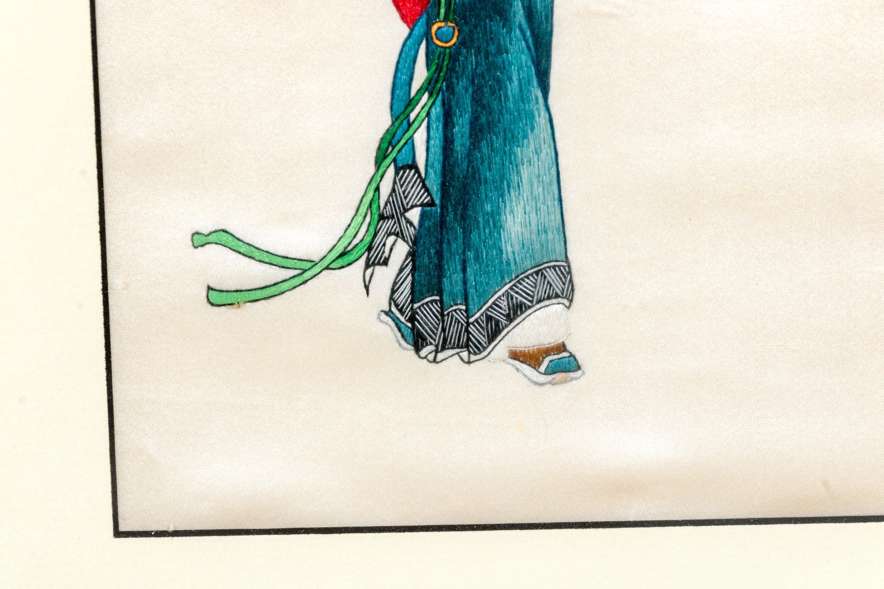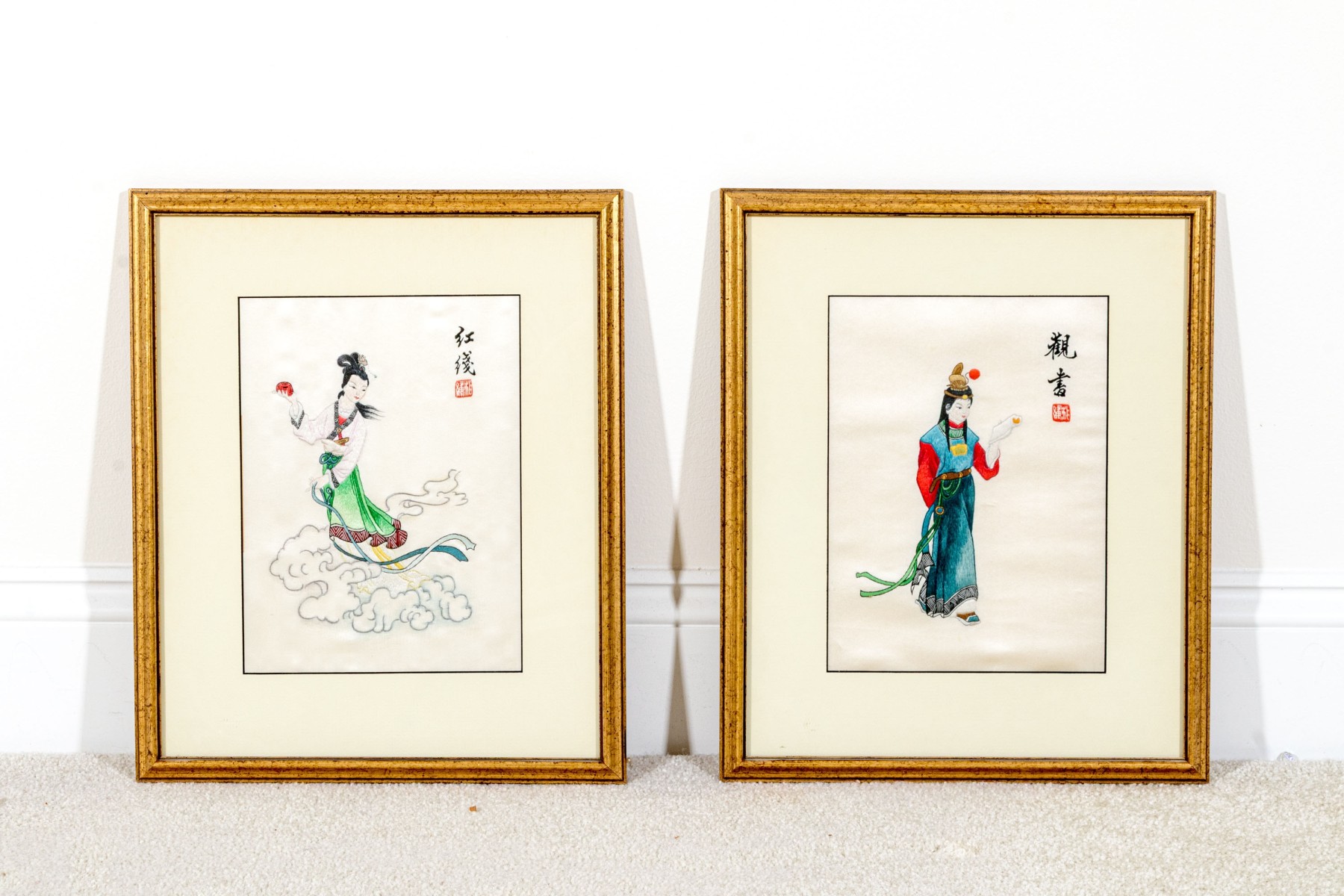 A fabulous duo of Chinese silk embroideries depicting figures in beautiful traditional attire against cream white backgrounds. Each with embroidered inscriptions and red seals upper right.