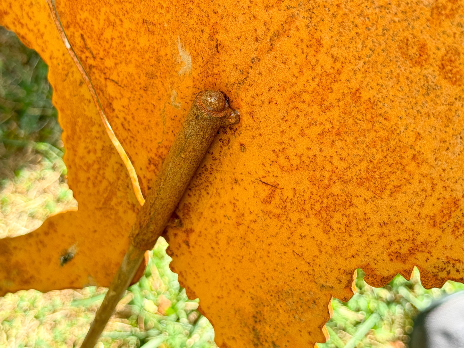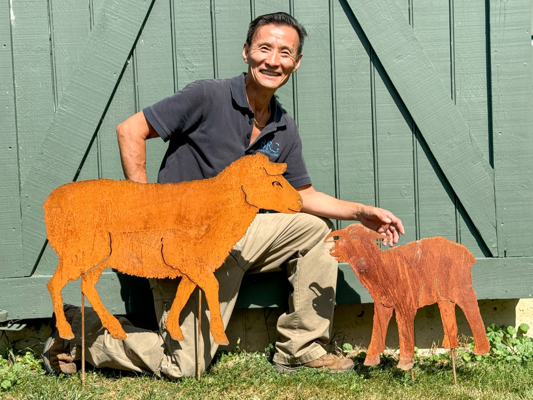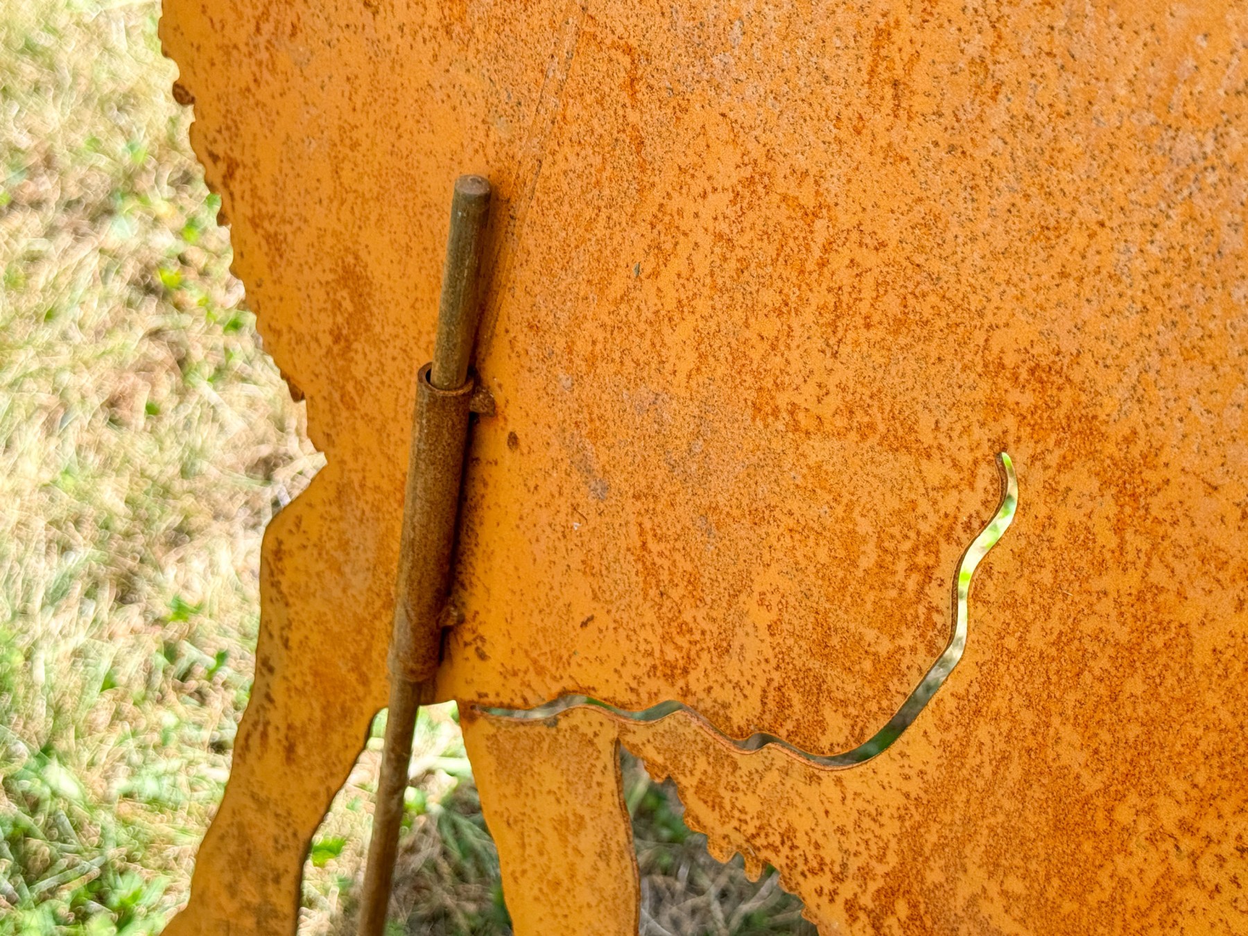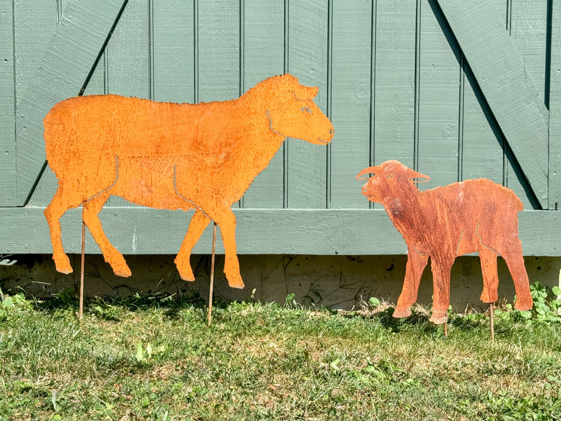 A fabulous duo of wrought iron garden ornaments depicting the silhouette of a sheep and lamb in orange and red-brown hues. A perfectly whimsical addition for any farmhouse, ranch, or lodge.
