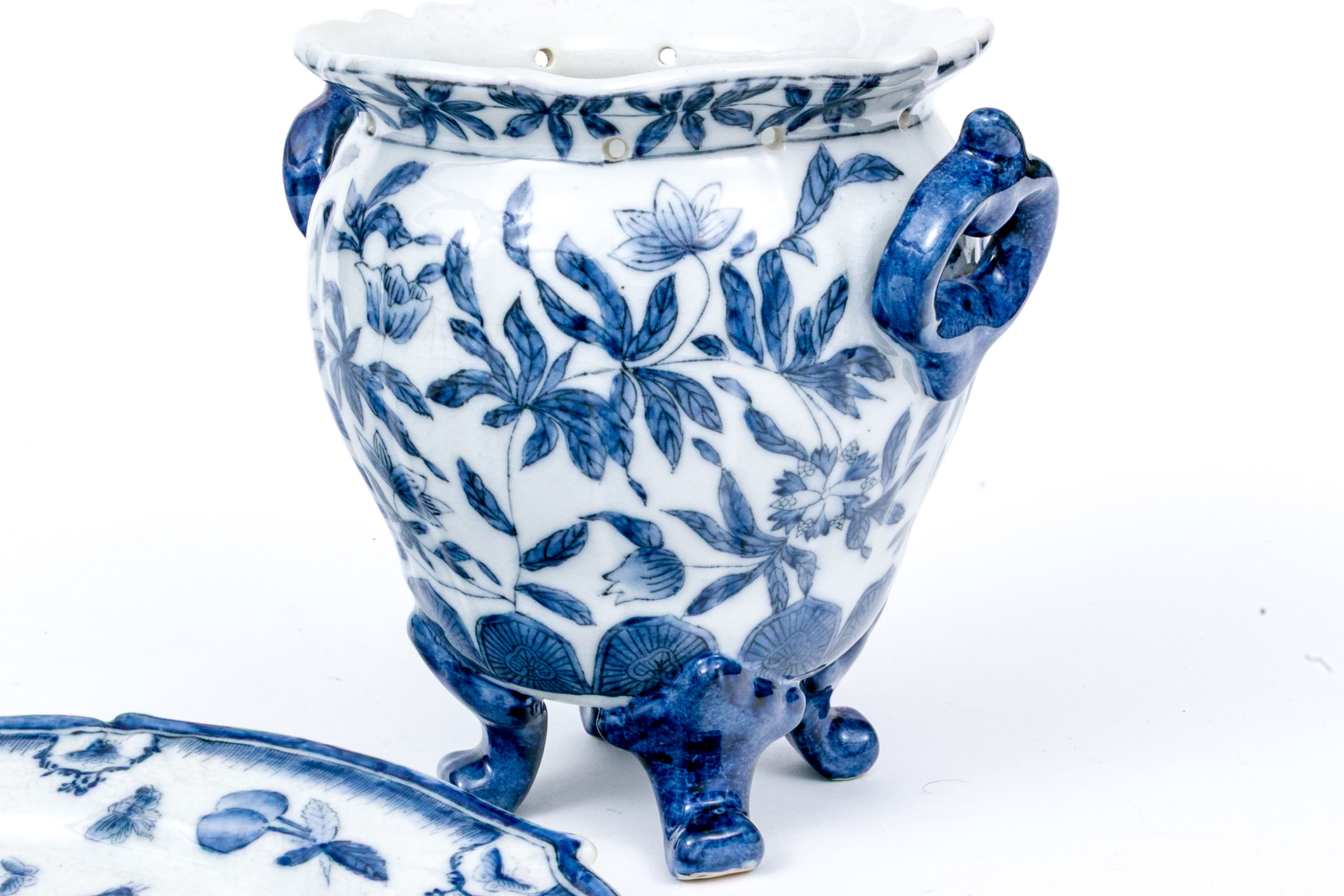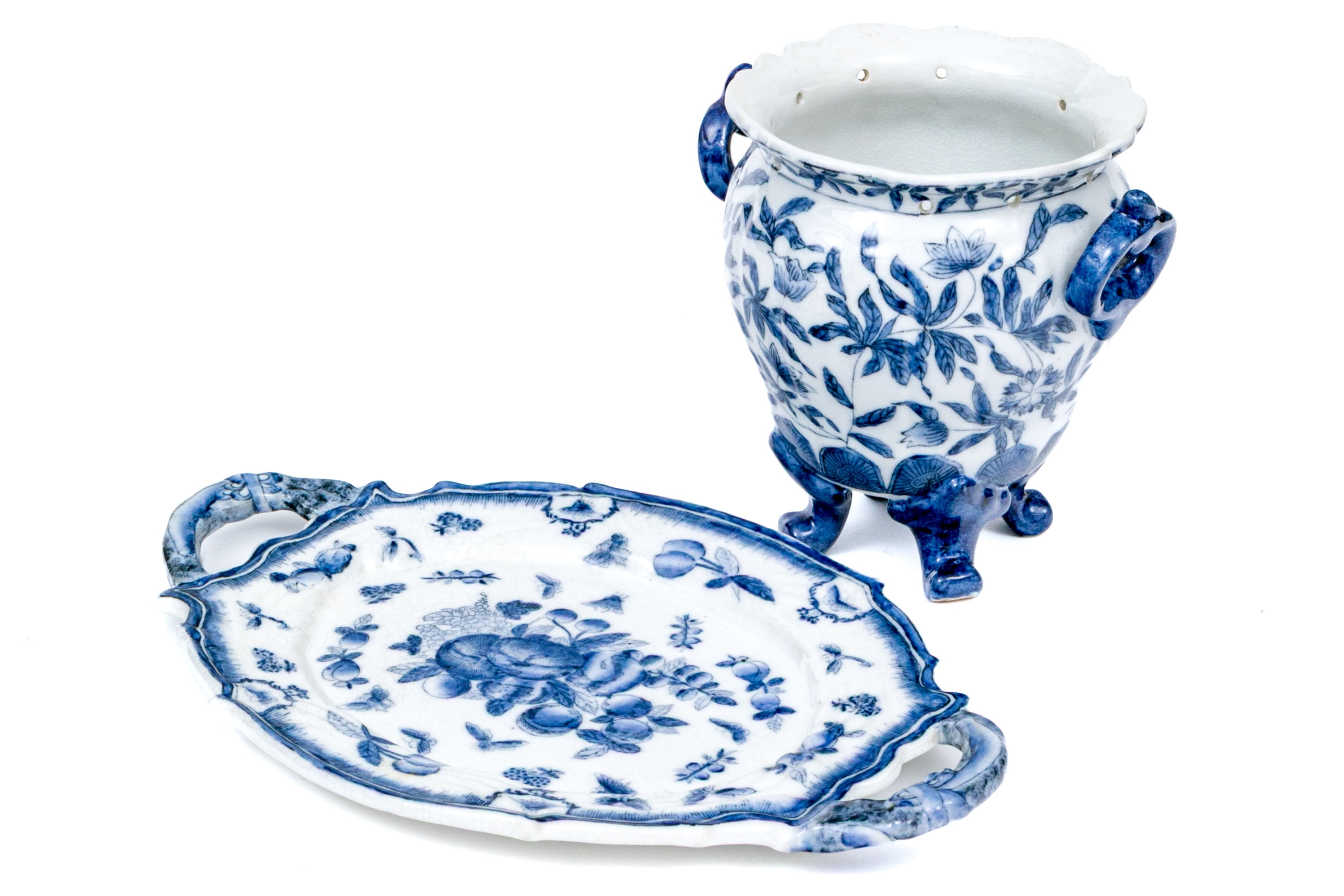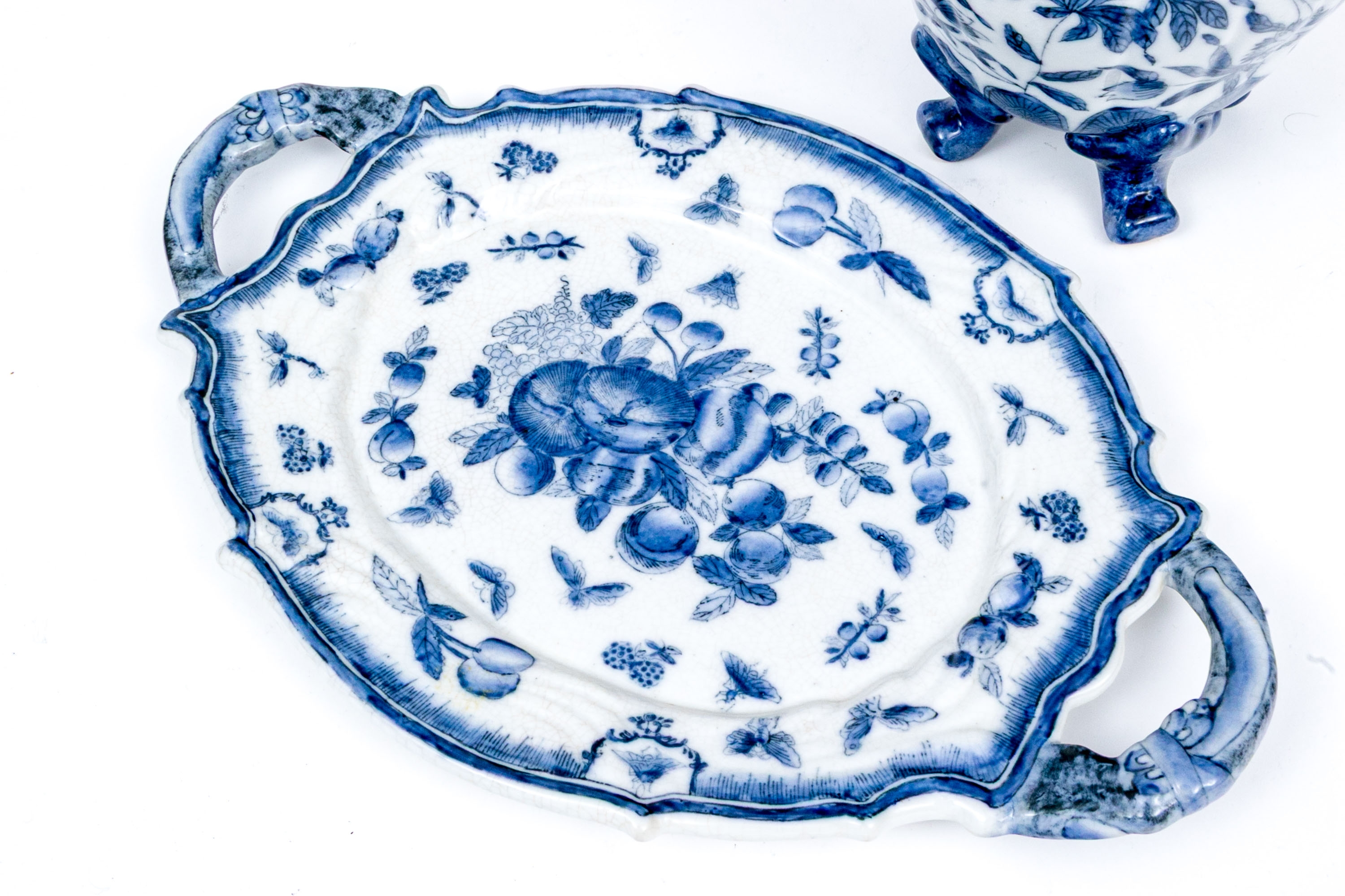 Comprised of a twin handled oval tray with peach, lotus and other floral motifs, together with a twin handled, footed blue and white porcelain vase form birdbath. The neck flares outward with stylized trim with ten pierced holes evenly spaced to the mouth rim for stringing and hanging.