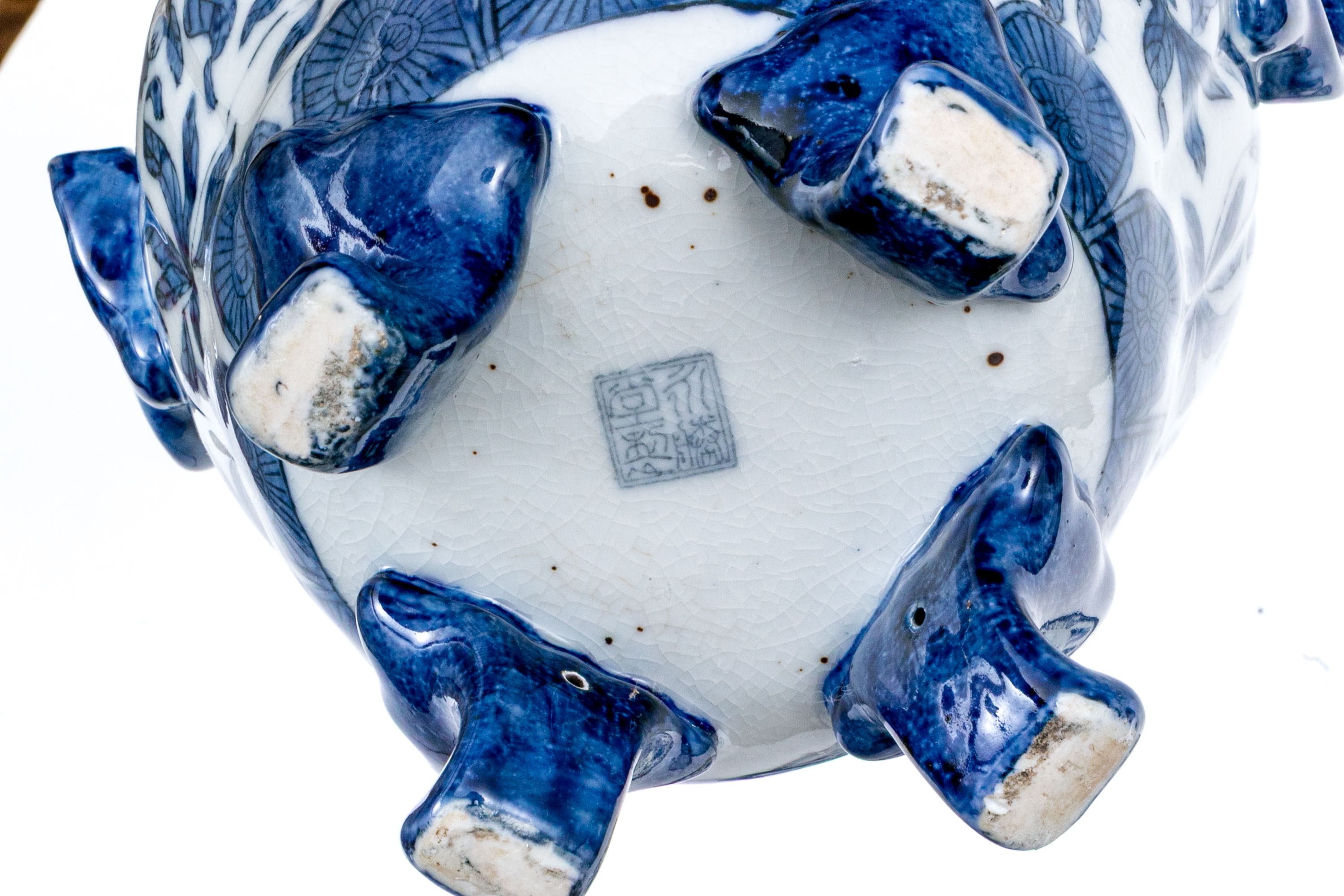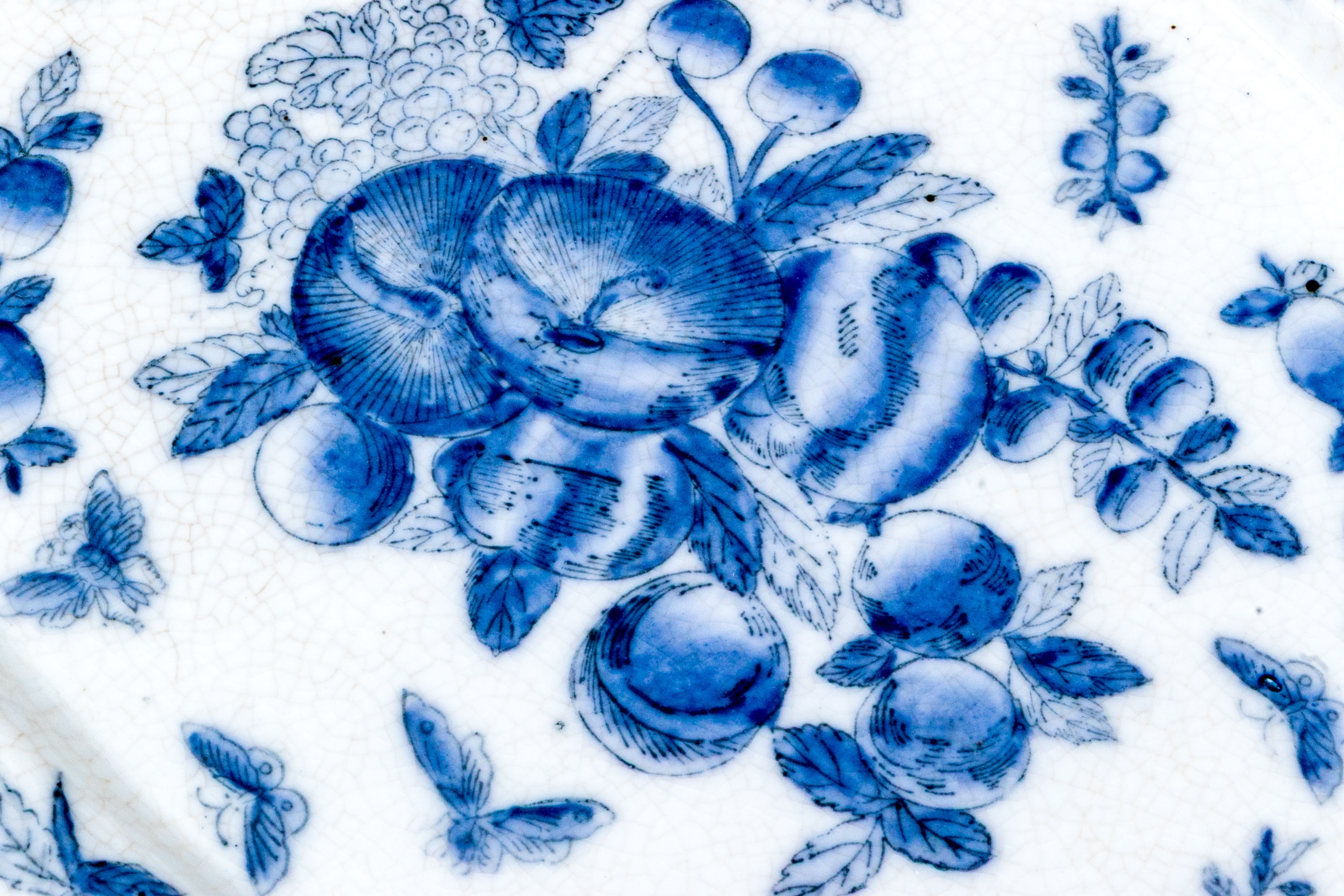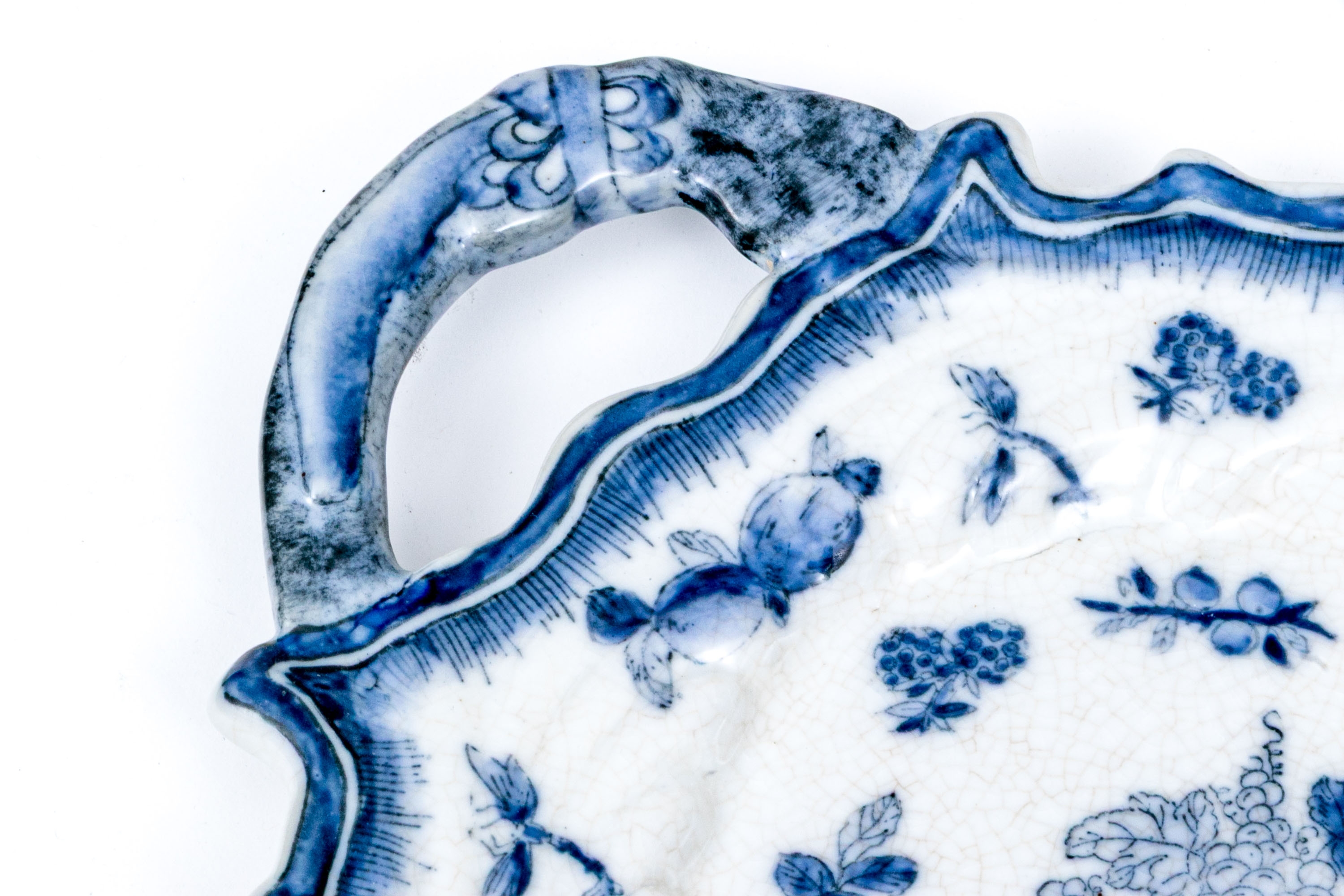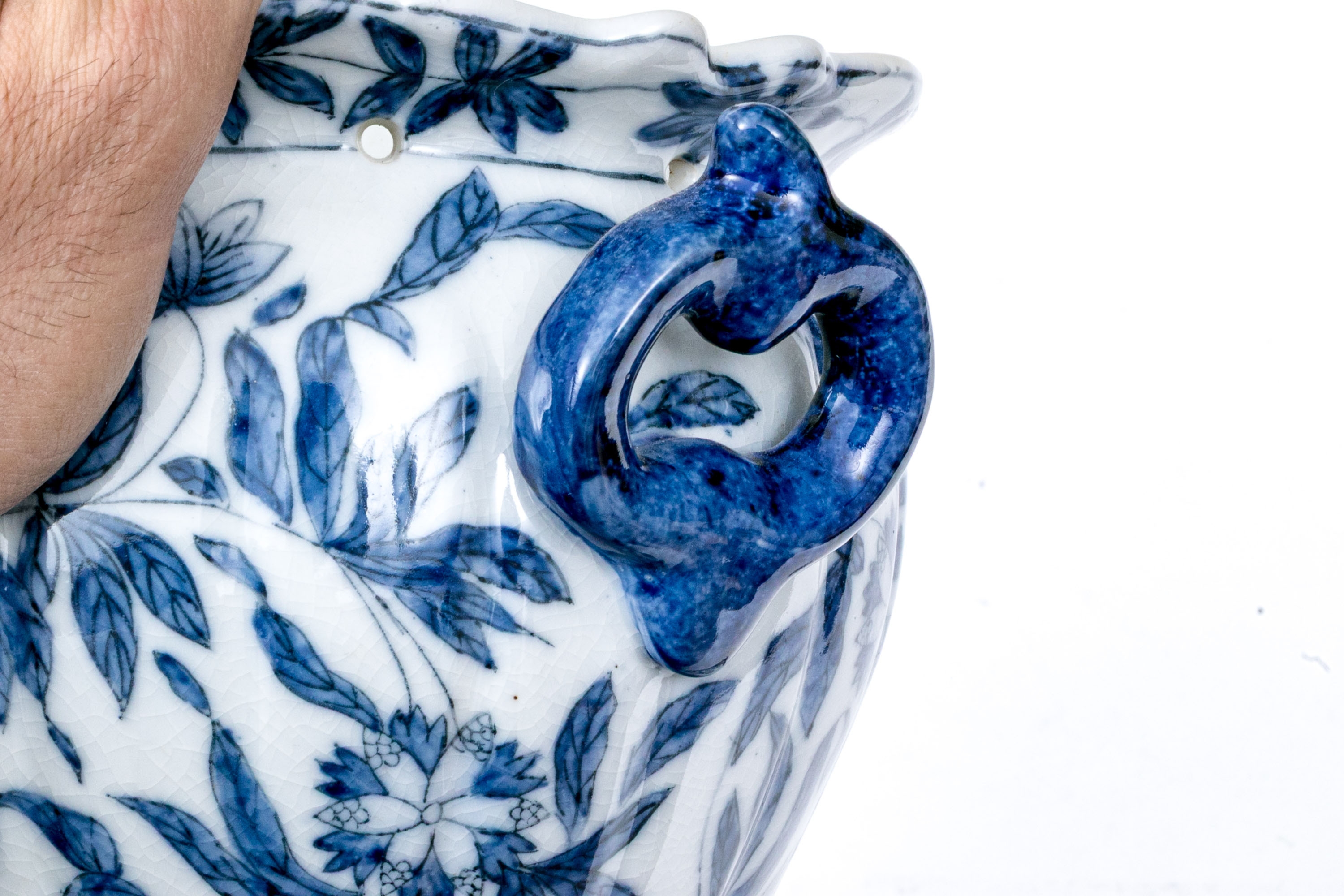 Comprised of a twin handled oval tray with peach, lotus and other floral motifs, together with a twin handled, footed blue and white porcelain vase form birdbath. The neck flares outward with stylized trim with ten pierced holes evenly spaced to the mouth rim for stringing and hanging.