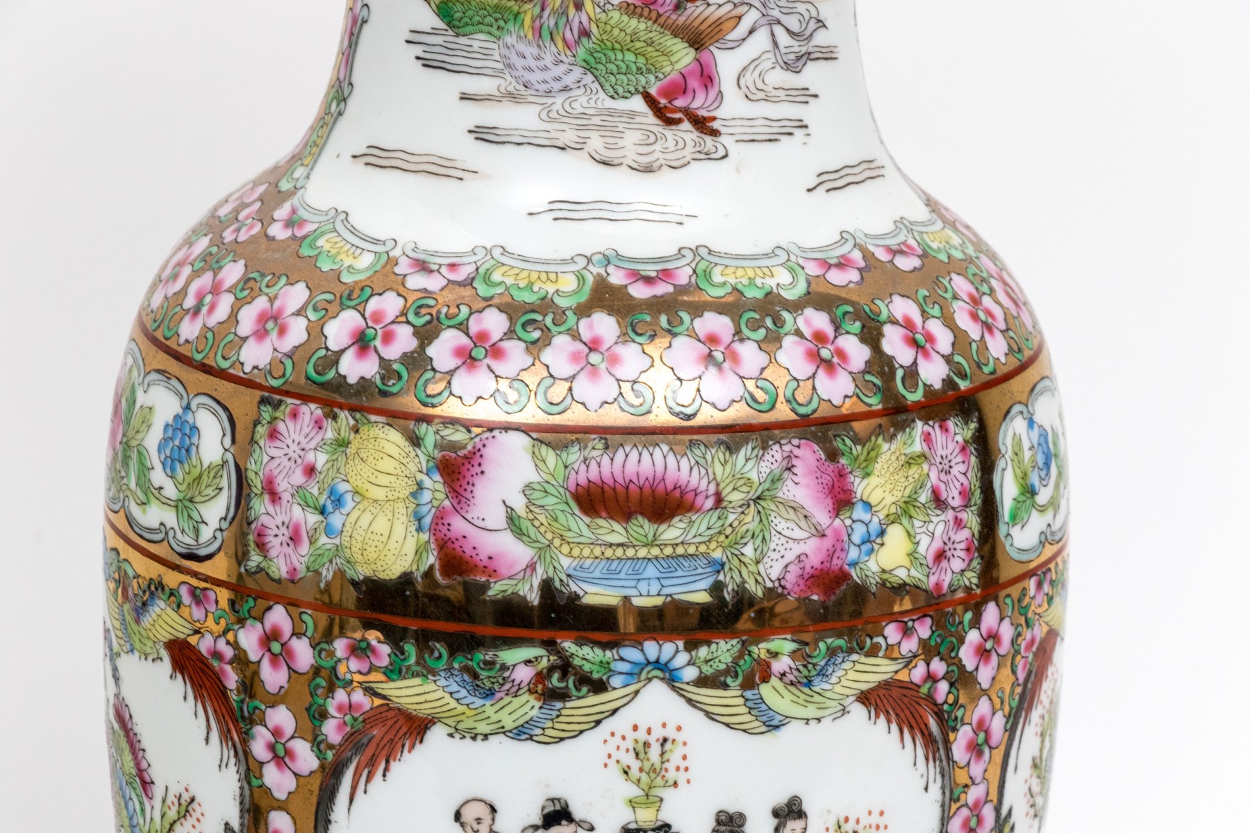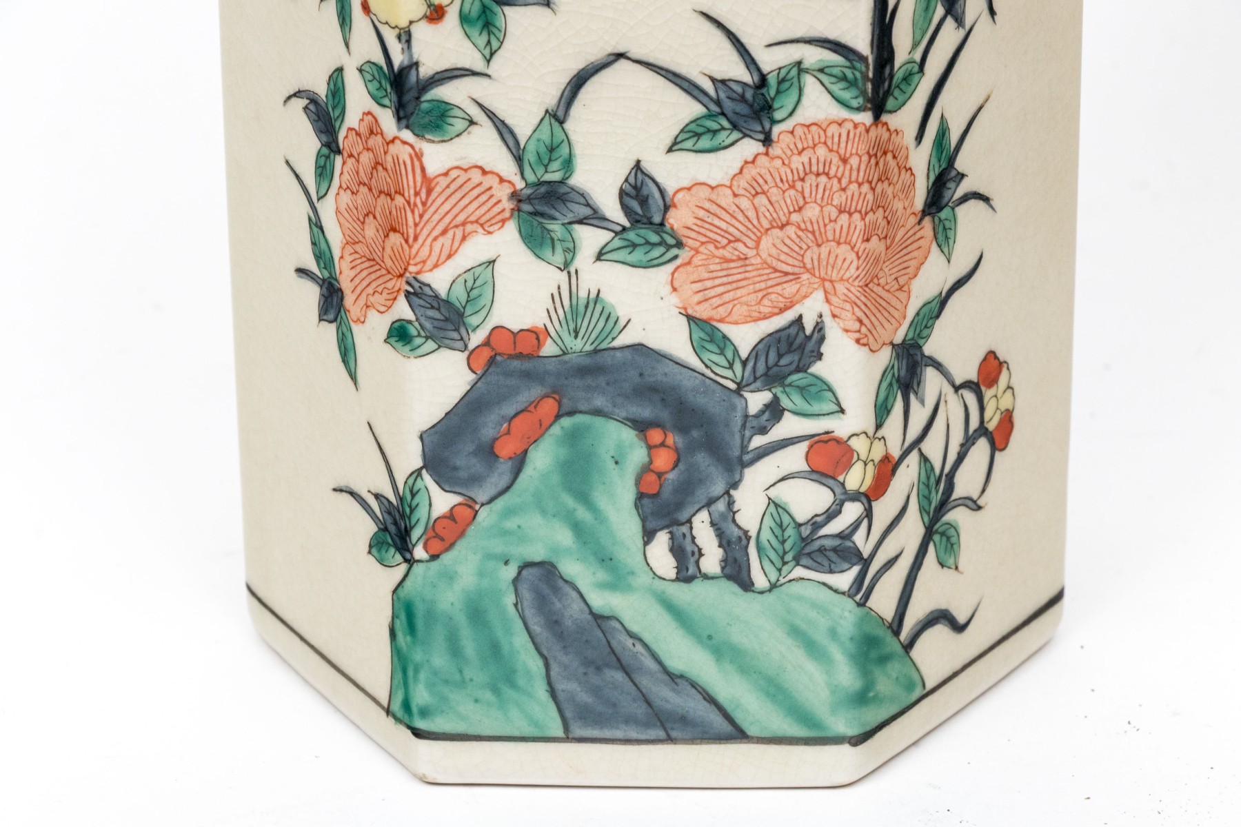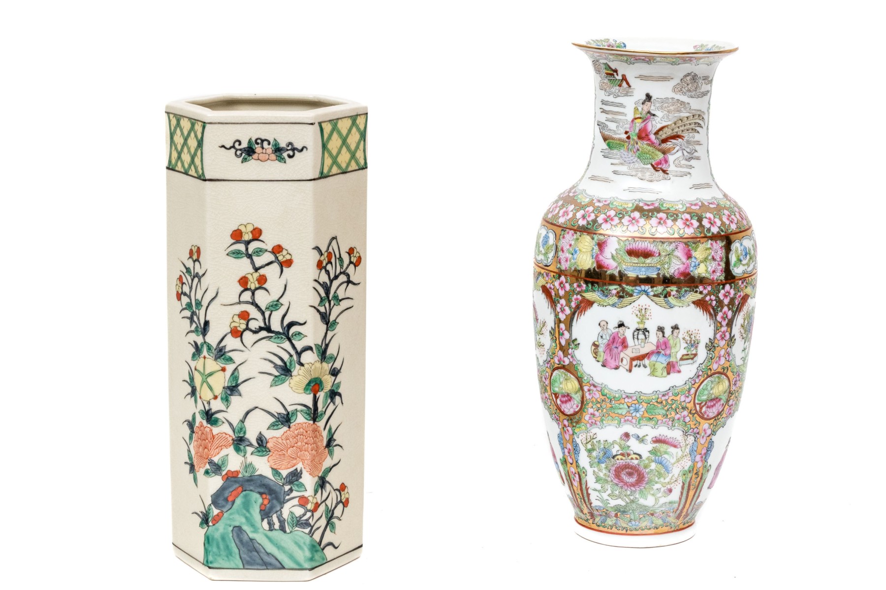 Comprised of a Chinese export famille rose medallion porcelain vase, together with a hexagonal form crackle glazed famille verte decorated porcelain vase, marked made in Hong Kong underfoot.