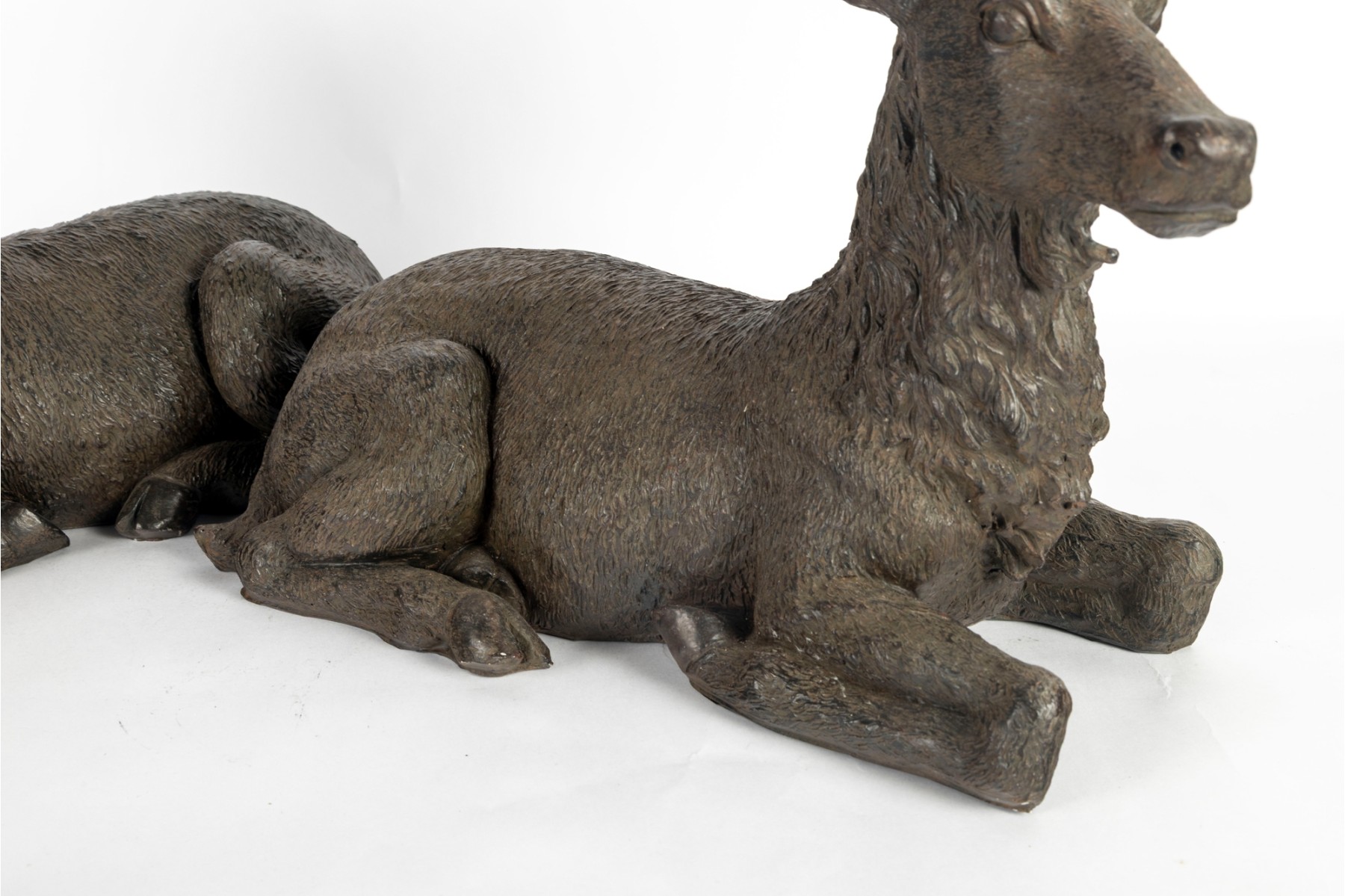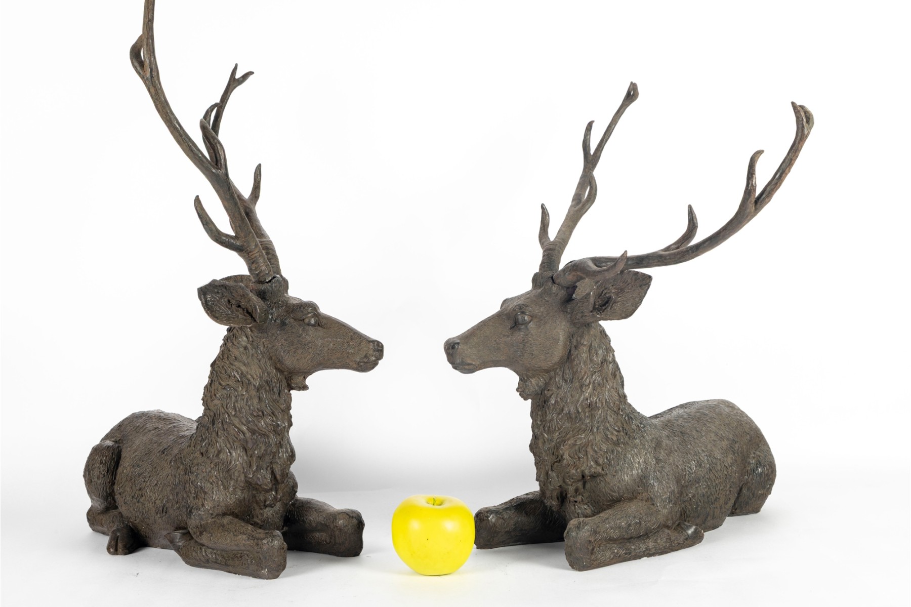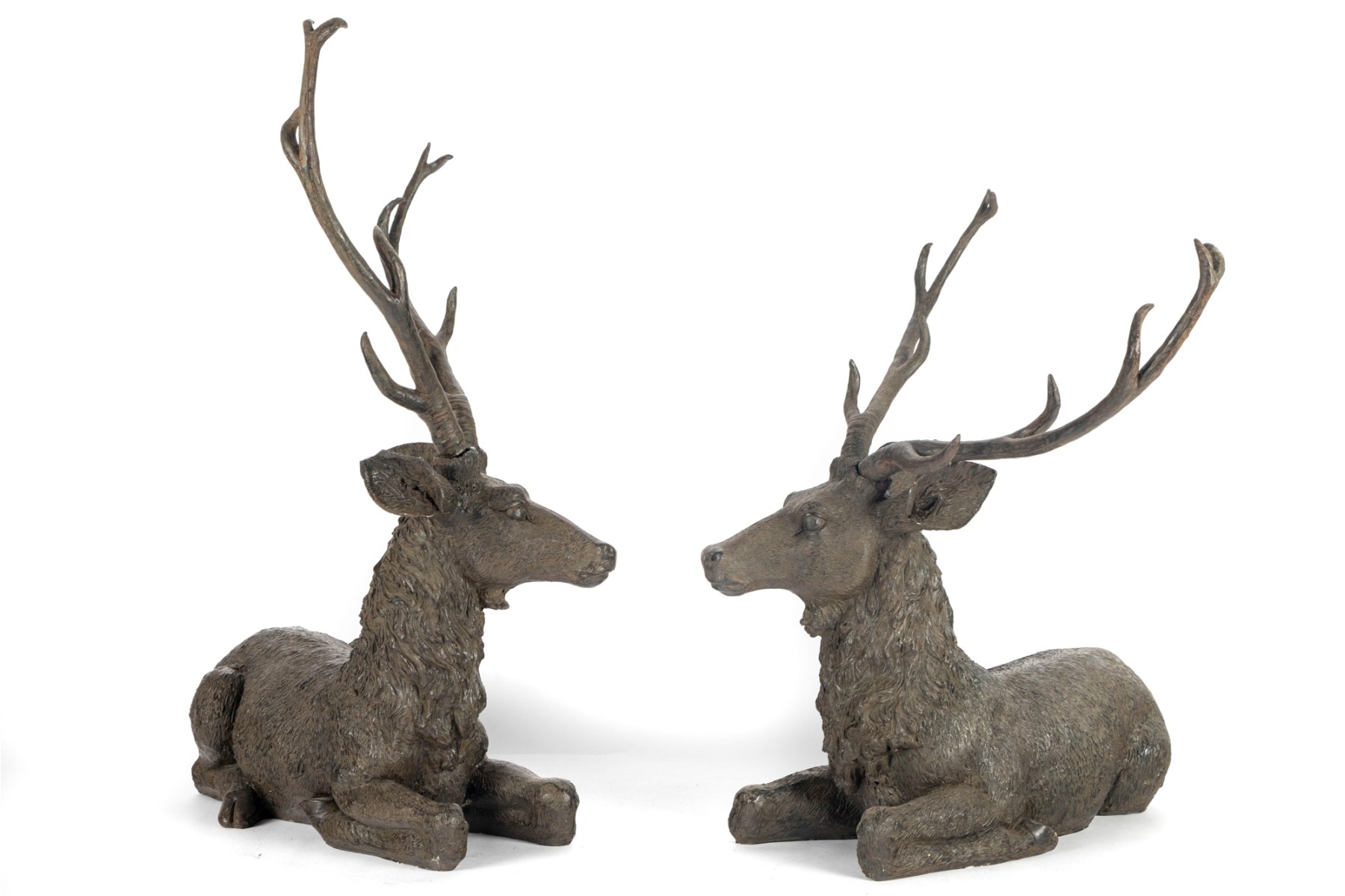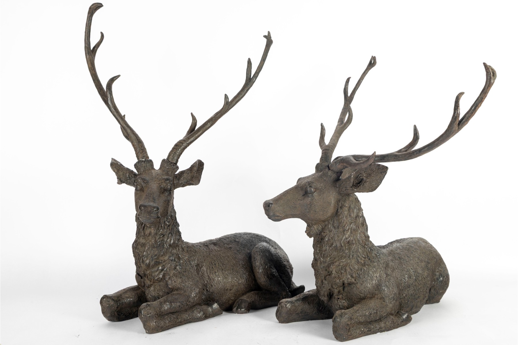 Two sitting Elk figures, complete with detachable antlers and crafted of resin for both indoor & outdoor use.