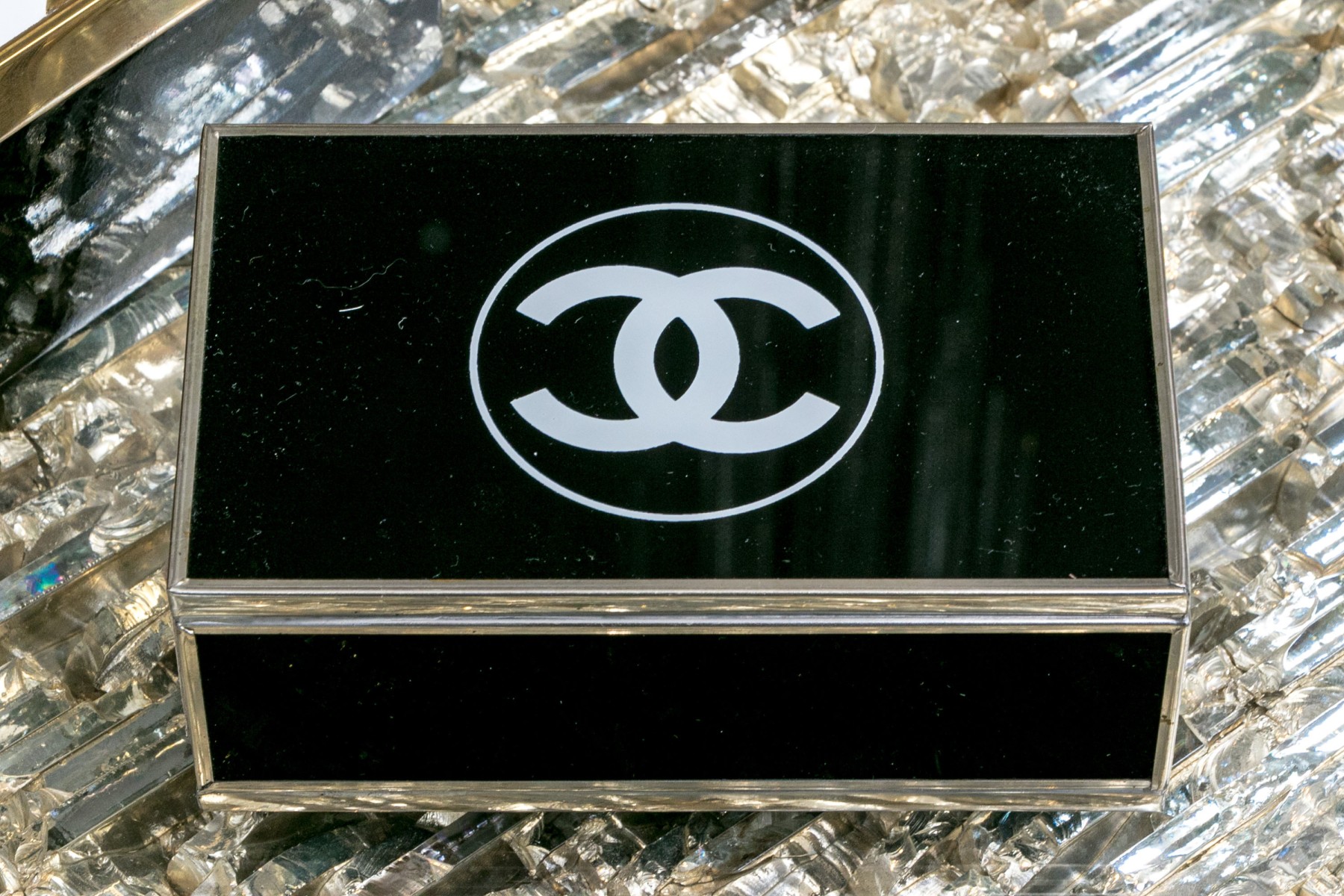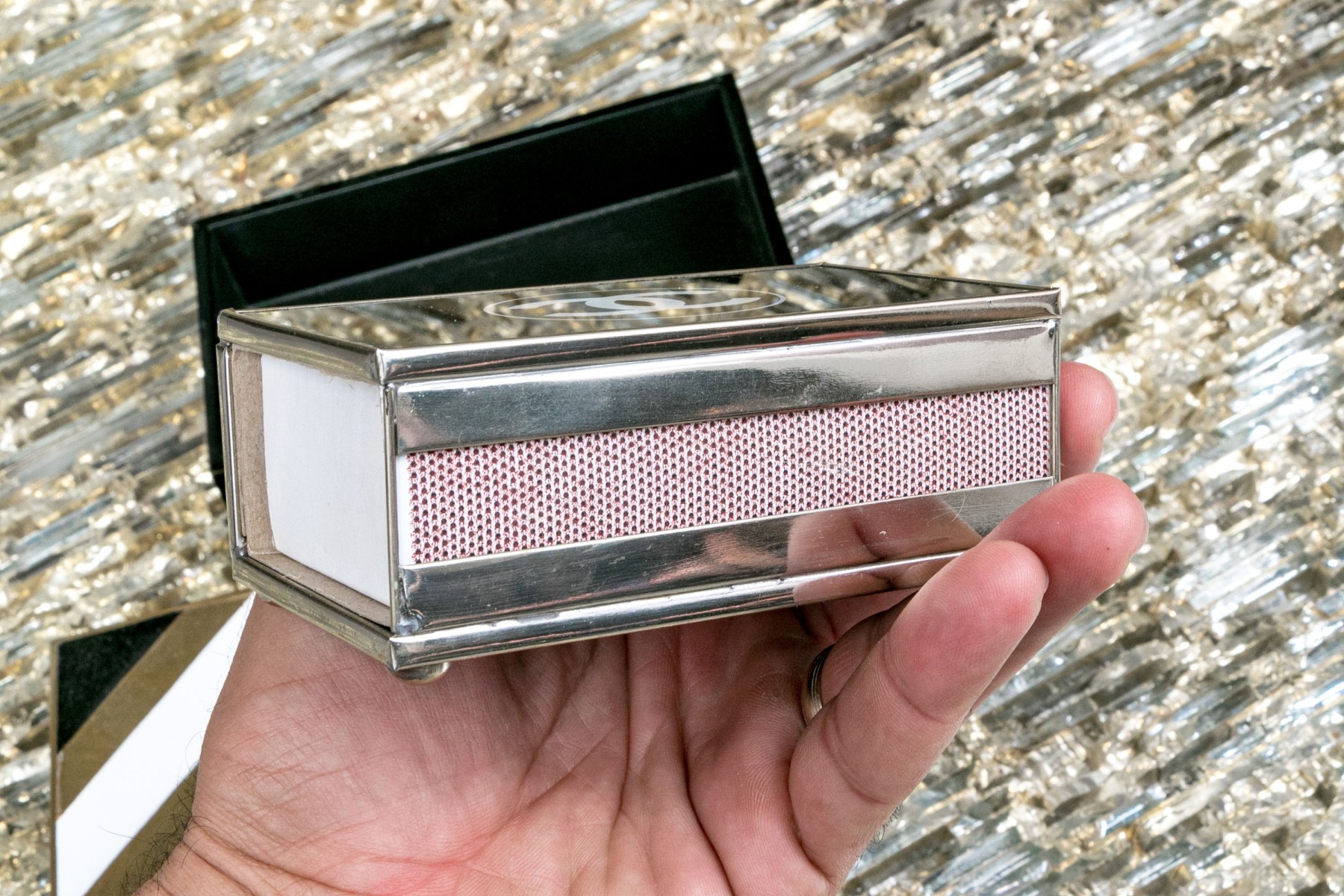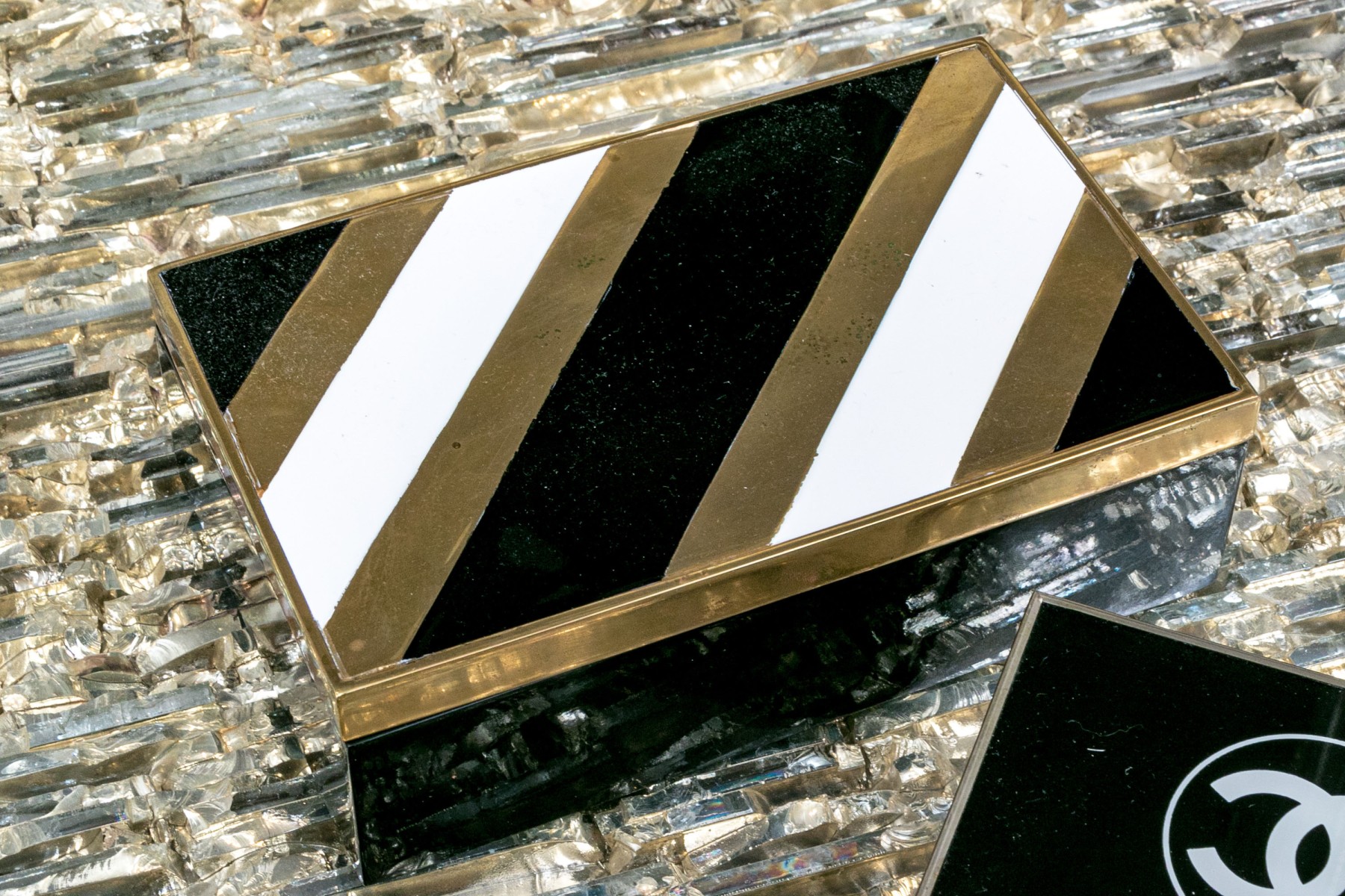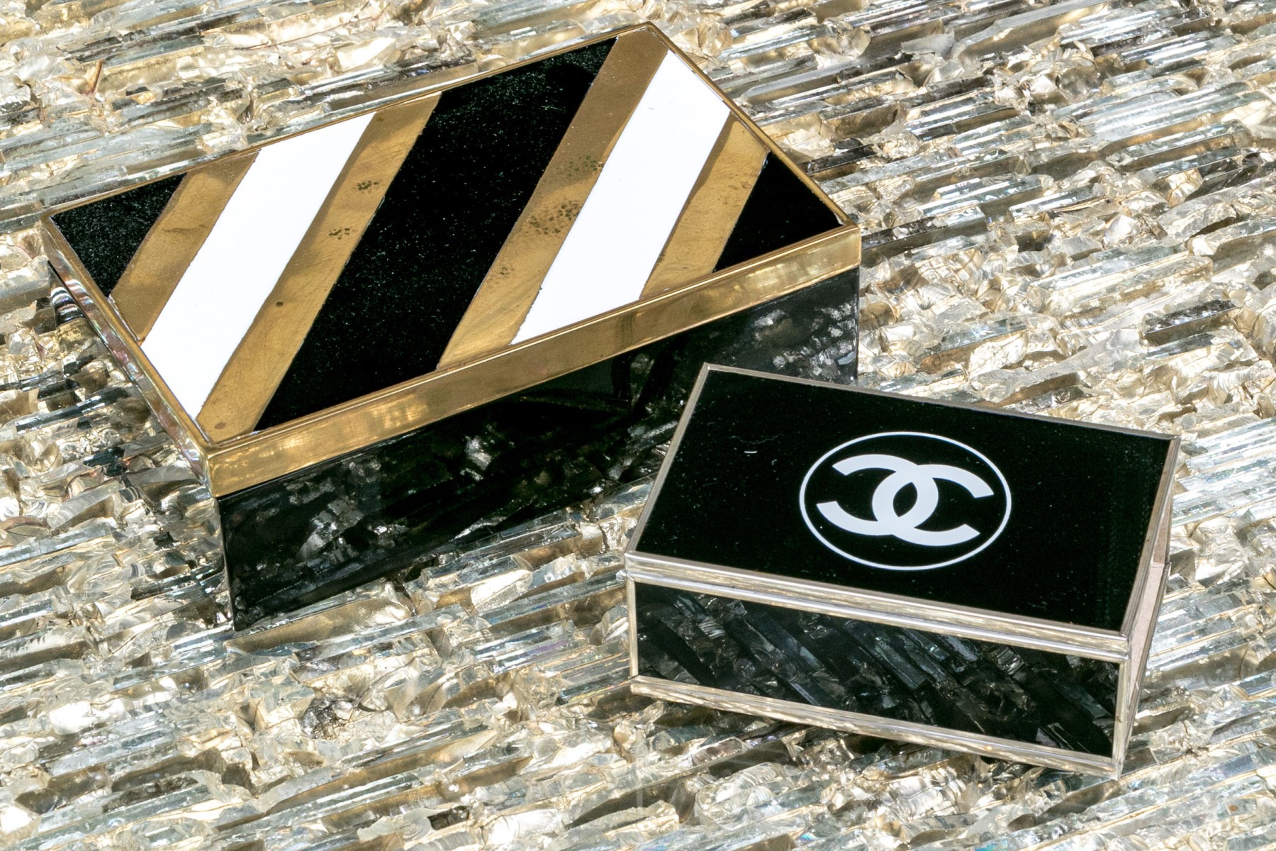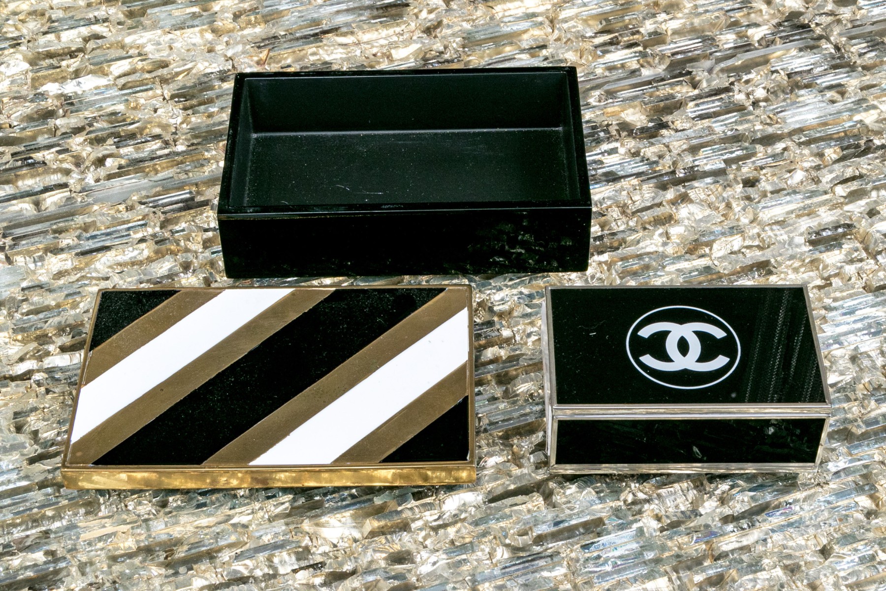 Comprised of a decorative match strike box marked with a Chanel style logo, together with a chic striped enameled box.