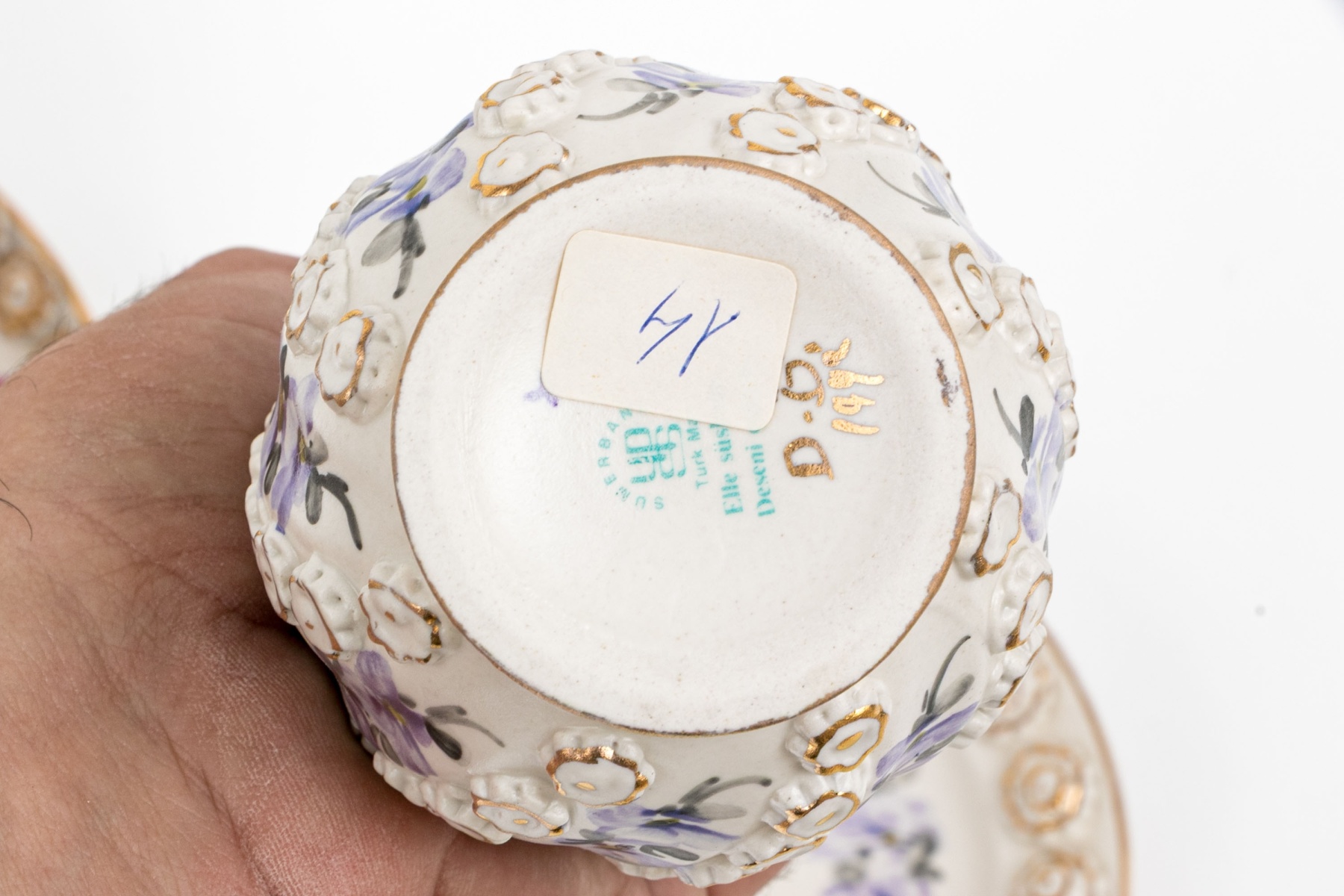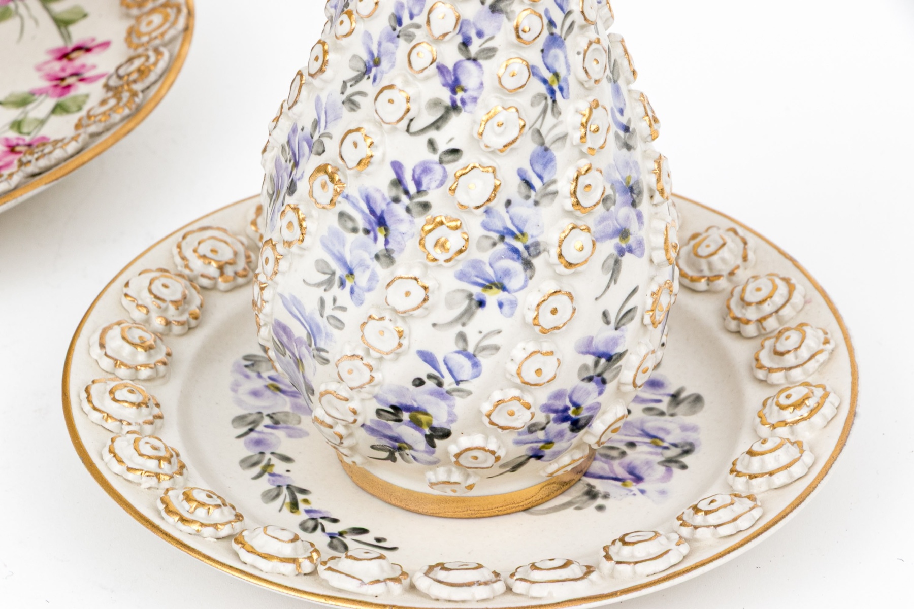 One larger and one smaller. Both highly detailed with swirled bottle form with alternating bands of gilt finished moulded florets and hand-painted flowers. Spade form finials atop the lids and underplots with florets around the trim. Marked underfoot.