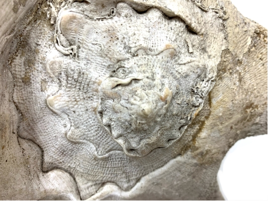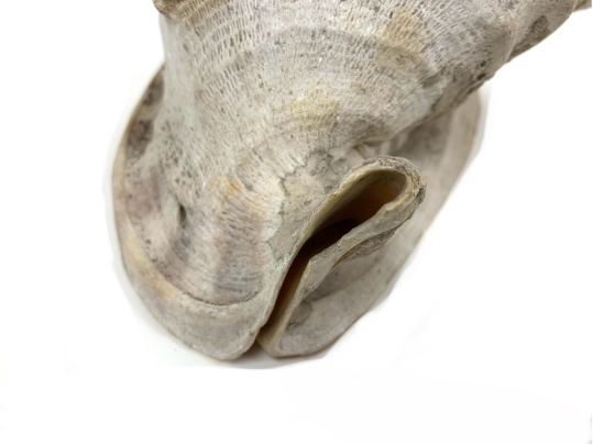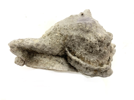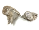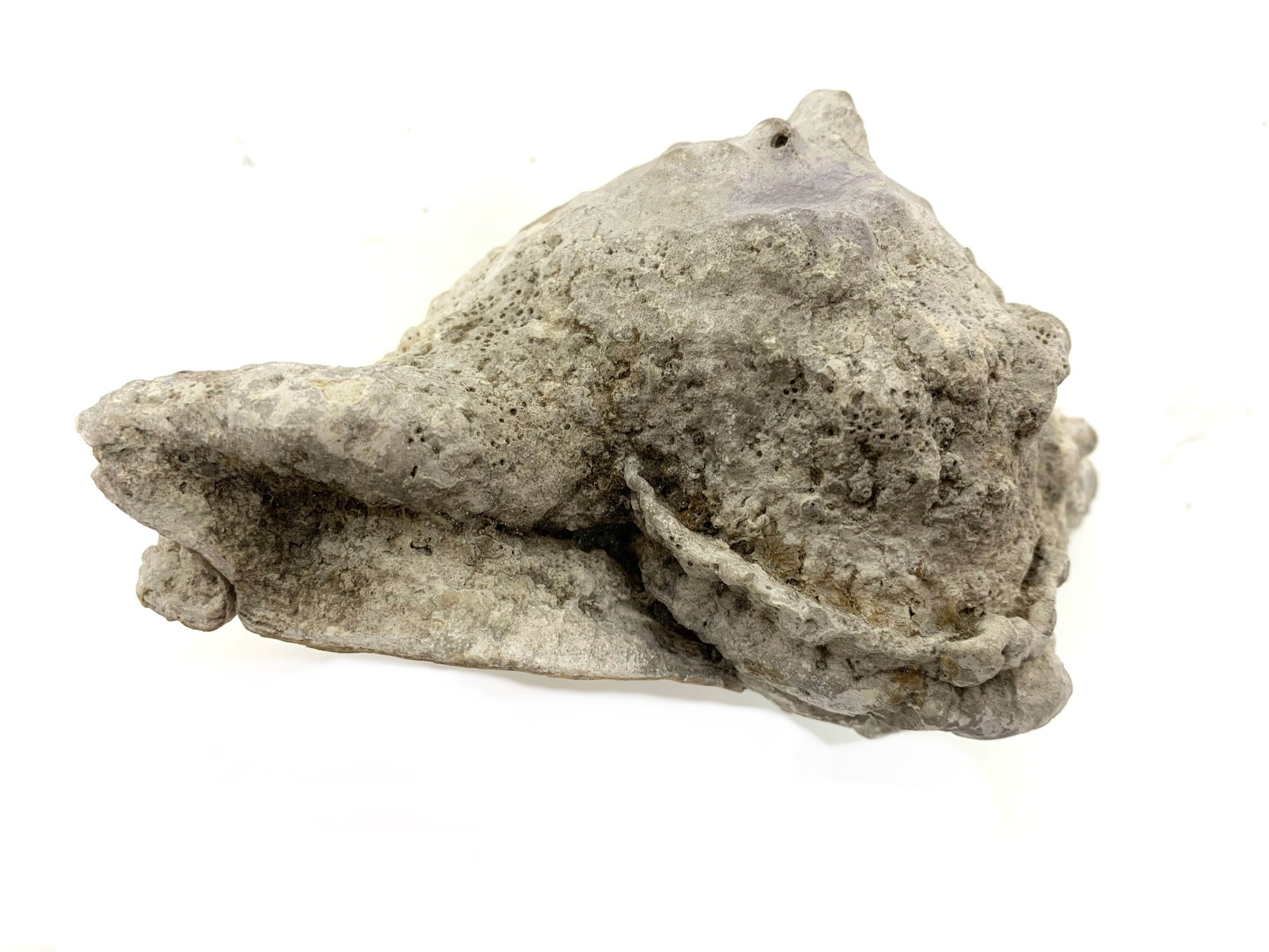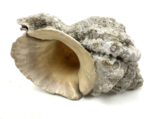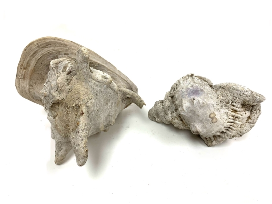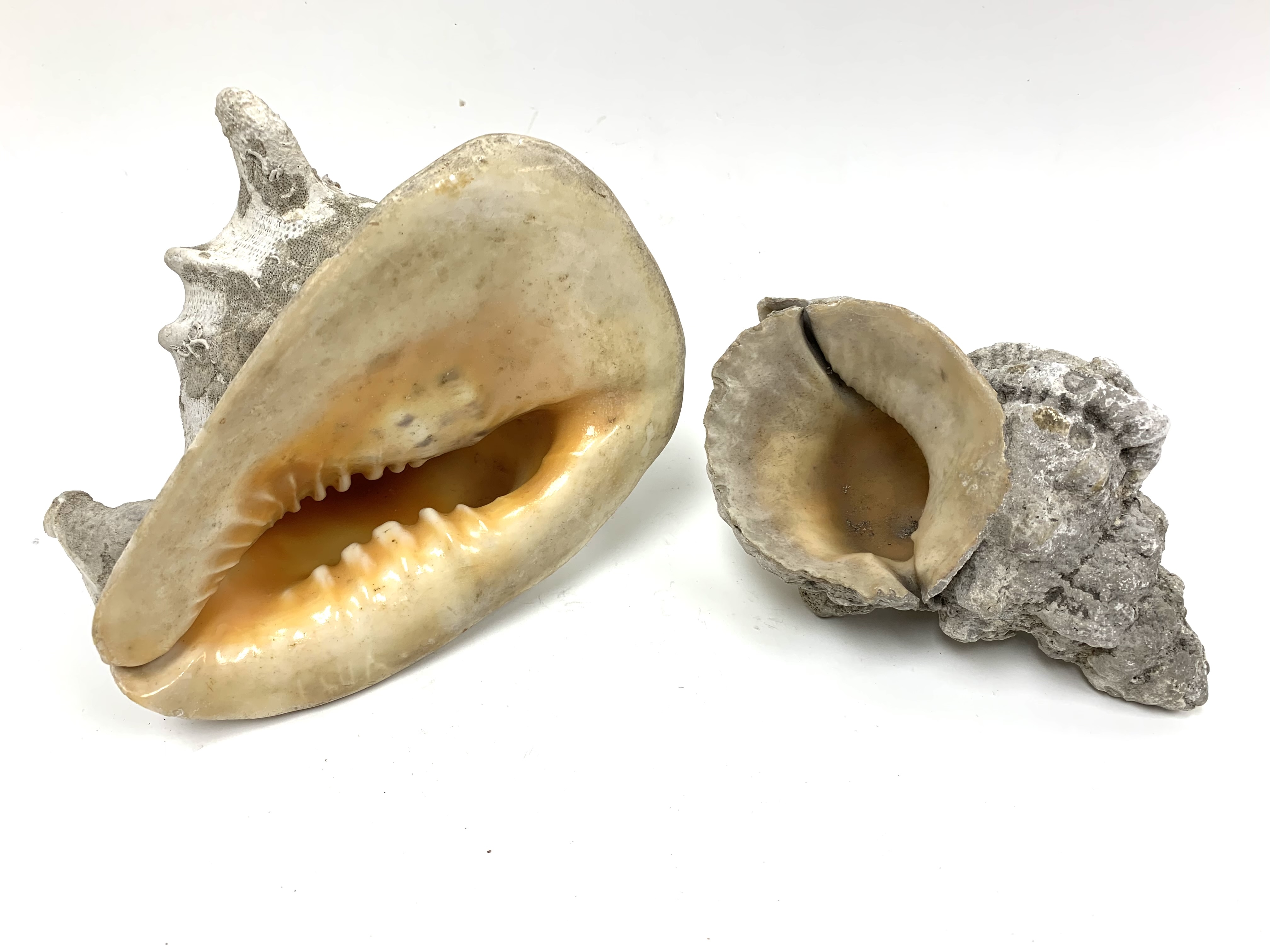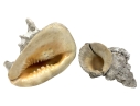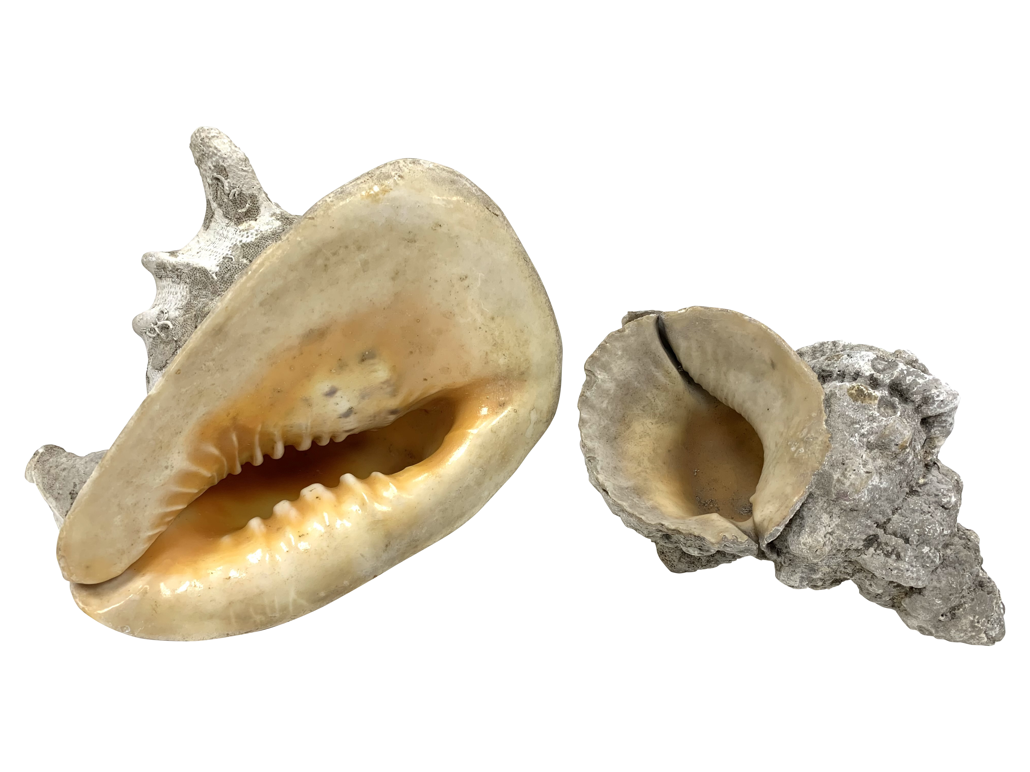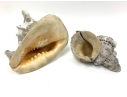 One is a Queen Helmet conch shell with pink interior. The second is a smaller shell with overall incrustations.