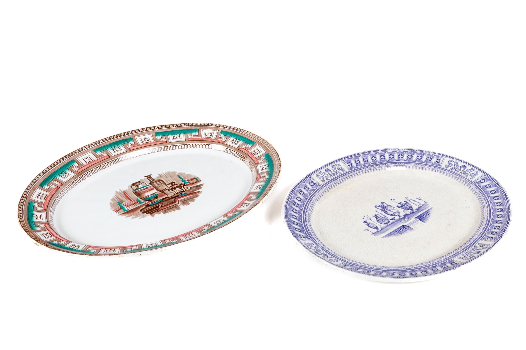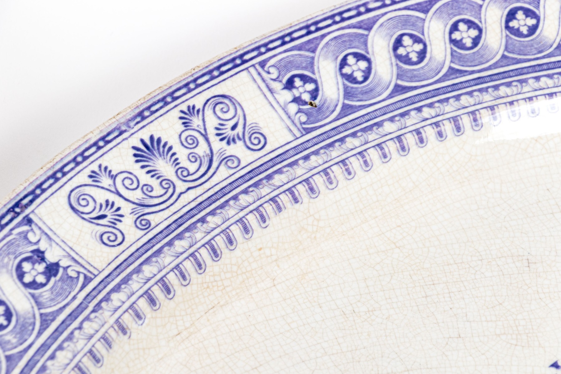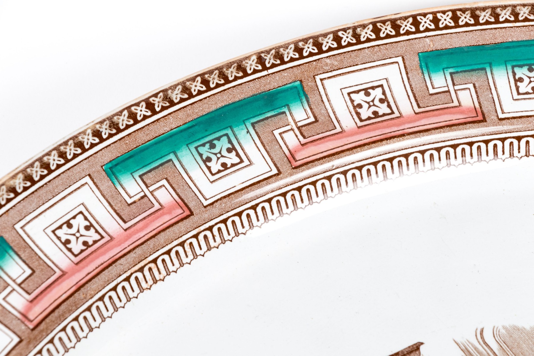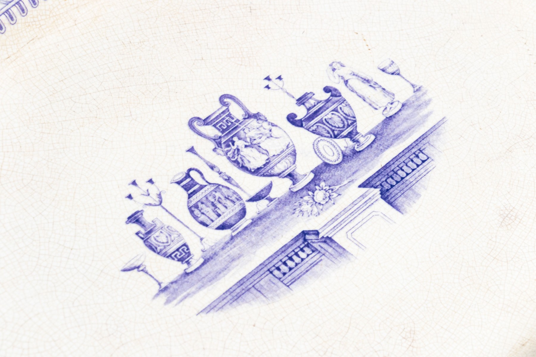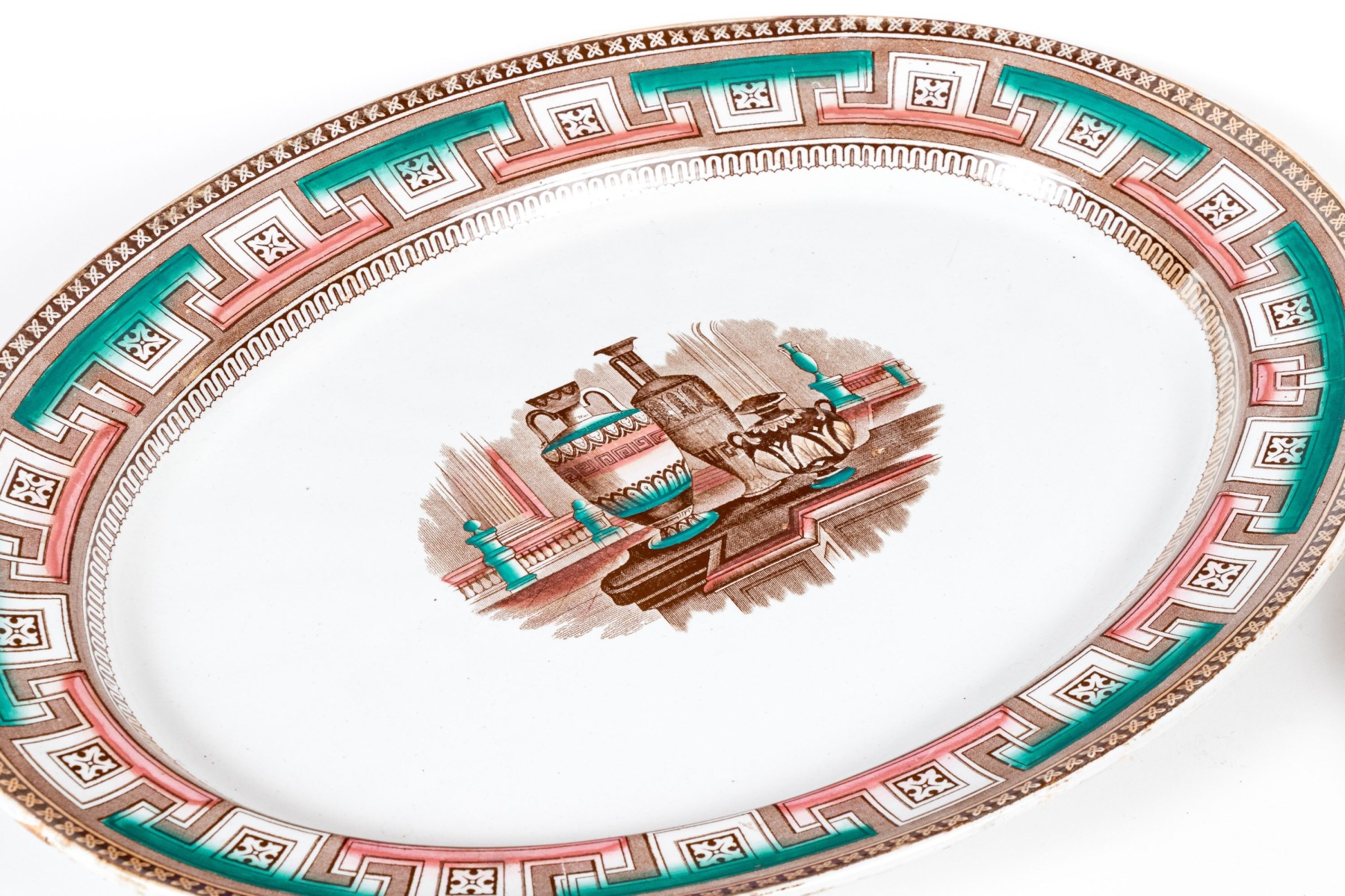 A stylish pair of English oval ceramic serving platters. The larger features a classy Etruscan pattern with vibrant green, pink, and beige hues detailing vases at the center and a stylized fret-like border around the perimeter. The smaller platter by JD&Co. comes in "Vases" pattern, decorated with a compatible scene of vases lined up at the center and surrounded with a gorgeous intertwining pattern around the rim.