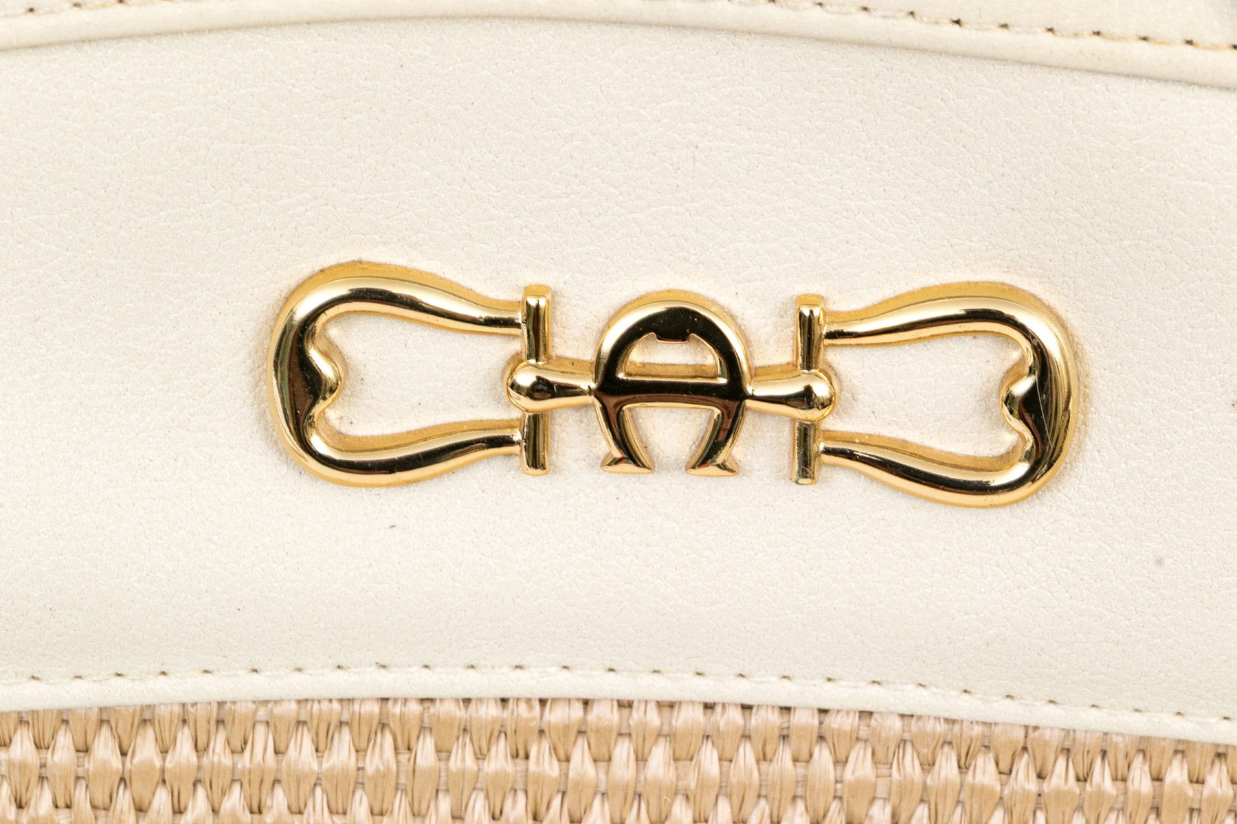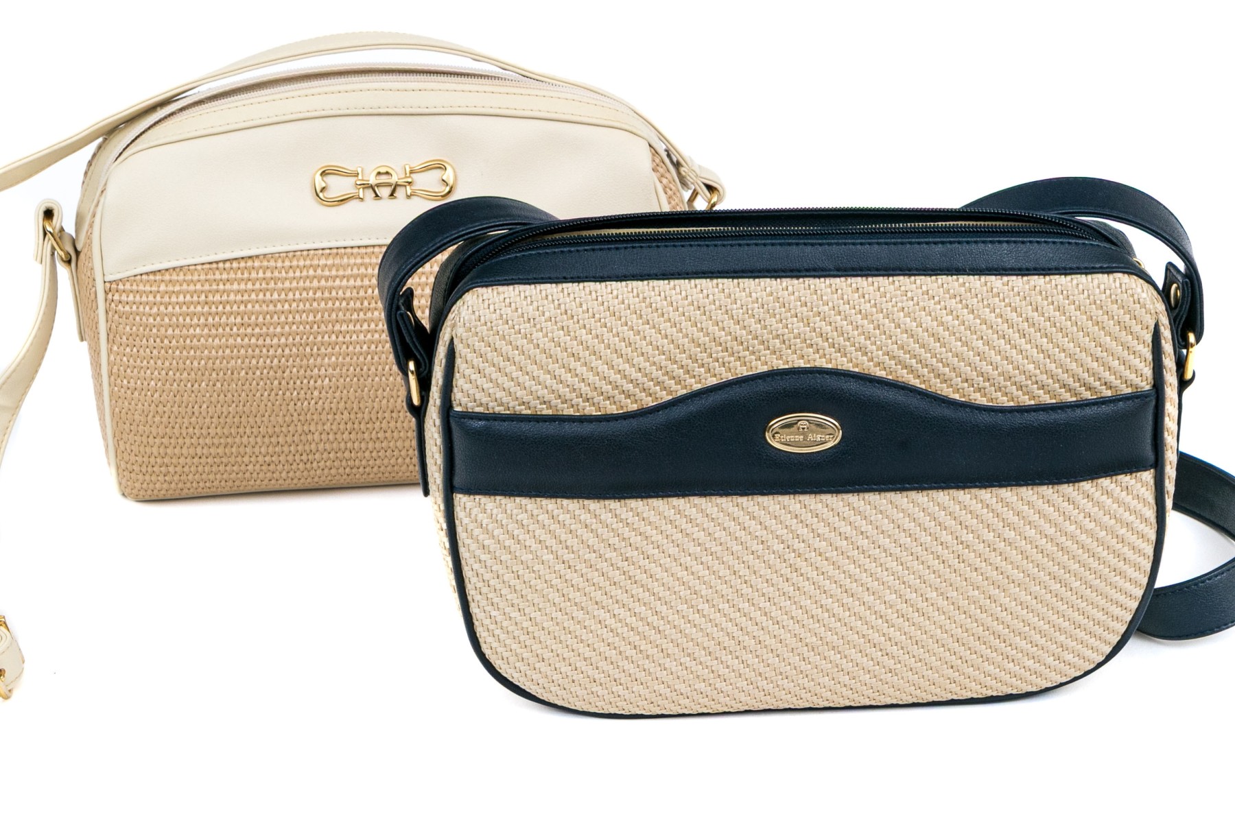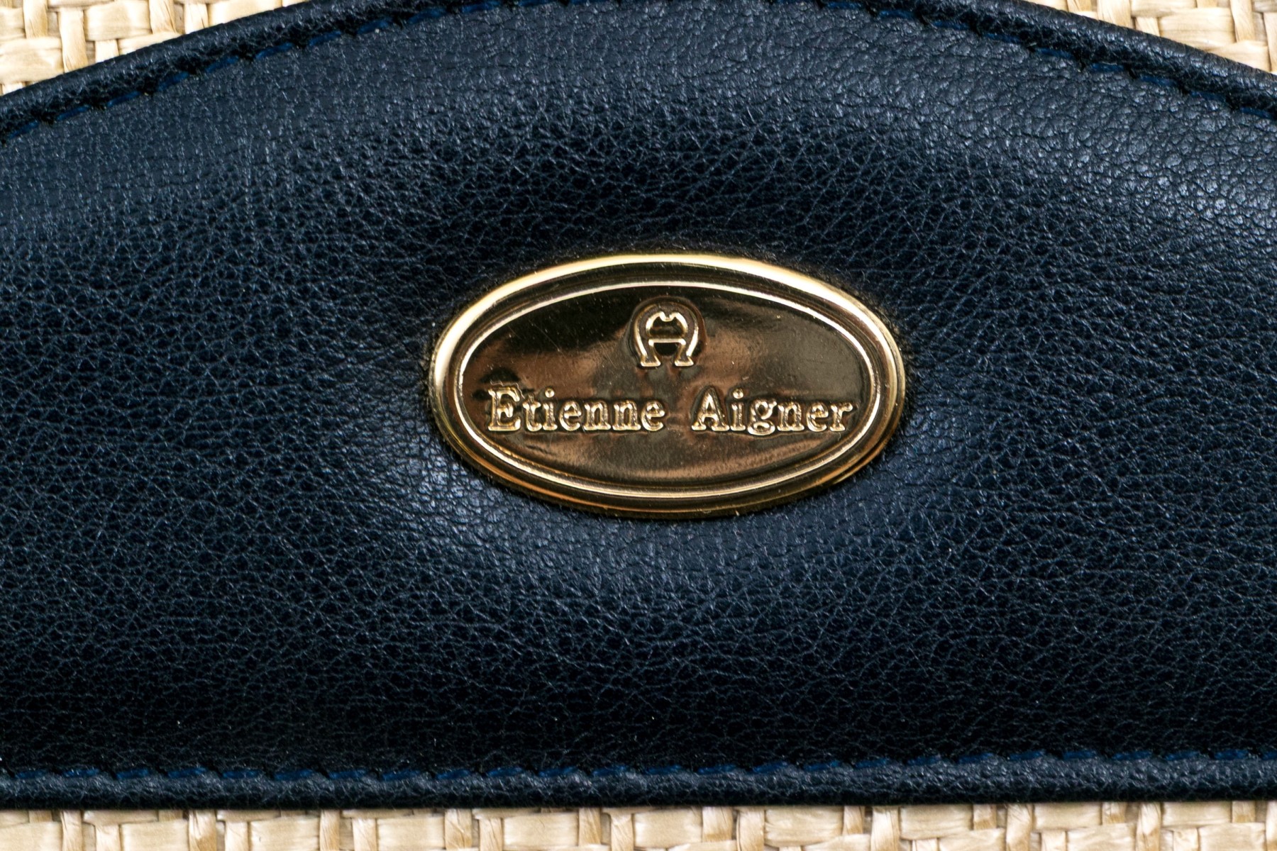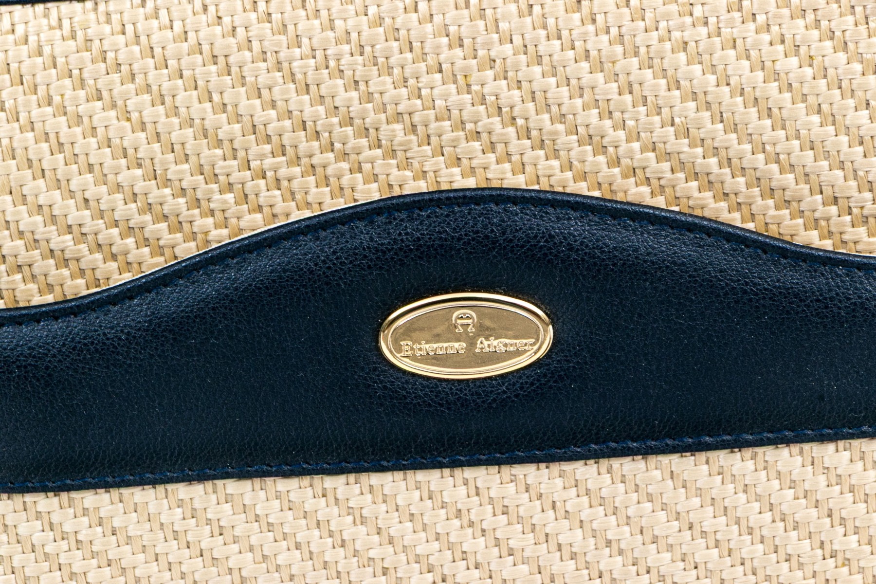A stylish duo of Etienne Aigner pocketbooks in woven and leather designs with brass hardware, including one in white and one in blue.