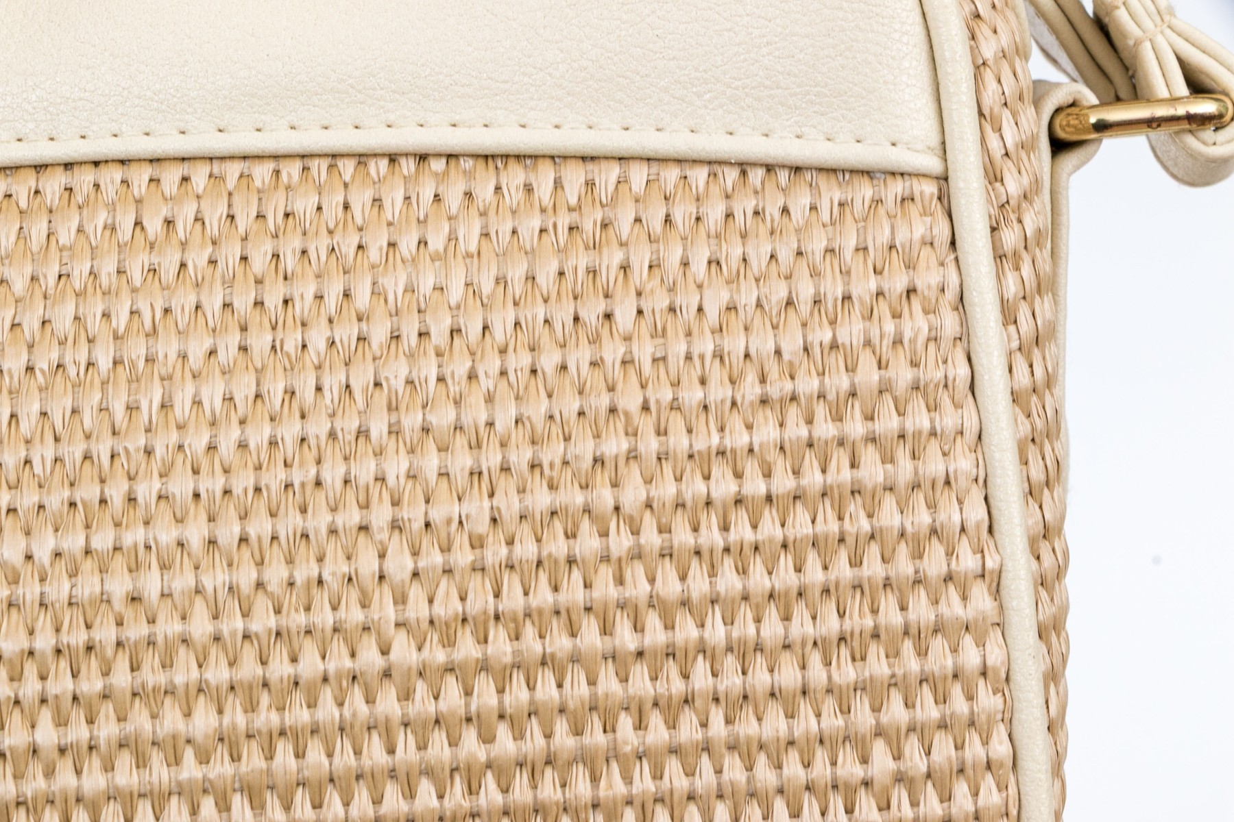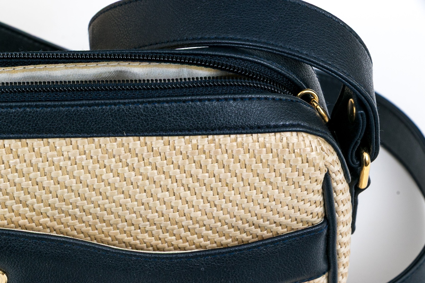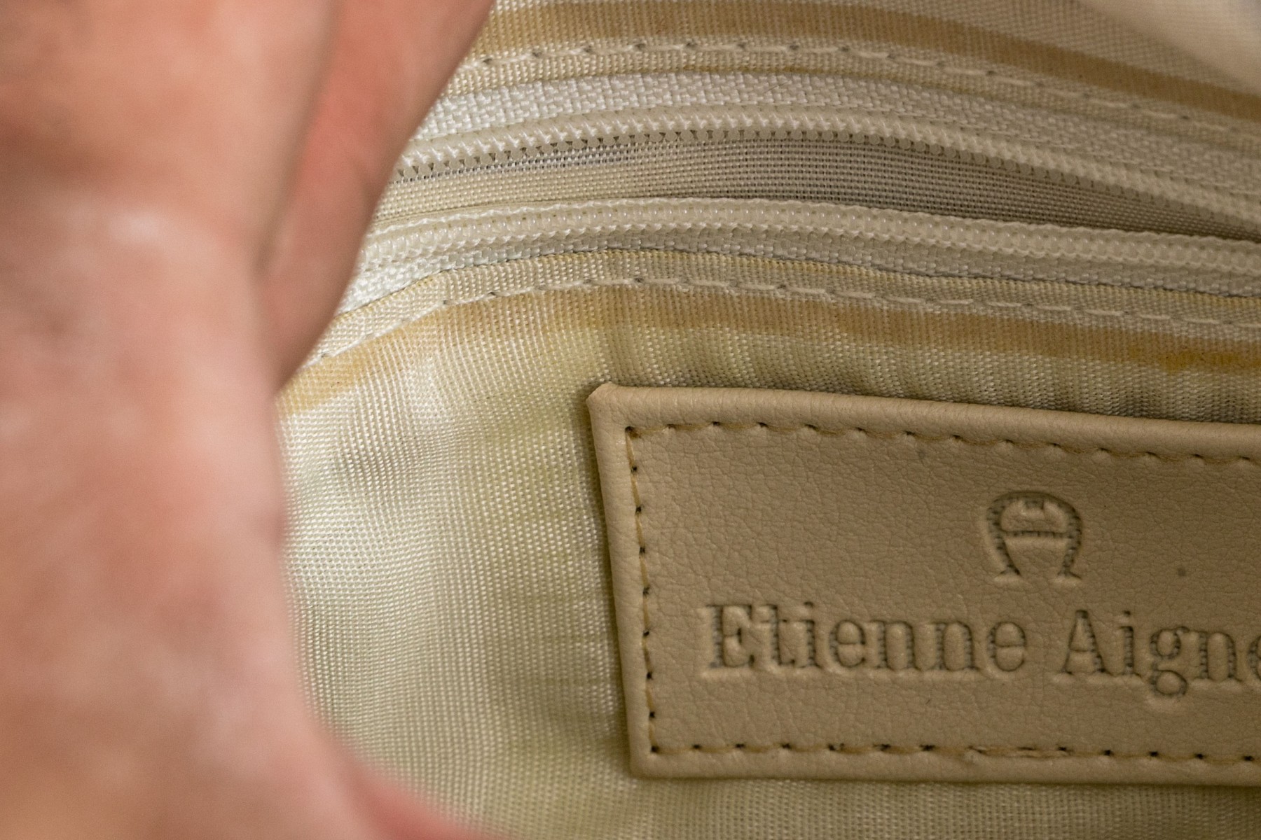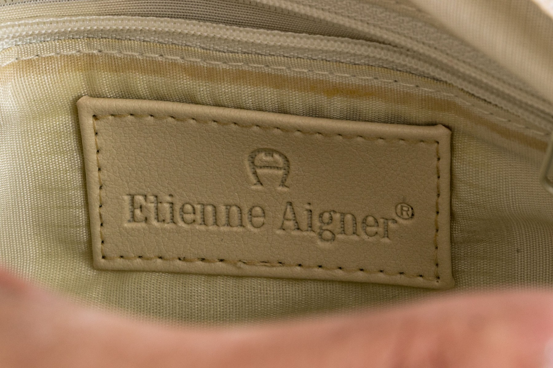 A stylish duo of Etienne Aigner pocketbooks in woven and leather designs with brass hardware, including one in white and one in blue.