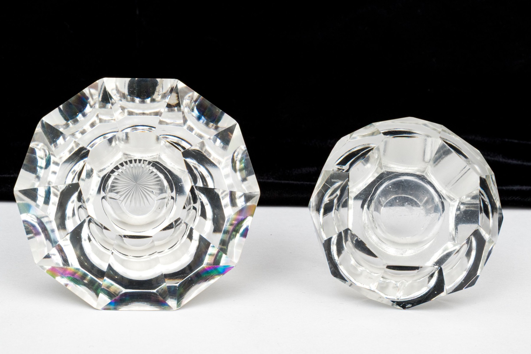 Graduated sizes in prism like faceted forms, One marked with an attractive etched sunburst on the base.
