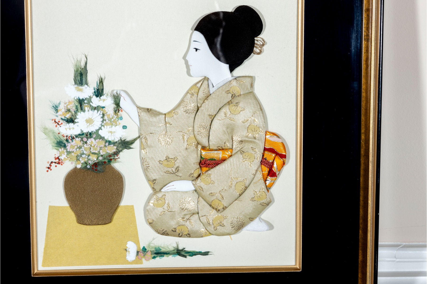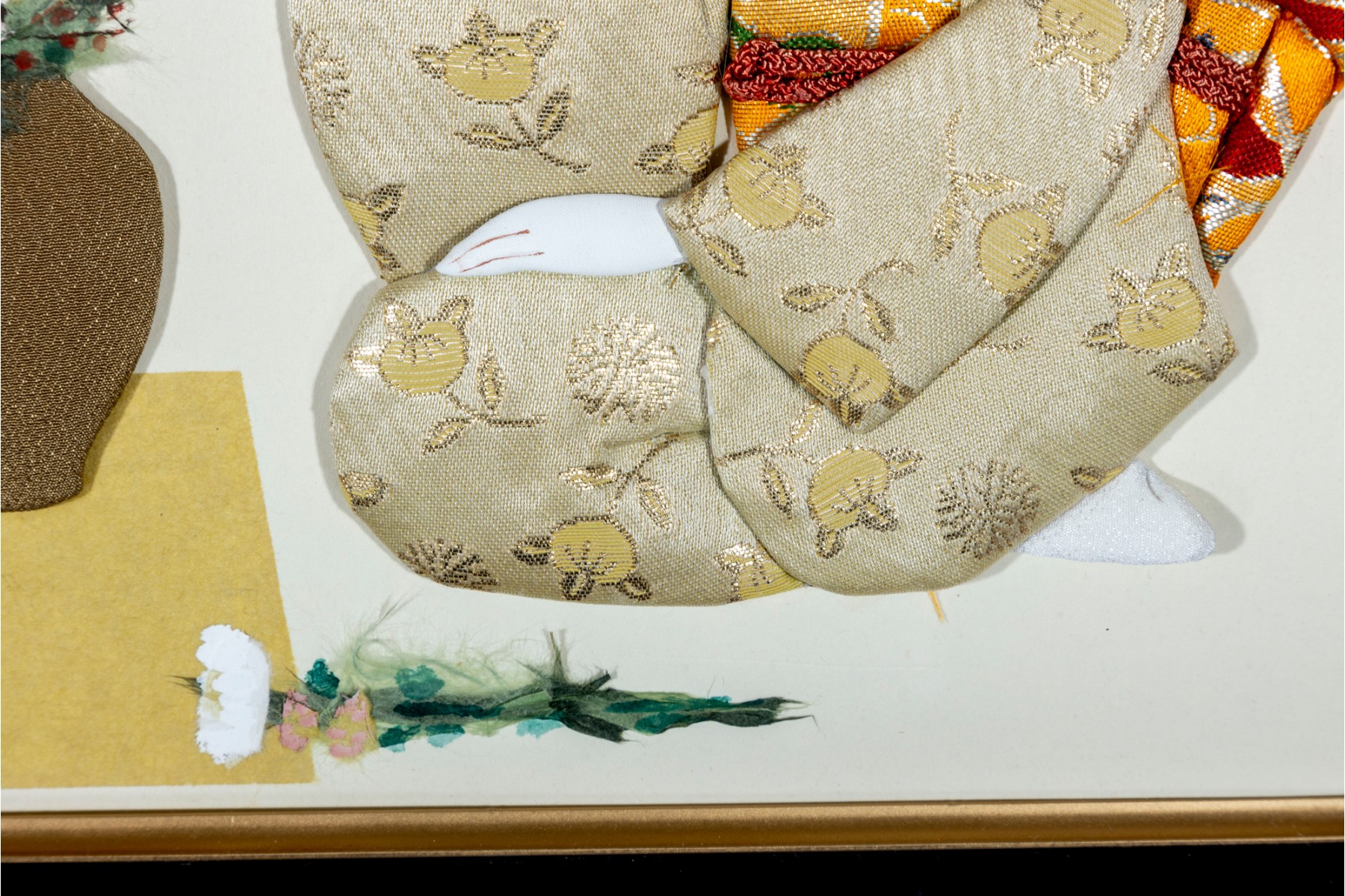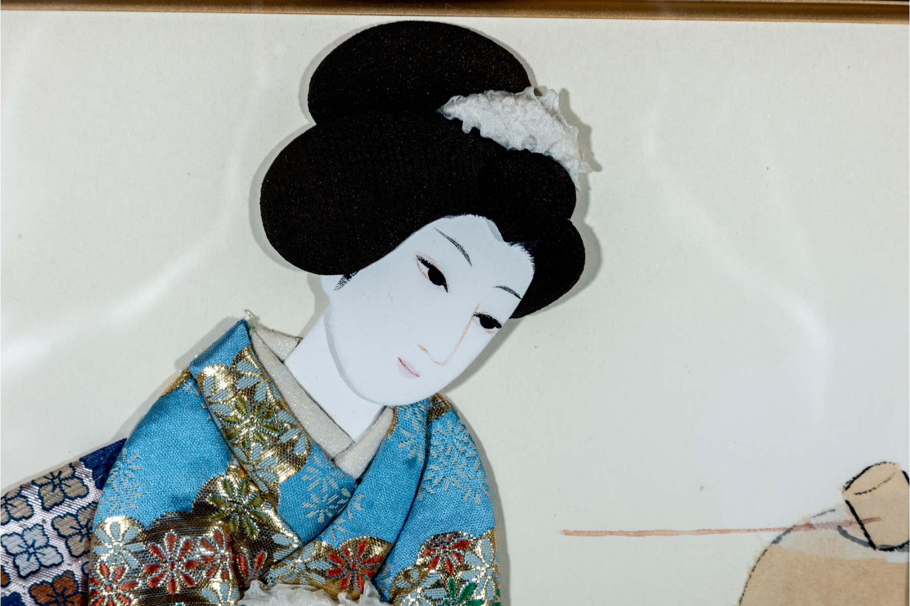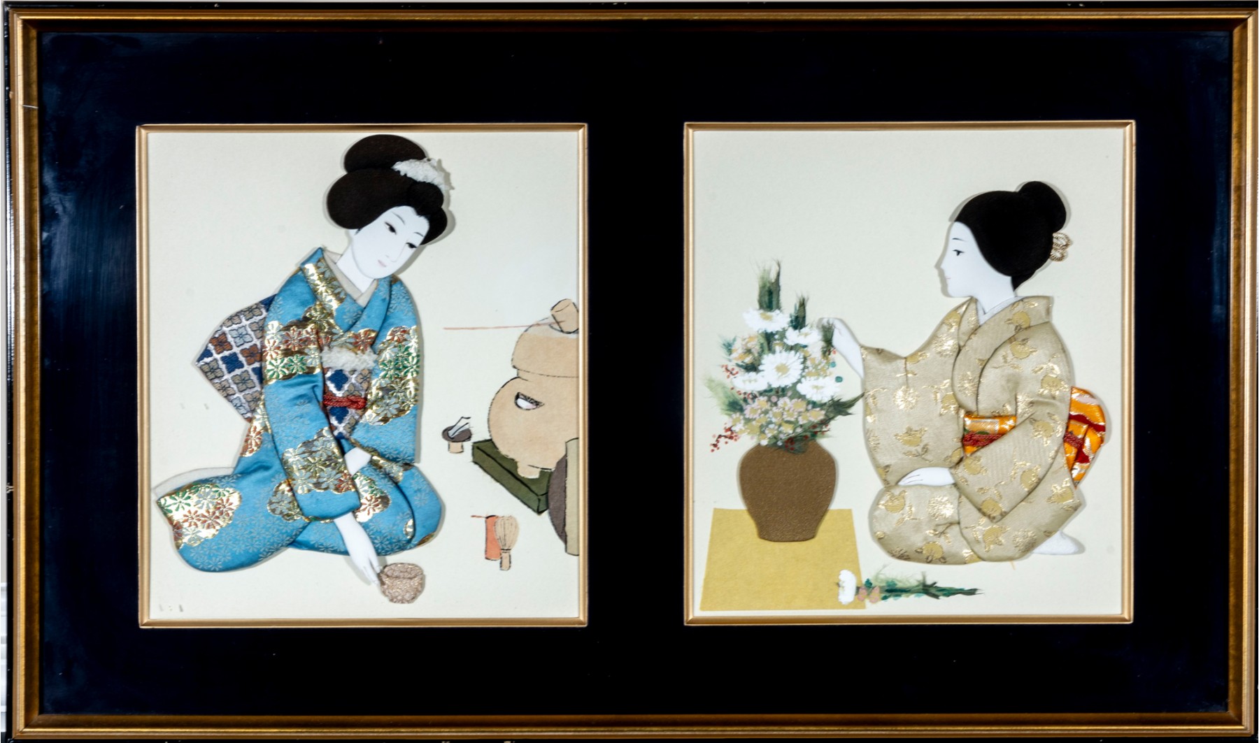 A pair of traditional Japanese Oshie's (Oshi-e); a form of Japanese handicraft originating from the Edo period. Built in layers, each piece is wrapped in beautiful kimono fabric or paper, padded with cotton in between, and is nailed/glued together to create a three-dimensional work of art. The background is hand-drawn in mixed media paper -- unsigned and presented in a wood shadow-box frame with a glass facing.