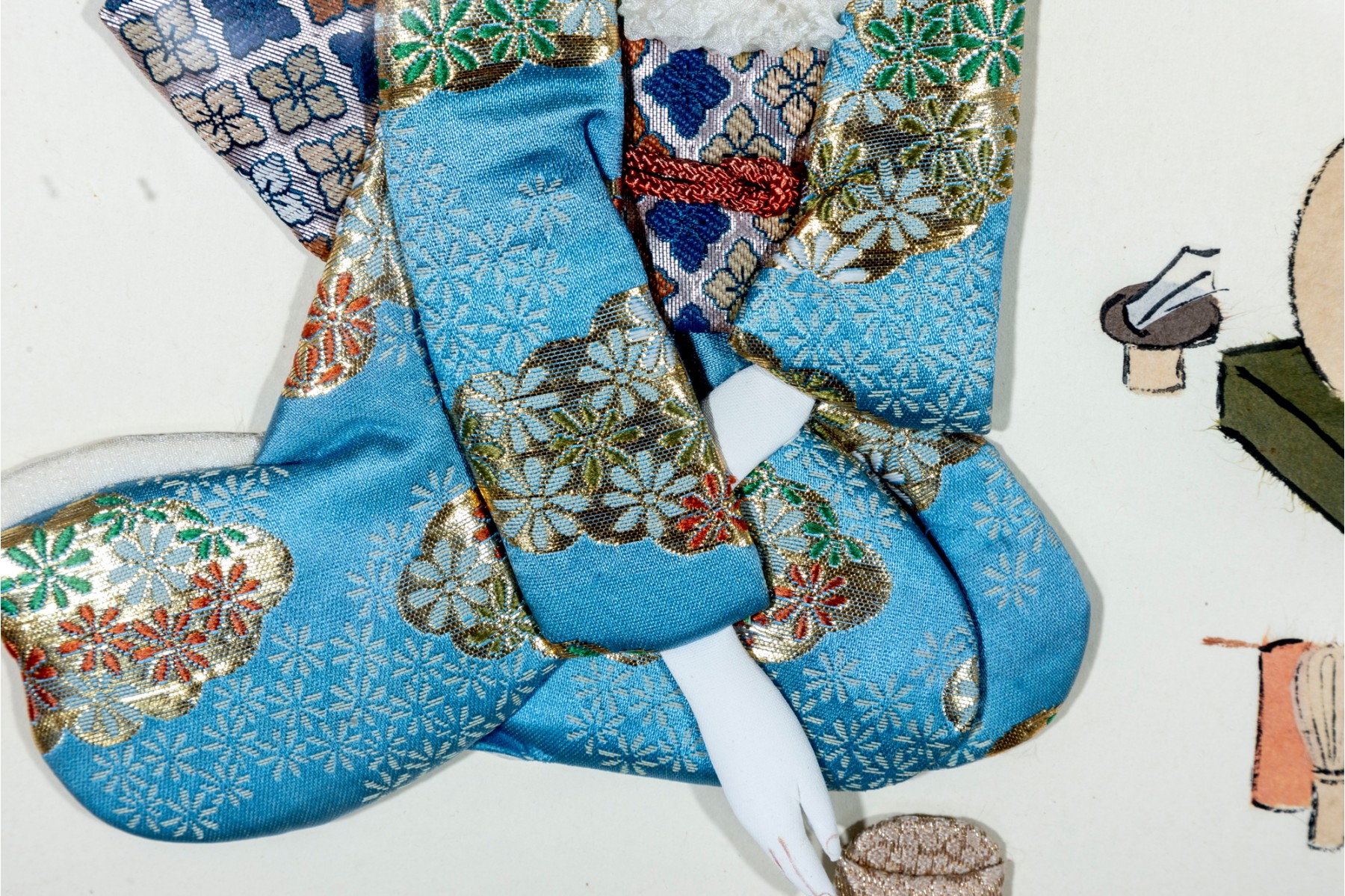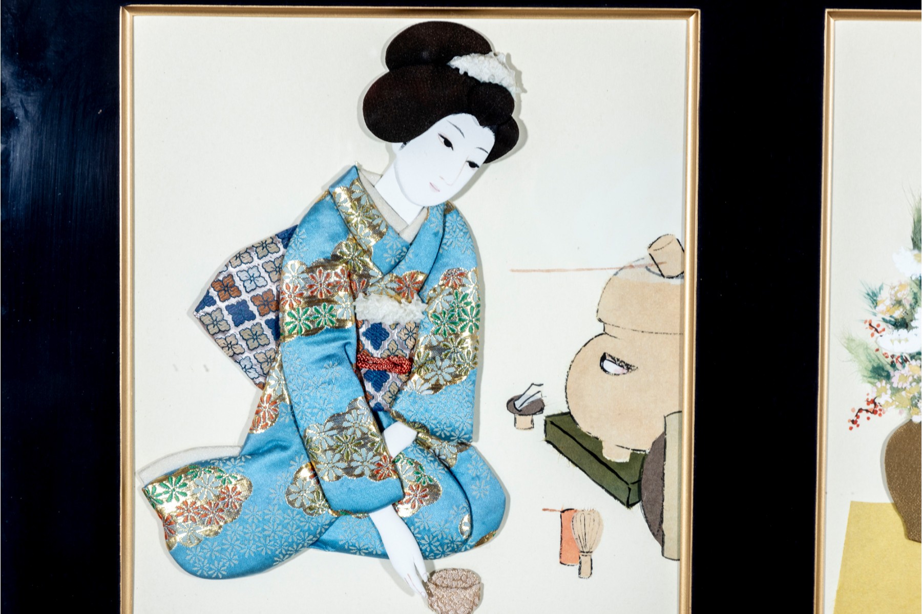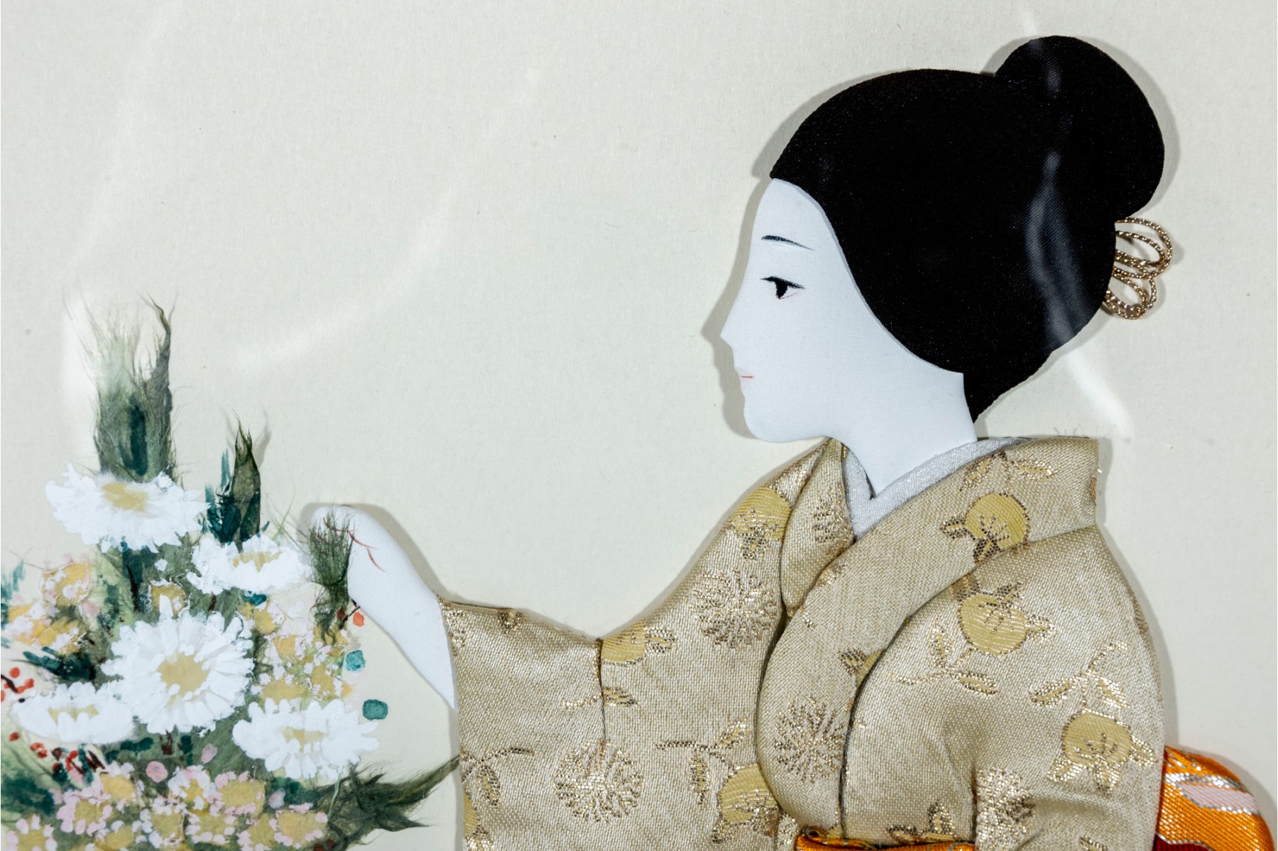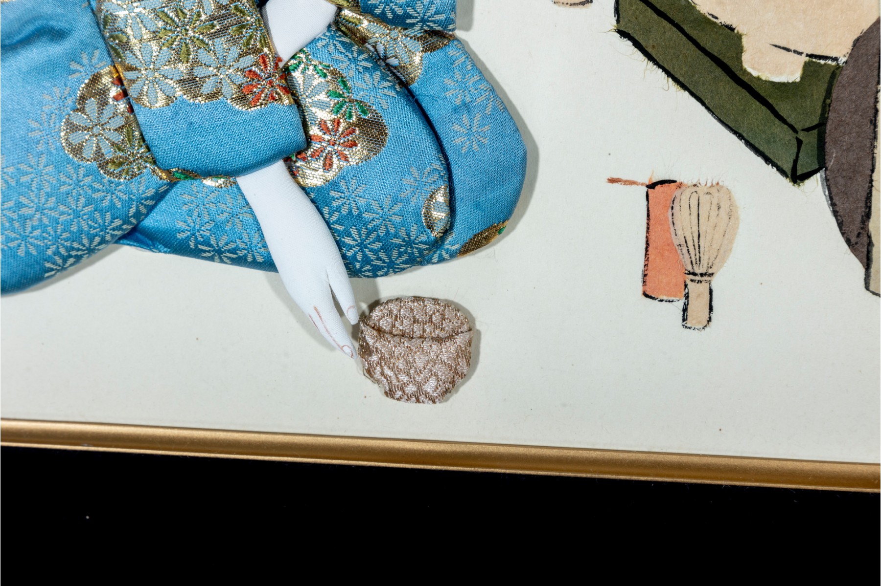 A pair of traditional Japanese Oshie's (Oshi-e); a form of Japanese handicraft originating from the Edo period. Built in layers, each piece is wrapped in beautiful kimono fabric or paper, padded with cotton in between, and is nailed/glued together to create a three-dimensional work of art. The background is hand-drawn in mixed media paper -- unsigned and presented in a wood shadow-box frame with a glass facing.
