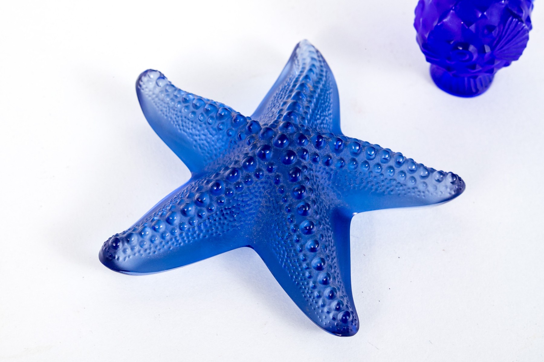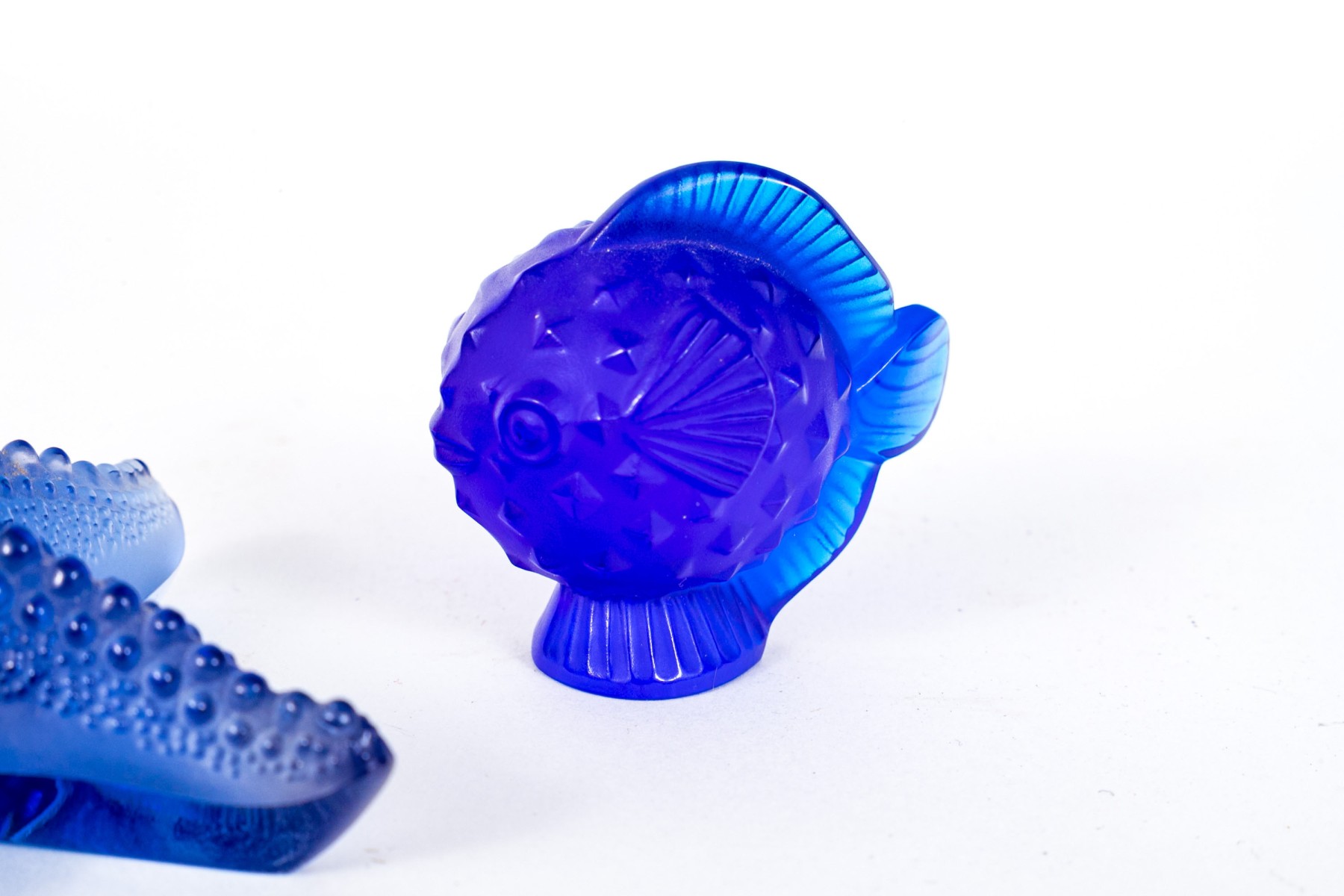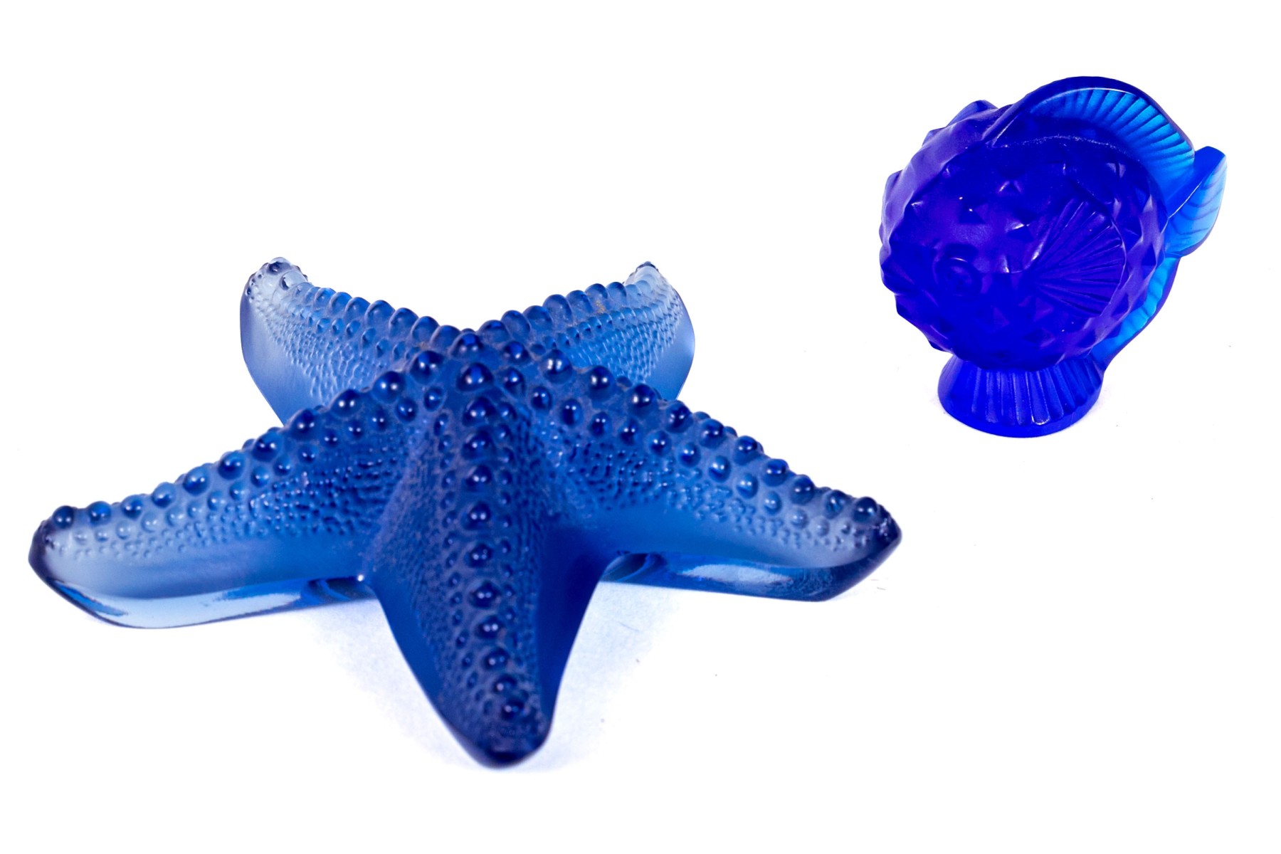 Collection of two gorgeous French, Lalique cobalt glass table top items are perfect for any ocean lover.