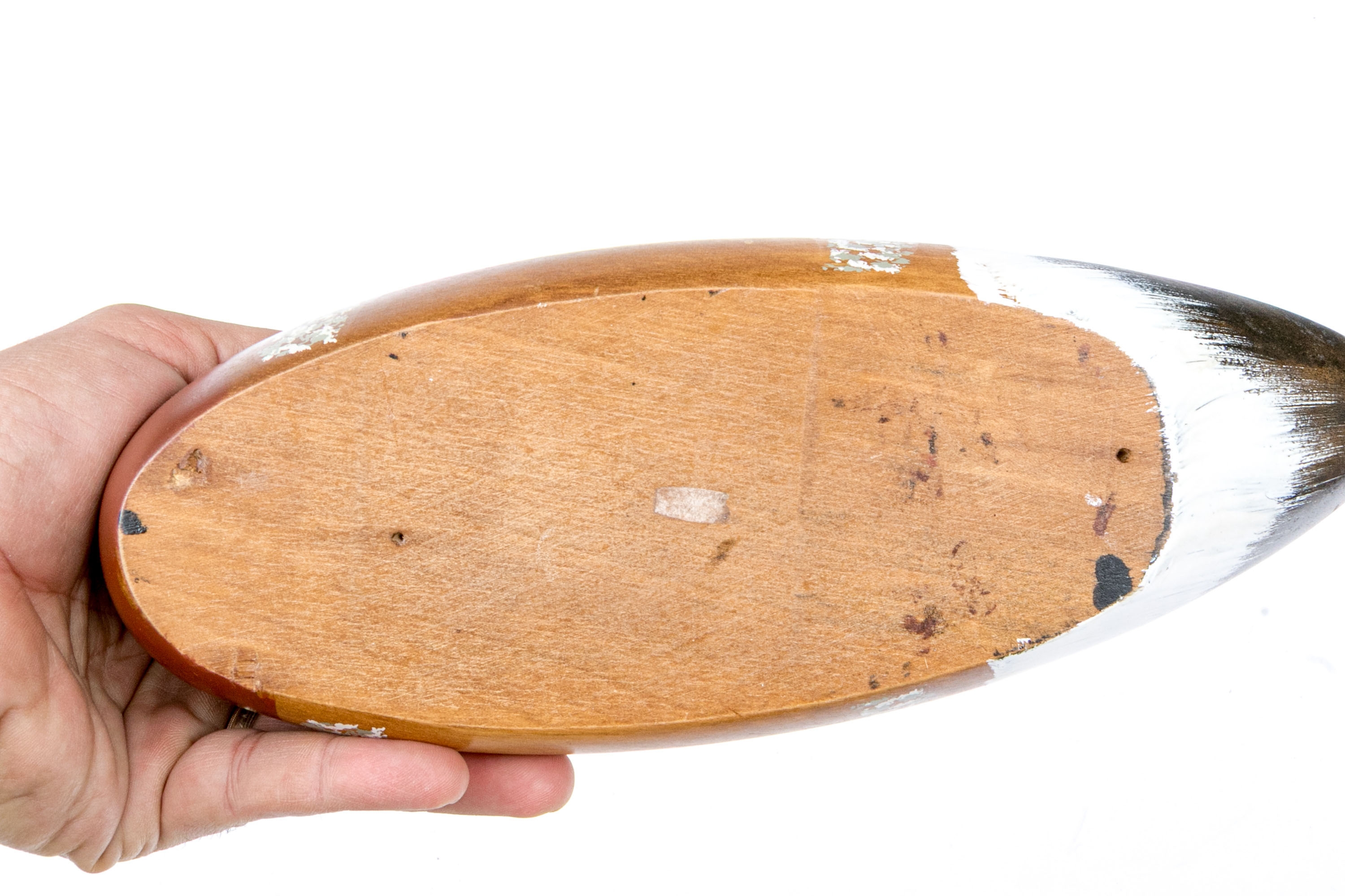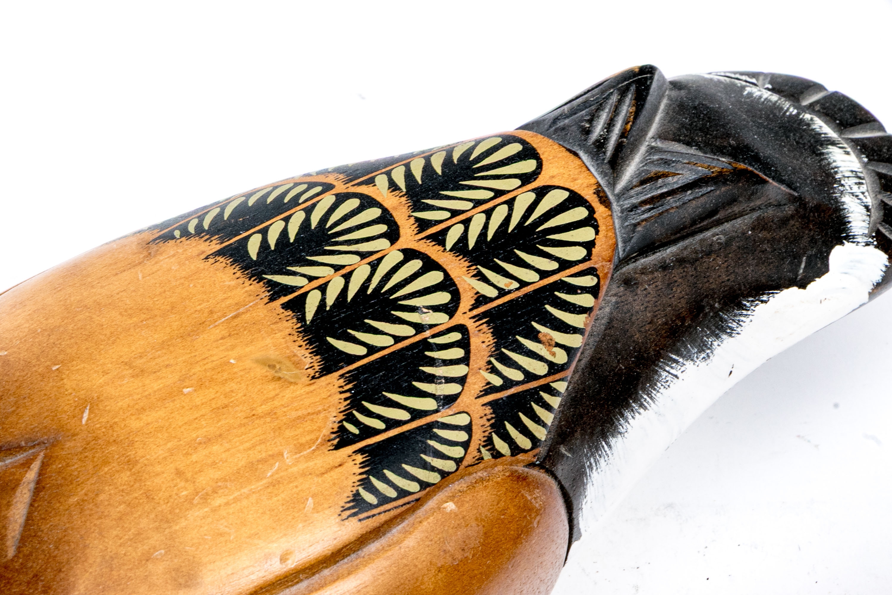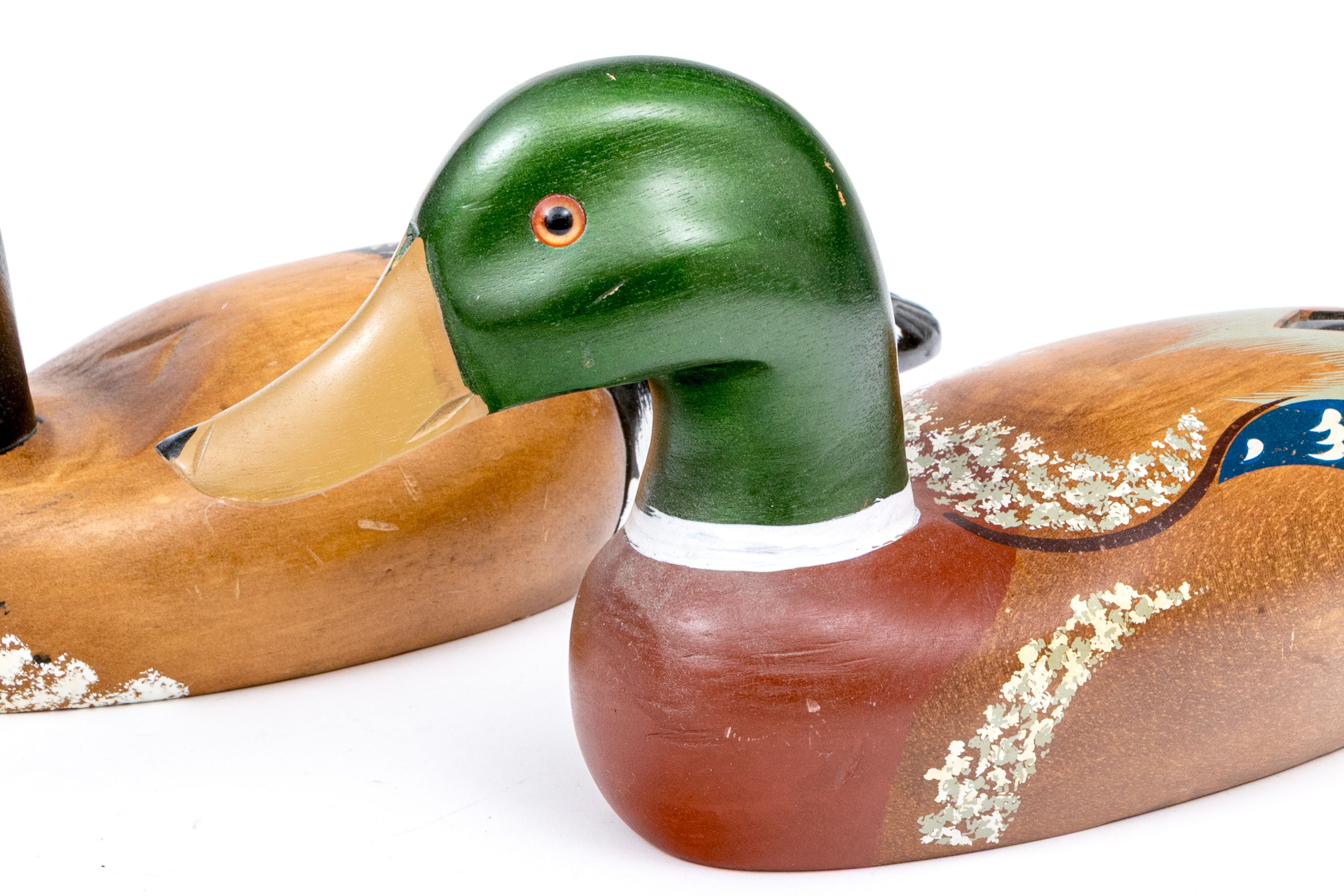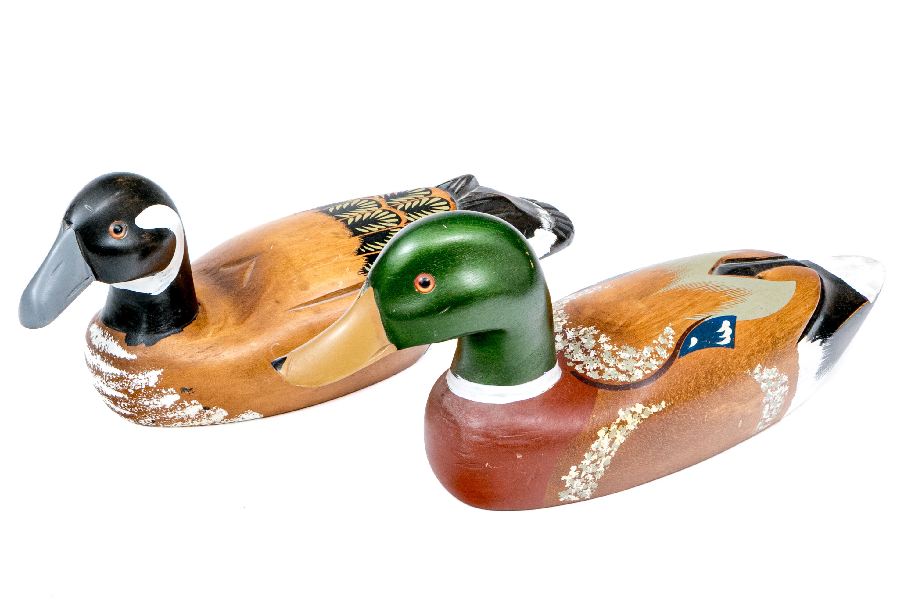A fabulous duo of artisanal hand-painted and carved wood duck decoys with inlaid eyes. Beautiful, vibrant colors and eye-catching patterns.