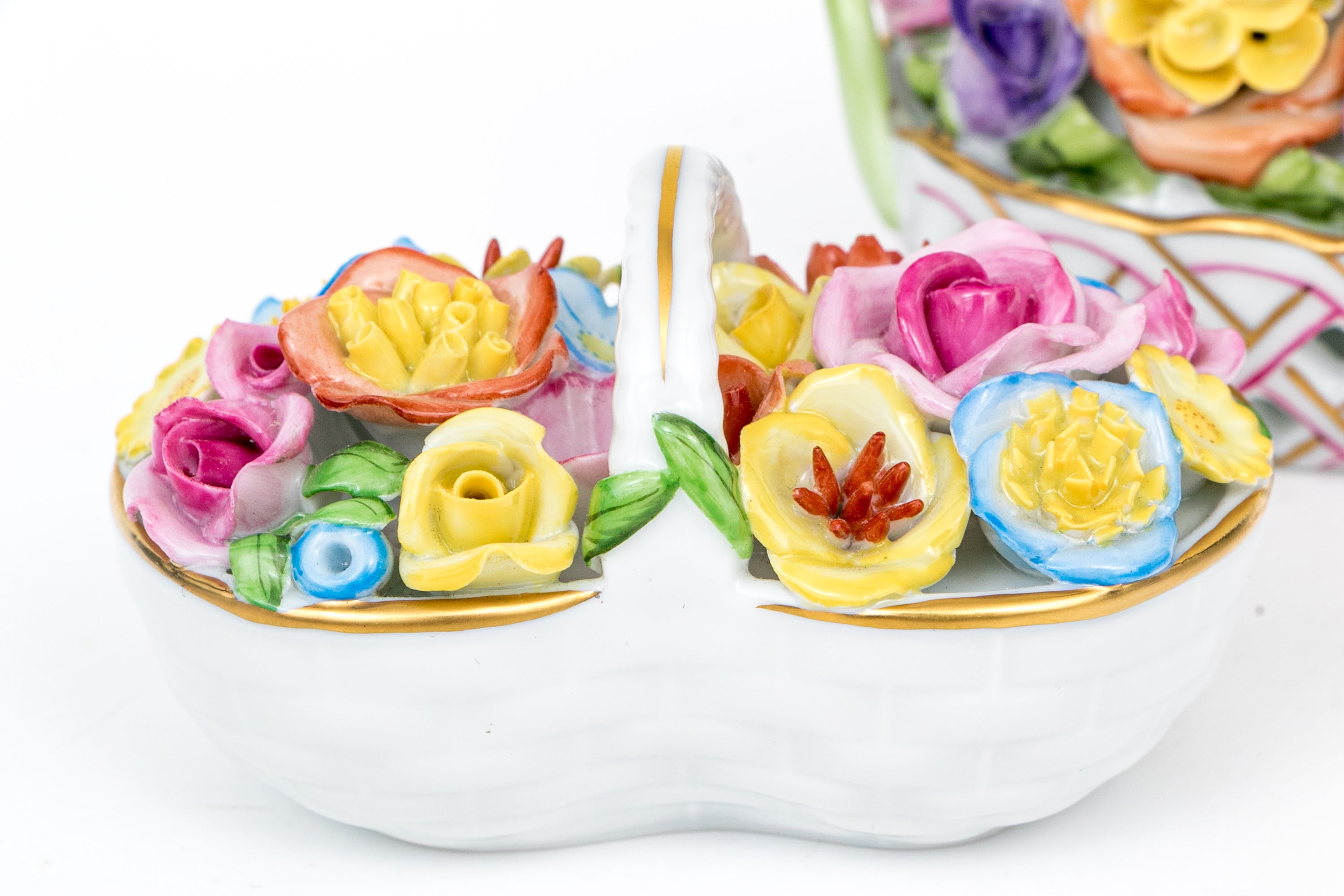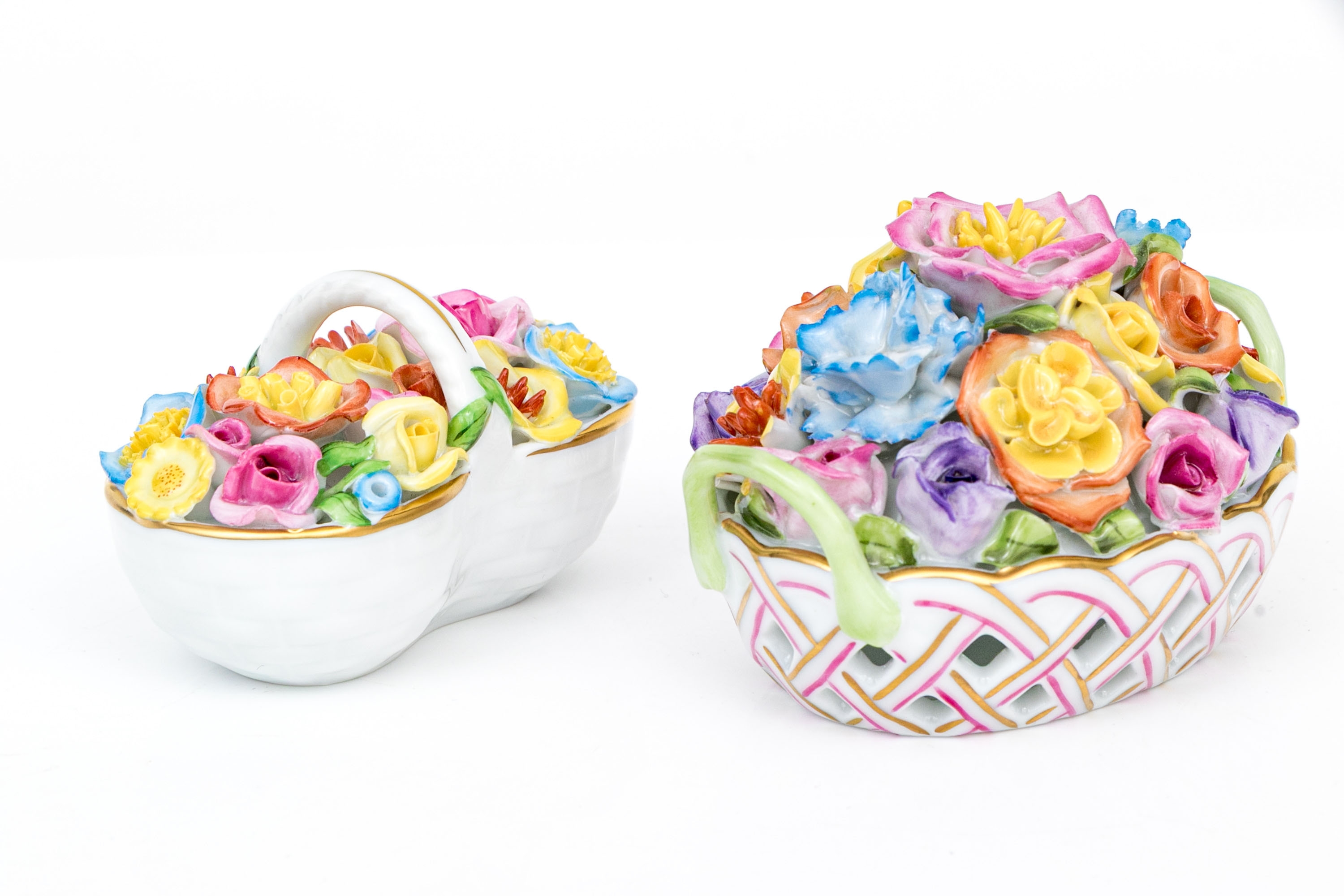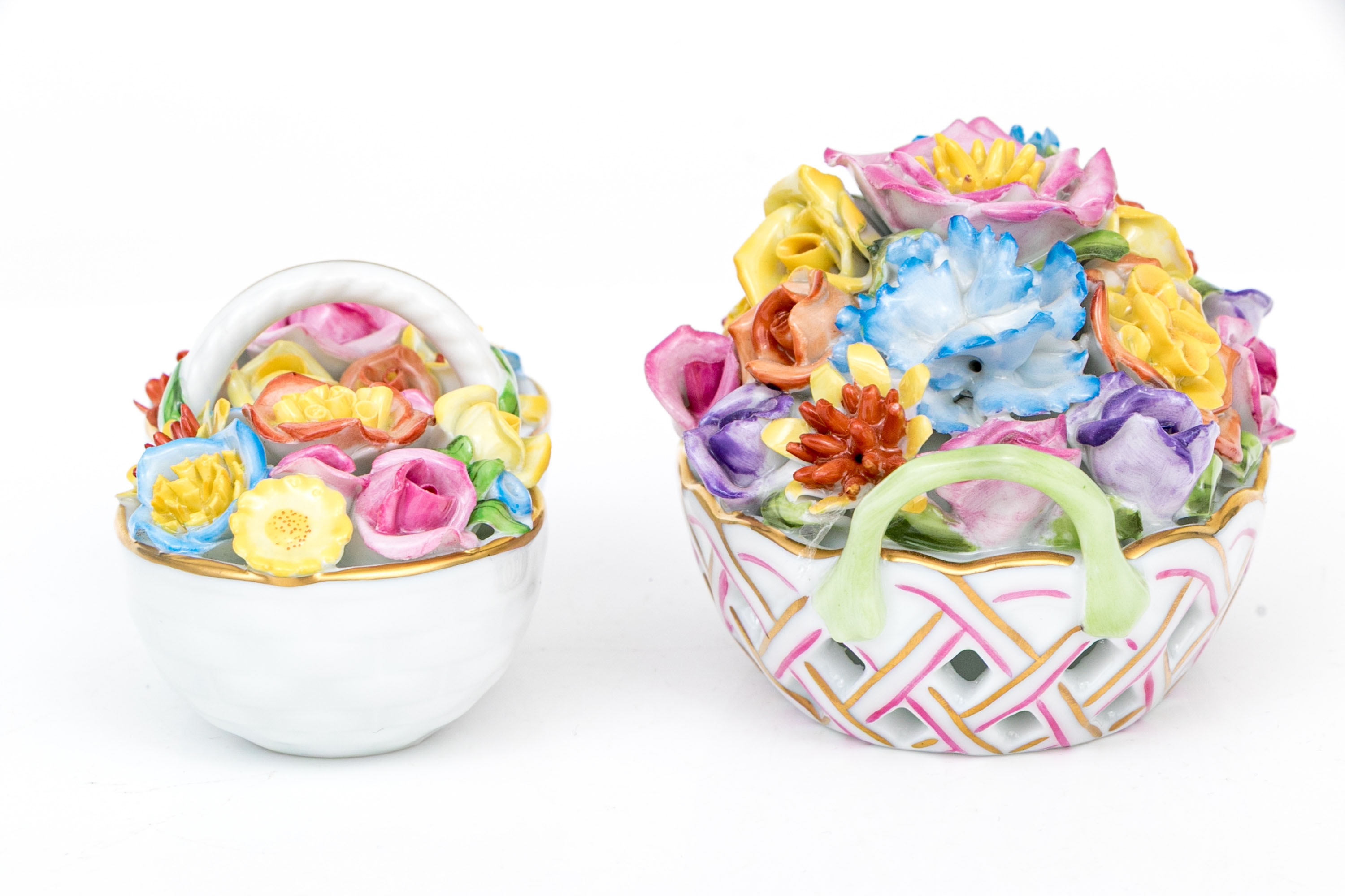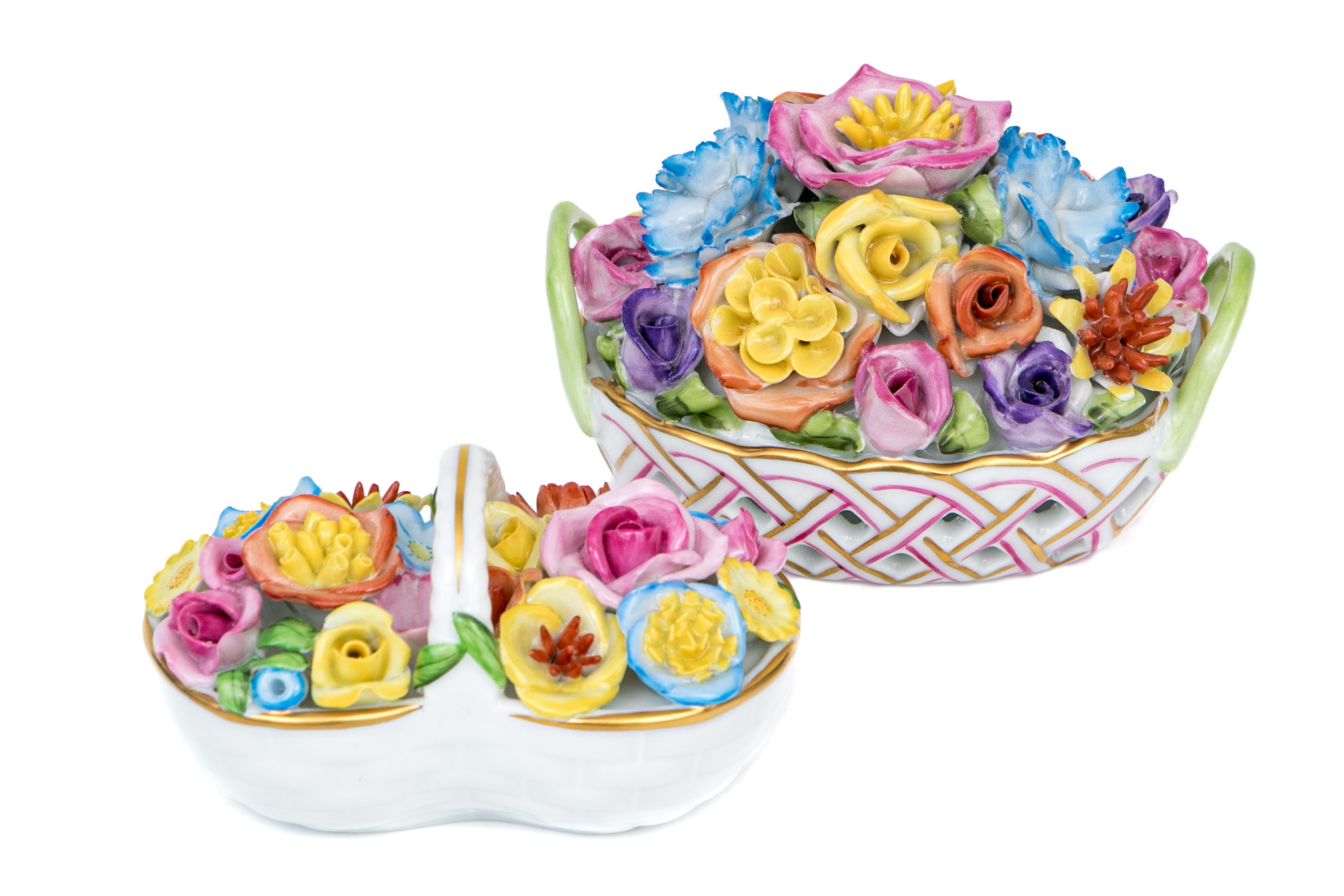 Two Herend Hungary hand-painted porcelain floral baskets. These miniature baskets are lavishly adorned with individually hand-modeled and painted porcelain flowers, each petal and leaf sculpted to capture the realism of natural blooms.