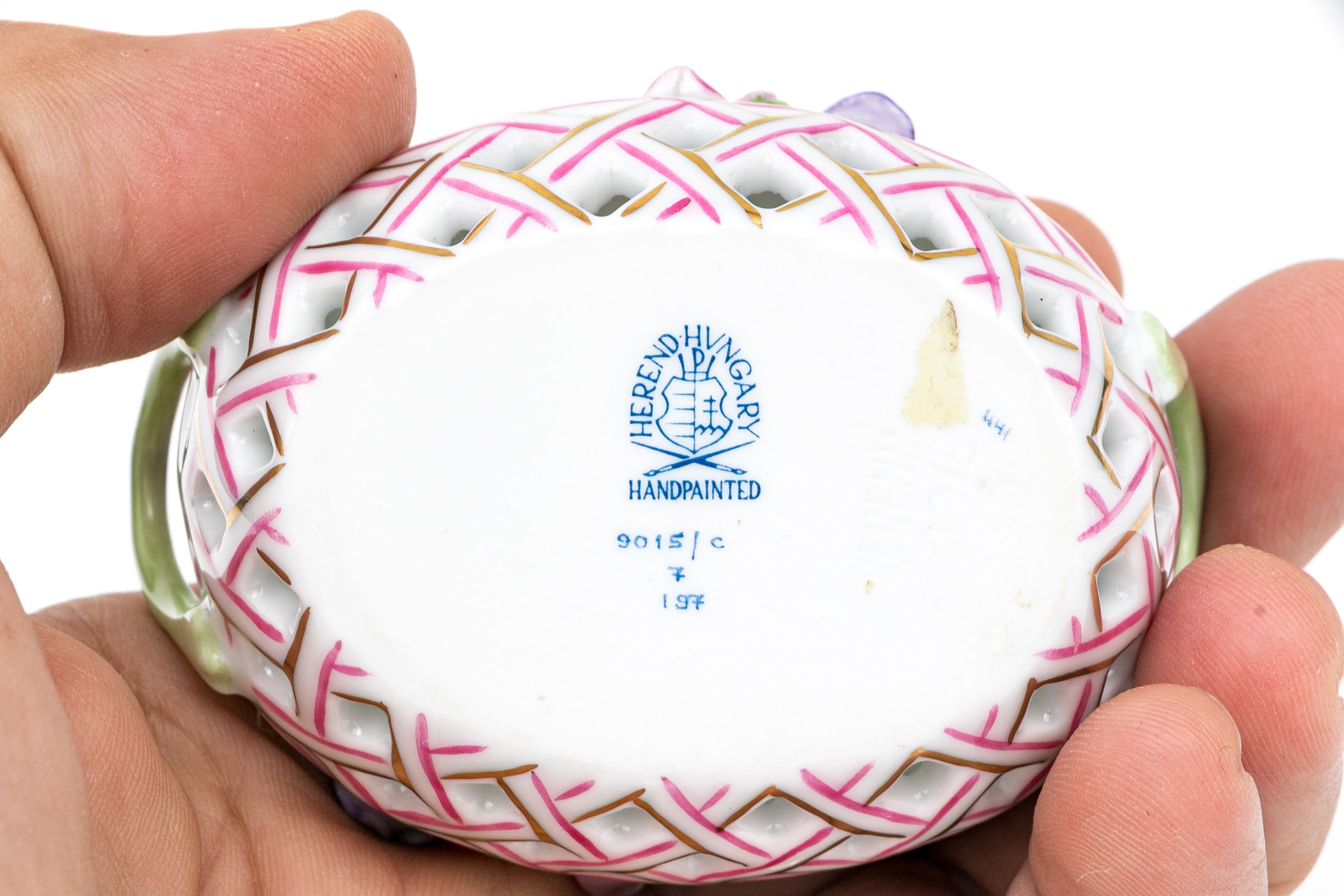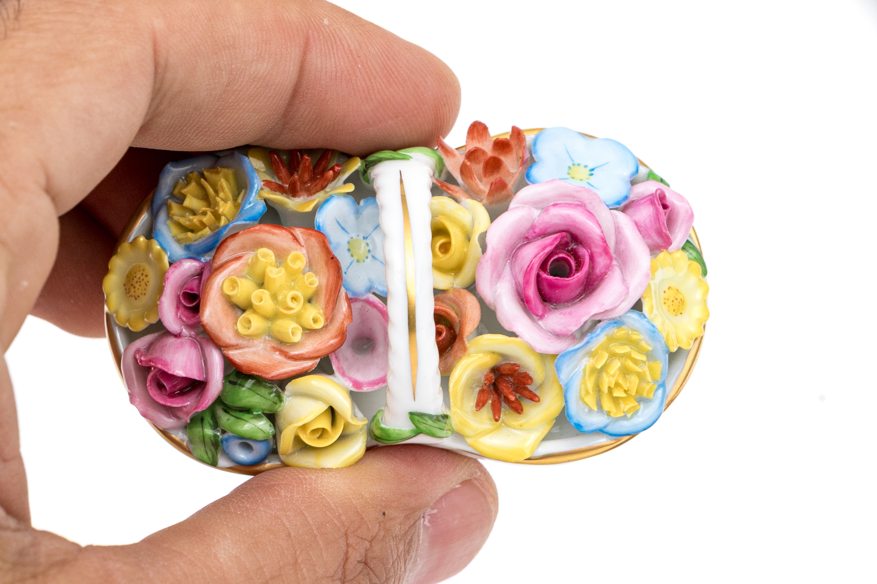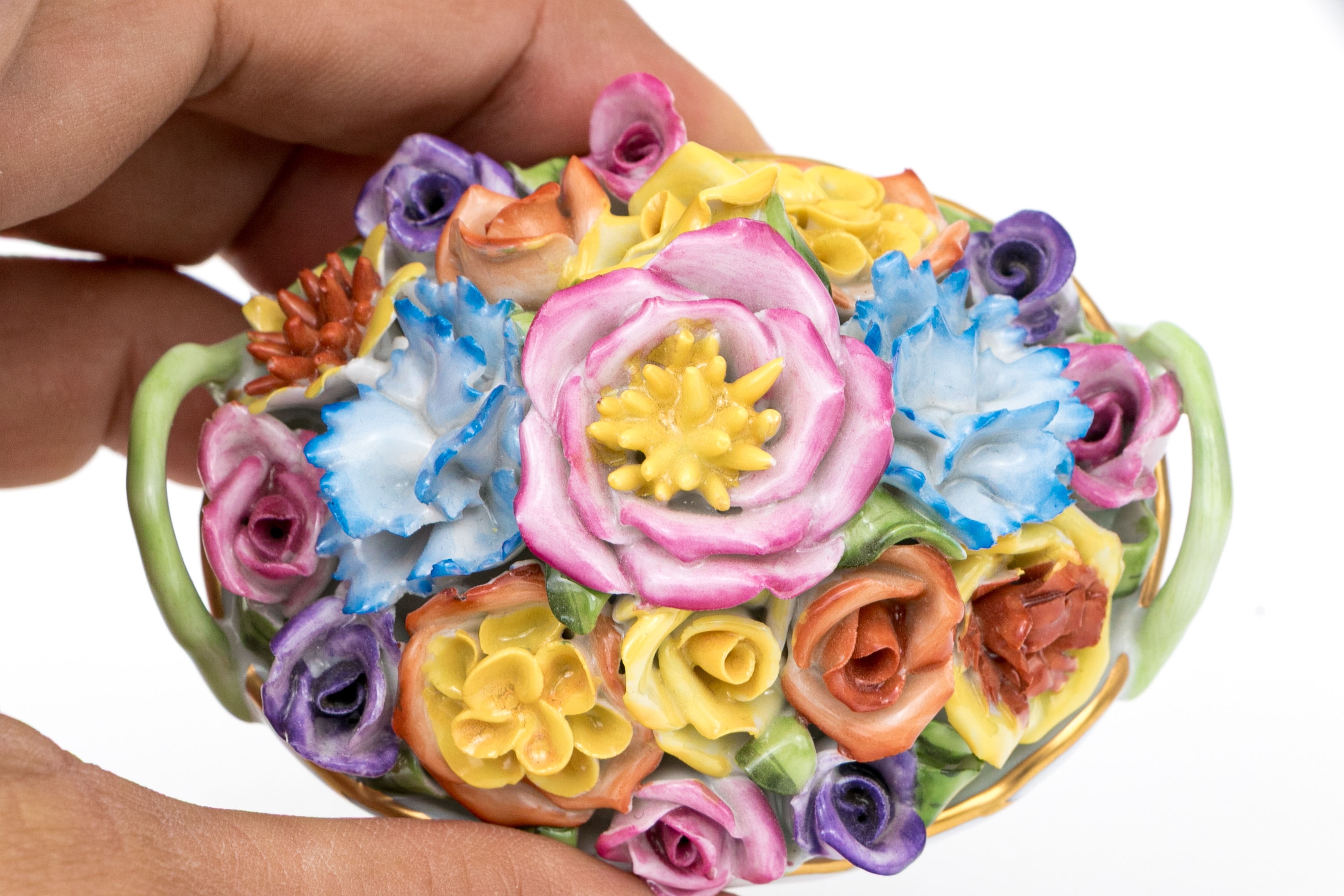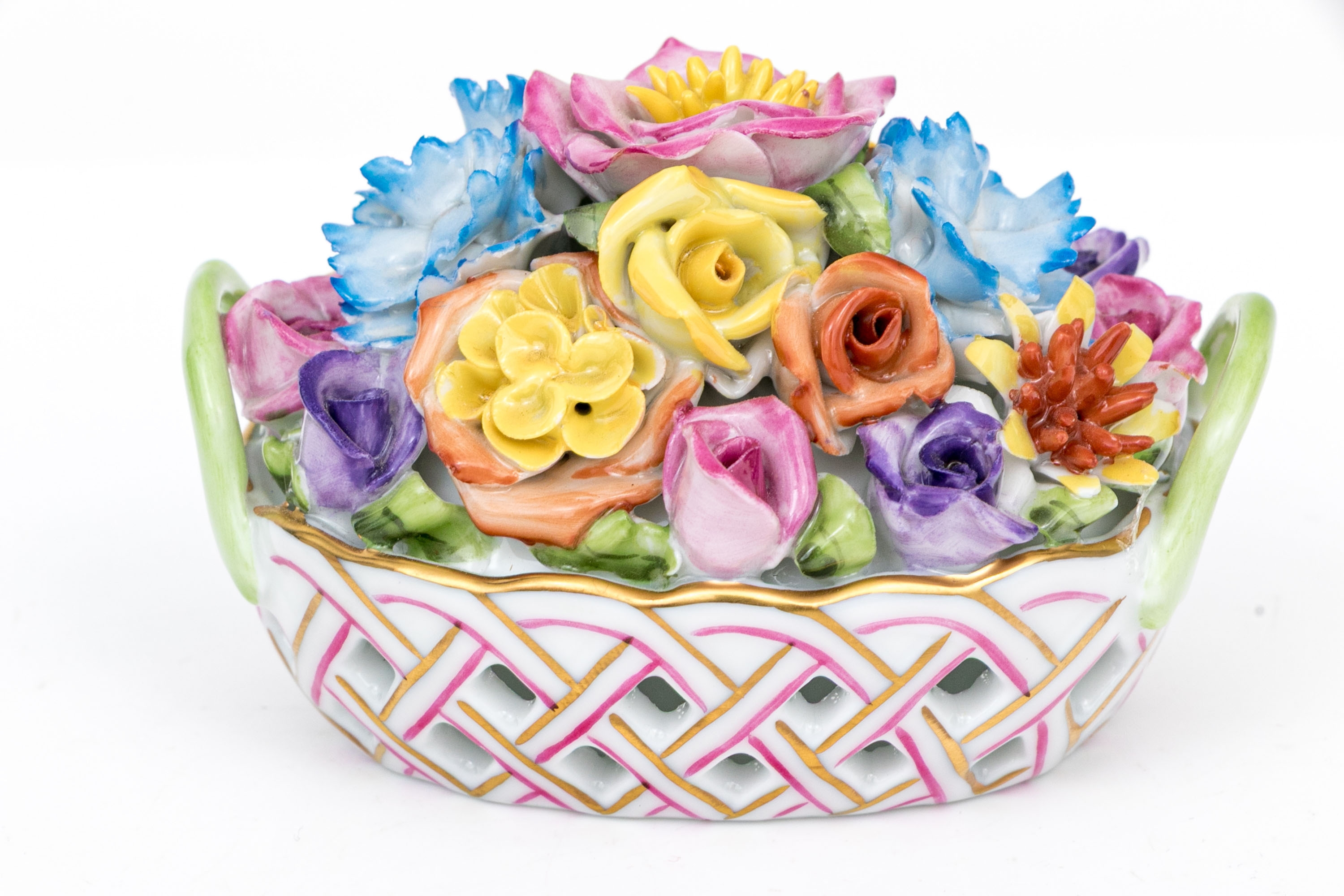 Two Herend Hungary hand-painted porcelain floral baskets. These miniature baskets are lavishly adorned with individually hand-modeled and painted porcelain flowers, each petal and leaf sculpted to capture the realism of natural blooms.