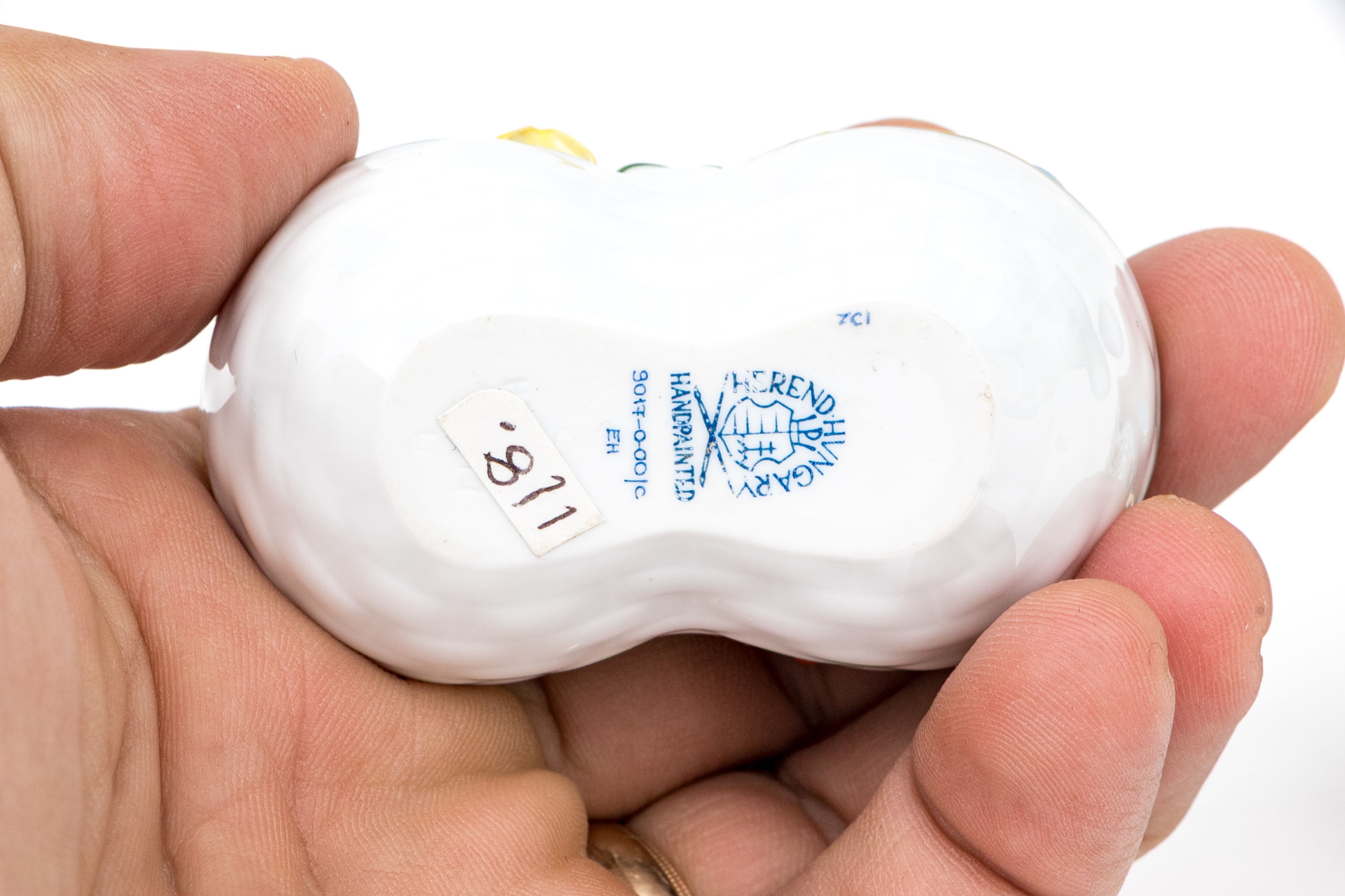 Each piece bears the Herend Hungary blue shield hallmark with crossed paintbrushes and HANDPAINTED mark, denoting authenticity and traditional handcrafting. Additional impressed form numbers, painter’s marks, and codes.