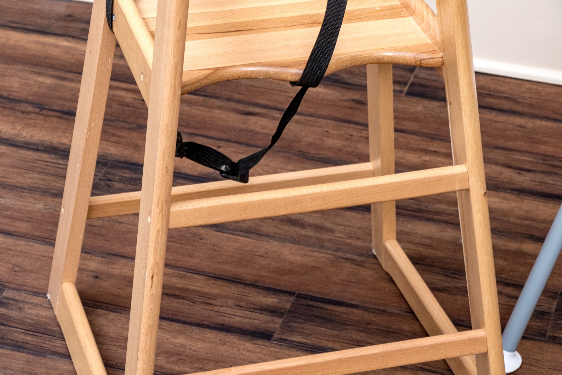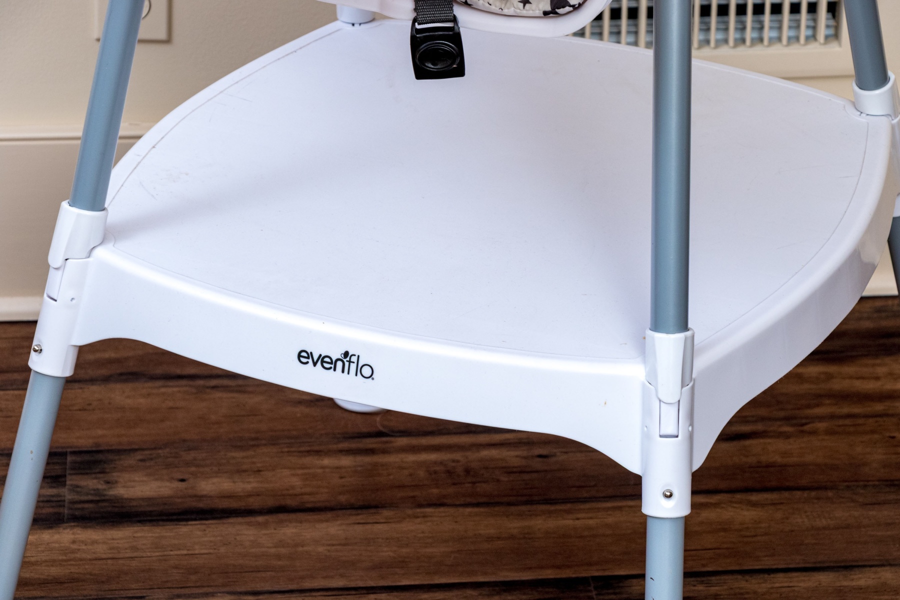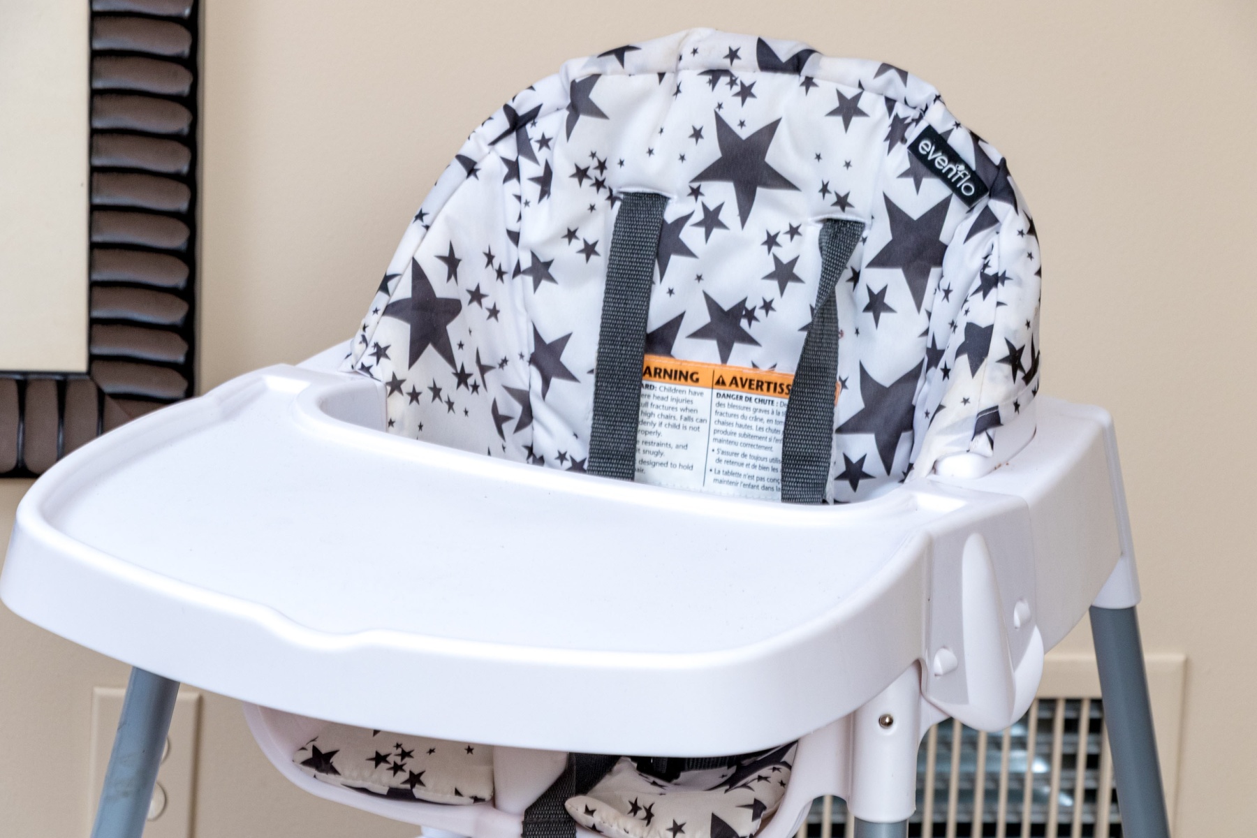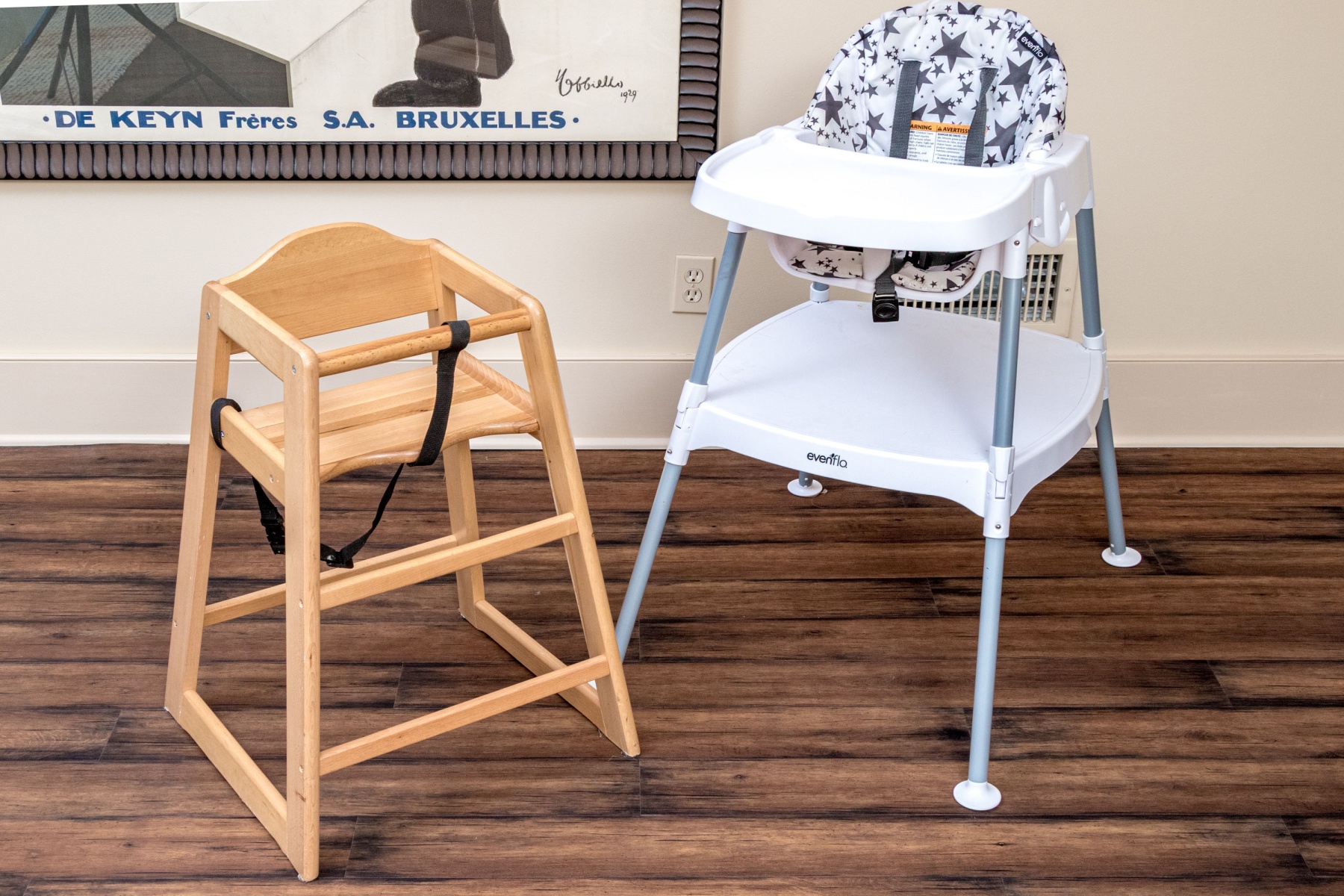 A wonderful duo of high chairs including one in wood with a camelback three front rungs. Accompanied by a taller Evenflo high chair with a black and white star patterned cloth seat seat with straps, a tray table, and a lower tiered shelf raised on four splayed legs.