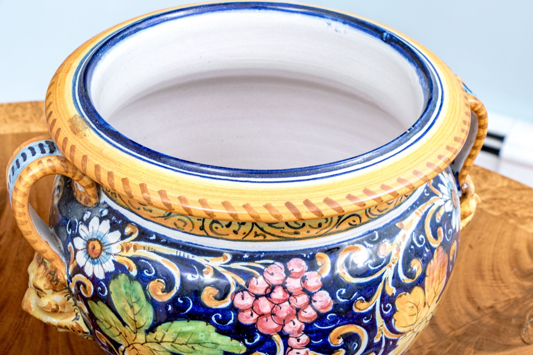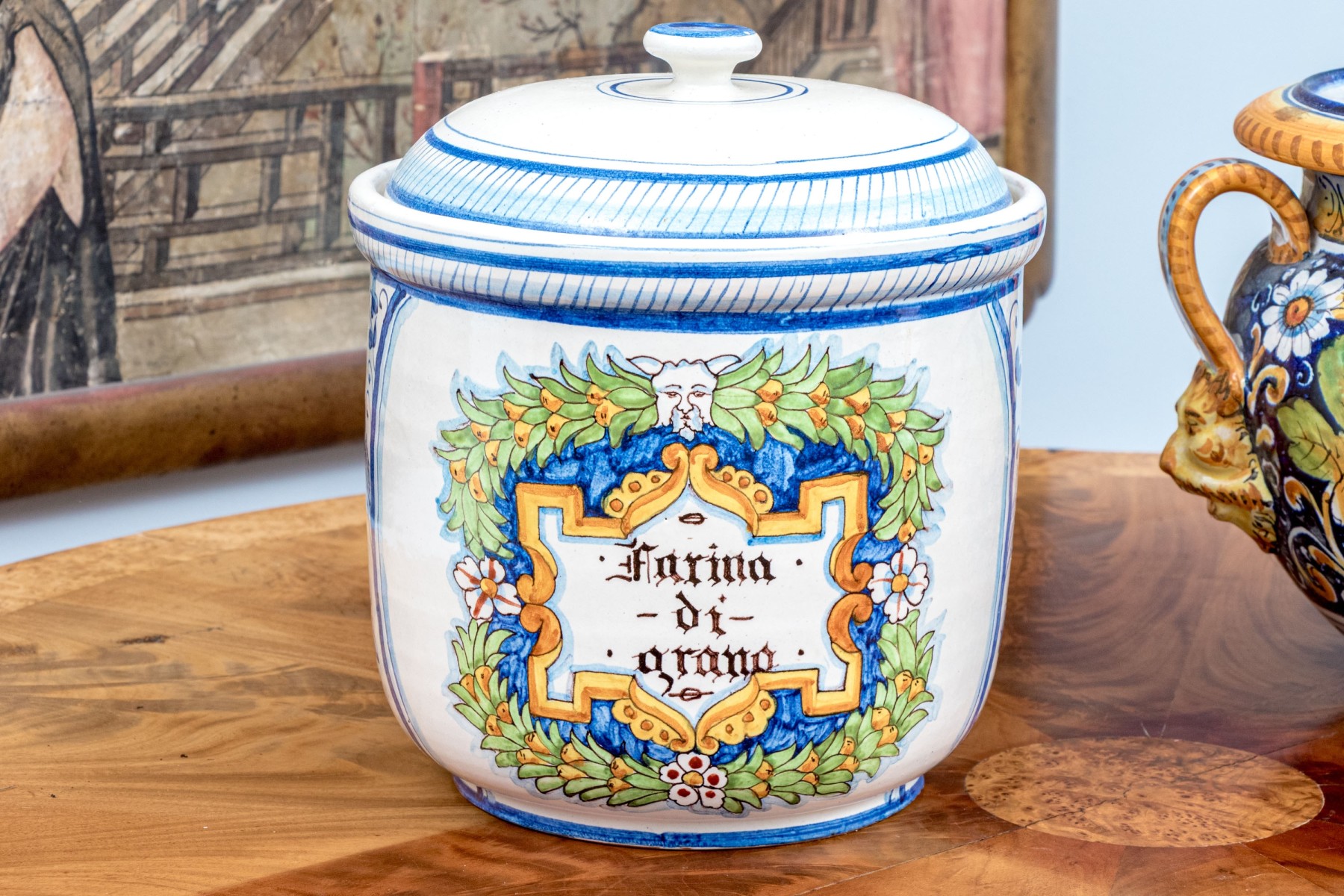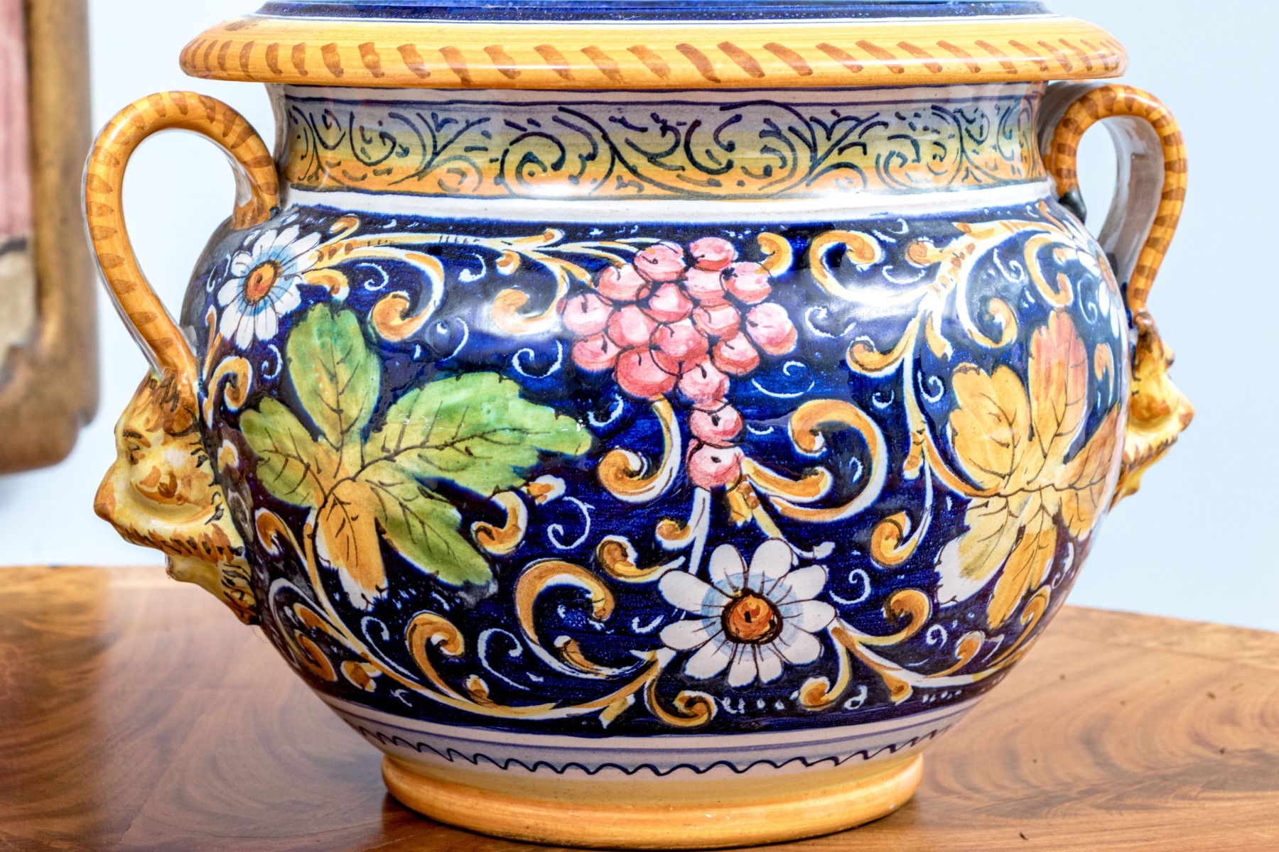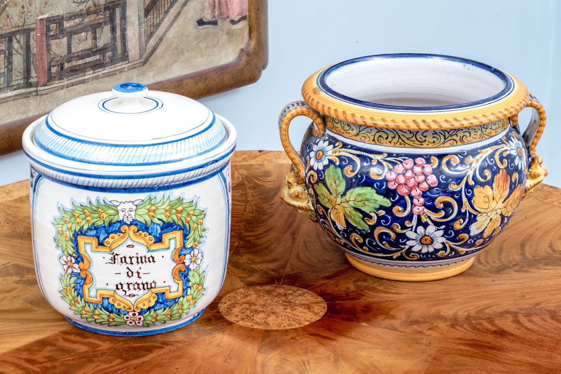 A gorgeous duo of Italian ceramic vessels including a lidded flour jar with the label "farina di grano" surrounded by wreaths and flowers. Accompanied by a jardiniere with a lappet rim, twin handles leading to sculptural faces, and a bun-shaped body on a circular foot hand-decorated with grapes, leaves, and flowers with scrolling foliage against a dark blue ground.