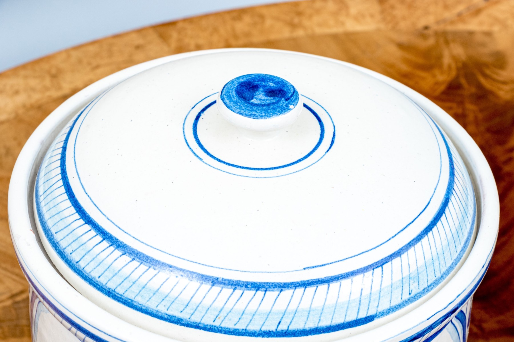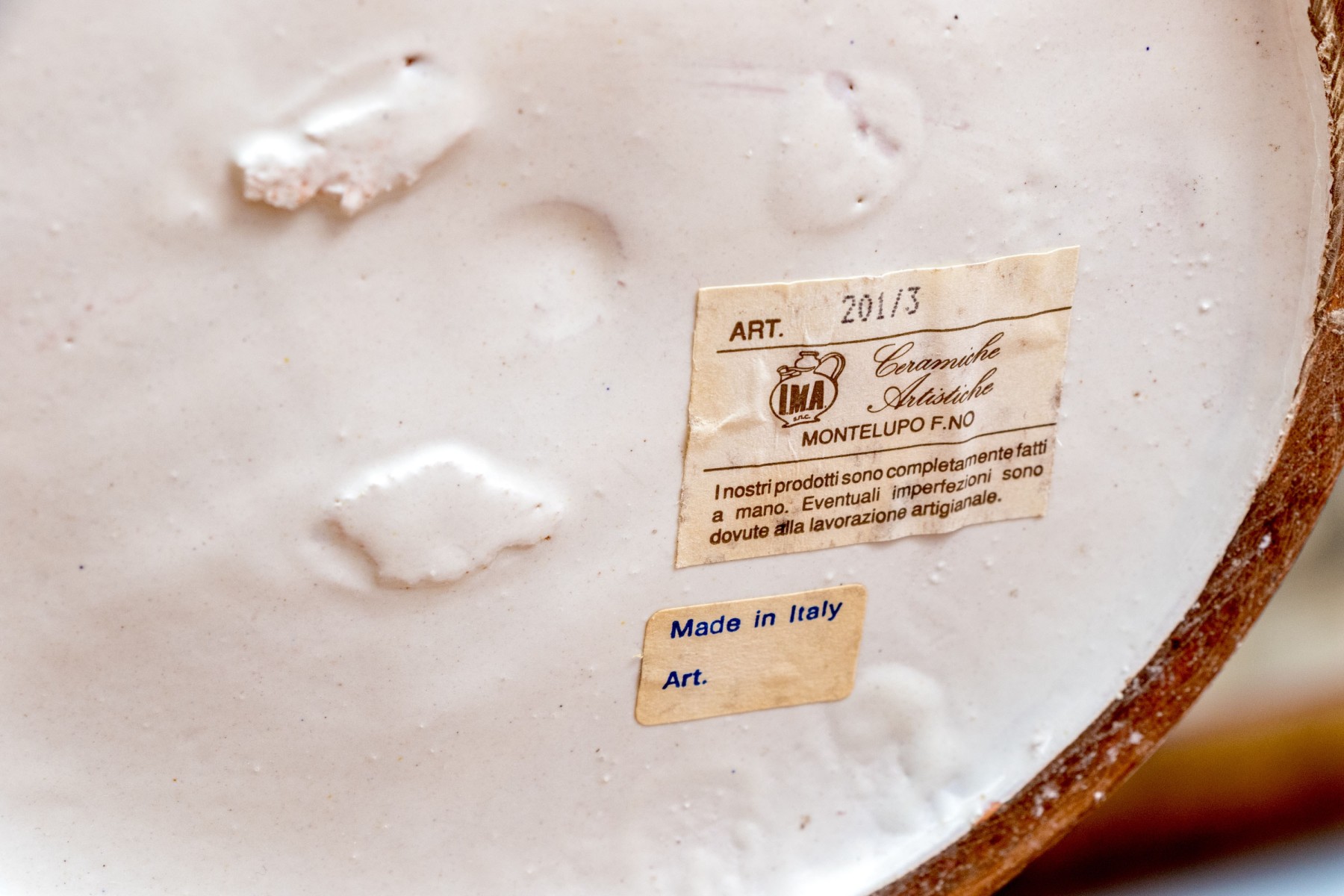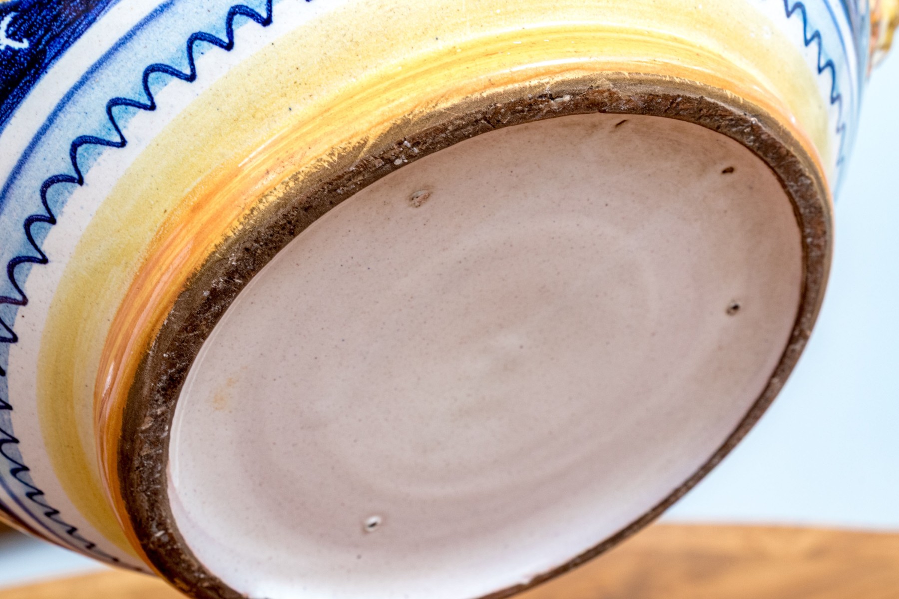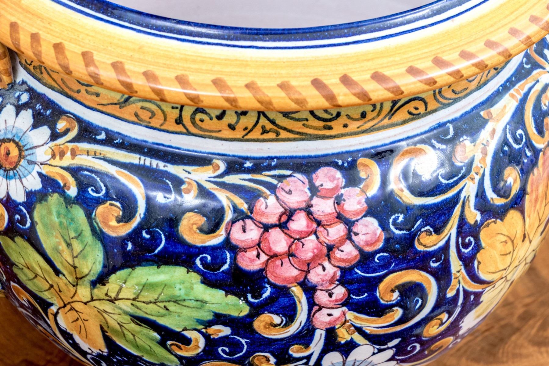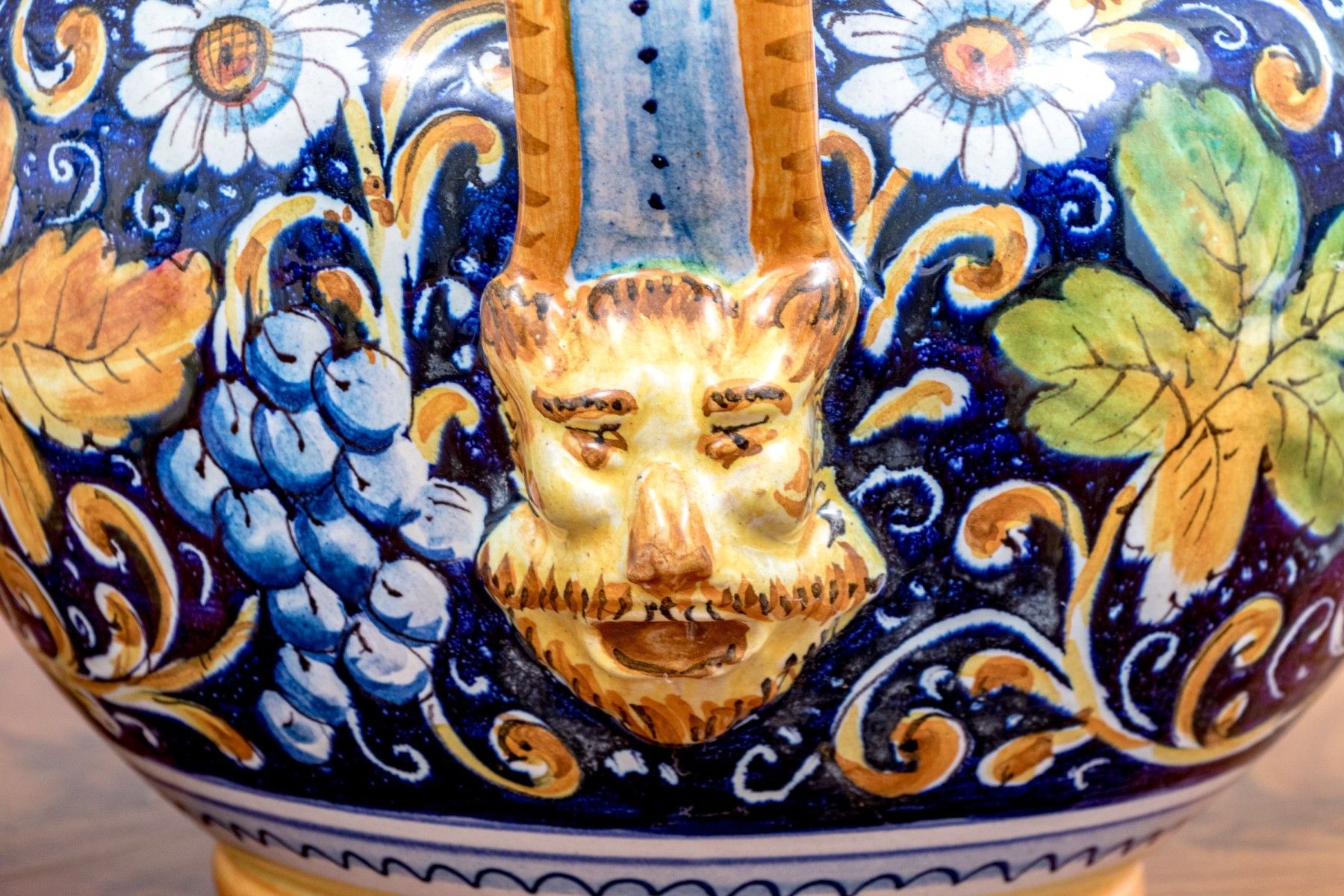 A gorgeous duo of Italian ceramic vessels including a lidded flour jar with the label "farina di grano" surrounded by wreaths and flowers. Accompanied by a jardiniere with a lappet rim, twin handles leading to sculptural faces, and a bun-shaped body on a circular foot hand-decorated with grapes, leaves, and flowers with scrolling foliage against a dark blue ground.