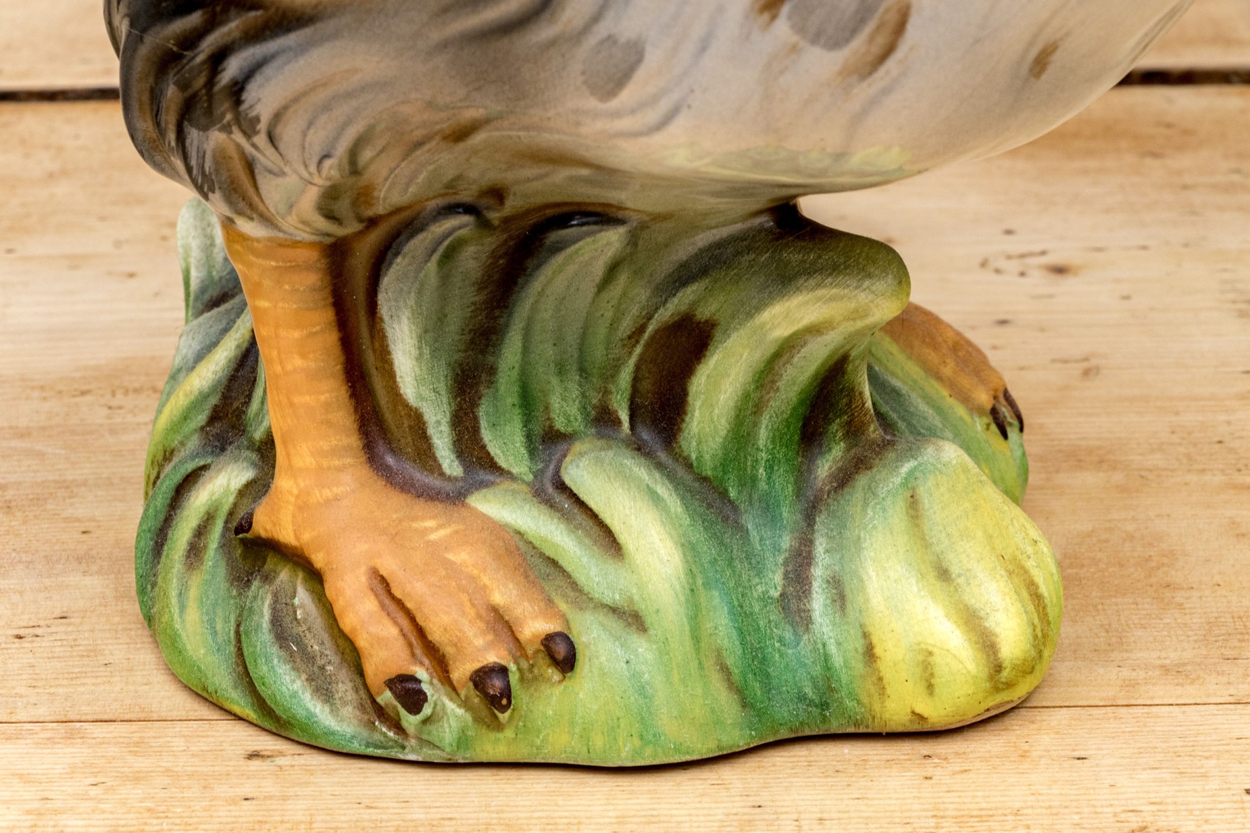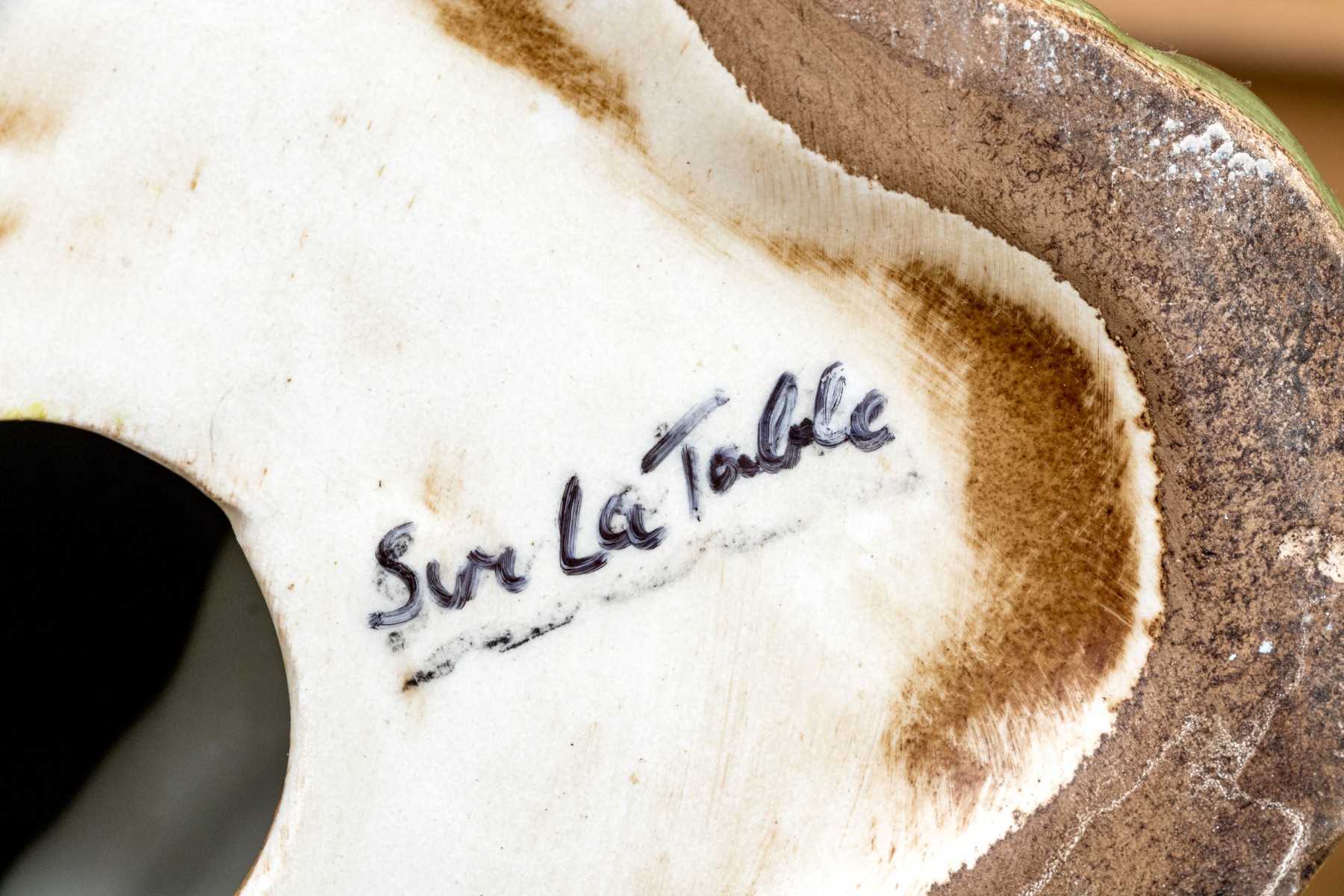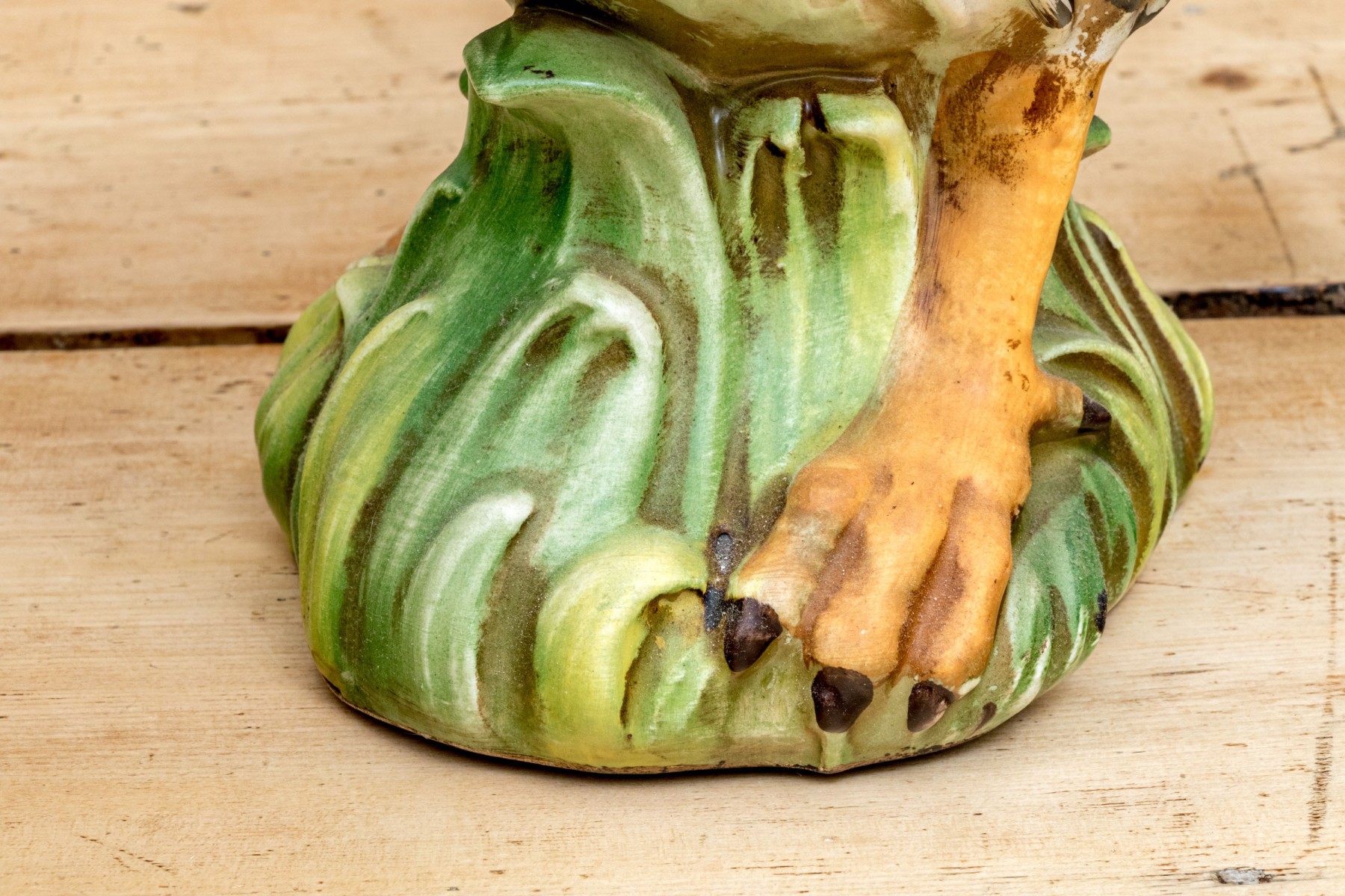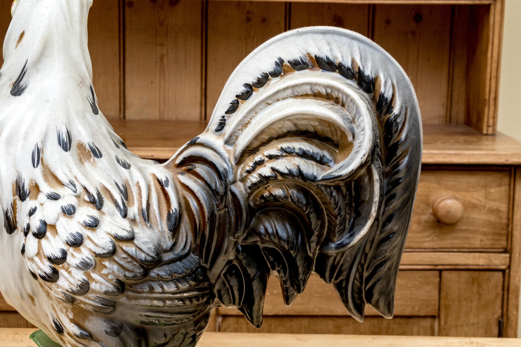 A delightful small and large duo of Sur La Table and STL ceramic rooster figures. Paint decorated in naturalistic majolica style with wonderful texture, color and, design in nicely detailed three dimensional form for a perfect kitchen or farmhouse aesthetic. Both marked underfoot.