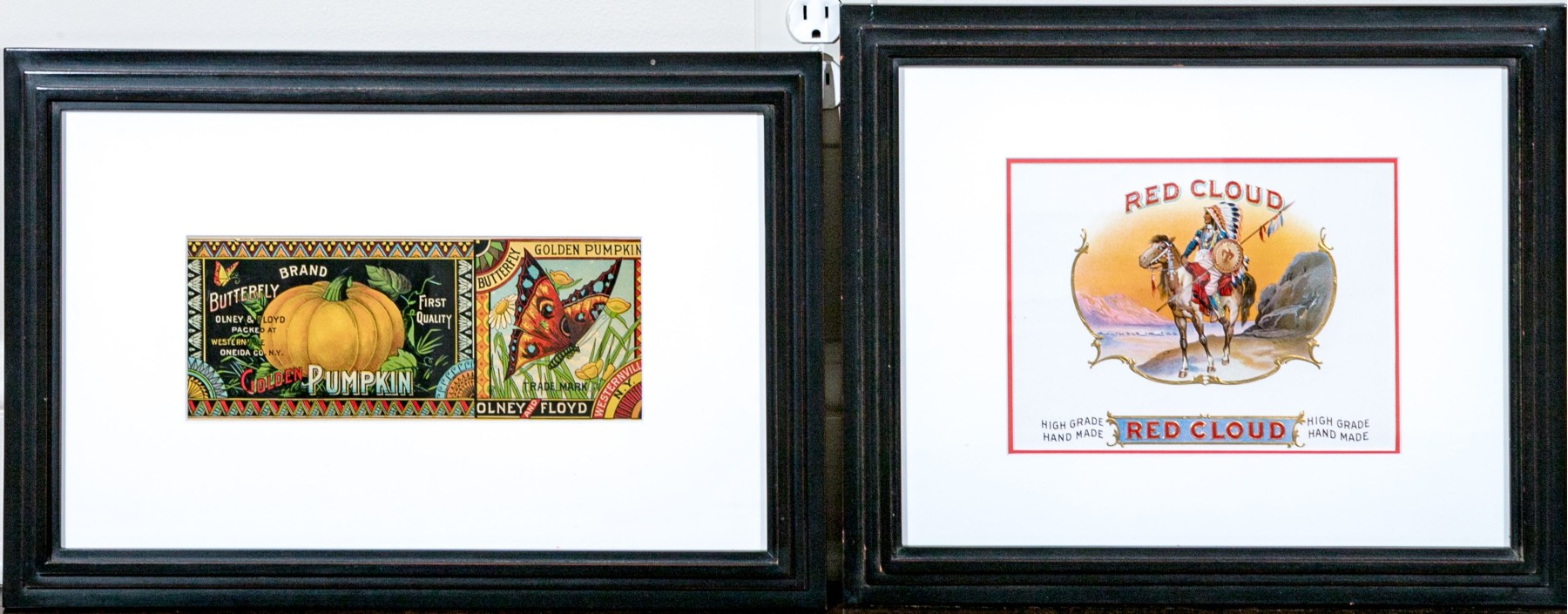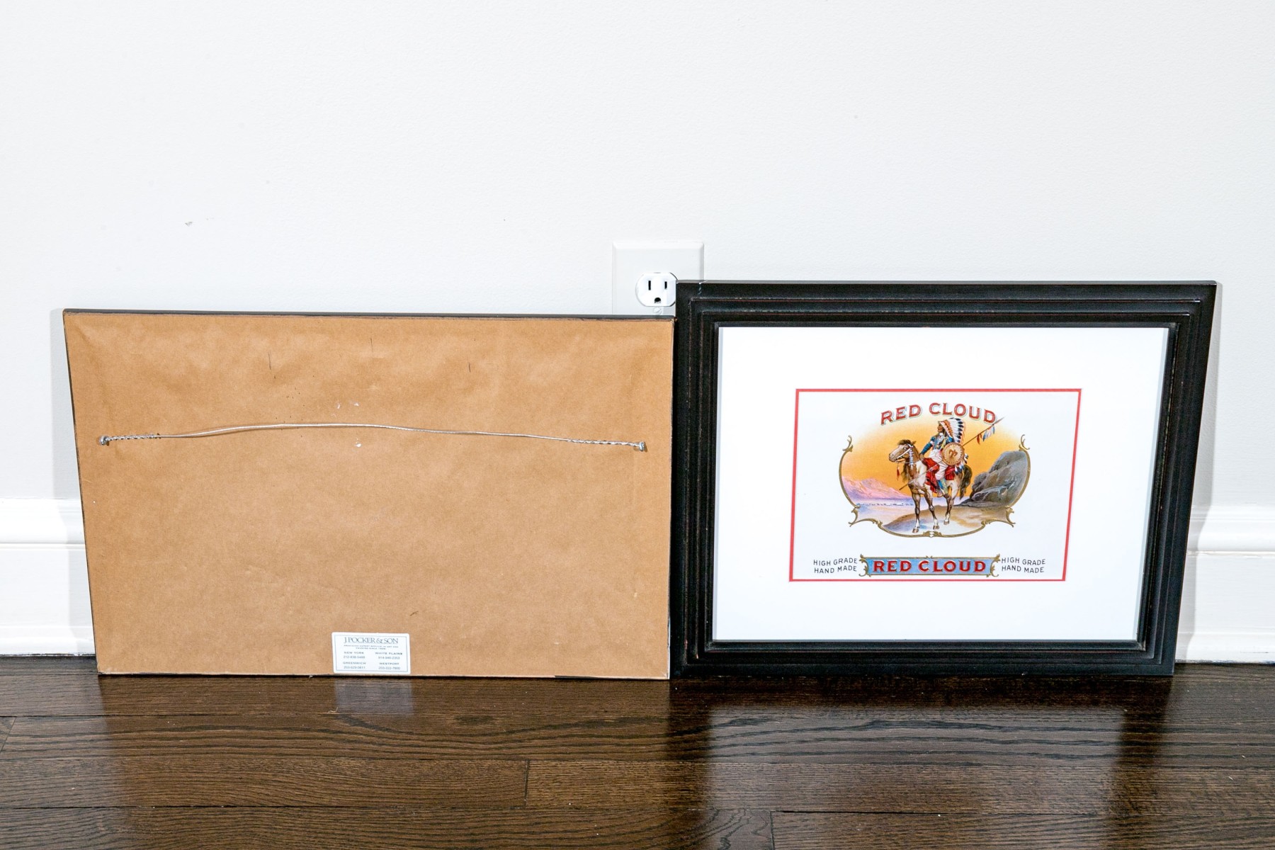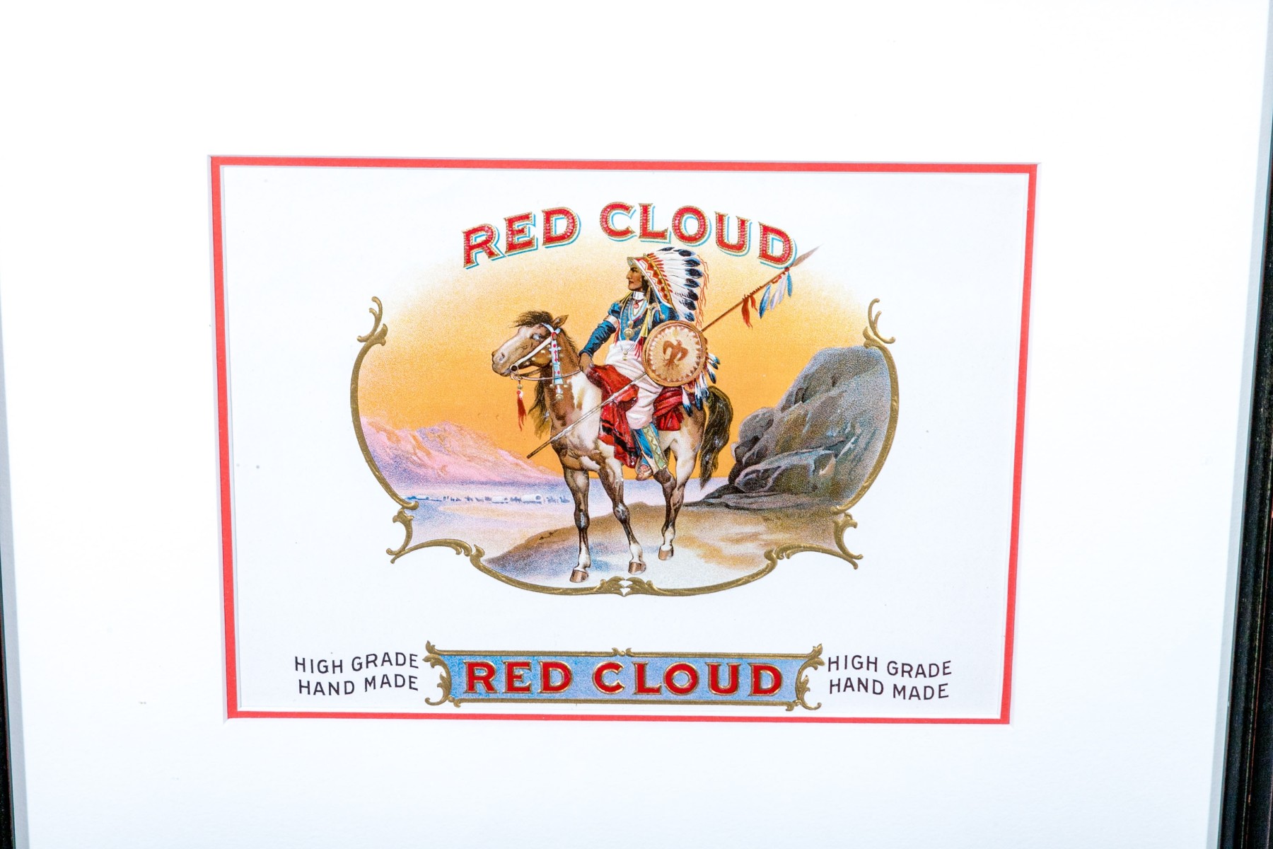 And a Red Cloud cigar box label with the image of a Native American chief on horseback. Presented inn the same style J. Pocker & Son frame with glass.