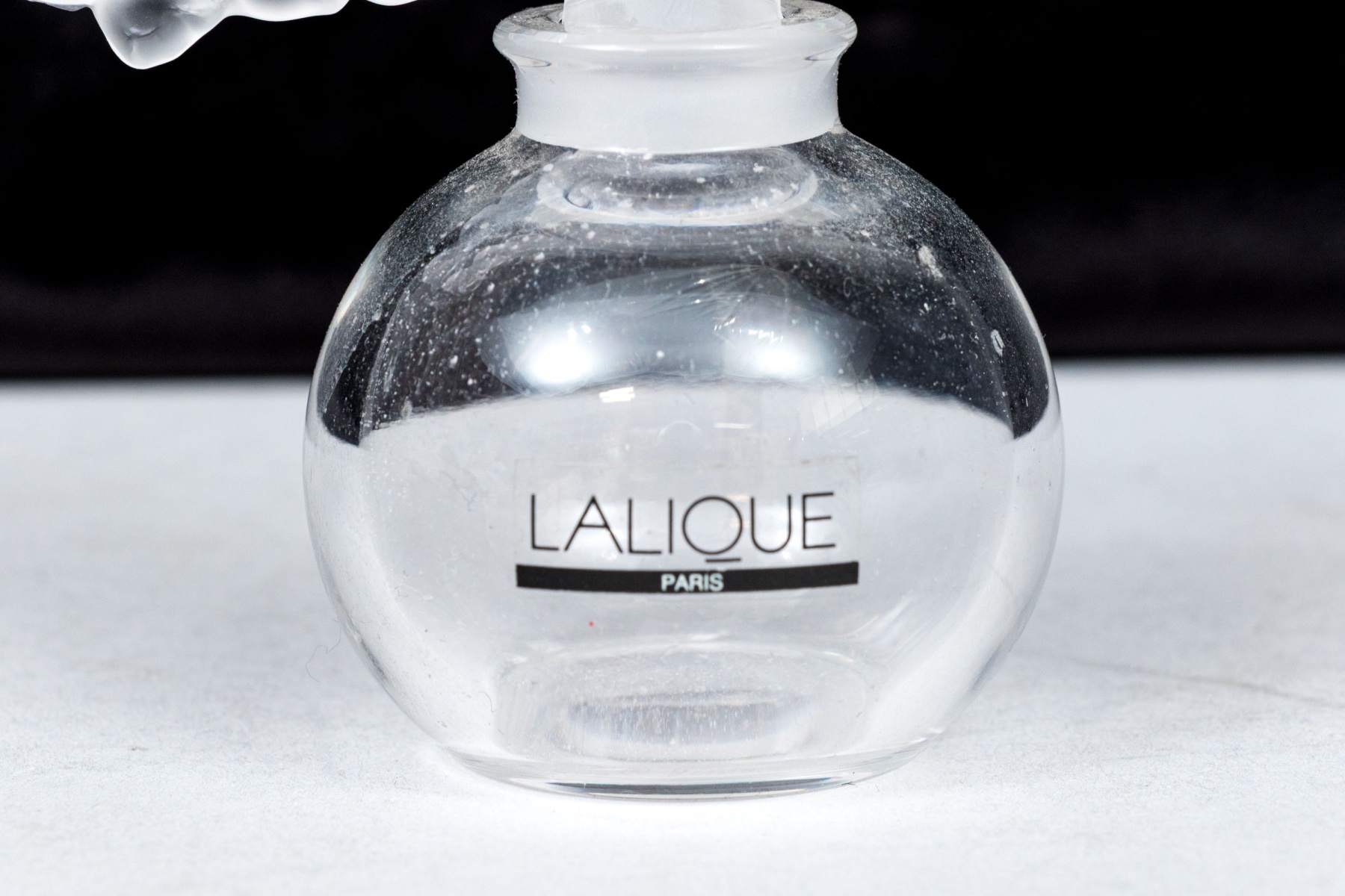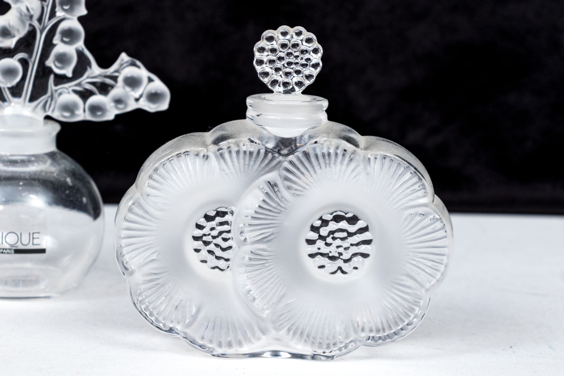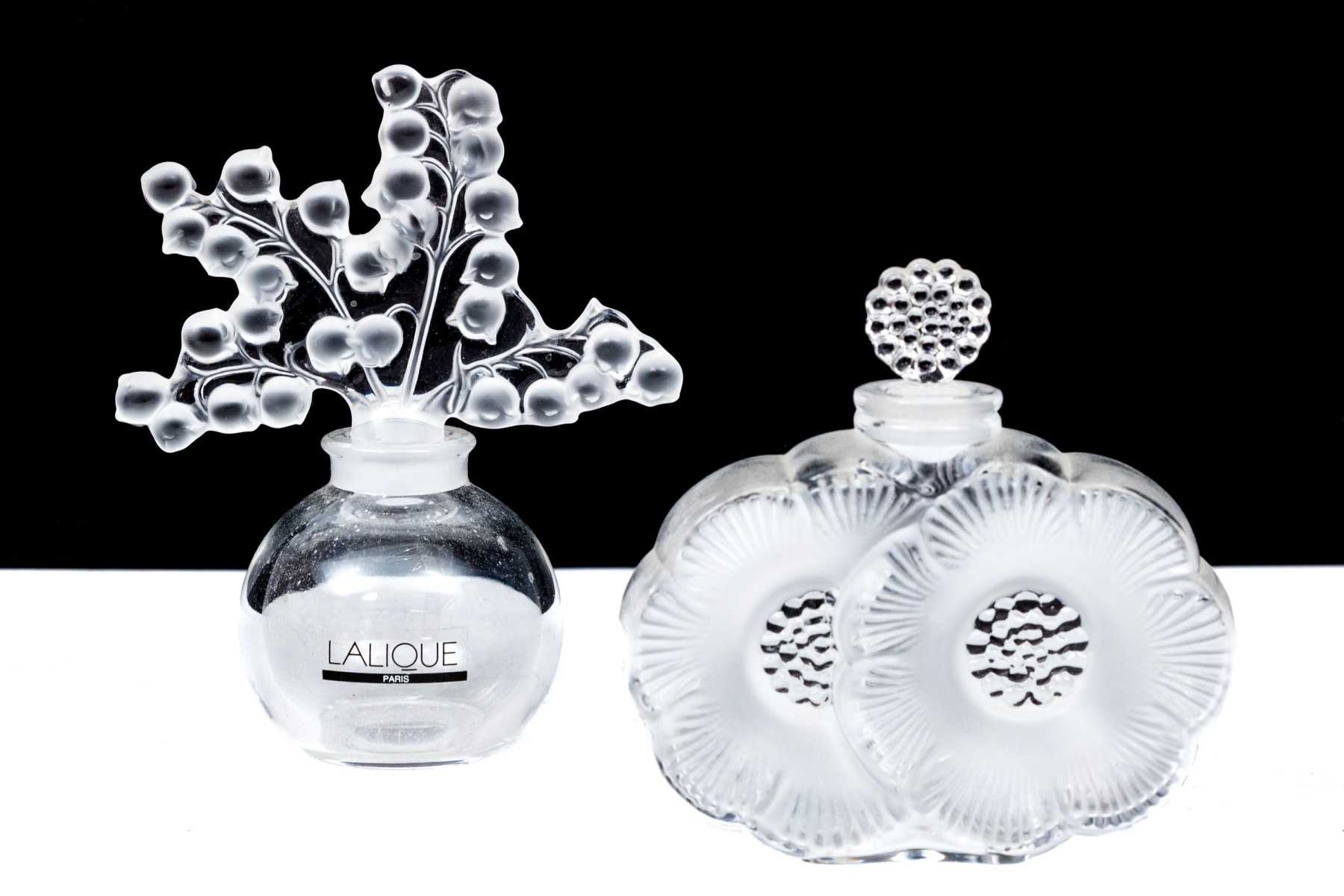 Both are marked Lalique. Each with its stopper. One in floral form and the second in the form of a potted flower, with the stopper in floral bouquet form.