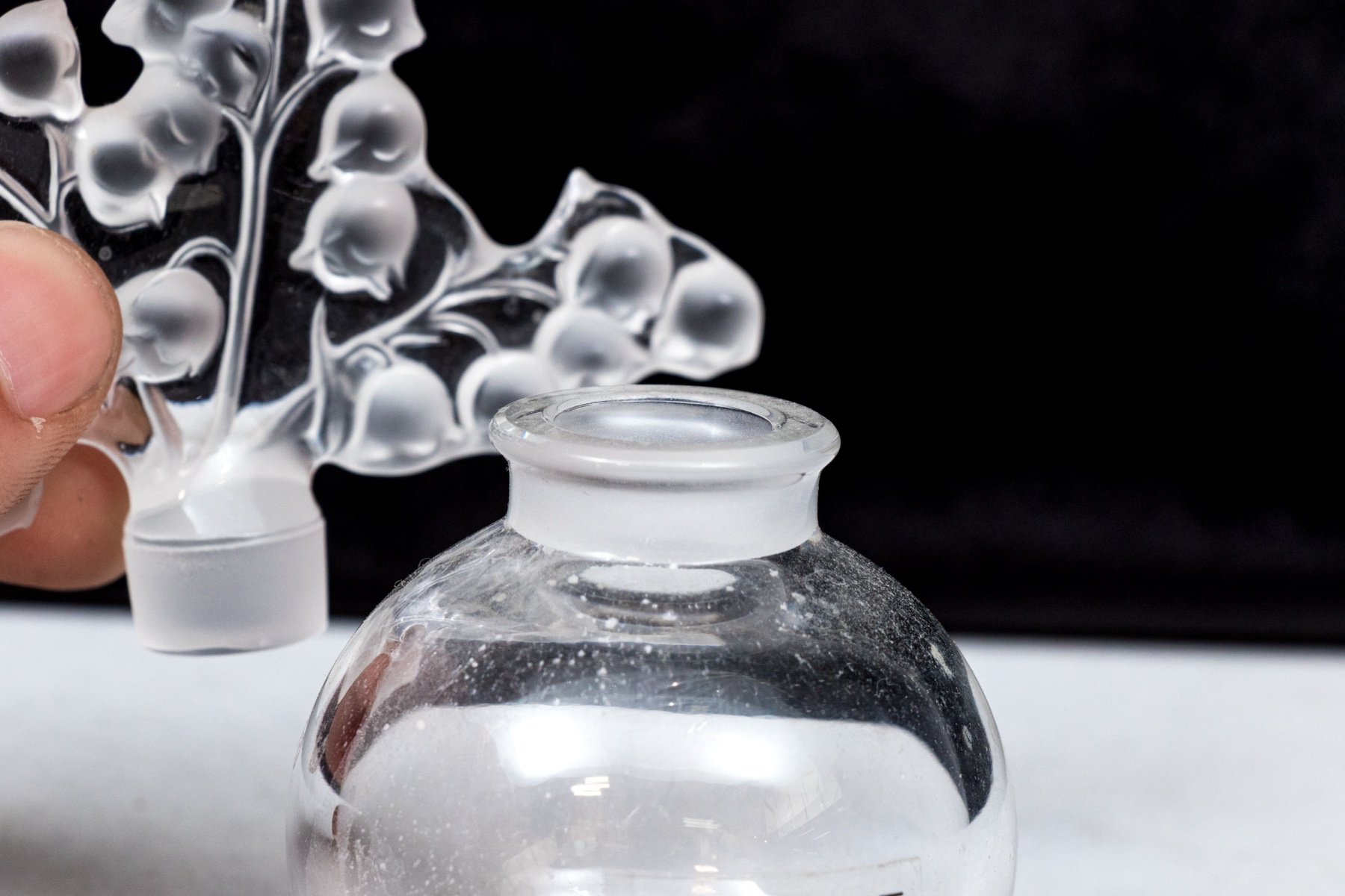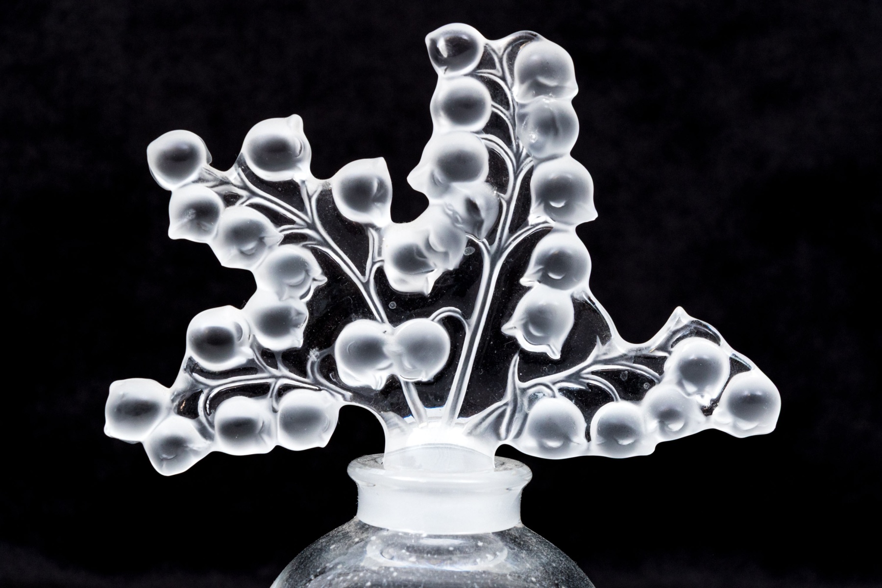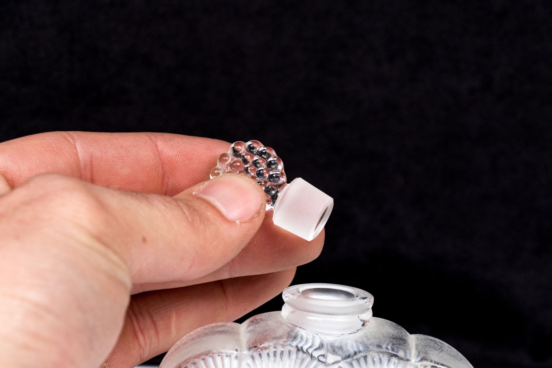 Both are marked Lalique. Each with its stopper. One in floral form and the second in the form of a potted flower, with the stopper in floral bouquet form.