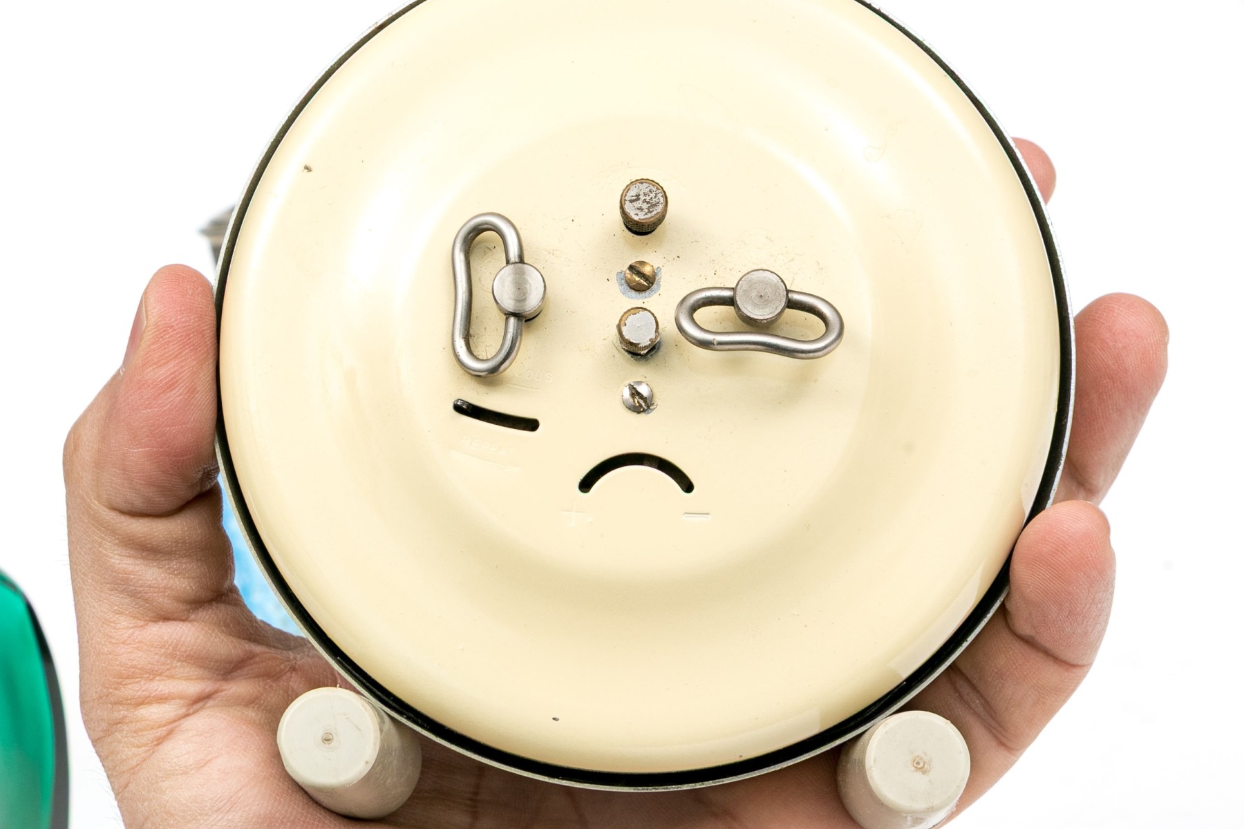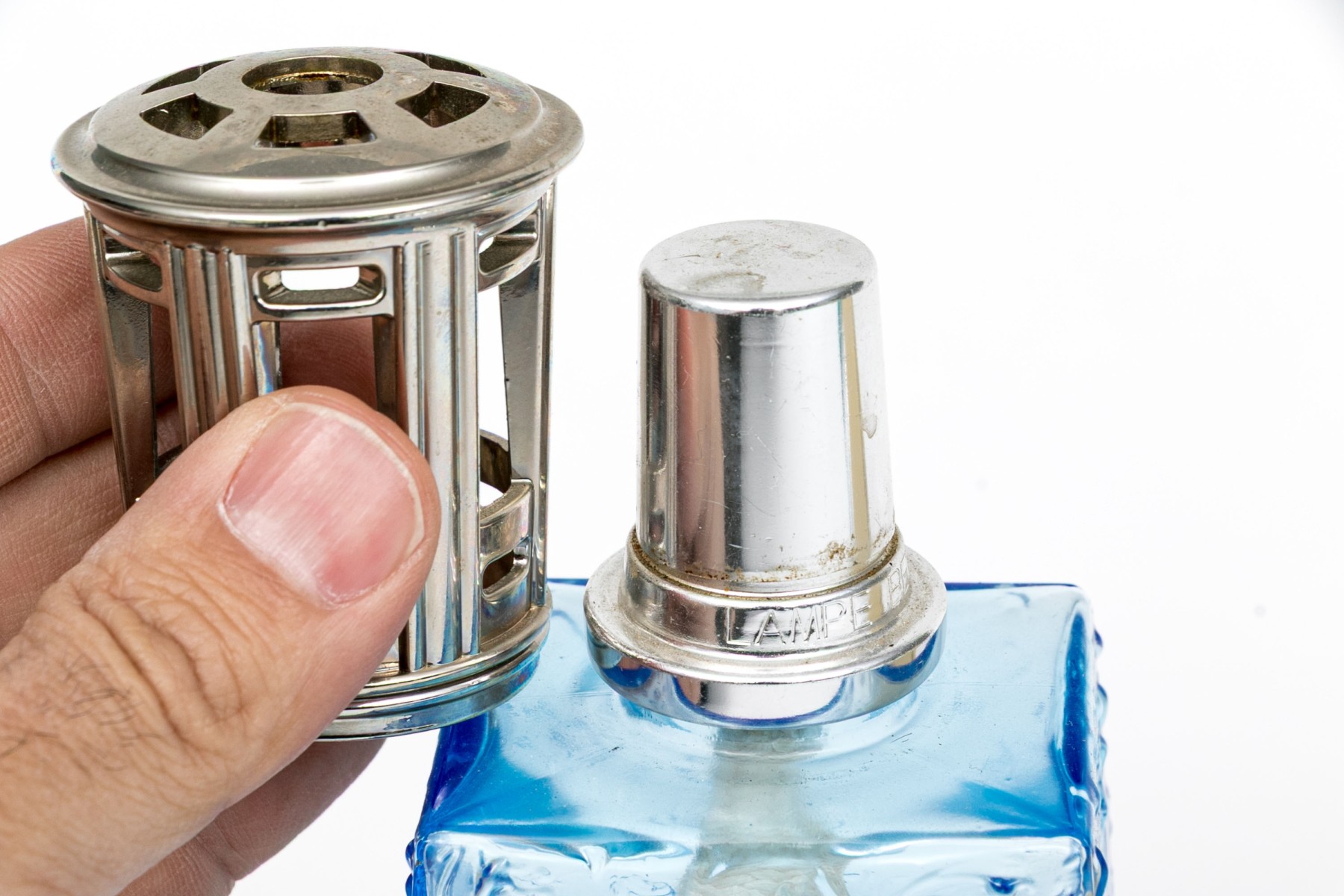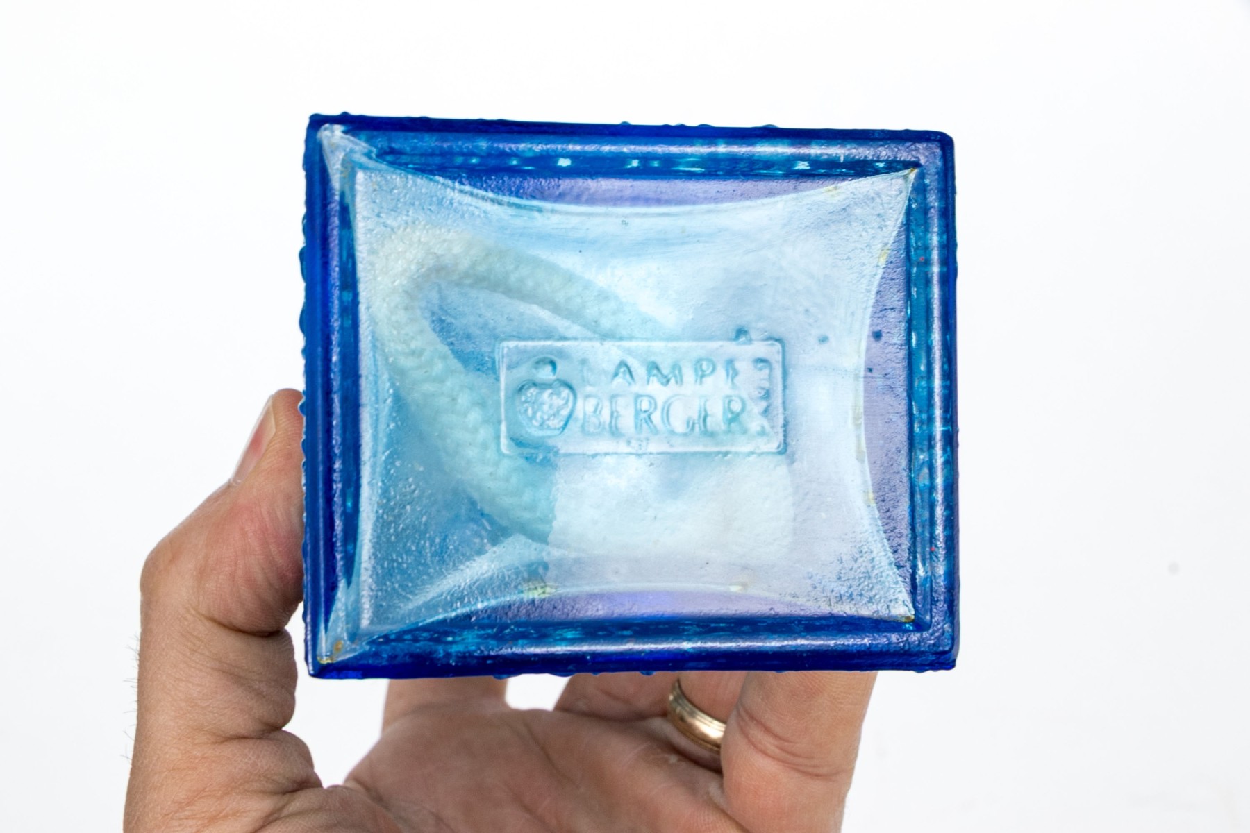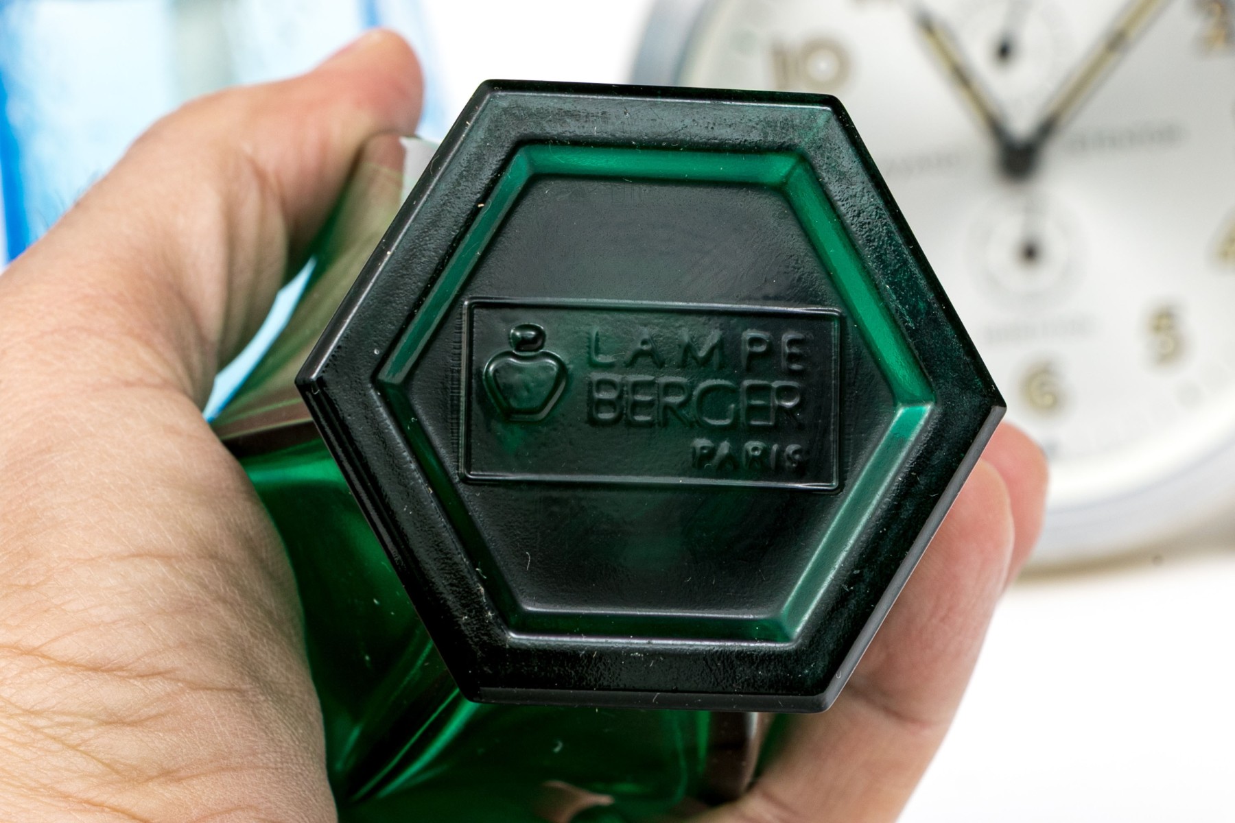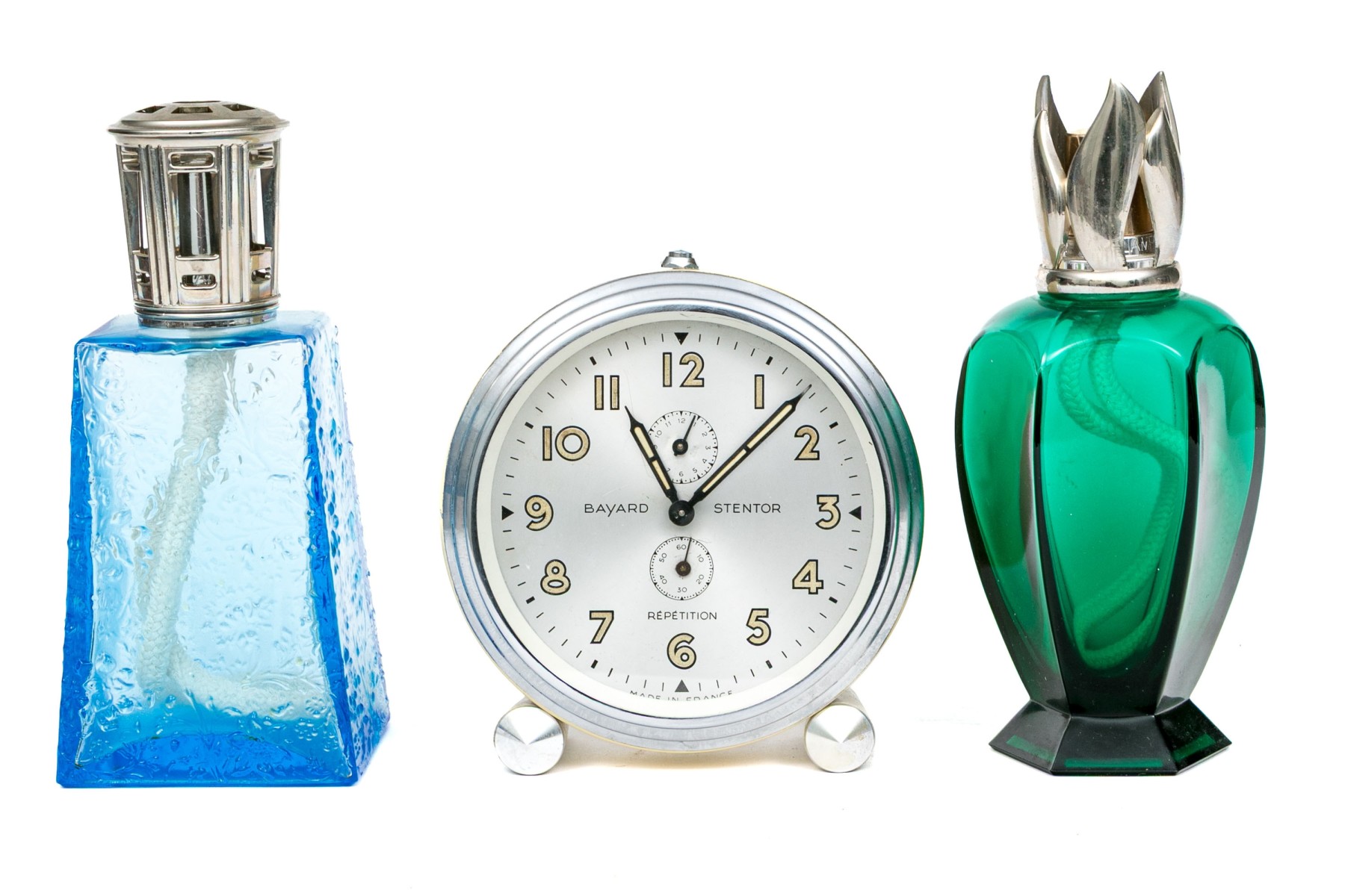 A delightful group of tabletop pieces including blue and green Lampe Berger oil lamps and a Bayard Stentor clock.
