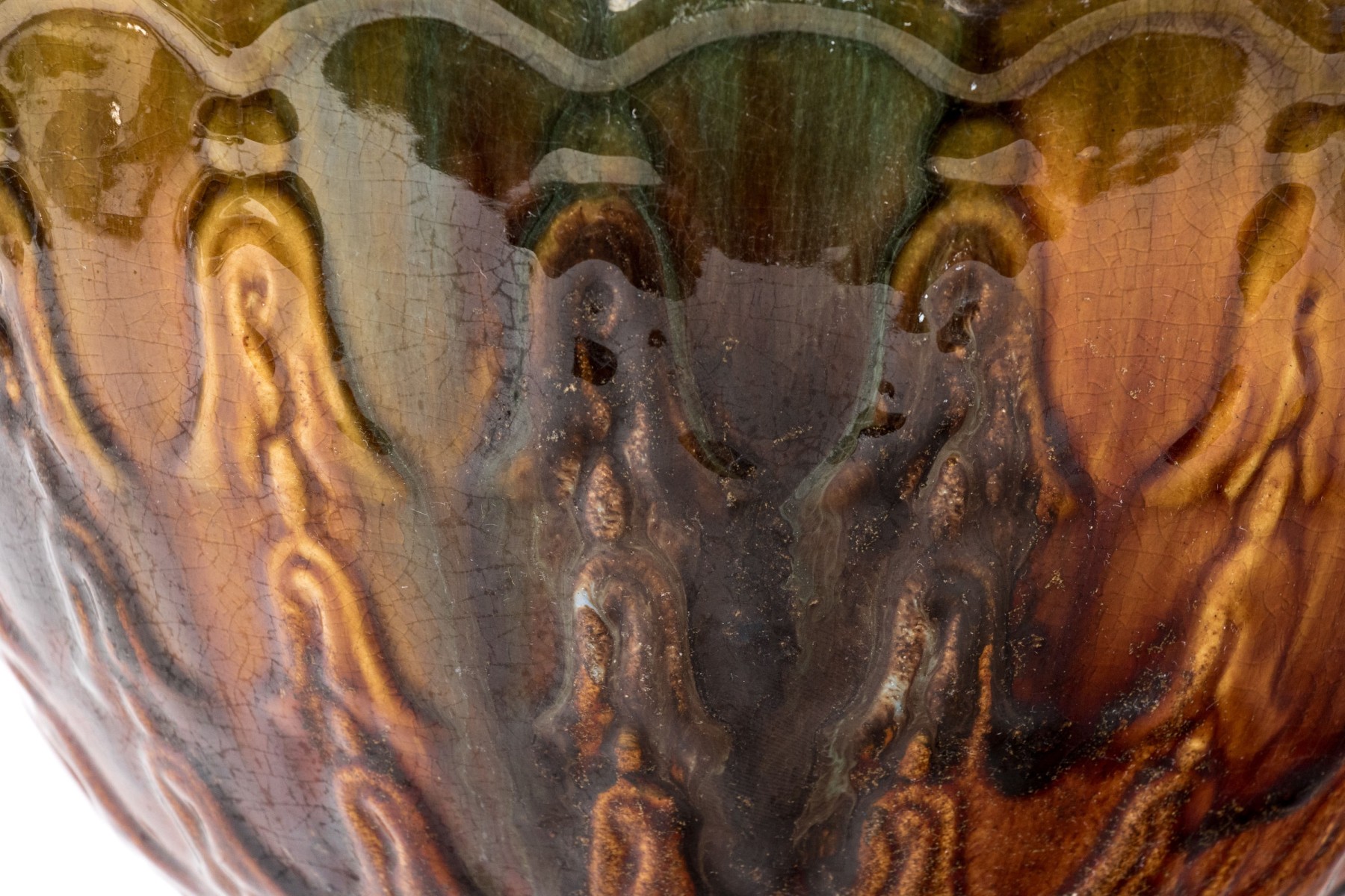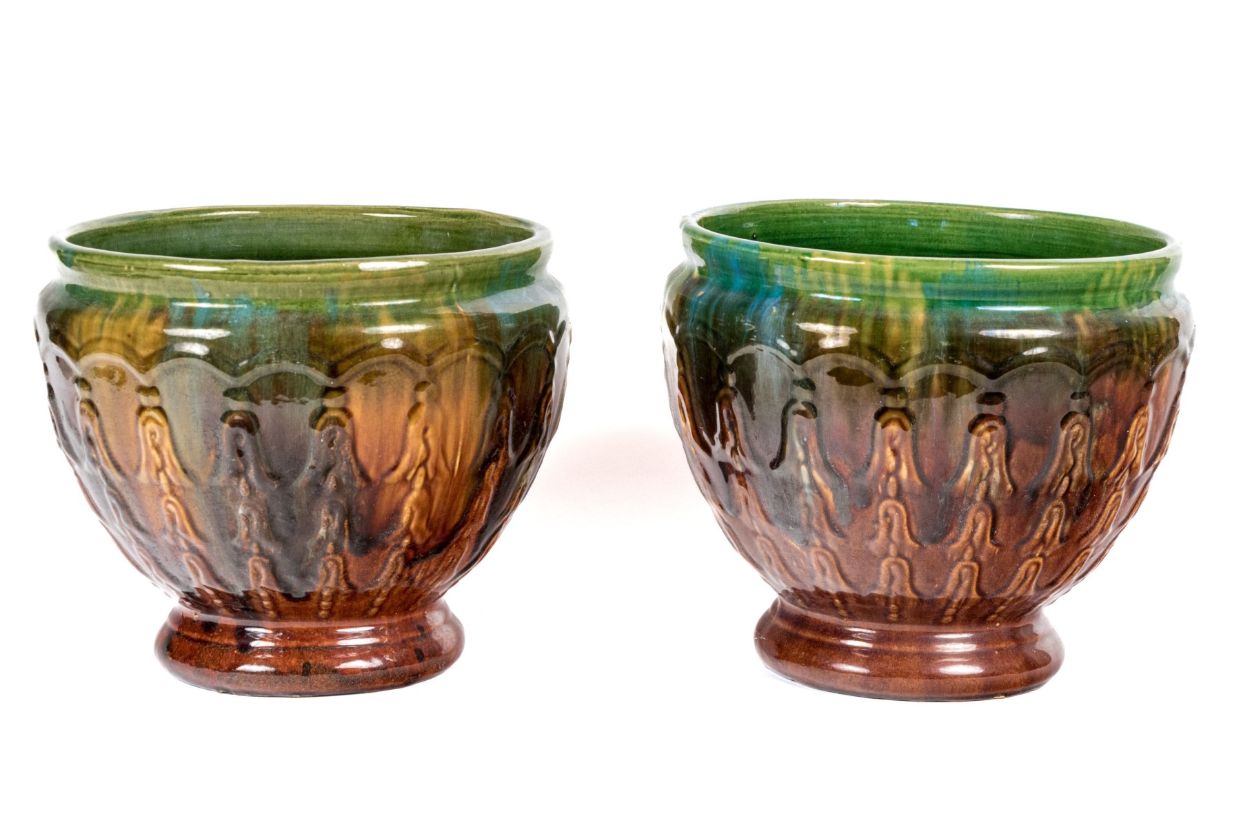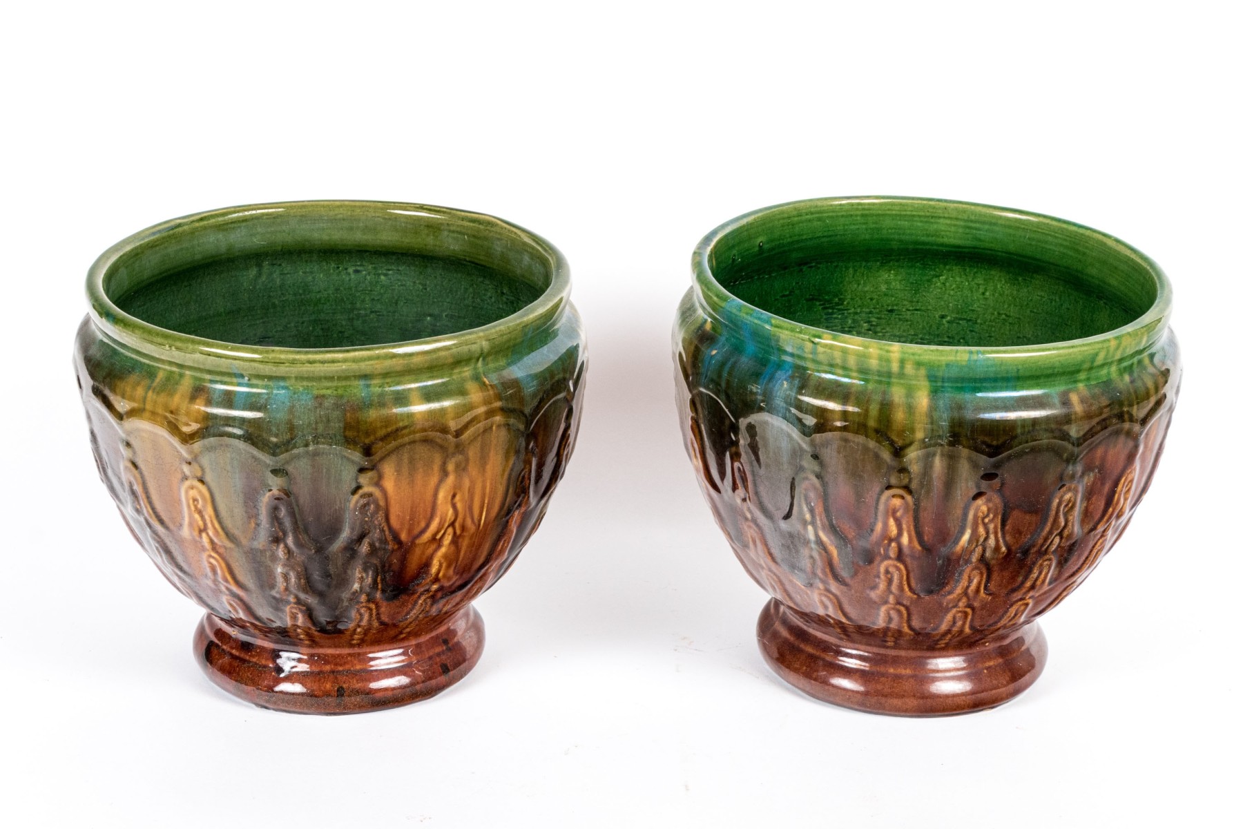 A fabulous pair of McCoy Bellflower pattern ceramic jardinieres glazed in appealing green, orange, and brown ombre over apple forms with wide, short flared rims and bodies decorated with graduating vining buds leading to a circular foot.