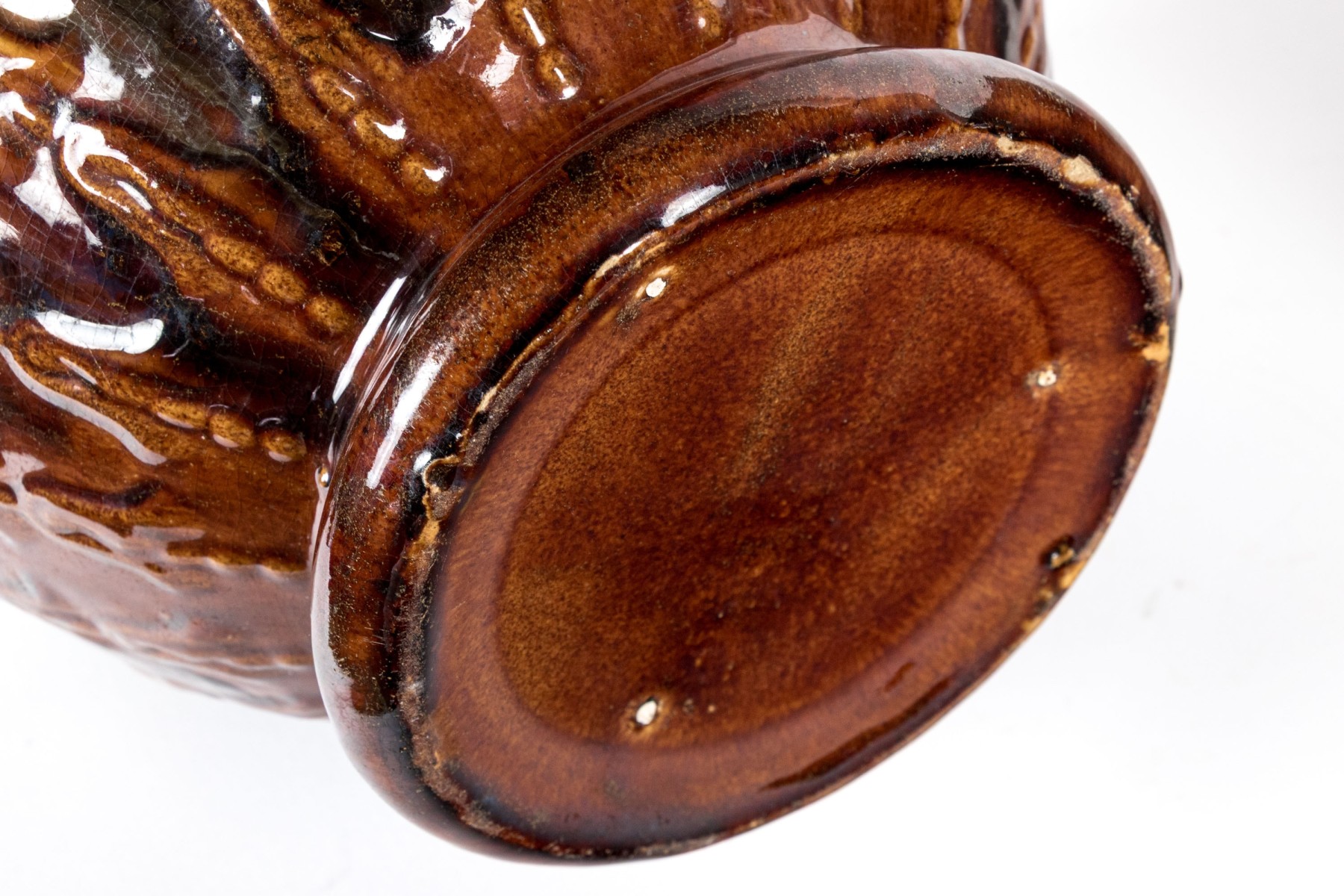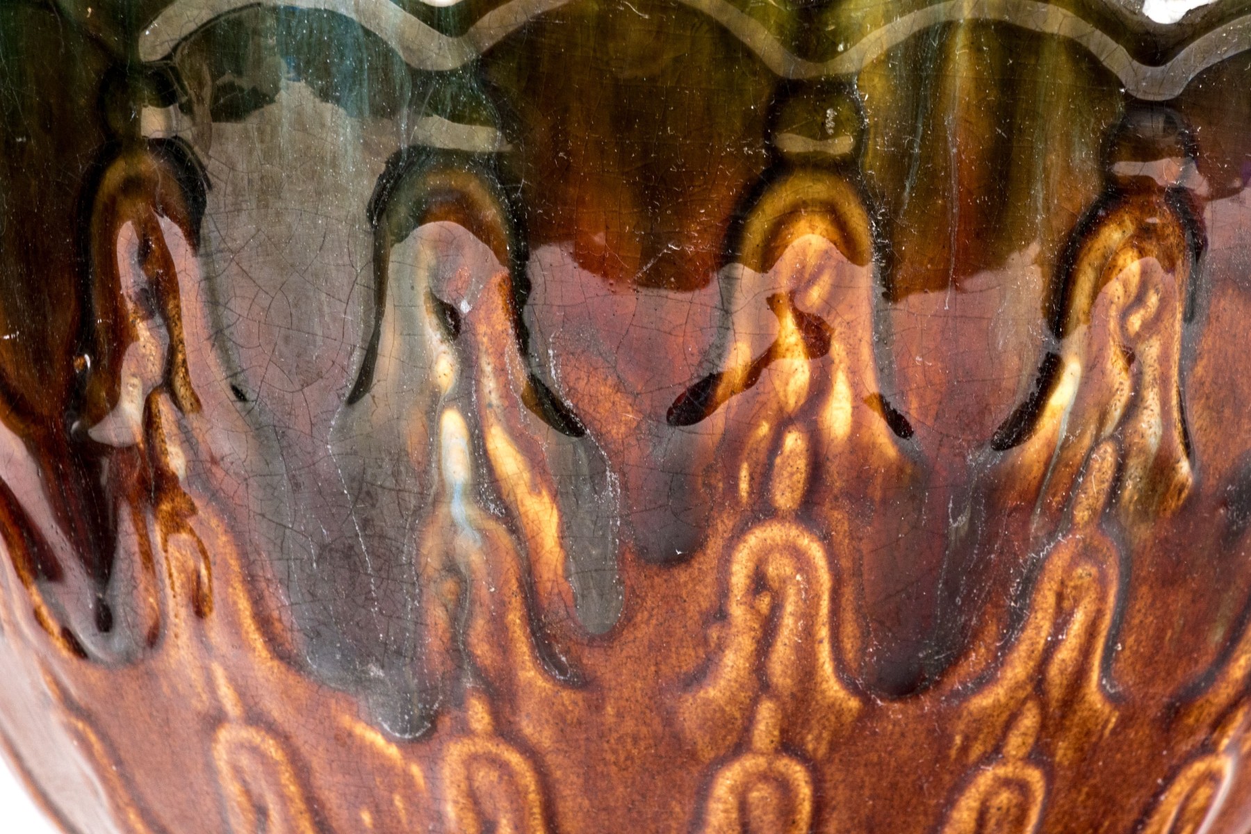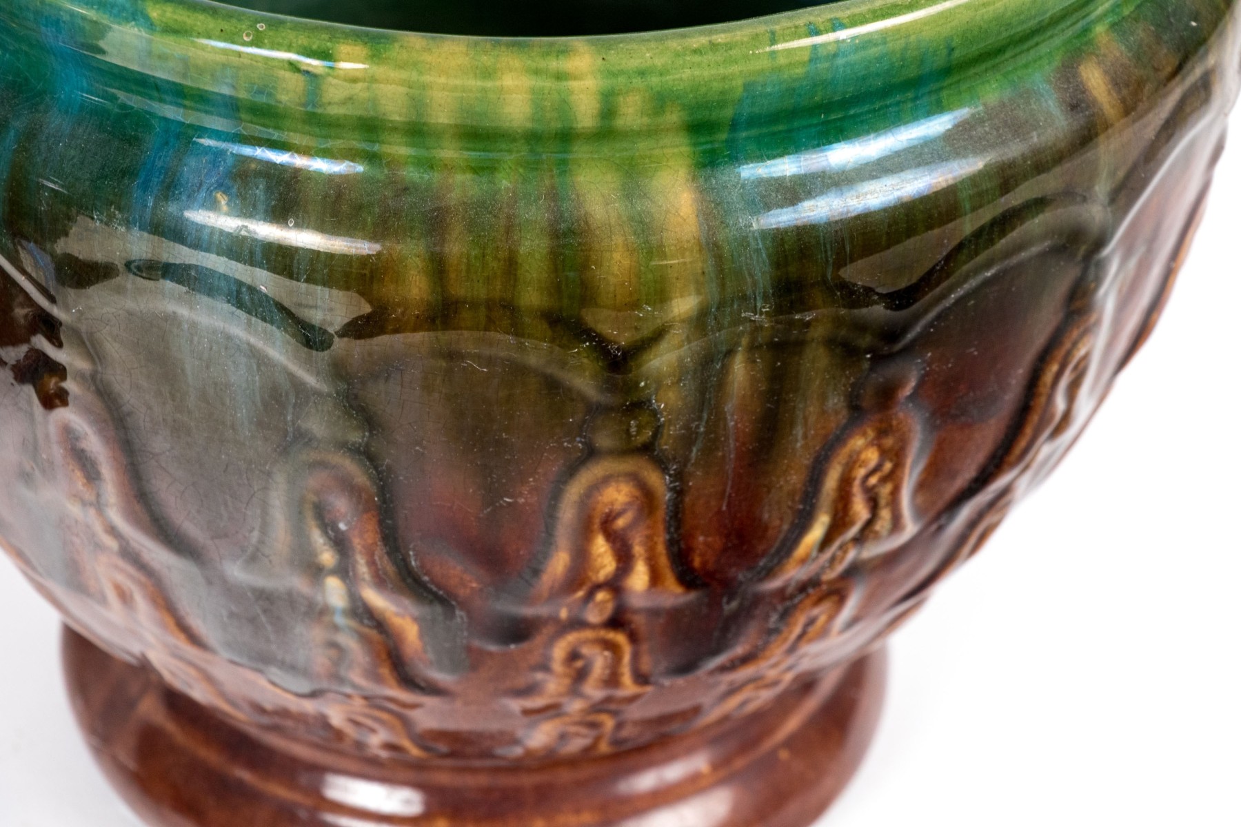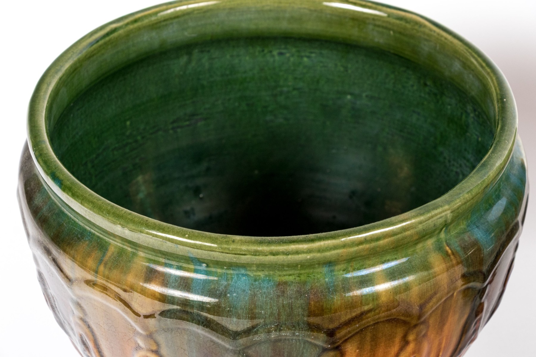 A fabulous pair of McCoy Bellflower pattern ceramic jardinieres glazed in appealing green, orange, and brown ombre over apple forms with wide, short flared rims and bodies decorated with graduating vining buds leading to a circular foot.
