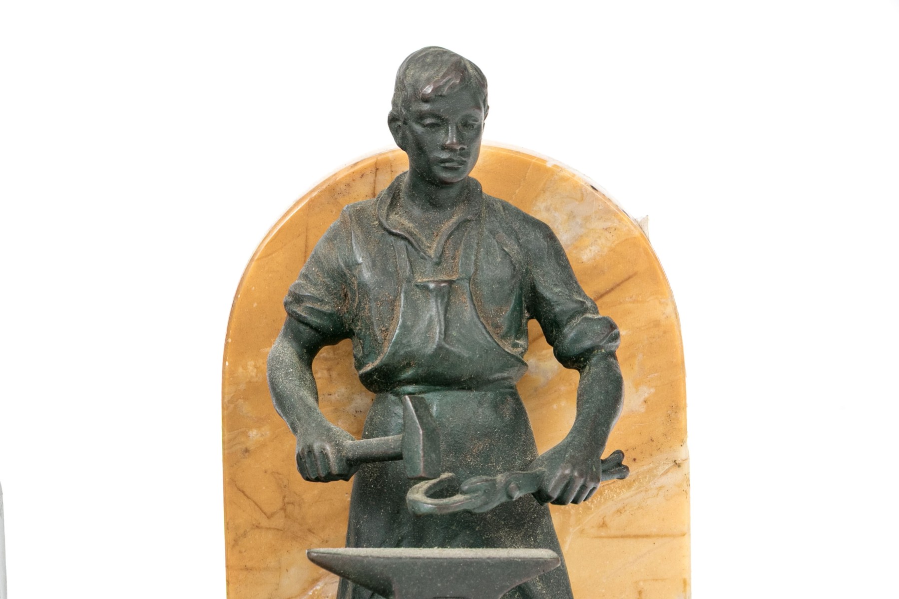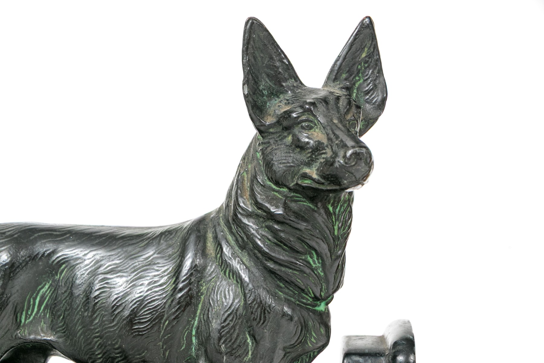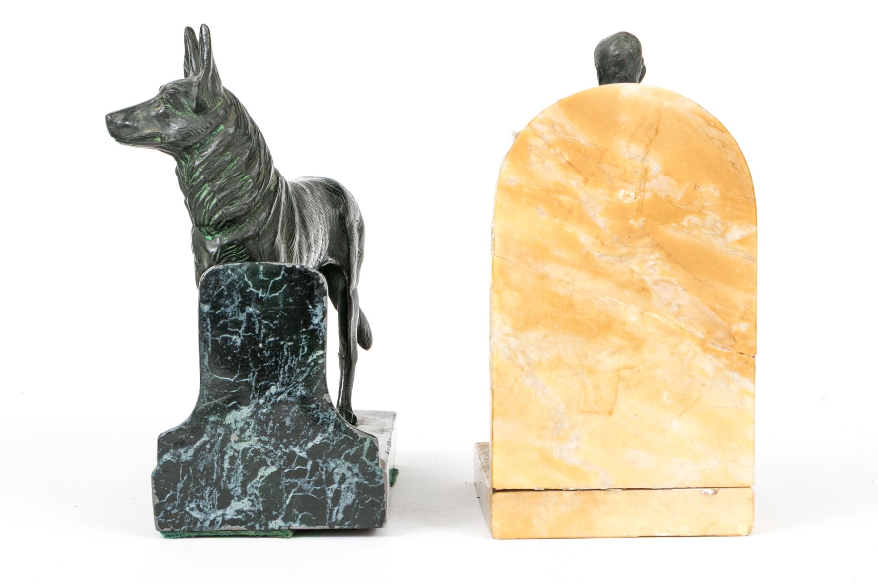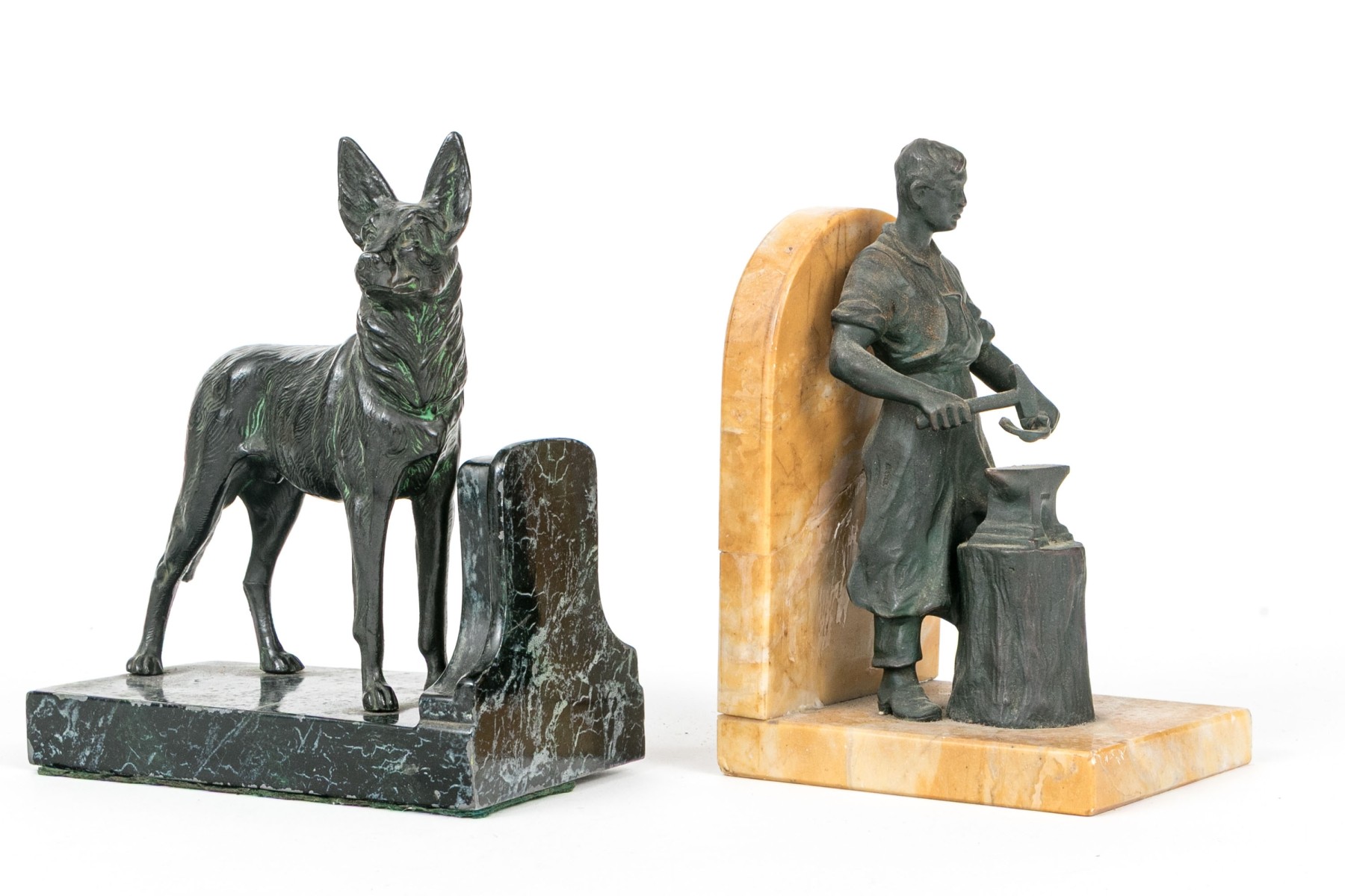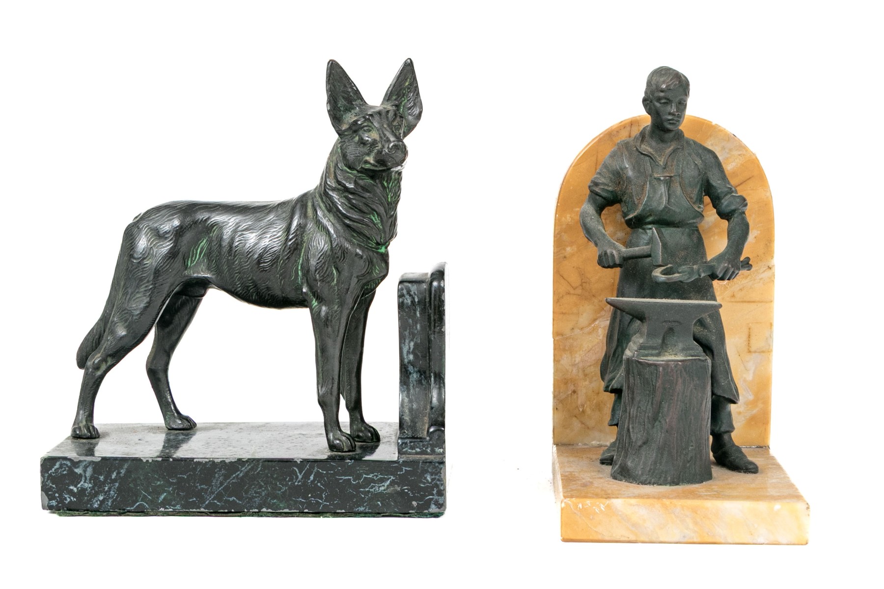 A wonderful duo of mismatched cast metal bookends on stone bases including a figure of a German Shepherd dog on a black stone base and a figure of a metalsmith at his anvil on a yellow stone base.