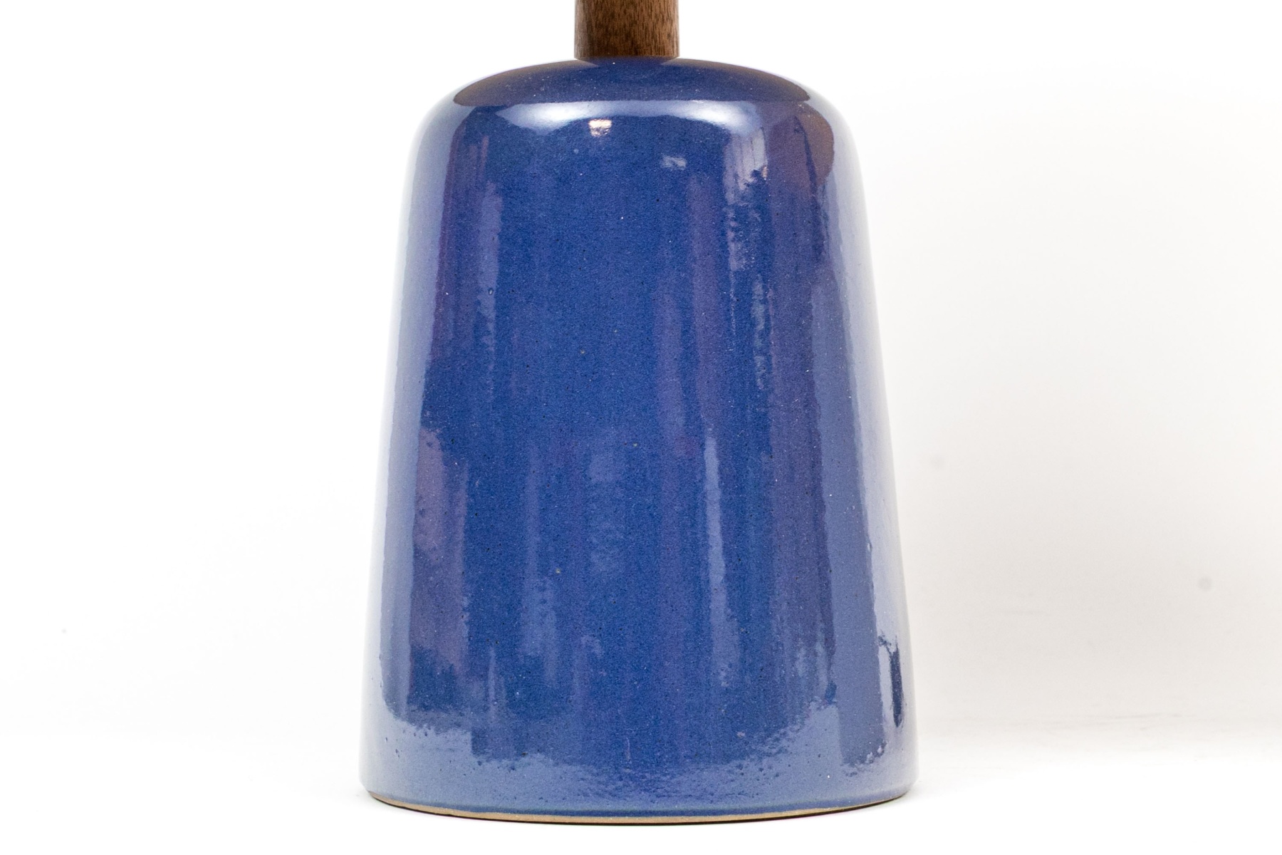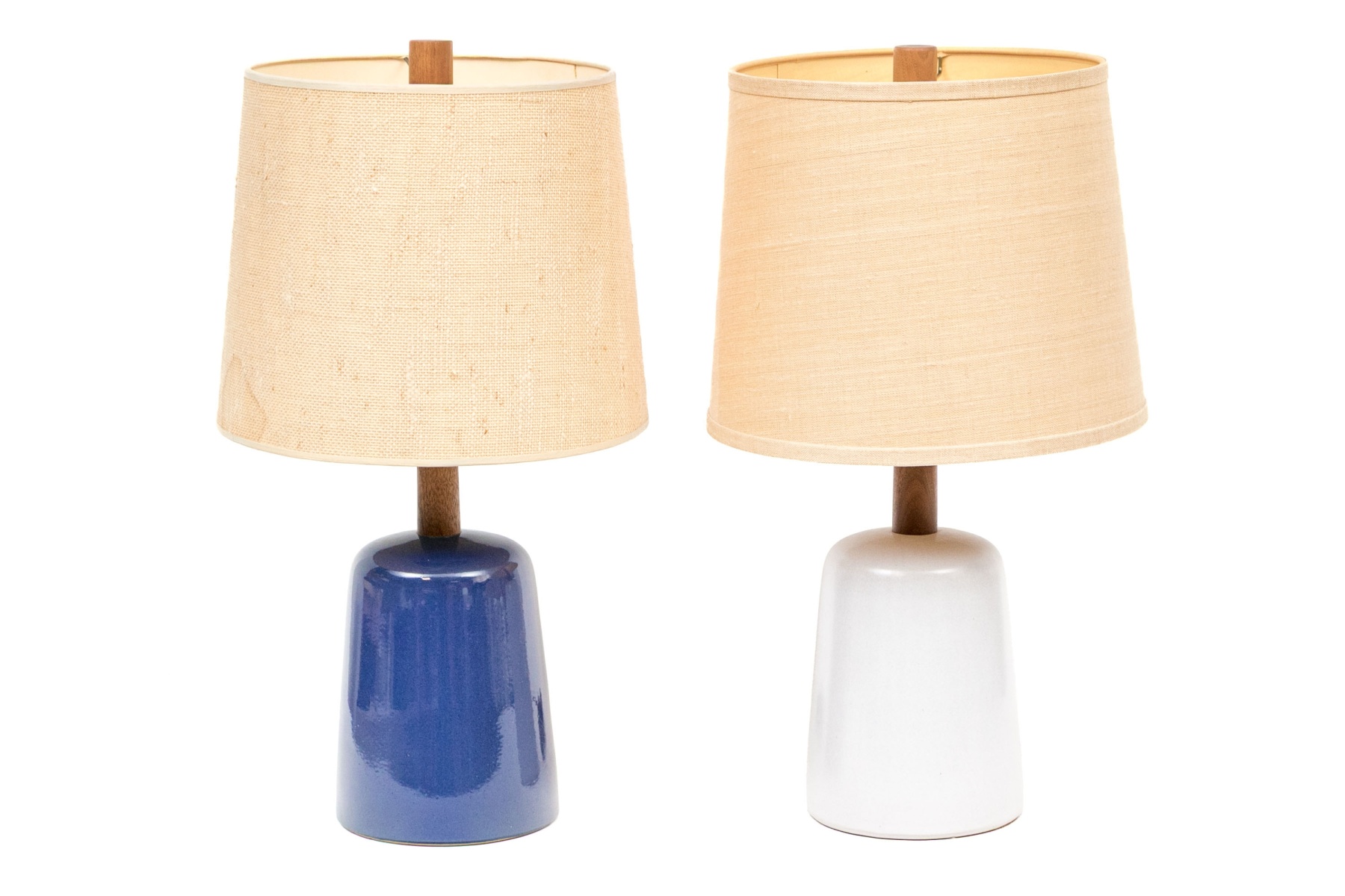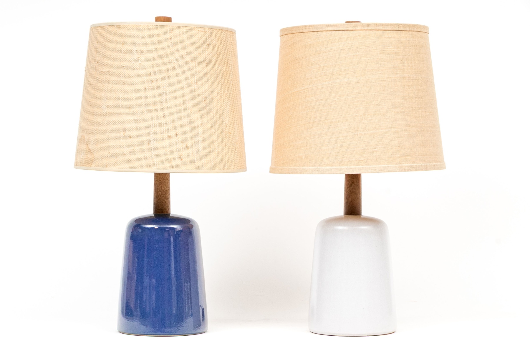A pair of Classic Mid Century pottery Table Lamps Ca. 1960's by iconic husband and wife Potters Jane and Gordon Martz. Tapering round ceramic shapes, one blue and one white. Both with Walnut supports and finials. With different fabric shades.