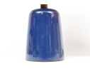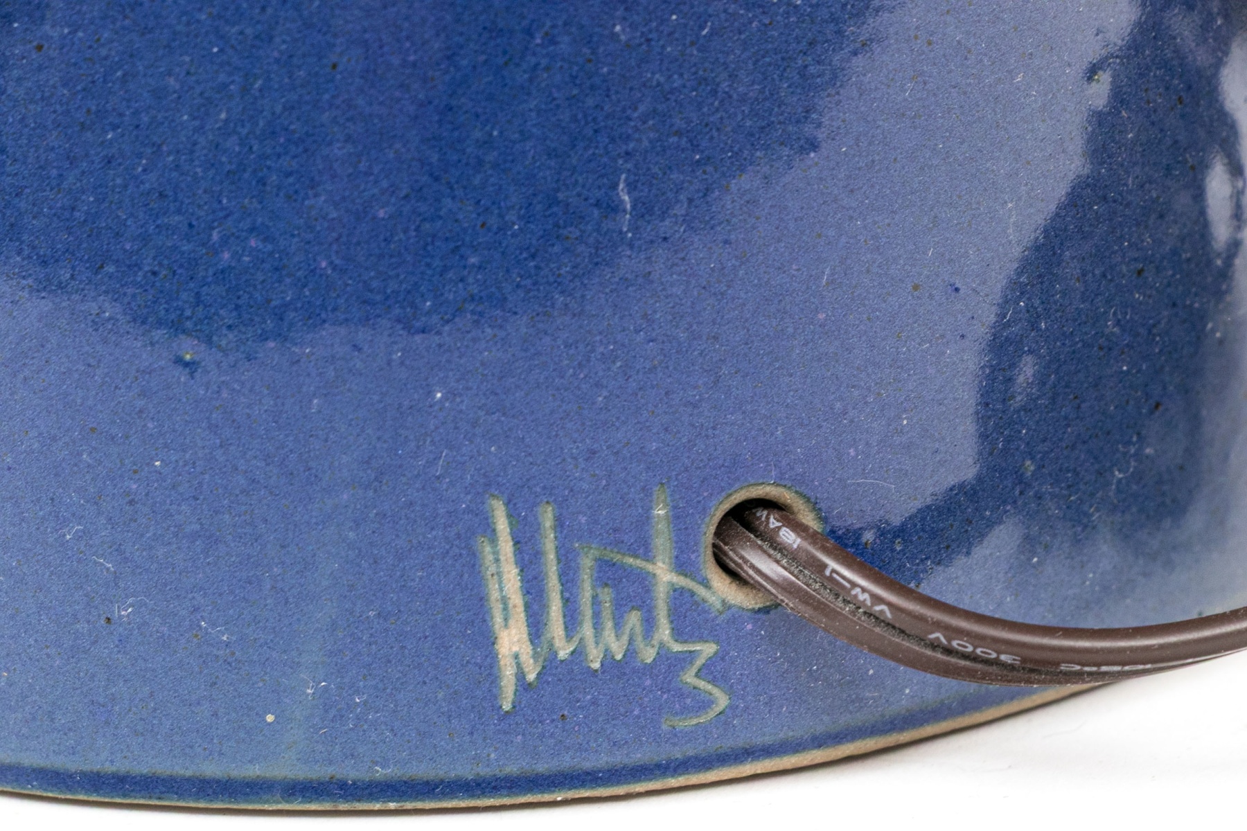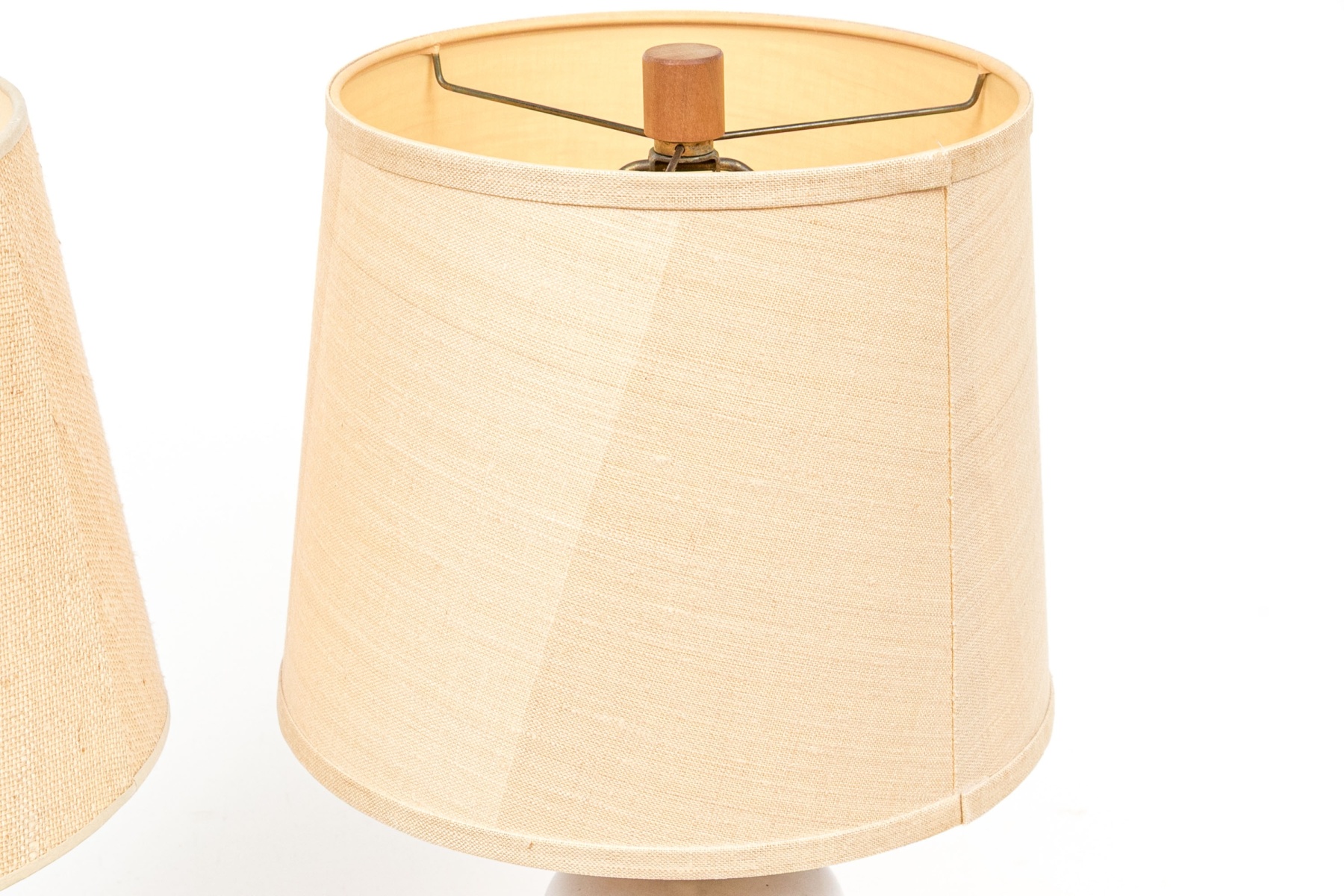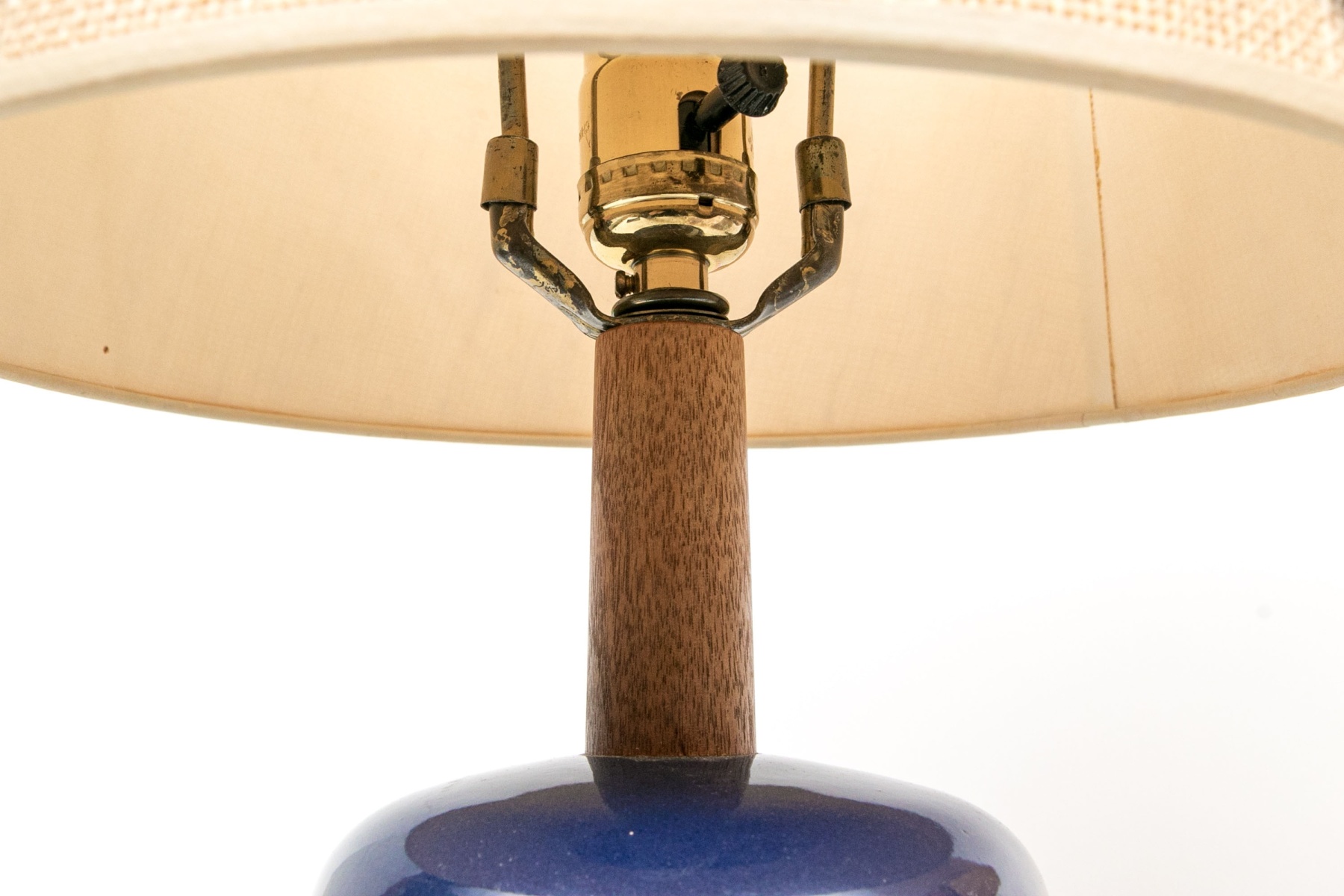 A pair of Classic Mid Century pottery Table Lamps Ca. 1960's by iconic husband and wife Potters Jane and Gordon Martz. Tapering round ceramic shapes, one blue and one white. Both with Walnut supports and finials. With different fabric shades.
