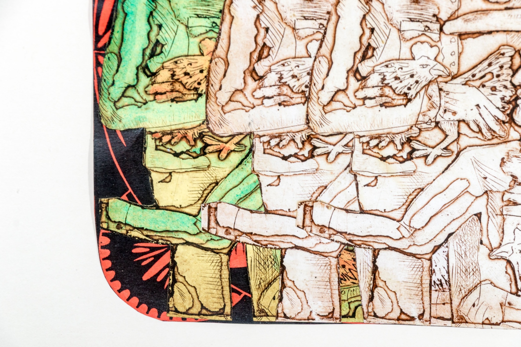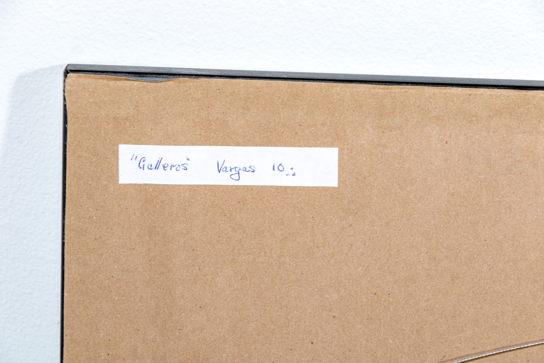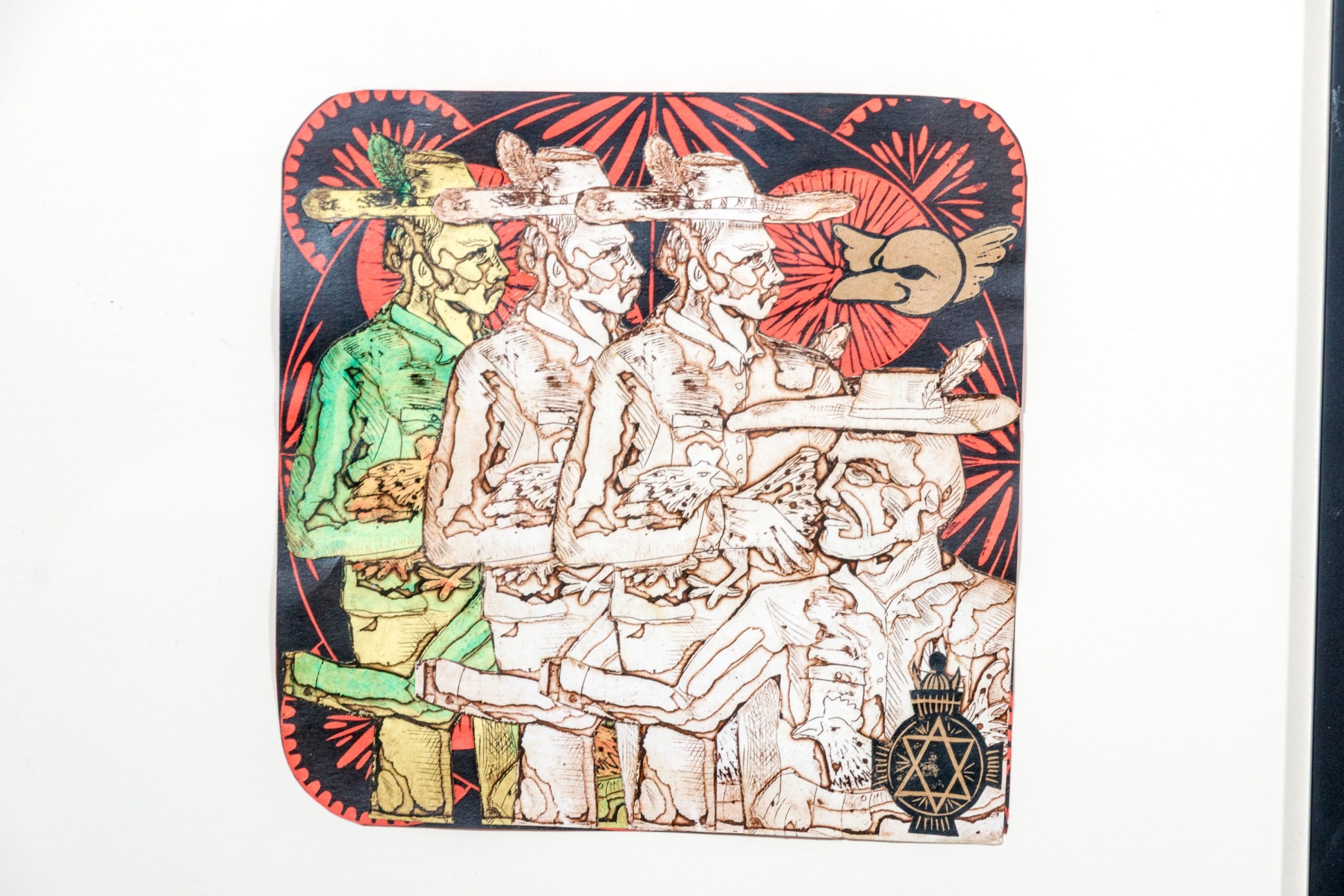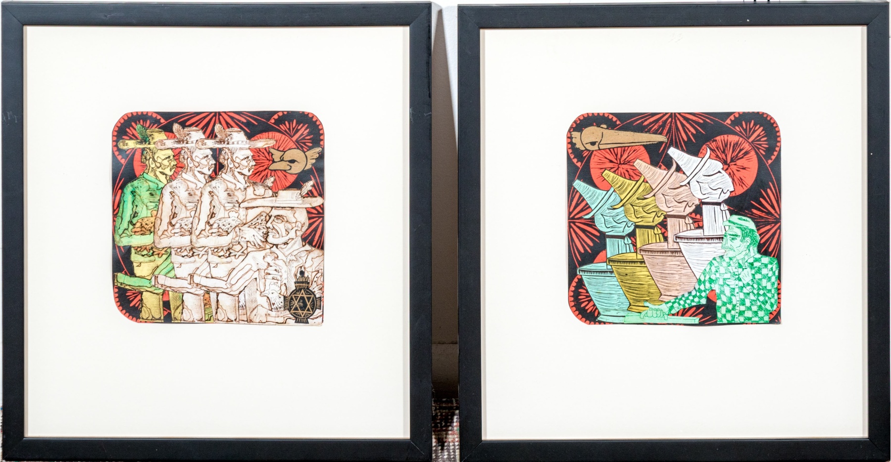 An eye-catching duo of collage artworks depicting repeated figures in vibrant color and rich, textured detail against black and red medallion backgrounds. One labeled "'Galleros' Vargas 10" on the verso.