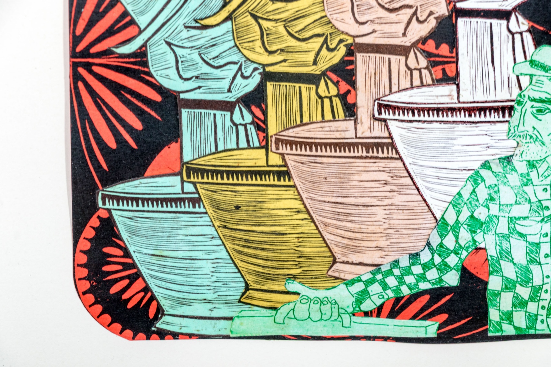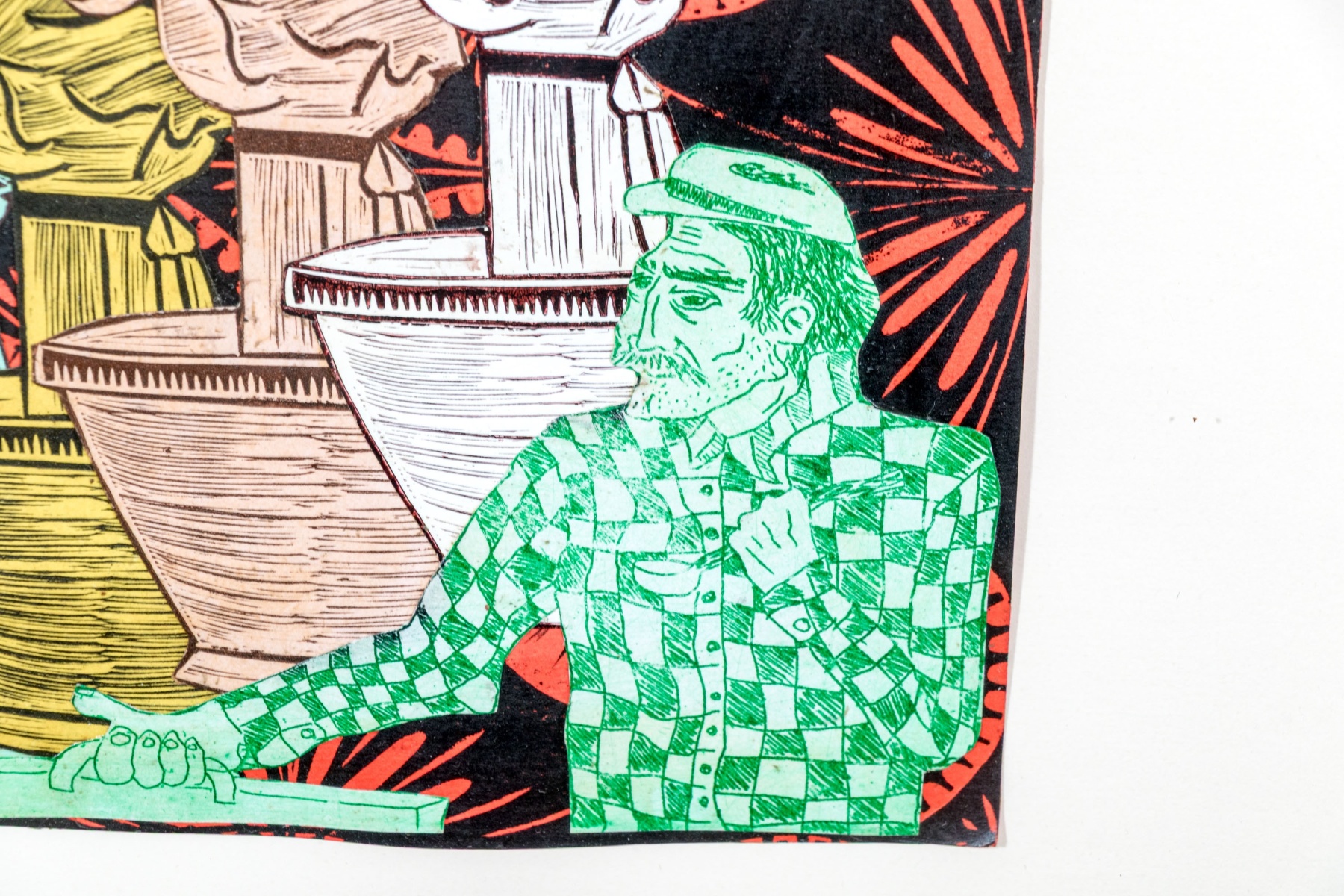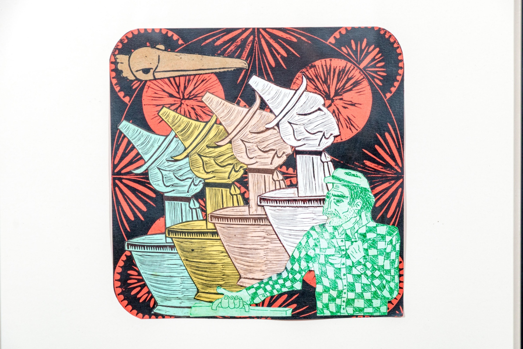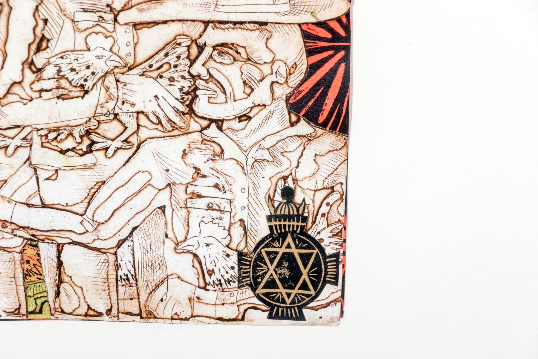 An eye-catching duo of collage artworks depicting repeated figures in vibrant color and rich, textured detail against black and red medallion backgrounds. One labeled "'Galleros' Vargas 10" on the verso.