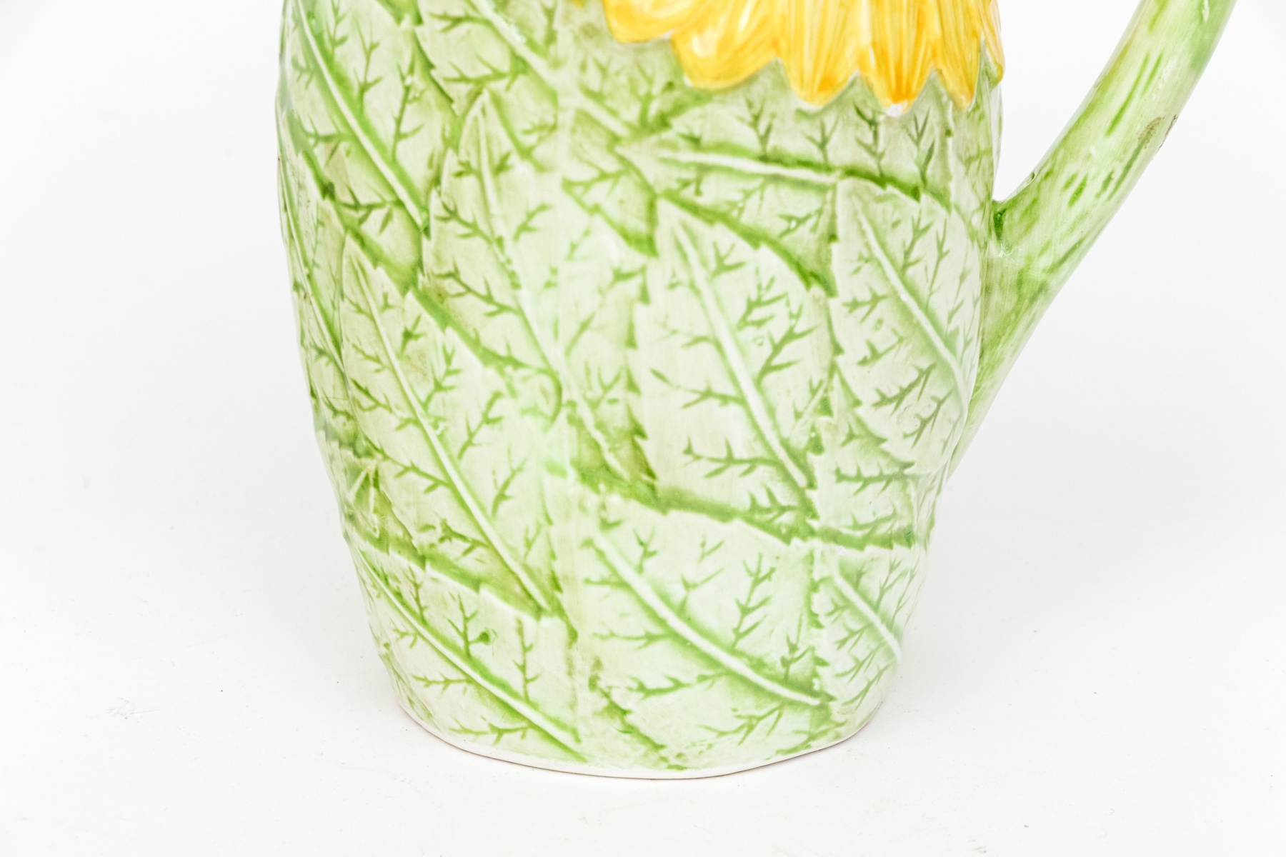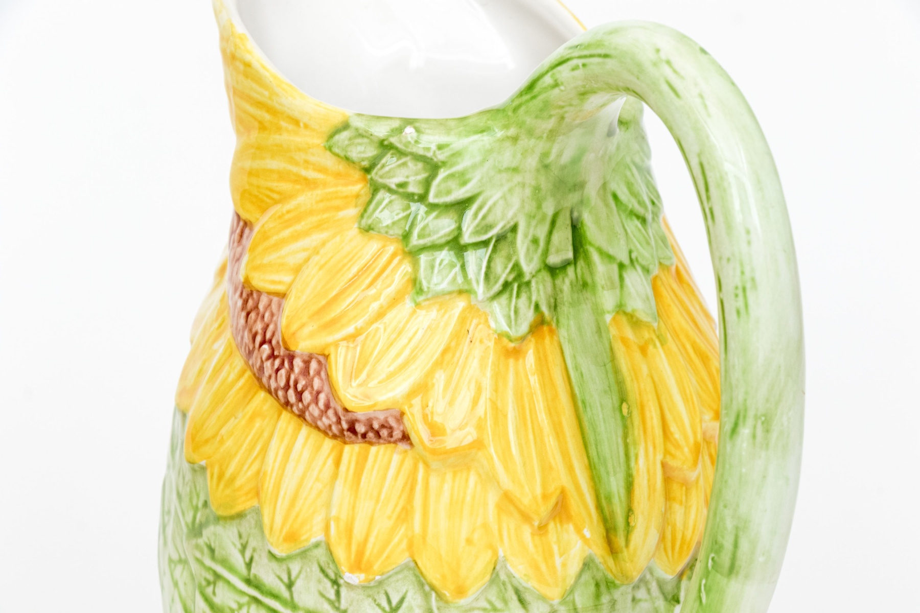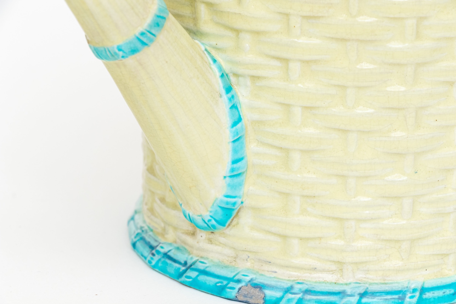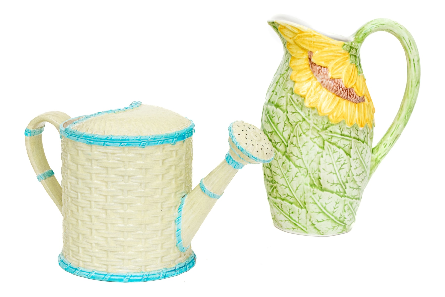A wonderful duo of ceramics comprised of a faux basket woven formed ceramic watering can with a pierced end and a Seymour Mann pitcher decorated with yellow sunflower and green leaves.