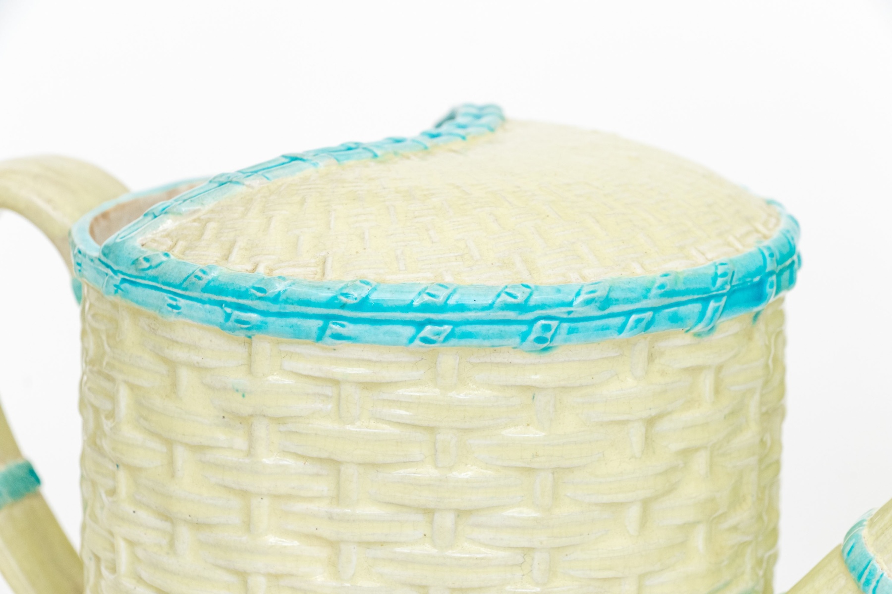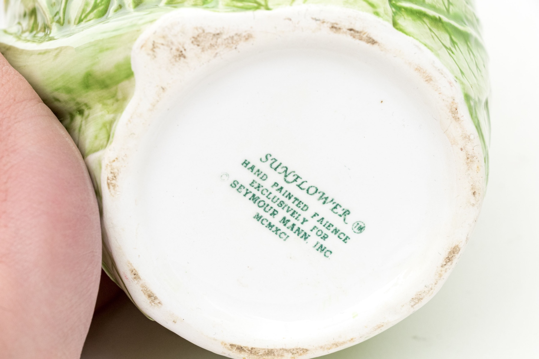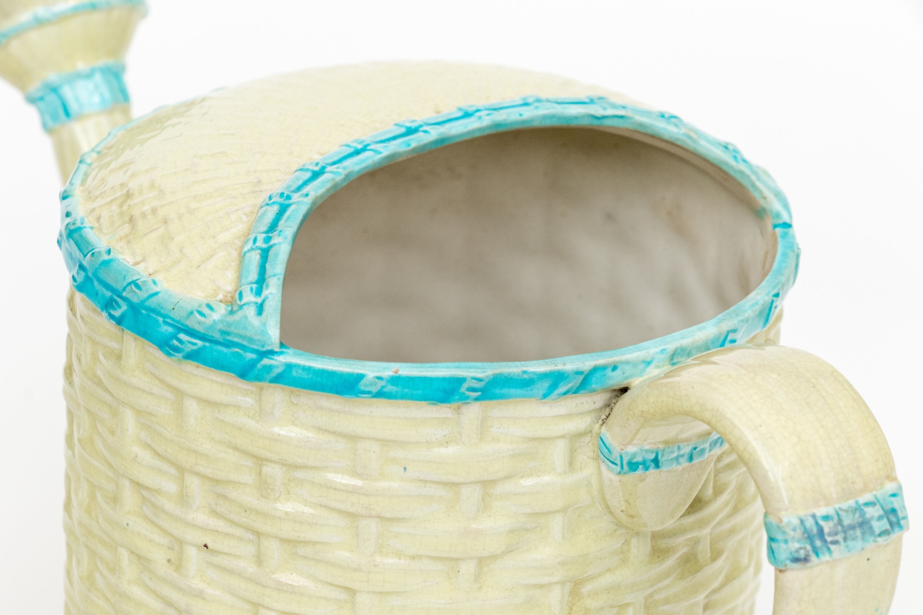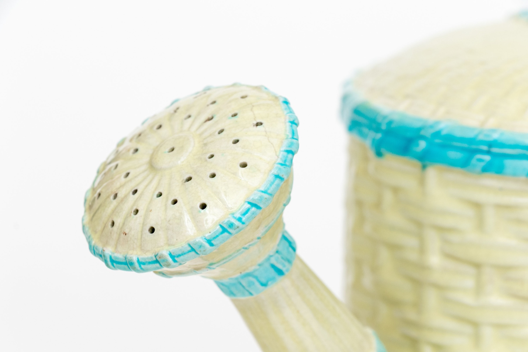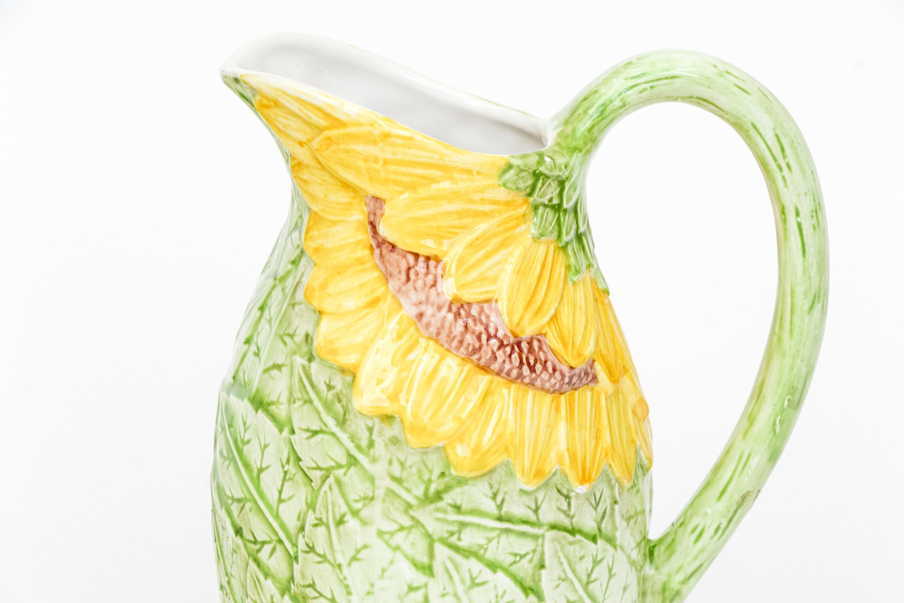 A wonderful duo of ceramics comprised of a faux basket woven formed ceramic watering can with a pierced end and a Seymour Mann pitcher decorated with yellow sunflower and green leaves.