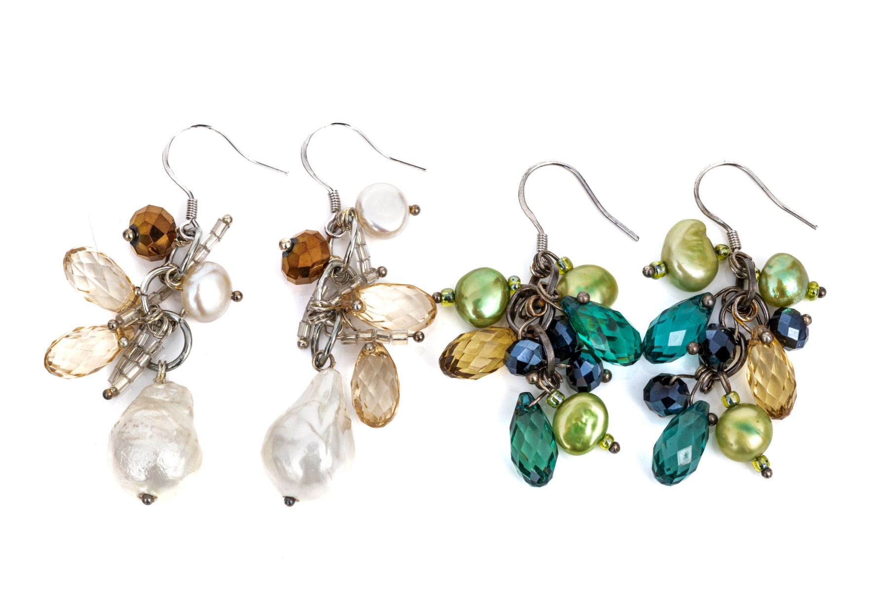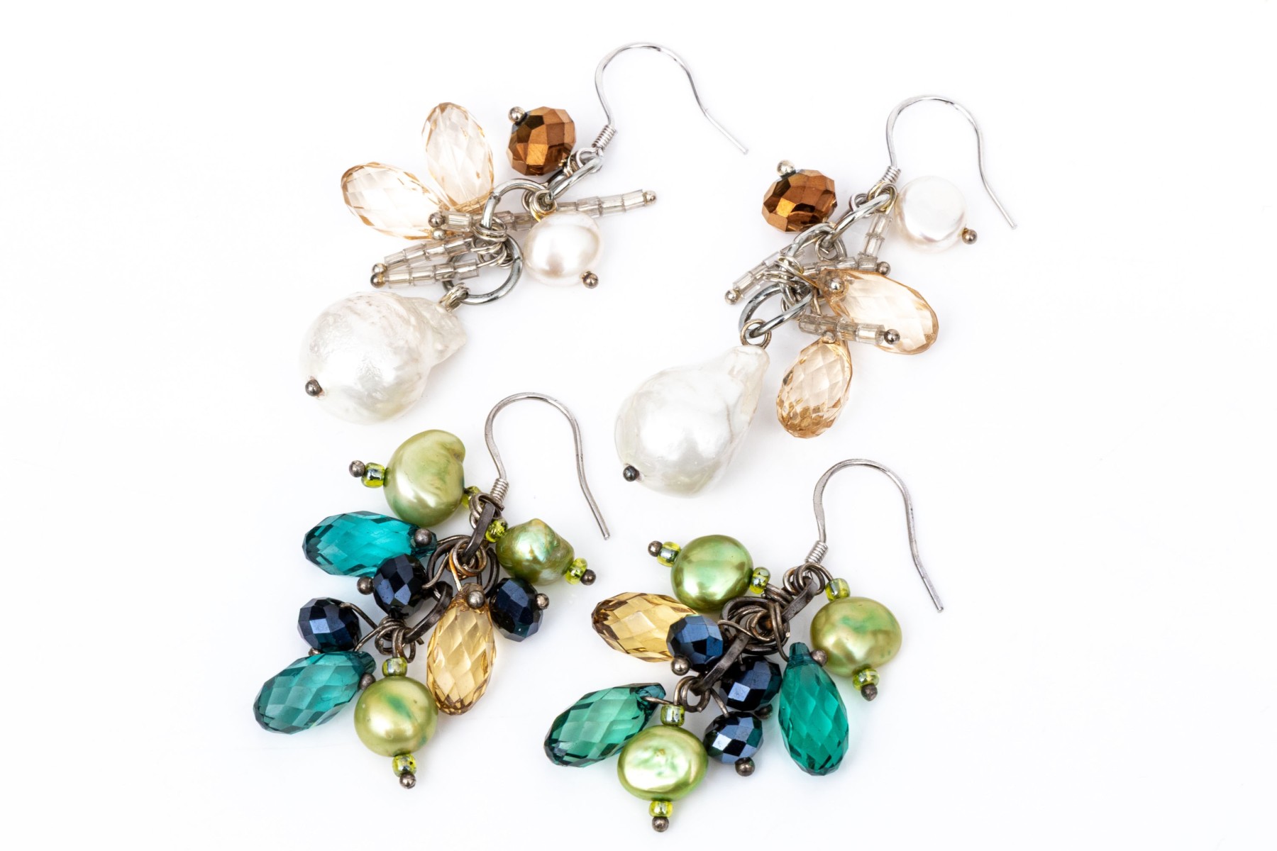 Two pairs of fabulous sterling silver, cultured freshwater pearl and crystal drop earrings, with shepherd's hooks