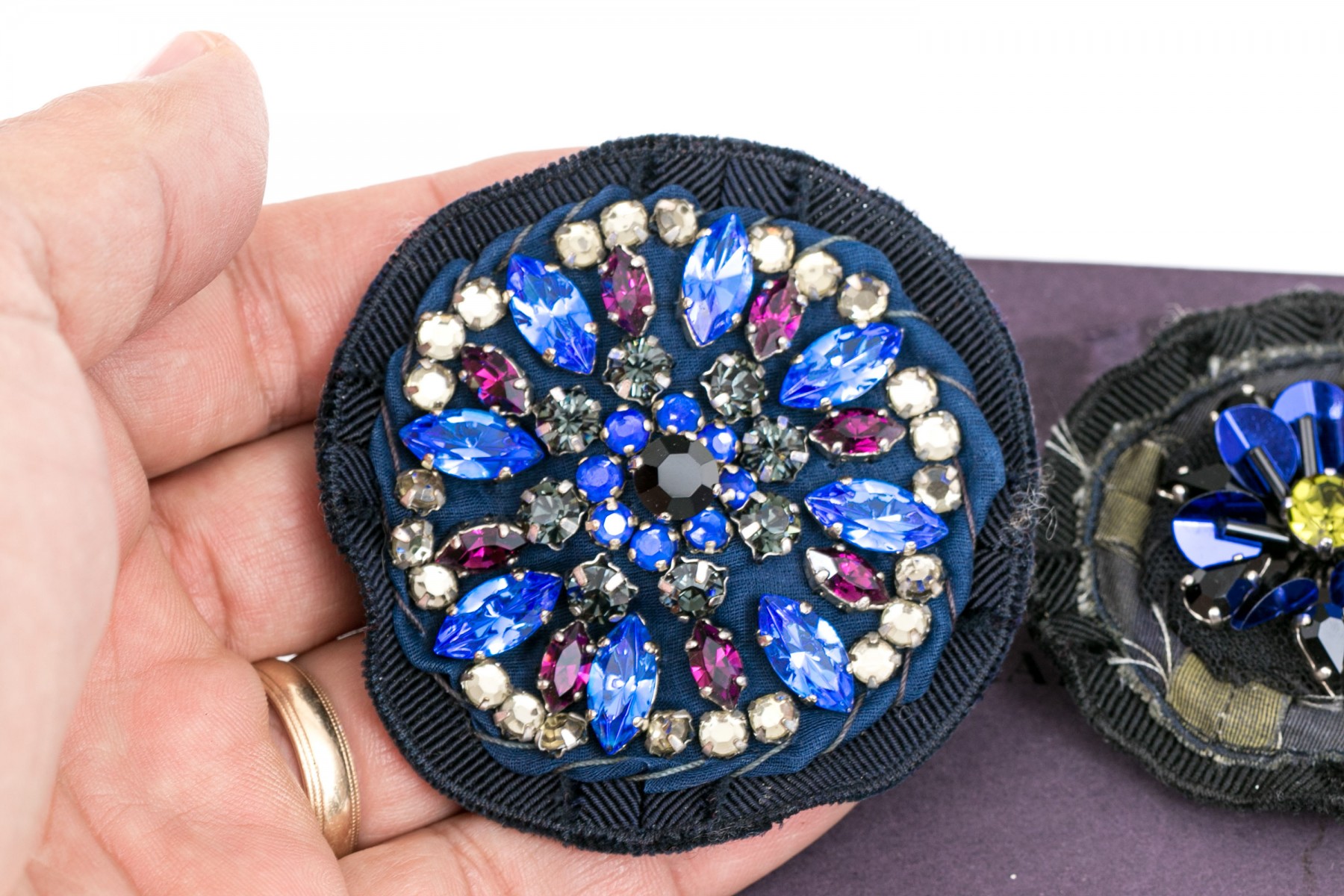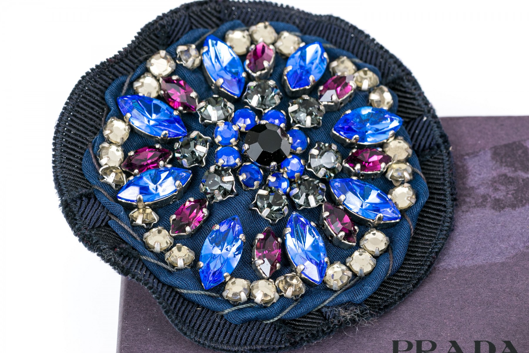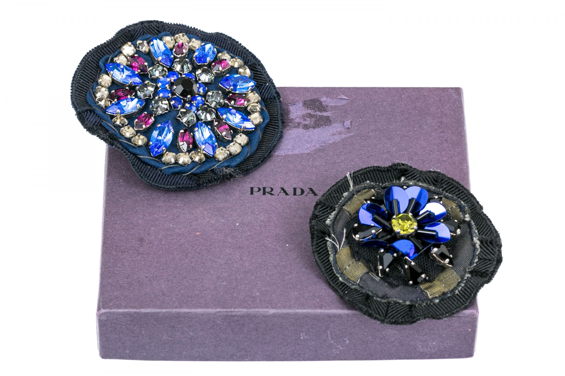 Two beaded Prada brooches. Faceted beads in shades of blues, black and purple sit over sewn backings.