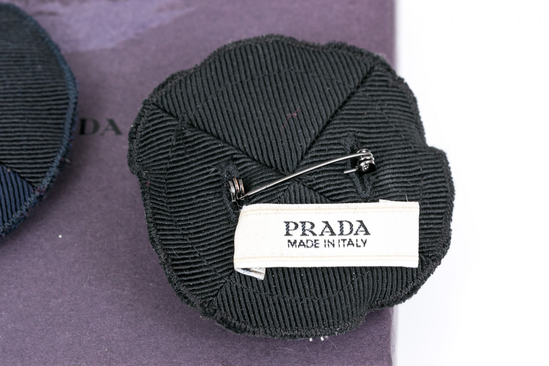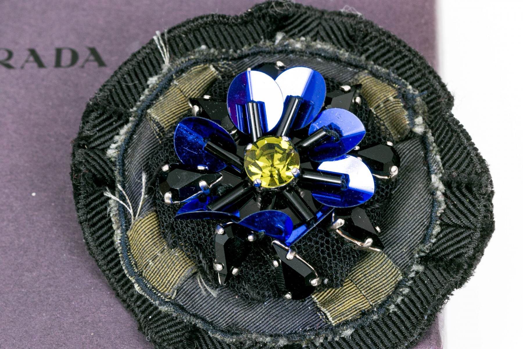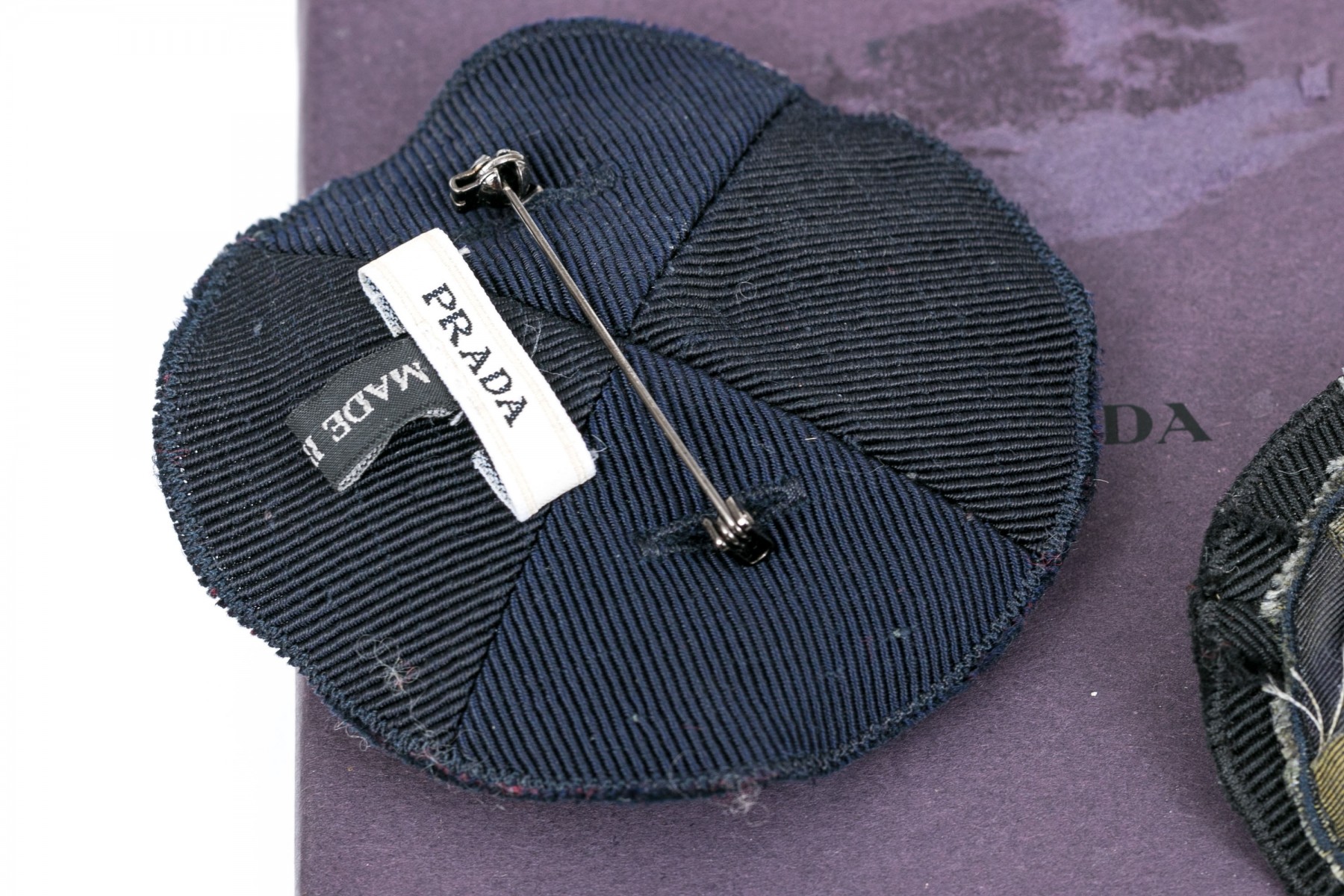 Two beaded Prada brooches. Faceted beads in shades of blues, black and purple sit over sewn backings.